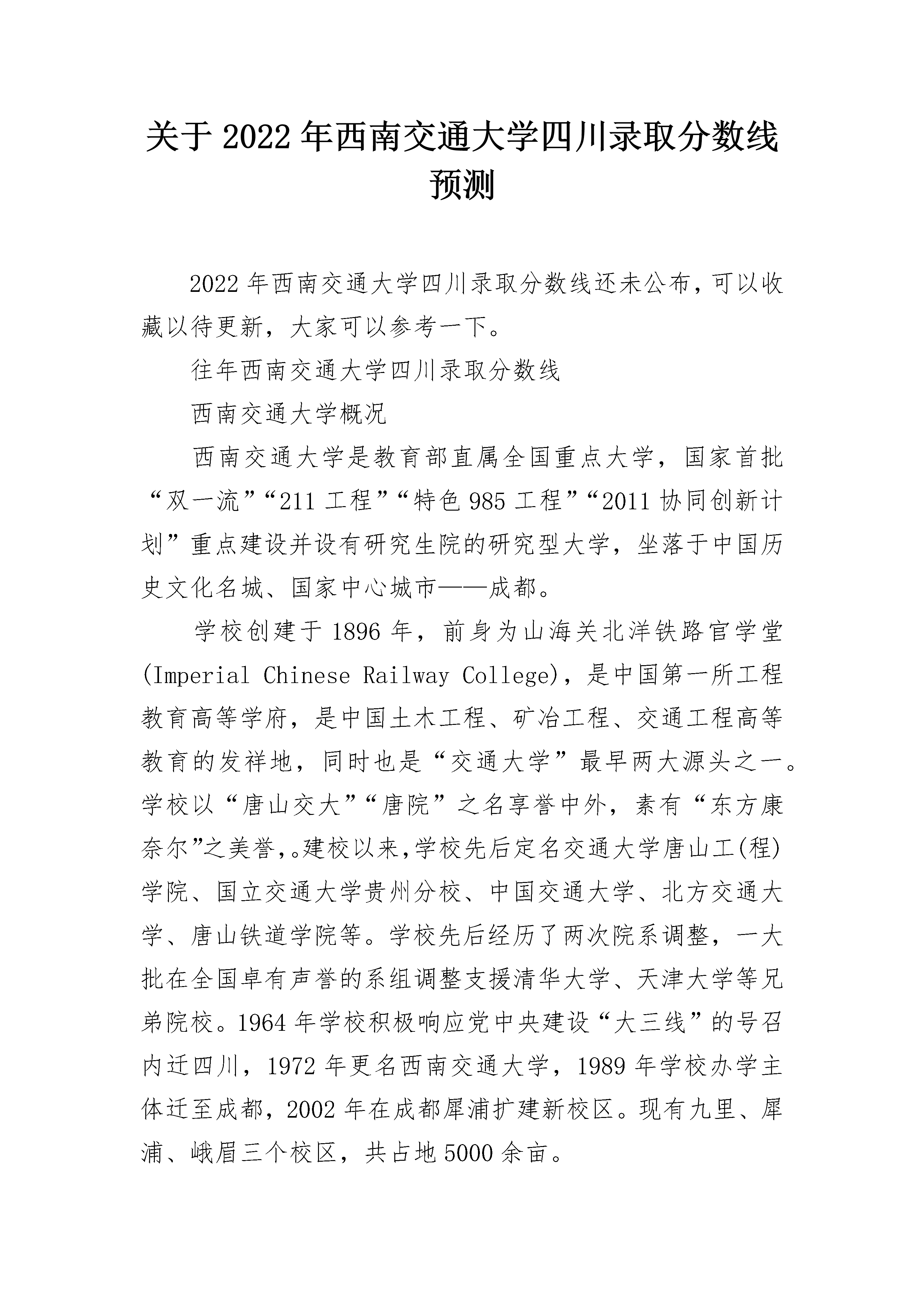 关于2022年西南交通大学四川录取分数线预测2022年西南交通大学四川录取分数线还未公布,可以收藏以待更新,大家可以参考一下。往年西南交通大学四川录取分数线西南交通大学概况西南交通大学是教育部直属全国重点大学,国家首批“双一流”“211工程”“特色985工程”“2011协同创新计划”重点建设并设有研究生院的研究型大学,坐落于中国历史文化名城、国家中心城市——成都。学校创建于1896年,前身为山海关北洋铁路官学堂(ImperialChineseRailwayCollege),是中国第一所工程教育高等学府,是中国土木工程、矿冶工程、交通工程高等教育的发祥地,同时也是“交通大学”最早两大源头之一。学校以“唐山交大”“唐院”之名享誉中外,素有“东方康奈尔”之美誉,。建校以来,学校先后定名交通大学唐山工(程)学院、国立交通大学贵州分校、中国交通大学、北方交通大学、唐山铁道学院等。学校先后经历了两次院系调整,一大批在全国卓有声誉的系组调整支援清华大学、天津大学等兄弟院校。1964年学校积极响应党中央建设“大三线”的号召内迁四川,1972年更名西南交通大学,1989年学校办学主体迁至成都,2002年在成都犀浦扩建新校区。现有九里、犀浦、峨眉三个校区,共占地5000余亩。在125年的办学历程中,学校始终坚守大学使命、服务国家战略需求,始终与中华民族同呼吸、共命运,见证和参与了中华民族百折不挠、不断奋进的光辉历史,形成了“竢实扬华、自强不息”的交大精神,“严谨治学、严格要求”的办学传统和“精勤求学、敦笃励志、果毅力行、忠恕任事”的校训,培养和造就了以茅以升、竺可桢、林同炎、黄万里等为代表的30余万栋梁英才,师生中产生了3位“两弹一星”元勋、63位海内外院士和37位国家工程勘察设计大师,改革开放以来轨道交通领域产生的院士几乎全部出自我校。