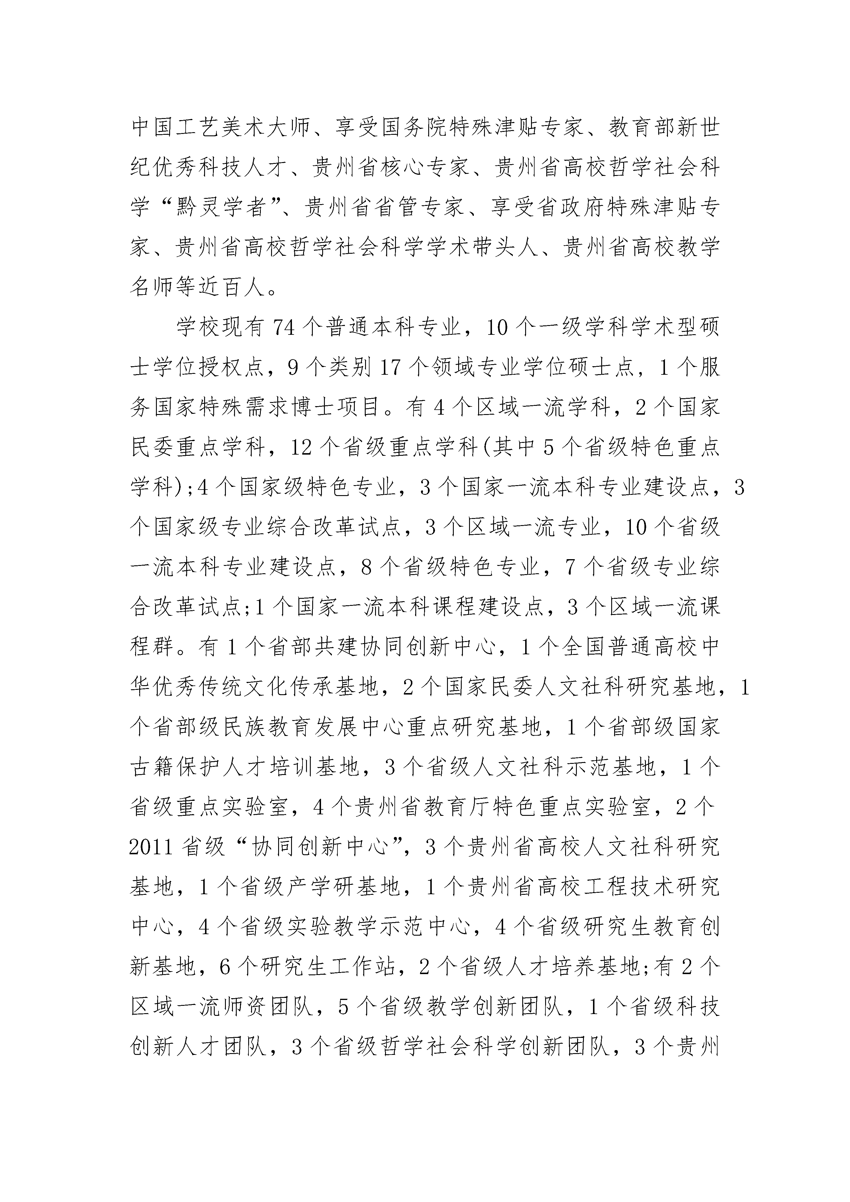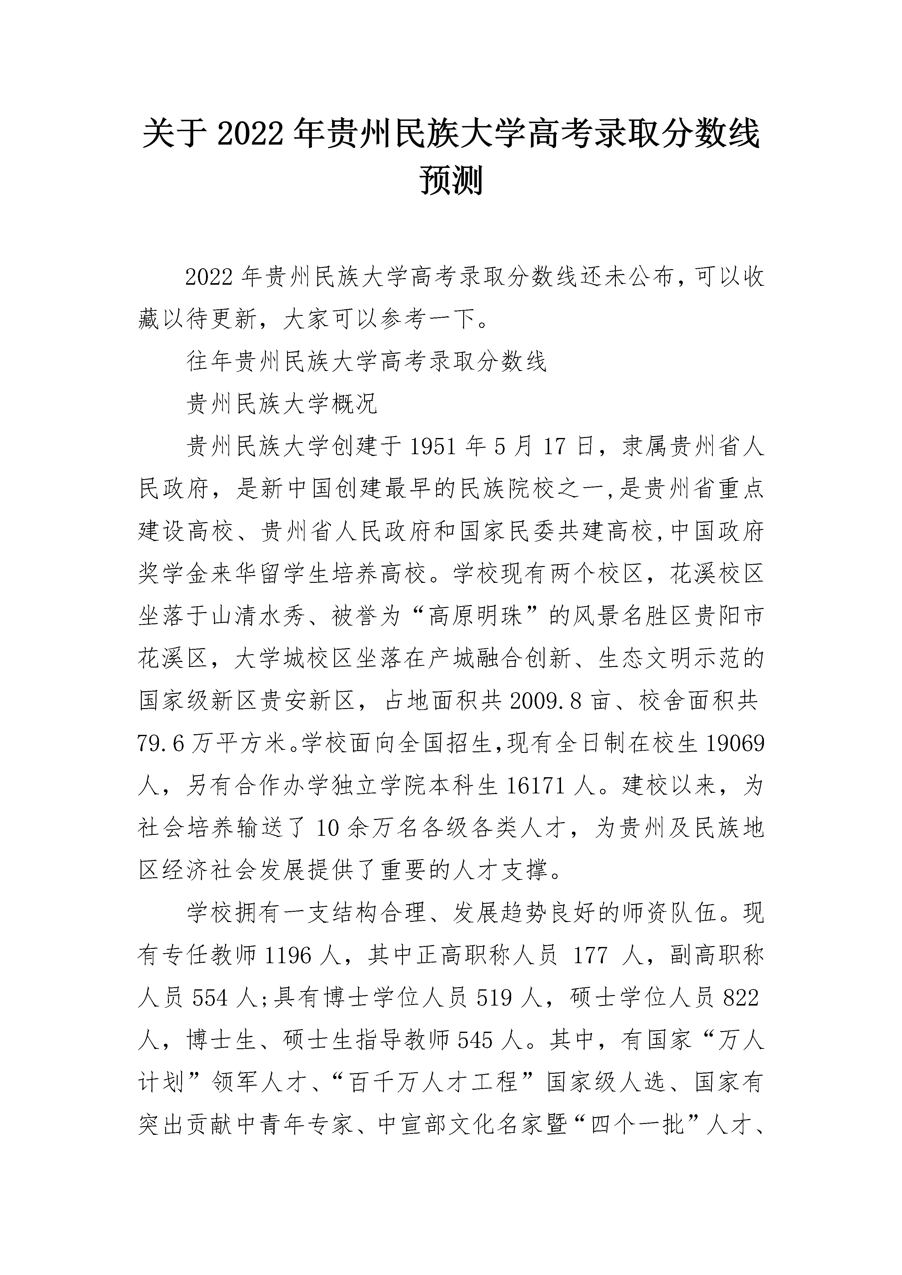 关于2022年贵州民族大学高考录取分数线预测2022年贵州民族大学高考录取分数线还未公布,可以收藏以待更新,大家可以参考一下。往年贵州民族大学高考录取分数线贵州民族大学概况贵州民族大学创建于1951年5月17日,隶属贵州省人民政府,是新中国创建最早的民族院校之一,是贵州省重点建设高校、贵州省人民政府和国家民委共建高校,中国政府奖学金来华留学生培养高校。学校现有两个校区,花溪校区坐落于山清水秀、被誉为“高原明珠”的风景名胜区贵阳市花溪区,大学城校区坐落在产城融合创新、生态文明示范的国家级新区贵安新区,占地面积共2009.8亩、校舍面积共79.6万平方米。学校面向全国招生,现有全日制在校生19069人,另有合作办学独立学院本科生16171人。建校以来,为社会培养输送了10余万名各级各类人才,为贵州及民族地区经济社会发展提供了重要的人才支撑。学校拥有一支结构合理、发展趋势良好的师资队伍。现有专任教师1196人,其中正高职称人员177人,副高职称人员554人;具有博士学位人员519人,硕士学位人员822人,博士生、硕士生指导教师545人。其中,有国家“万人计划”领军人才、“百千万人才工程”国家级人选、国家有突出贡献中青年专家、中宣部文化名家暨“四个一批”人才、中国工艺美术大师、享受国务院特殊津贴专家、教育部新世纪优秀科技人才、贵州省核心专家、贵州省高校哲学社会科学“黔灵学者”、贵州省省管专家、享受省政府特殊津贴专家、贵州省高校哲学社会科学学术带头人、贵州省高校教学名师等近百人。学校现有74个普通本科专业,10个一级学科学术型硕士学位授权点,9个类别17个领域专业学位硕士点,1个服务国家特殊需求博士项目。有4个区域一流学科,2个国家民委重点学科,12个省级重点学科(其中5个省级特色重点学科);4个国家级特色专业,3个国家一流本科专业建设点,3个国家级专业综合改革试点,3个区域一流专业,10个省级一流本科专业建设点,8个省级特色专业,7个省级专业综合改革试点;1个国家一流本科课程建设点,3个区域一流课程群。有1个省部共建协同创新中心,1个全国普通高校中华优秀传统文化传承基地,2个国家民委人文社科研究基地,1个省部级民族教育发展中心重点研究基地,1个省部级国家古籍保护人才培训基地,3个省级人文社科示范基地,1个省级重点实验室,4个贵州省教育厅特色重点实验室,2个2011省级“协同创新中心”,3个贵州省高校人文社科研究基地,1个省级产学研基地,1个贵州省高校工程技术研究中心,4个省级实验教学示范中心,4个省级研究生教育创新基地,6个研究生工作站,2个省级人才培养基地;有2个区域一流师资团队,5个省级教学创新团队,1个省级科技创新人才团队,3个省级哲学社会科学创新团队,3个贵州省教育厅优秀科研创新团队。