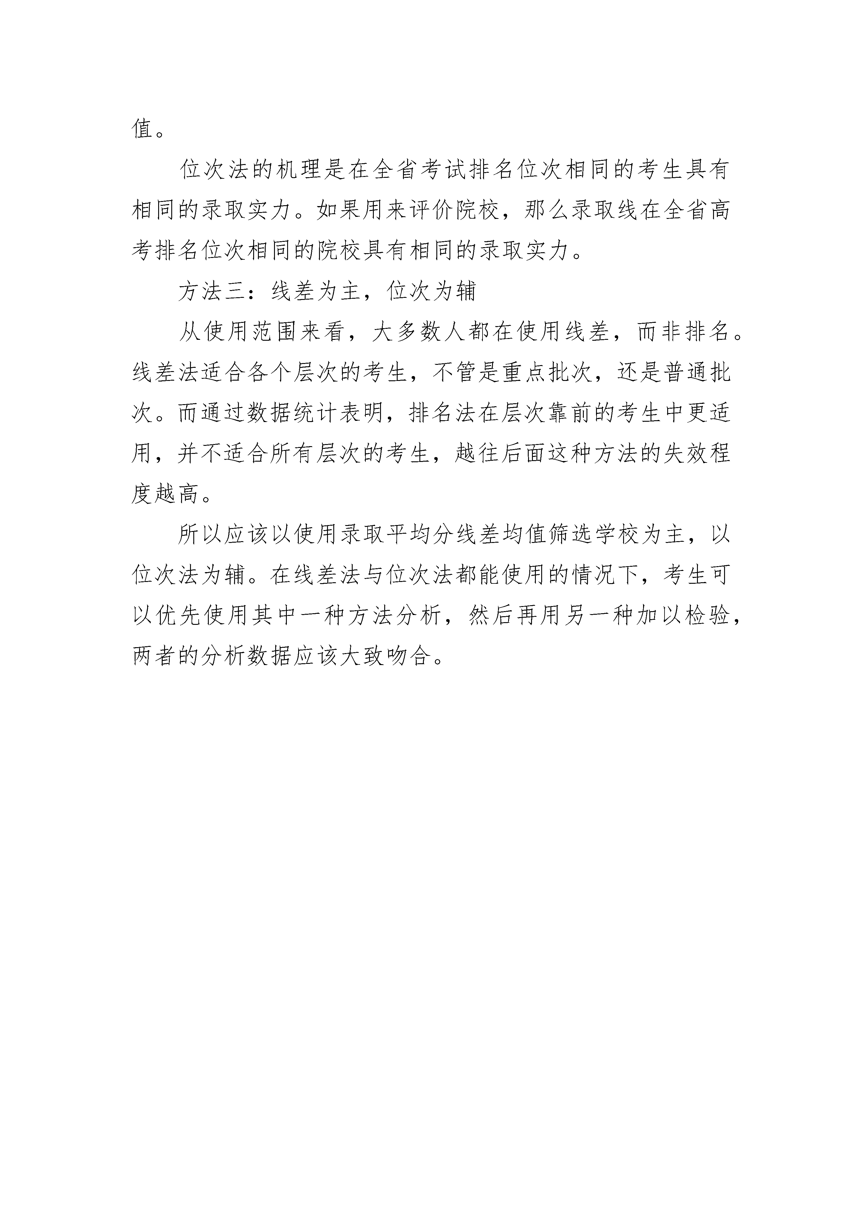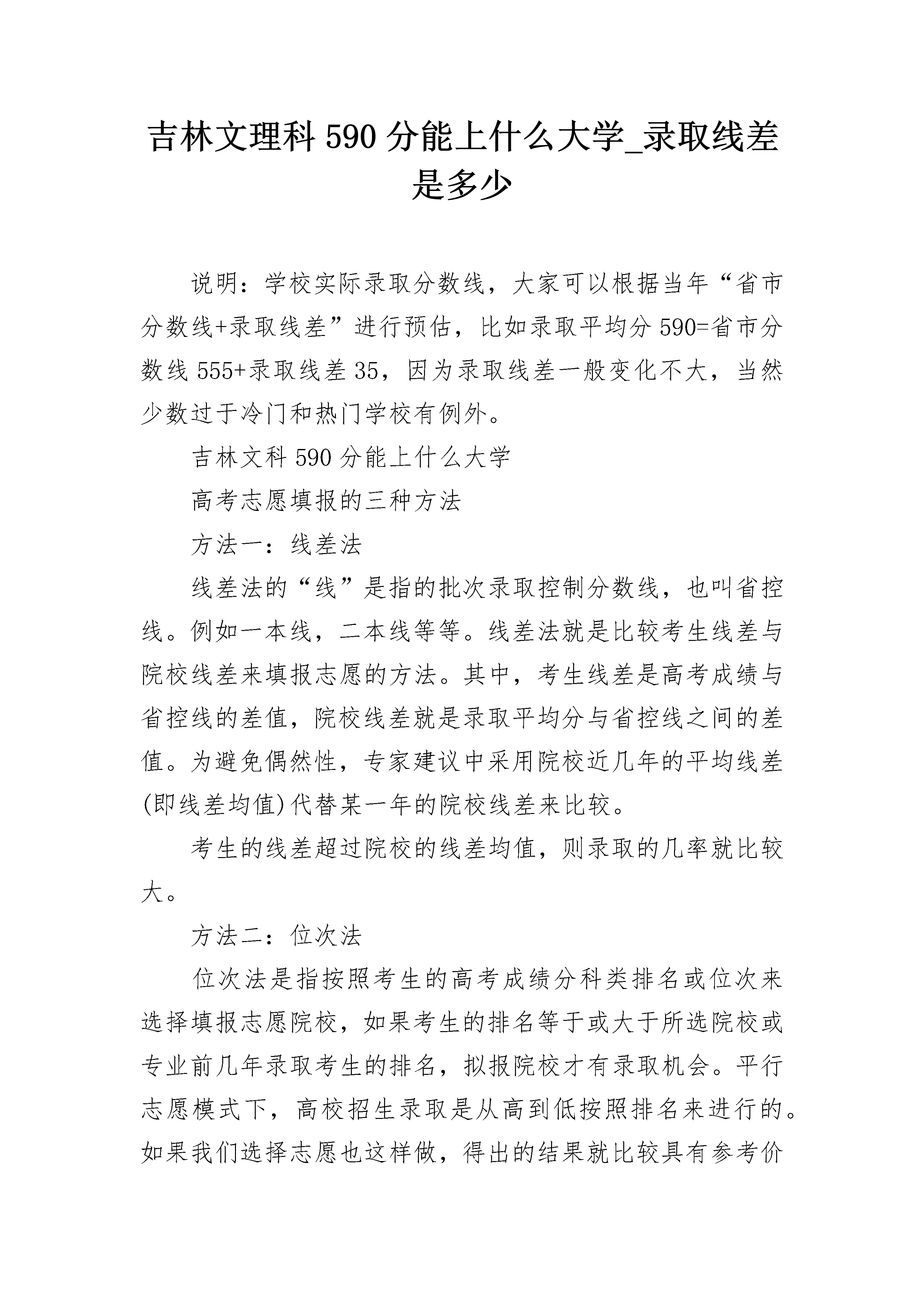 吉林文理科590分能上什么大学_录取线差是多少说明:学校实际录取分数线,大家可以根据当年“省市分数线+录取线差”进行预估,比如录取平均分590=省市分数线555+录取线差35,因为录取线差一般变化不大,当然少数过于冷门和热门学校有例外。吉林文科590分能上什么大学高考志愿填报的三种方法方法一:线差法线差法的“线”是指的批次录取控制分数线,也叫省控线。例如一本线,二本线等等。线差法就是比较考生线差与院校线差来填报志愿的方法。其中,考生线差是高考成绩与省控线的差值,院校线差就是录取平均分与省控线之间的差值。为避免偶然性,专家建议中采用院校近几年的平均线差(即线差均值)代替某一年的院校线差来比较。考生的线差超过院校的线差均值,则录取的几率就比较大。方法二:位次法位次法是指按照考生的高考成绩分科类排名或位次来选择填报志愿院校,如果考生的排名等于或大于所选院校或专业前几年录取考生的排名,拟报院校才有录取机会。平行志愿模式下,高校招生录取是从高到低按照排名来进行的。如果我们选择志愿也这样做,得出的结果就比较具有参考价值。位次法的机理是在全省考试排名位次相同的考生具有相同的录取实力。如果用来评价院校,那么录取线在全省高考排名位次相同的院校具有相同的录取实力。方法三:线差为主,位次为辅从使用范围来看,大多数人都在使用线差,而非排名。线差法适合各个层次的考生,不管是重点批次,还是普通批次。而通过数据统计表明,排名法在层次靠前的考生中更适用,并不适合所有层次的考生,越往后面这种方法的失效程度越高。所以应该以使用录取平均分线差均值筛选学校为主,以位次法为辅。在线差法与位次法都能使用的情况下,考生可以优先使用其中一种方法分析,然后再用另一种加以检验,两者的分析数据应该大致吻合。