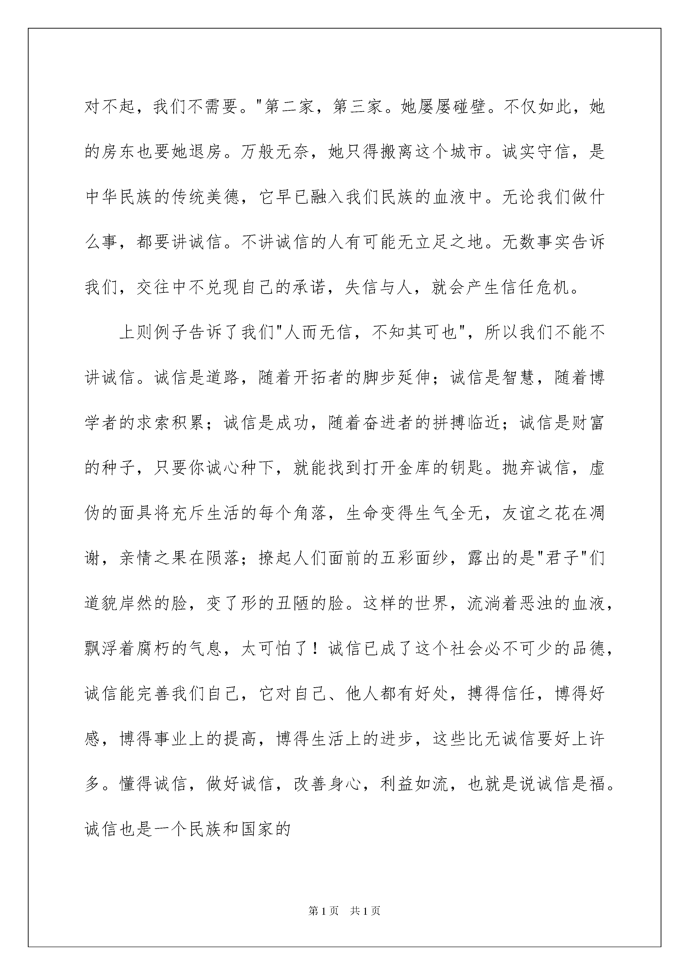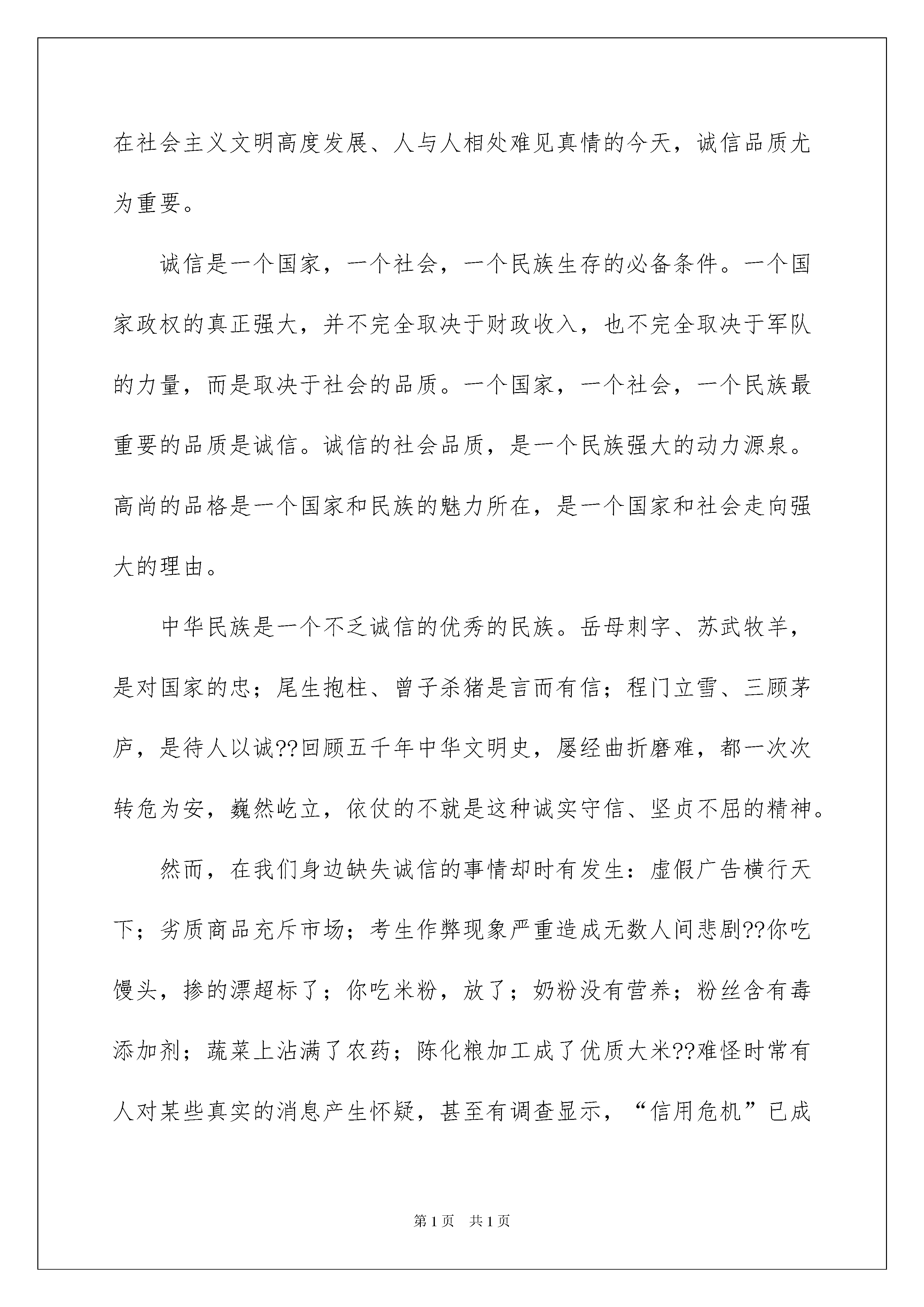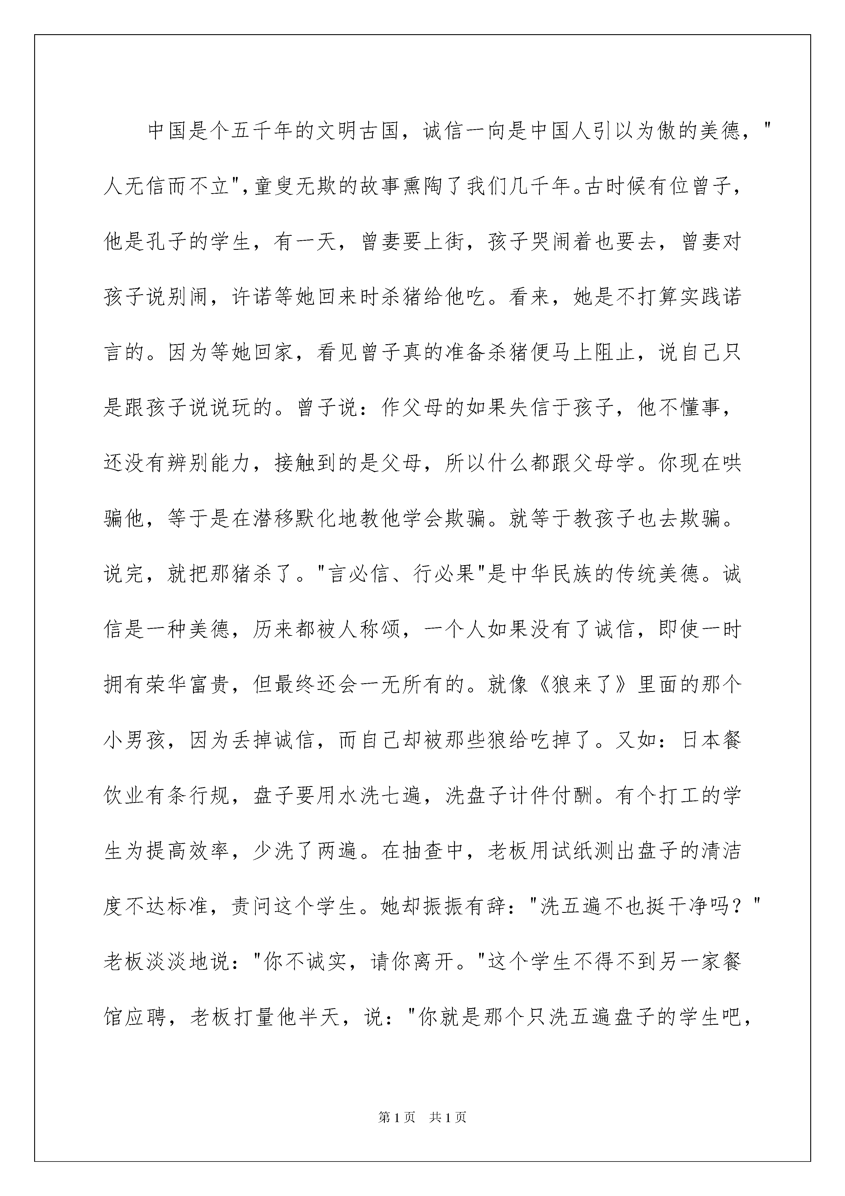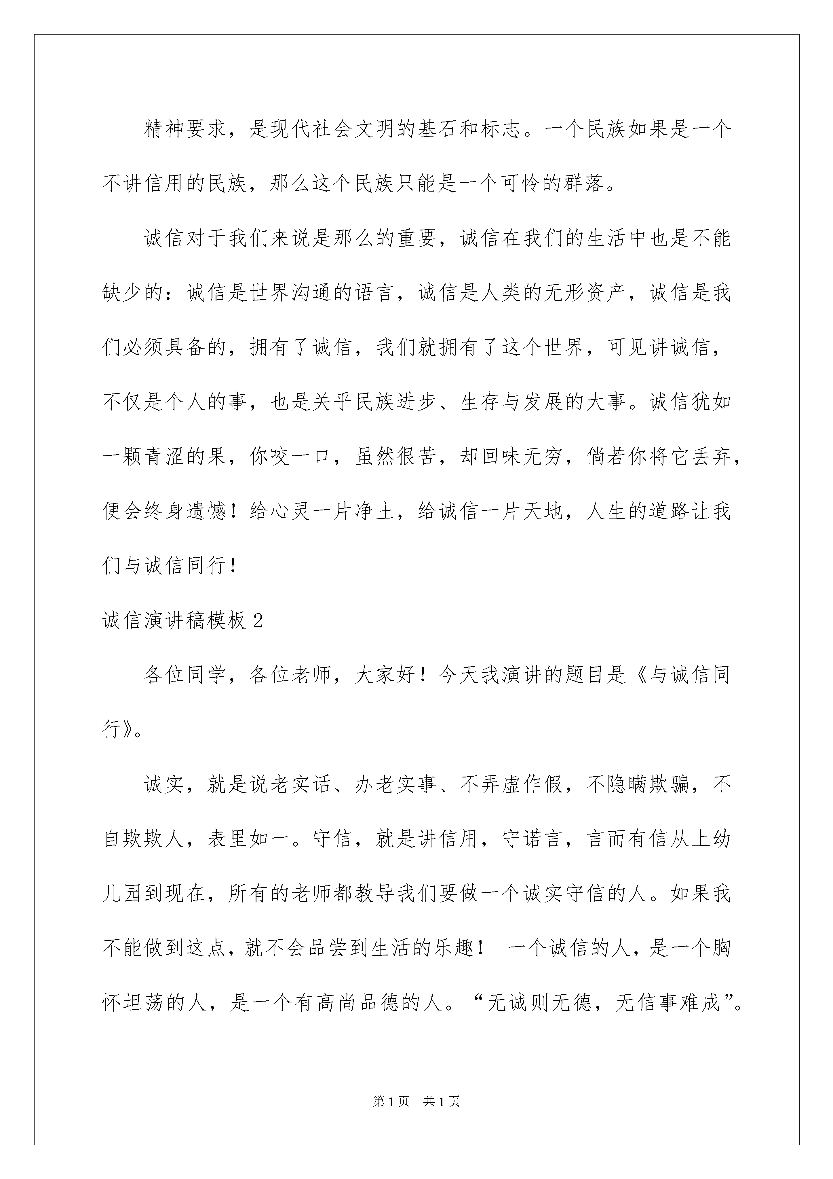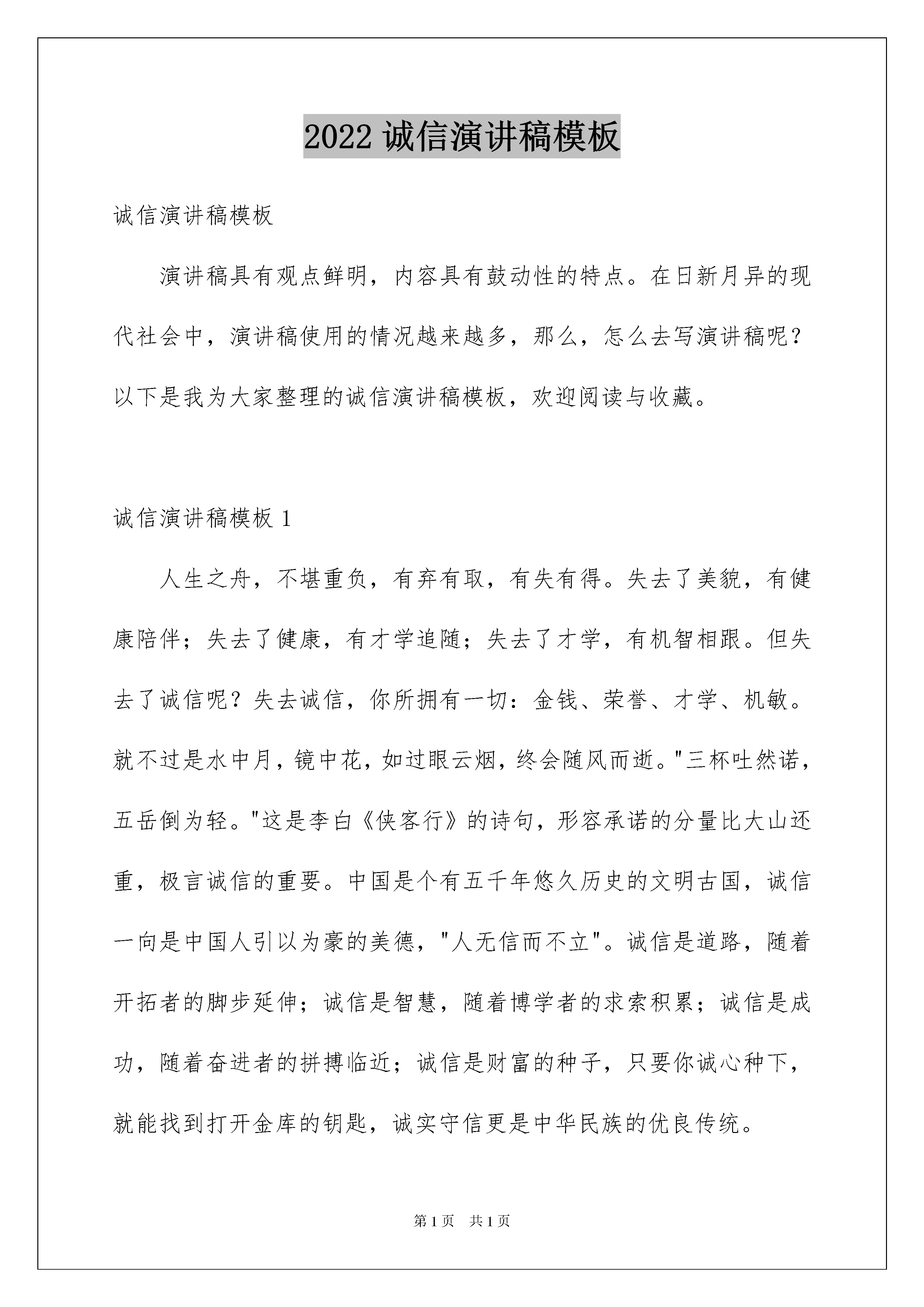 2022诚信演讲稿模板诚信演讲稿模板演讲稿具有观点鲜明,内容具有鼓动性的特点。在日新月异的现代社会中,演讲稿使用的情况越来越多,那么,怎么去写演讲稿呢?以下是我为大家整理的诚信演讲稿模板,欢迎阅读与收藏。诚信演讲稿模板1人生之舟,不堪重负,有弃有取,有失有得。失去了美貌,有健康陪伴;失去了健康,有才学追随;失去了才学,有机智相跟。但失去了诚信呢?失去诚信,你所拥有一切:金钱、荣誉、才学、机敏。就不过是水中月,镜中花,如过眼云烟,终会随风而逝。"三杯吐然诺,五岳倒为轻。"这是李白《侠客行》的诗句,形容承诺的分量比大山还重,极言诚信的重要。中国是个有五千年悠久历史的文明古国,诚信一向是中国人引以为豪的美德,"人无信而不立"。诚信是道路,随着开拓者的脚步延伸;诚信是智慧,随着博学者的求索积累;诚信是成功,随着奋进者的拼搏临近;诚信是财富的种子,只要你诚心种下,就能找到打开金库的钥匙,诚实守信更是中华民族的优良传统。中国是个五千年的文明古国,诚信一向是中国人引以为傲的美德,"人无信而不立",童叟无欺的故事熏陶了我们几千年。古时候有位曾子,他是孔子的学生,有一天,曾妻要上街,孩子哭闹着也要去,曾妻对孩子说别闹,许诺等她回来时杀猪给他吃。看来,她是不打算实践诺言的。因为等她回家,看见曾子真的准备杀猪便马上阻止,说自己只是跟孩子说说玩的。曾子说:作父母的如果失信于孩子,他不懂事,还没有辨别能力,接触到的是父母,所以什么都跟父母学。你现在哄骗他,等于是在潜移默化地教他学会欺骗。就等于教孩子也去欺骗。说完,就把那猪杀了。"言必信、行必果"是中华民族的传统美德。诚信是一种美德,历来都被人称颂,一个人如果没有了诚信,即使一时拥有荣华富贵,但最终还会一无所有的。就像《狼来了》里面的那个小男孩,因为丢掉诚信,而自己却被那些狼给吃掉了。又如:日本餐饮业有条行规,盘子要用水洗七遍,洗盘子计件付酬。有个打工的学生为提高效率,少洗了两遍。在抽查中,老板用试纸测出盘子的清洁度不达标准,责问这个学生。她却振振有辞:"洗五遍不也挺干净吗?"老板淡淡地说:"你不诚实,请你离开。"这个学生不得不到另一家餐馆应聘,老板打量他半天,说:"你就是那个只洗五遍盘子的学生吧,对不起,我们不需要。"第二家,第三家。她屡屡碰壁。不仅如此,她的房东也要她退房。万般无奈,她只得搬离这个城市。诚实守信,是中华民族的传统美德,它早已融入我们民族的血液中。无论我们做什么事,都要讲诚信。不讲诚信的人有可能无立足之地。无数事实告诉我们,交往中不兑现自己的承诺,失信与人,就会产生信任危机。上则例子告诉了我们"人而无信,不知其可也",所以我们不能不讲诚信。诚信是道路,随着开拓者的脚步延伸;诚信是智慧,随着博学者的求索积累;诚信是成功,随着奋进者的拼搏临近;诚信是财富的种子,只要你诚心种下,就能找到打开金库的钥匙。抛弃诚信,虚伪的面具将充斥生活的每个角落,生命变得生气全无,友谊之花在凋谢,亲情之果在陨落;撩起人们面前的五彩面纱,露出的是"君子"们道貌岸然的脸,变了形的丑陋的脸。这样的世界,流淌着恶浊的血液,飘浮着腐朽的气息,太可怕了!诚信已成了这个社会必不可少的品德,诚信能完善我们自己,它对自己、他人都有好处,搏得信任,博得好感,博得事业上的提高,博得生活上的进步,这些比无诚信要好上许多。懂得诚信,做好诚信,改善身心,利益如流,也就是说诚信是福。诚信也是一个民族和国家的精神要求,是现代社会文明的基石和标志。一个民族如果是一个不讲信用的民族,那么这个民族只能是一个可怜的群落。诚信对于我们来说是那么的重要,诚信在我们的生活中也是不能缺少的:诚信是世界沟通的语言,诚信是人类的无形资产,诚信是我们必须具备的,拥有了诚信,我们就拥有了这个世界,可见讲诚信,不仅是个人的事,也是关乎民族进步、生存与发展的大事。诚信犹如一颗青涩的果,你咬一口,虽然很苦,却回味无穷,倘若你将它丢弃,便会终身遗憾!给心灵一片净土,给诚信一片天地,人生的道路让我们与诚信同行!诚信演讲稿模板2各位同学,各位老师,大家好!今天我演讲的题目是《与诚信同行》。诚实,就是说老实话、办老实事、不弄虚作假,不隐瞒欺骗,不自欺欺人,表里如一。守信,就是讲信用,守诺言,言而有信从上幼儿园到现在,所有的老师都教导我们要做一个诚实守信的人。如果我不能做到这点,就不会品尝到生活的乐趣!一个诚信的人,是一个胸怀坦荡的人,是一个有高尚品德的人。“无诚则无德,无信事难成”。在社会主义文明高度发展、人与人相处难见真情的今天,诚信品质尤为重要。诚信是一个国家,一个社会,一个民族生存的必备条件。一个国家政权的真正强大,并