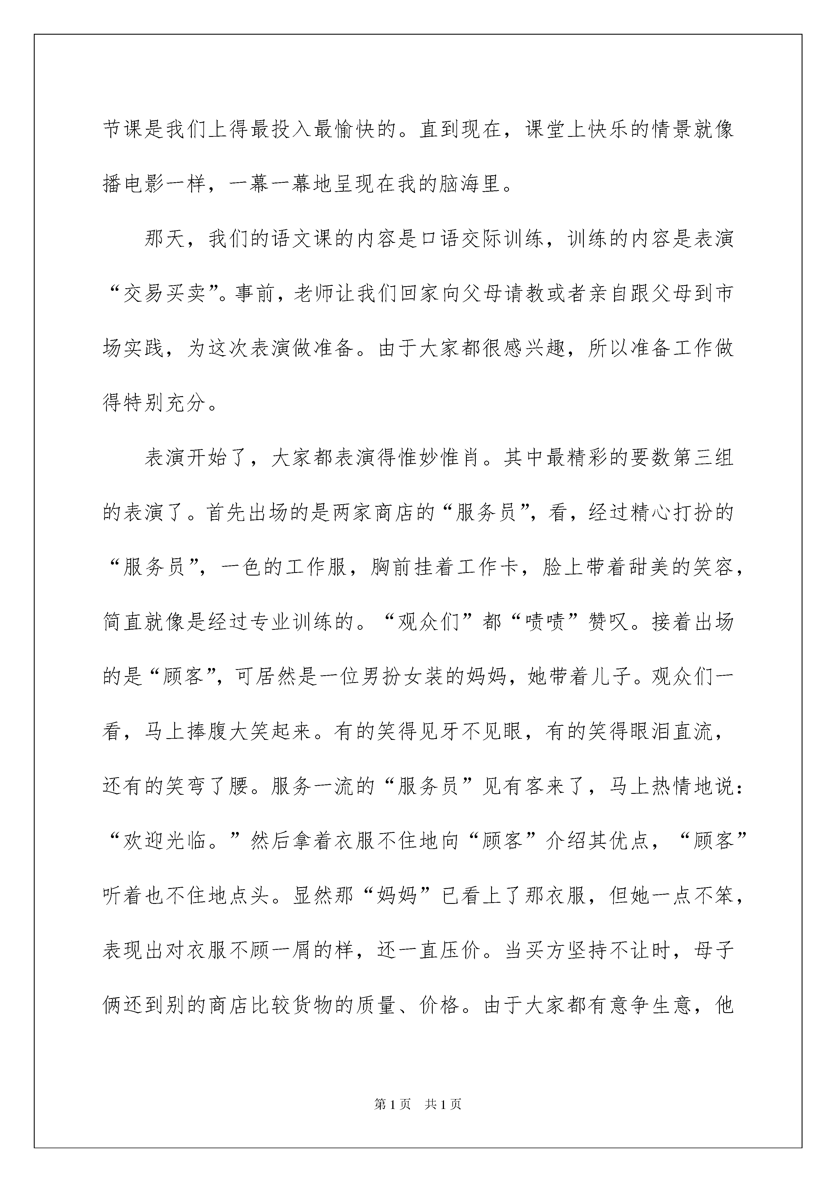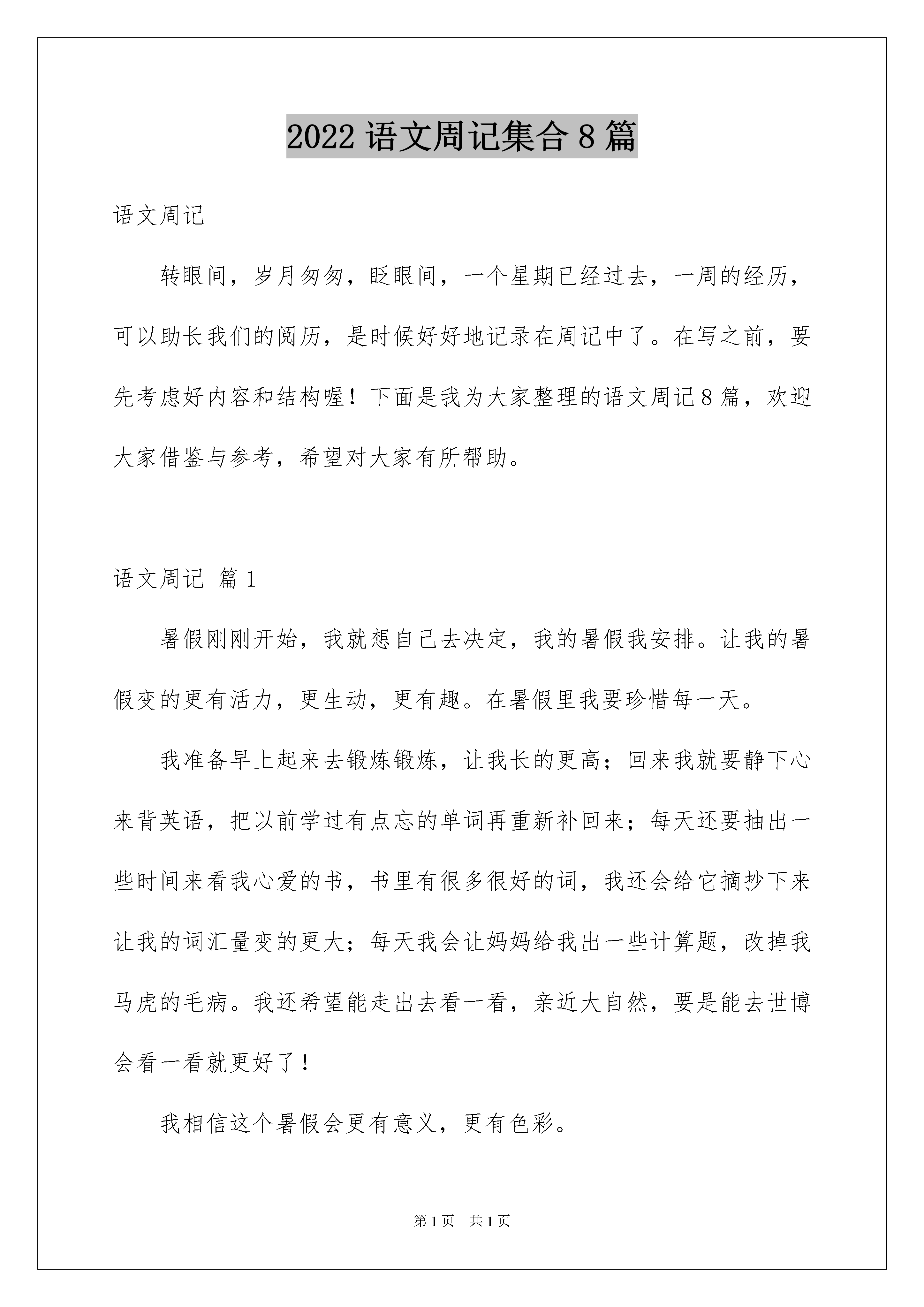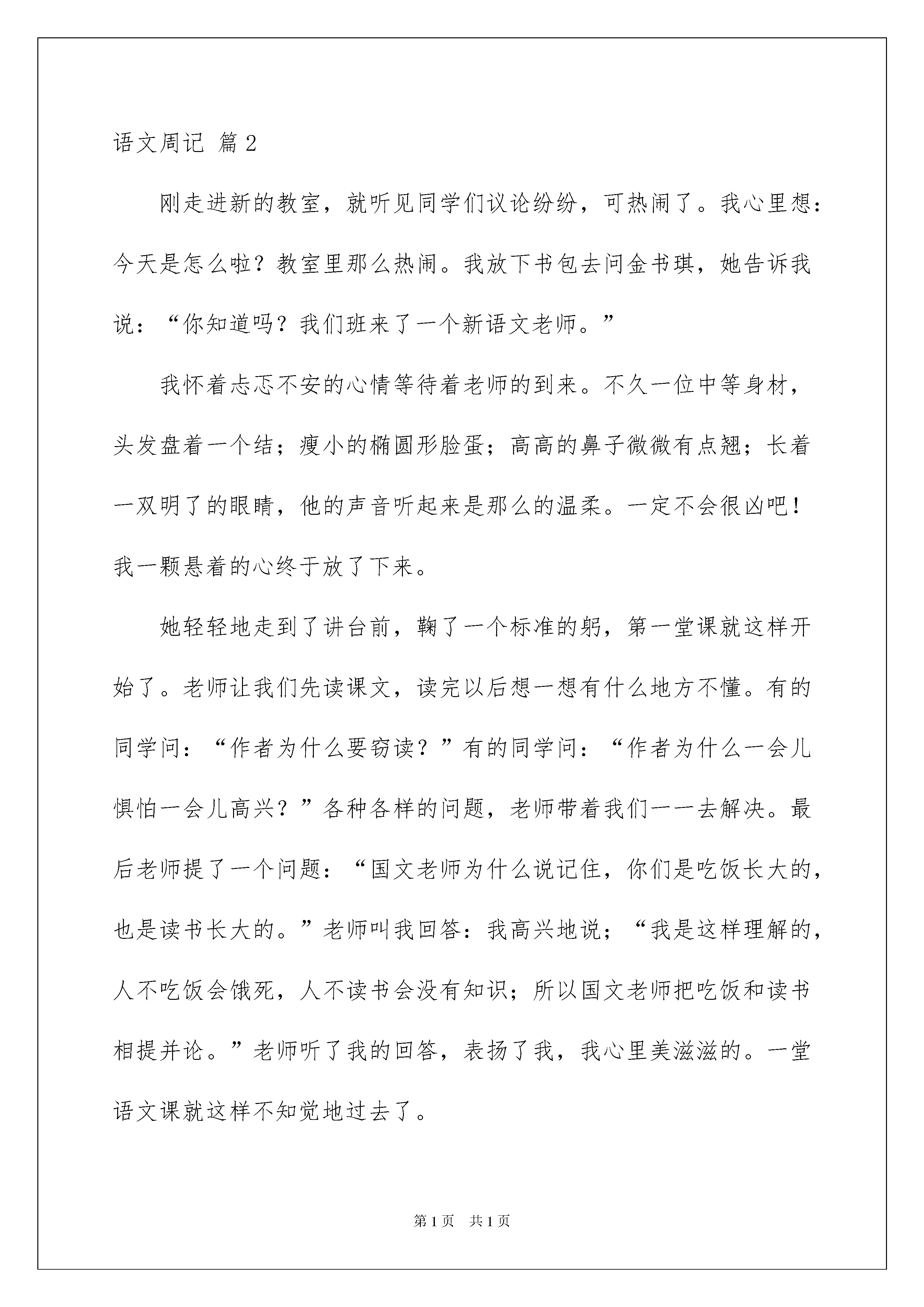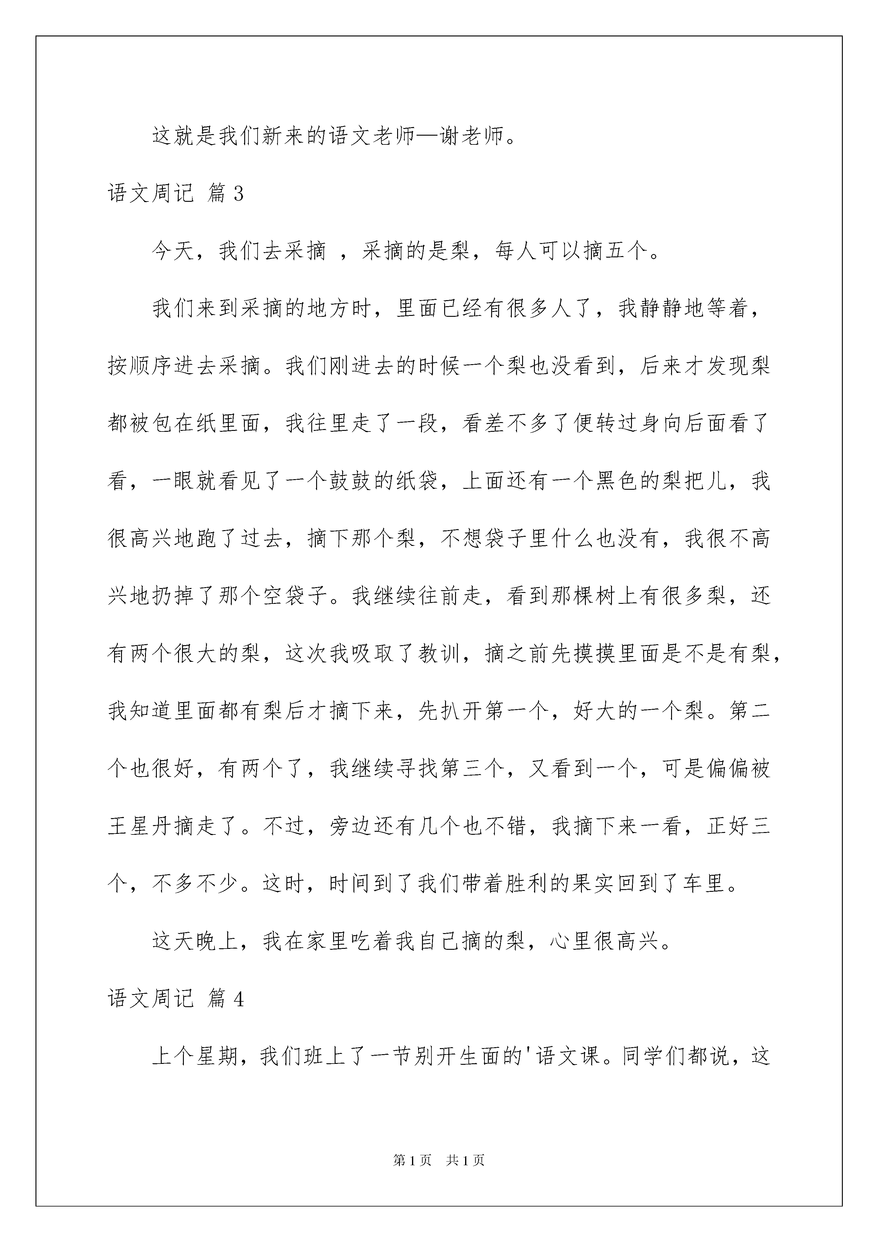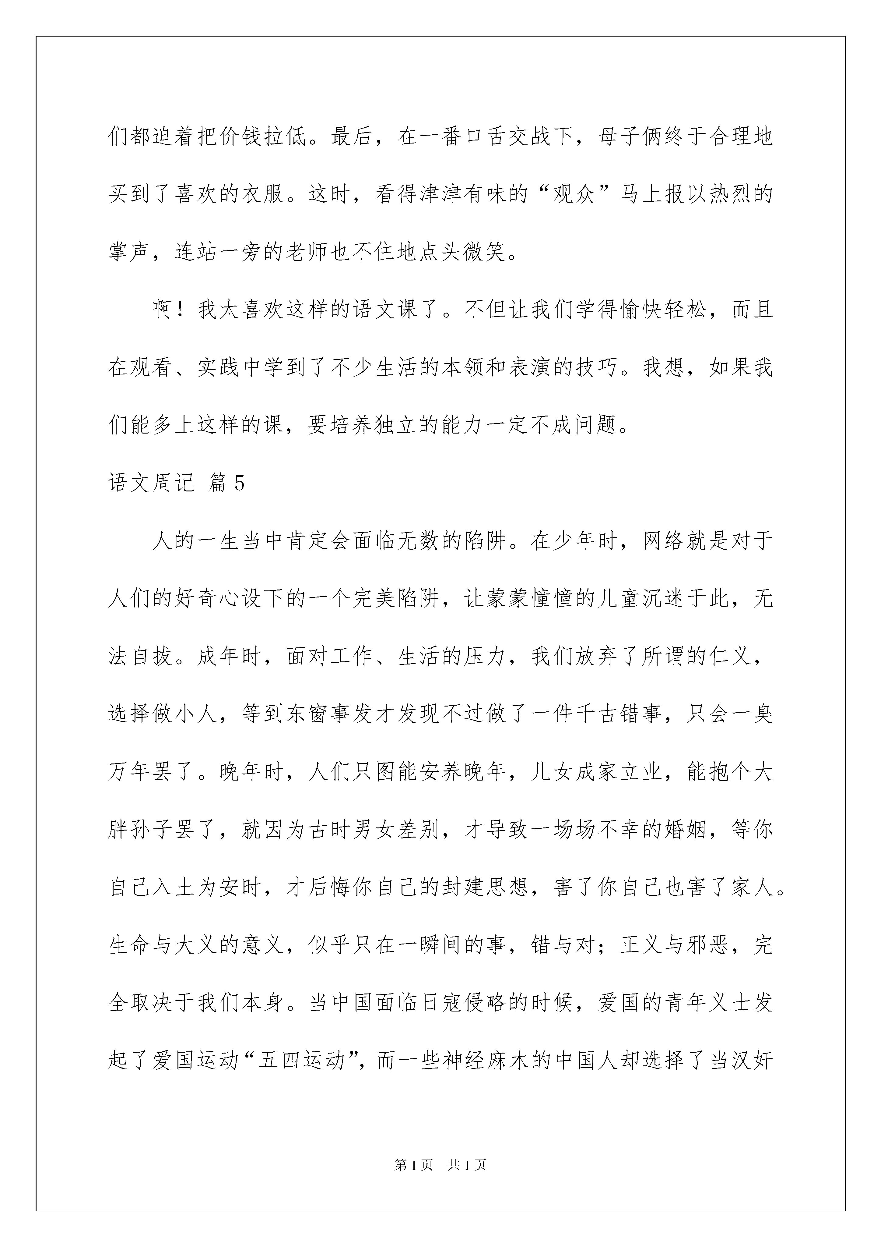 2022语文周记集合8篇语文周记转眼间,岁月匆匆,眨眼间,一个星期已经过去,一周的经历,可以助长我们的阅历,是时候好好地记录在周记中了。在写之前,要先考虑好内容和结构喔!下面是我为大家整理的语文周记8篇,欢迎大家借鉴与参考,希望对大家有所帮助。语文周记篇1暑假刚刚开始,我就想自己去决定,我的暑假我安排。让我的暑假变的更有活力,更生动,更有趣。在暑假里我要珍惜每一天。我准备早上起来去锻炼锻炼,让我长的更高;回来我就要静下心来背英语,把以前学过有点忘的单词再重新补回来;每天还要抽出一些时间来看我心爱的书,书里有很多很好的词,我还会给它摘抄下来让我的词汇量变的更大;每天我会让妈妈给我出一些计算题,改掉我马虎的毛病。我还希望能走出去看一看,亲近大自然,要是能去世博会看一看就更好了!我相信这个暑假会更有意义,更有色彩。语文周记篇2刚走进新的教室,就听见同学们议论纷纷,可热闹了。我心里想:今天是怎么啦?教室里那么热闹。我放下书包去问金书琪,她告诉我说:“你知道吗?我们班来了一个新语文老师。”我怀着忐忑不安的心情等待着老师的到来。不久一位中等身材,头发盘着一个结;瘦小的椭圆形脸蛋;高高的鼻子微微有点翘;长着一双明了的眼睛,他的声音听起来是那么的温柔。一定不会很凶吧!我一颗悬着的心终于放了下来。她轻轻地走到了讲台前,鞠了一个标准的躬,第一堂课就这样开始了。老师让我们先读课文,读完以后想一想有什么地方不懂。有的同学问:“作者为什么要窃读?”有的同学问:“作者为什么一会儿惧怕一会儿高兴?”各种各样的问题,老师带着我们一一去解决。最后老师提了一个问题:“国文老师为什么说记住,你们是吃饭长大的,也是读书长大的。”老师叫我回答:我高兴地说;“我是这样理解的,人不吃饭会饿死,人不读书会没有知识;所以国文老师把吃饭和读书相提并论。”老师听了我的回答,表扬了我,我心里美滋滋的。一堂语文课就这样不知觉地过去了。这就是我们新来的语文老师—谢老师。语文周记篇3今天,我们去采摘,采摘的是梨,每人可以摘五个。我们来到采摘的地方时,里面已经有很多人了,我静静地等着,按顺序进去采摘。我们刚进去的时候一个梨也没看到,后来才发现梨都被包在纸里面,我往里走了一段,看差不多了便转过身向后面看了看,一眼就看见了一个鼓鼓的纸袋,上面还有一个黑色的梨把儿,我很高兴地跑了过去,摘下那个梨,不想袋子里什么也没有,我很不高兴地扔掉了那个空袋子。我继续往前走,看到那棵树上有很多梨,还有两个很大的梨,这次我吸取了教训,摘之前先摸摸里面是不是有梨,我知道里面都有梨后才摘下来,先扒开第一个,好大的一个梨。第二个也很好,有两个了,我继续寻找第三个,又看到一个,可是偏偏被王星丹摘走了。不过,旁边还有几个也不错,我摘下来一看,正好三个,不多不少。这时,时间到了我们带着胜利的果实回到了车里。这天晚上,我在家里吃着我自己摘的梨,心里很高兴。语文周记篇4上个星期,我们班上了一节别开生面的'语文课。同学们都说,这节课是我们上得最投入最愉快的。直到现在,课堂上快乐的情景就像播电影一样,一幕一幕地呈现在我的脑海里。那天,我们的语文课的内容是口语交际训练,训练的内容是表演“交易买卖”。事前,老师让我们回家向父母请教或者亲自跟父母到市场实践,为这次表演做准备。由于大家都很感兴趣,所以准备工作做得特别充分。表演开始了,大家都表演得惟妙惟肖。其中最精彩的要数第三组的表演了。首先出场的是两家商店的“服务员”,看,经过精心打扮的“服务员”,一色的工作服,胸前挂着工作卡,脸上带着甜美的笑容,简直就像是经过专业训练的。“观众们”都“啧啧”赞叹。接着出场的是“顾客”,可居然是一位男扮女装的妈妈,她带着儿子。观众们一看,马上捧腹大笑起来。有的笑得见牙不见眼,有的笑得眼泪直流,还有的笑弯了腰。服务一流的“服务员”见有客来了,马上热情地说:“欢迎光临。”然后拿着衣服不住地向“顾客”介绍其优点,“顾客”听着也不住地点头。显然那“妈妈”已看上了那衣服,但她一点不笨,表现出对衣服不顾一屑的样,还一直压价。当买方坚持不让时,母子俩还到别的商店比较货物的质量、价格。由于大家都有意争生意,他们都迫着把价钱拉低。最后,在一番口舌交战下,母子俩终于合理地买到了喜欢的衣服。这时,看得津津有味的“观众”马上报以热烈的掌声,连站一旁的老师也不住地点头微笑。啊!我太喜欢这样的语文课了。不但让我们学得愉快轻松,而且在观看、实践中学到了不少生活的本领和表演的技巧。我想,如果我们能多上这样的课,要培养独立的能力一定不成问题。语文周记篇5人的一生当中肯定会面临无数的陷阱。在少年时,网络就是对于人们的好奇心设下的一个完