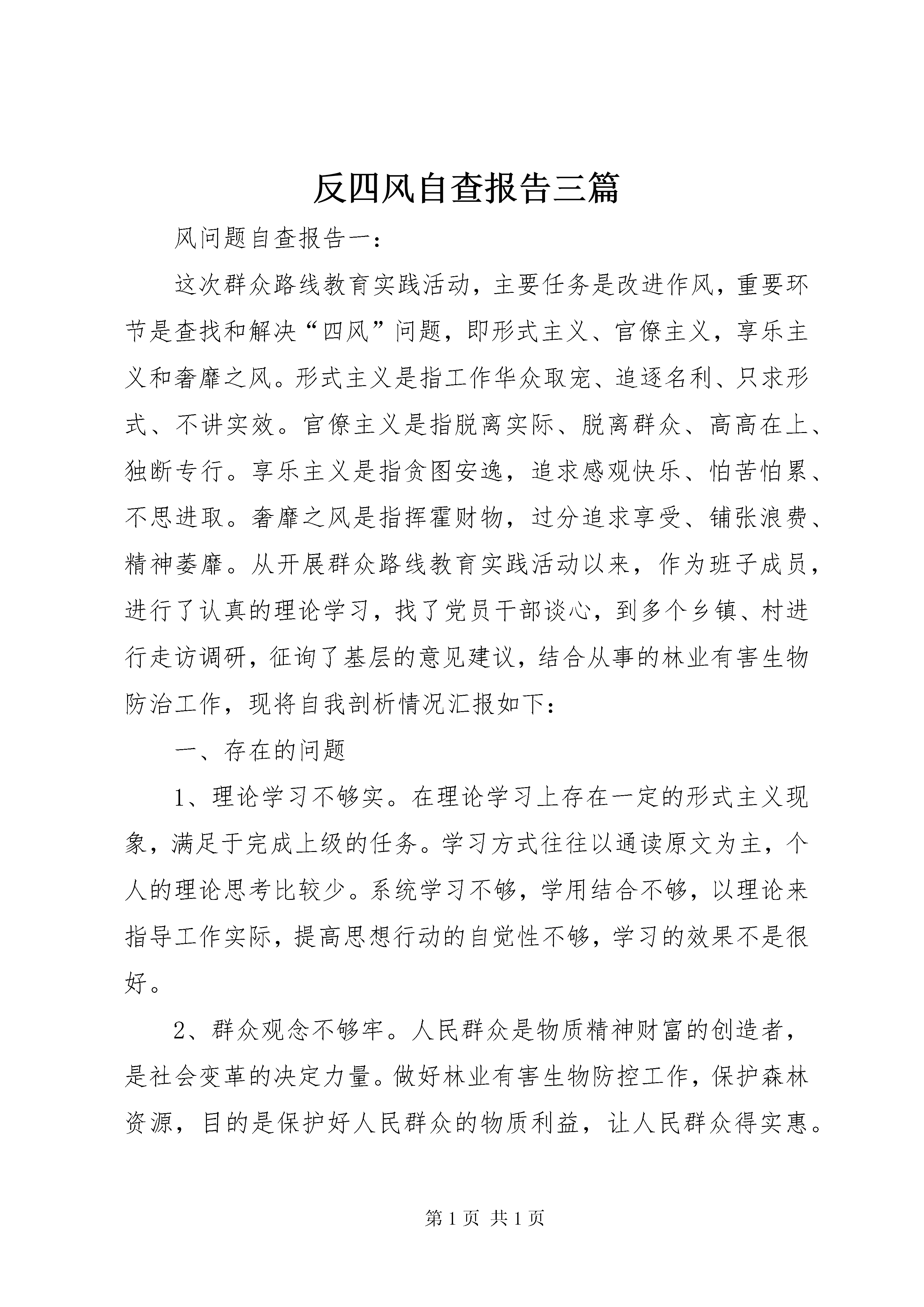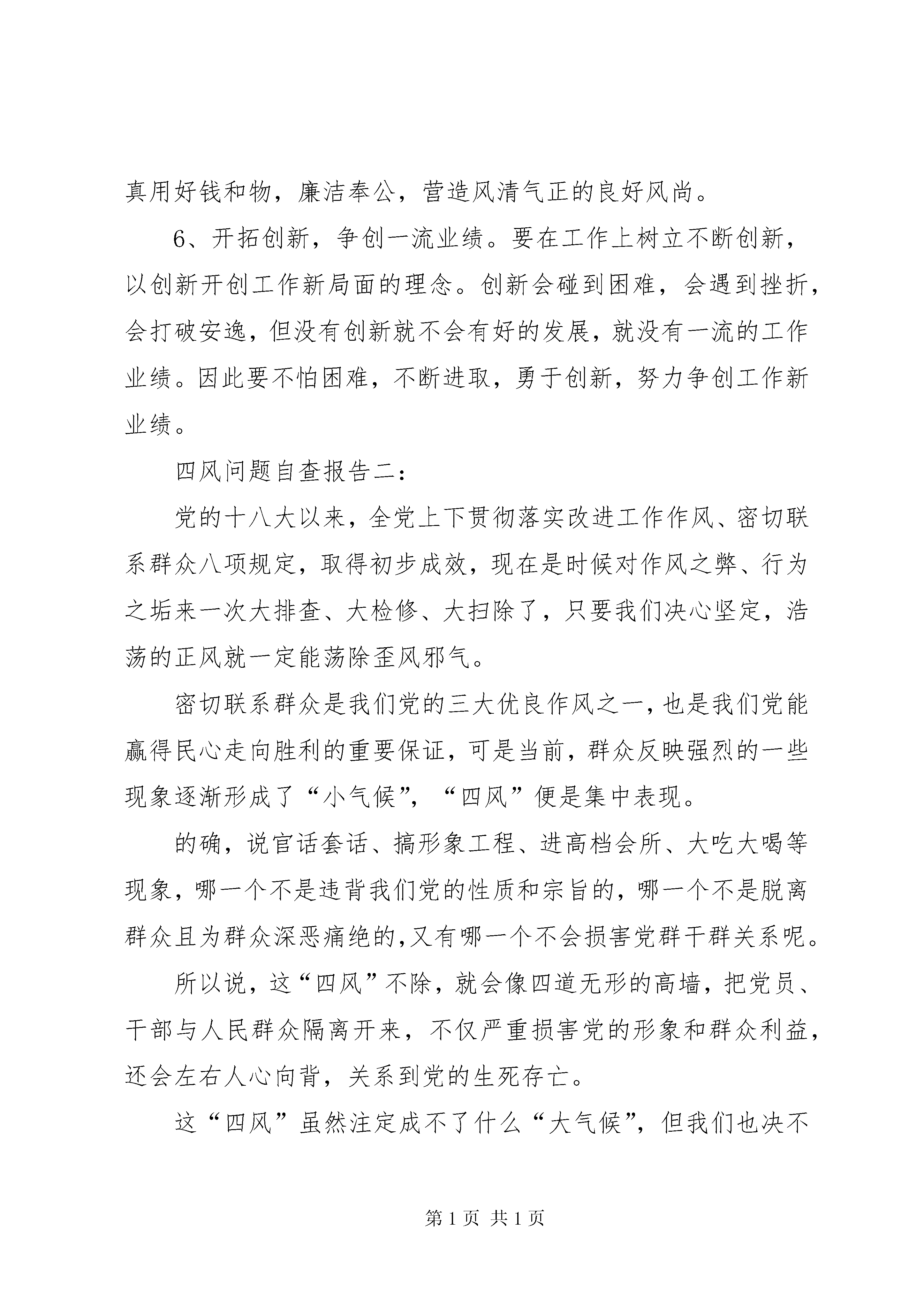 反四风自查报告三篇风问题自查报告一:这次群众路线教育实践活动,主要任务是改进作风,重要环节是查找和解决“四风”问题,即形式主义、官僚主义,享乐主义和奢靡之风。形式主义是指工作华众取宠、追逐名利、只求形式、不讲实效。官僚主义是指脱离实际、脱离群众、高高在上、独断专行。享乐主义是指贪图安逸,追求感观快乐、怕苦怕累、不思进取。奢靡之风是指挥霍财物,过分追求享受、铺张浪费、精神萎靡。从开展群众路线教育实践活动以来,作为班子成员,进行了认真的理论学习,找了党员干部谈心,到多个乡镇、村进行走访调研,征询了基层的意见建议,结合从事的林业有害生物防治工作,现将自我剖析情况汇报如下:一、存在的问题1、理论学习不够实。在理论学习上存在一定的形式主义现象,满足于完成上级的任务。学习方式往往以通读原文为主,个人的理论思考比较少。系统学习不够,学用结合不够,以理论来指导工作实际,提高思想行动的自觉性不够,学习的效果不是很好。2、群众观念不够牢。人民群众是物质精神财富的创造者,是社会变革的决定力量。做好林业有害生物防控工作,保护森林资源,目的是保护好人民群众的物质利益,让人民群众得实惠。但工作中群众观念淡薄,只唯完成上级任务,导致群众不理解的现象时有发生,影响了工作的成效。3、基层情况不够清。对基层情况不搞清楚、高高在上、脱离实际,甚至瞎指挥是官僚主义的表现。为做好工作,工作措施要符合实际,就必须摸清基层情况,了解基层群众的实际需求。本人分管全市林业有害生物防治工作,对乡镇、村、林农在防治方面的情况有时还不够清楚,调研也比较少,影响了工作的针对性。4、工作作风不够实。由于种种原因,工作作风上也存在形式主义现象。林业有害生物防治工作的对象在基层,工作中脱离实际、好大喜功、只求形式、不讲实效的不实之风不同程度地存在。不深入基层群众,不关心群众疾苦,不按客观规律办事的现象也偶有发生。如由于种种原因,工作中统计数字不实,虚报的现象没有完全杜绝,忙于应付各种不切实际的考核的现象时有发生。5、服务能力不够强。坚持群众路线,就要全心全意为人民服务。林业有害生物防治就是要为基层和林农服务。但实际工作中服务能力还不够强,离领导和群众要求还有距离,和争创一流工作业绩的要求不相适应。主要表现在服务意识不够强,防治技术需要不断改进,组织管理水平亟待提高。6、吃苦精神不够牢。平时比较安于现状,不思进取,满足于做好自己的份内事,没有把精力和时间全部扑在工作上。生活图安逸、怕吃苦。工作上有时有畏难情绪,缺少逢山开路、遇河搭桥的勇气,缺少不断开创工作新局面的思想和意识。二、问题的成因1、政治理论学习不深入,修养没有到位。没有把理论学习放在应有的重要位置,没有系统地学习邓小平理论、三个代表重要思想和科学发展观,以及群众路线的理论论述。缺少系统研究和深刻理解,缺少自觉地以群众路线的观点、方法来认识问题和解决问题,政治理论修养没有到位。2、主观世界改造不主动,思想没有到位。思想决定行动,我们的业务工作重在改造客观世界,但在改造客观世界的同时,我们必须同时改造好主观世界。主观世界没有改造好,思想认识问题不解决,最终客观世界也是改造不好的。平时,由于忙于业务工作,重在做好具体事务,在改造主观世界方面不够主动,思想没有到位。3、群众路线方法少实践,素质没有到位。群众路线工作方法要求制订的各项政策,出台的措施必须是从群众中来,然后到群众中去。领导方式必须是一切依靠群众,一切为了群众。所做的工作,最终是要让人民群众评判,让人民群众满意。但是在践行群众路线工作方法方面,实践得不够,自觉性不强,素质没有到位。三、整改的措施1、加强学习,增强群众观念。要进一步学习邓小平理论、三个代表重要思想和科学发展观,学习唯物史观和领袖们关于群众路线的论述,充分认识人民群众的主体地位,牢固树立为人民服务的思想。在业务中增强群众观念,坚持有害生物防治一切依靠群众,一切为了群众的理念。2、加强调研,摸清基层情况。要全面掌握基层业务工作情况,充分摸清乡镇、村的林业有害生物防控现状,了解基层群众的困难和需求。加强调研,明确工作中存在的不足和问题,有针对性提出解决问题和不足的对策措施。3、求真务实,改进工作作风。要切实防治好发生的林业有害生物,实实在在地为基层林农解决实际问题。不搞花架子、不做秀、不搞形式主义,务求各项工作取得实效。改进学风、会风、文风,养成求真务实的工作作风。4、深入实际,提高服务能力。林业有害生物发生在山头地块,防控的主战场在山区,工作对象是基层干部群众。要做好防控工作,必须深入基层一线,研究发生防治规律,推广新型实用技术,科学组织防控,不断提高服务能力。5、艰苦奋斗,营造良好风尚。目前我们的工作条件已经有较大的改善,林业有害生物防控的资金也在不断增加。但是,我们必须坚持艰苦奋斗的光荣