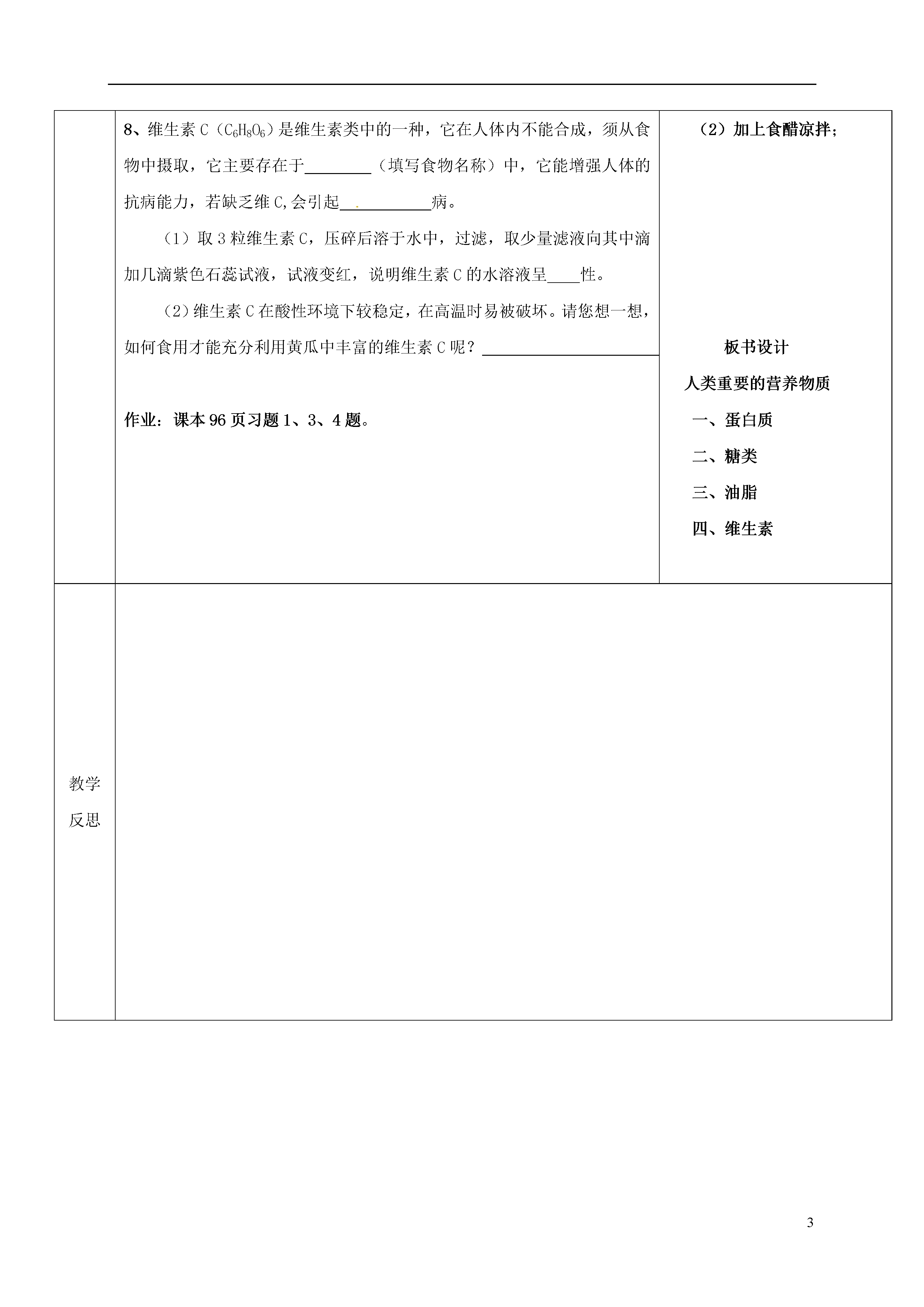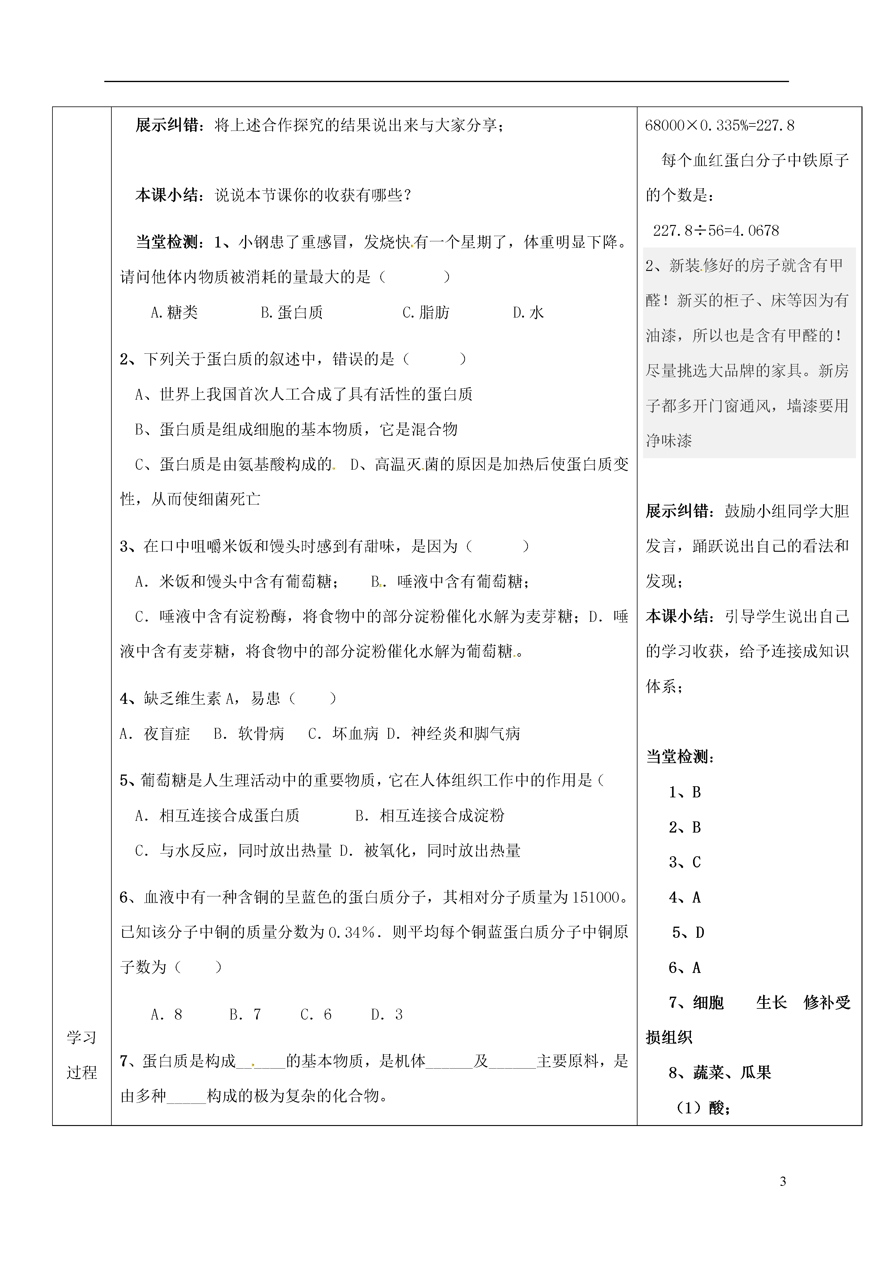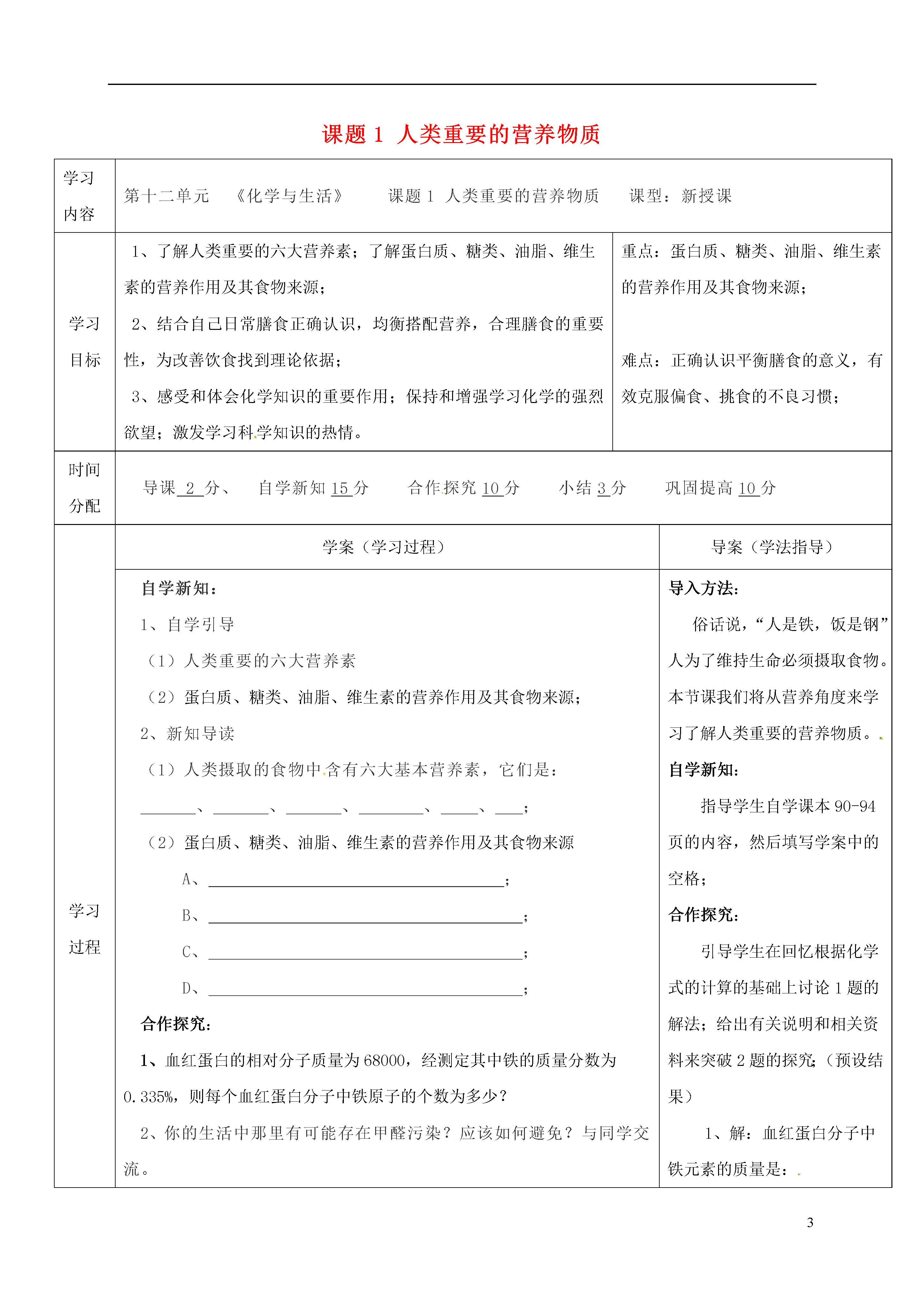 3课题1人类重要的营养物质学习内容第十二单元《化学与生活》课题1人类重要的营养物质课型:新授课学习目标1、了解人类重要的六大营养素;了解蛋白质、糖类、油脂、维生素的营养作用及其食物来源;2、结合自己日常膳食正确认识,均衡搭配营养,合理膳食的重要性,为改善饮食找到理论依据;3、感受和体会化学知识的重要作用;保持和增强学习化学的强烈欲望;激发学习科学知识的热情。重点:蛋白质、糖类、油脂、维生素的营养作用及其食物来源;难点:正确认识平衡膳食的意义,有效克服偏食、挑食的不良习惯;时间分配导课2分、自学新知15分合作探究10分小结3分巩固提高10分学习过程学习过程学案(学习过程)导案(学法指导)自学新知:1、自学引导(1)人类重要的六大营养素(2)蛋白质、糖类、油脂、维生素的营养作用及其食物来源;2、新知导读(1)人类摄取的食物中含有六大基本营养素,它们是:、、、、、;(2)蛋白质、糖类、油脂、维生素的营养作用及其食物来源A、;B、;C、;D、;合作探究:1、血红蛋白的相对分子质量为68000,经测定其中铁的质量分数为0.335%,则每个血红蛋白分子中铁原子的个数为多少?2、你的生活中那里有可能存在甲醛污染?应该如何避免?与同学交流。展示纠错:将上述合作探究的结果说出来与大家分享;本课小结:说说本节课你的收获有哪些?当堂检测:1、小钢患了重感冒,发烧快有一个星期了,体重明显下降。请问他体内物质被消耗的量最大的是()A.糖类B.蛋白质C.脂肪D.水2、下列关于蛋白质的叙述中,错误的是()A、世界上我国首次人工合成了具有活性的蛋白质B、蛋白质是组成细胞的基本物质,它是混合物C、蛋白质是由氨基酸构成的D、高温灭菌的原因是加热后使蛋白质变性,从而使细菌死亡3、在口中咀嚼米饭和馒头时感到有甜味,是因为()A.米饭和馒头中含有葡萄糖;B.唾液中含有葡萄糖;C.唾液中含有淀粉酶,将食物中的部分淀粉催化水解为麦芽糖;D.唾液中含有麦芽糖,将食物中的部分淀粉催化水解为葡萄糖。4、缺乏维生素A,易患()A.夜盲症B.软骨病C.坏血病D.神经炎和脚气病5、葡萄糖是人生理活动中的重要物质,它在人体组织工作中的作用是()A.相互连接合成蛋白质B.相互连接合成淀粉C.与水反应,同时放出热量D.被氧化,同时放出热量6、血液中有一种含铜的呈蓝色的蛋白质分子,其相对分子质量为151000。已知该分子中铜的质量分数为0.34%.则平均每个铜蓝蛋白质分子中铜原子数为()A.8B.7C.6D.37、蛋白质是构成______的基本物质,是机体______及______主要原料,是由多种_____构成的极为复杂的化合物。8、维生素C(C6H8O6)是维生素类中的一种,它在人体内不能合成,须从食物中摄取,它主要存在于(填写食物名称)中,它能增强人体的抗病能力,若缺乏维C,会引起病。(1)取3粒维生素C,压碎后溶于水中,过滤,取少量滤液向其中滴加几滴紫色石蕊试液,试液变红,说明维生素C的水溶液呈性。(2)维生素C在酸性环境下较稳定,在高温时易被破坏。请您想一想,如何食用才能充分利用黄瓜中丰富的维生素C呢?。作业:课本96页习题1、3、4题。导入方法:俗话说,“人是铁,饭是钢”人为了维持生命必须摄取食物。本节课我们将从营养角度来学习了解人类重要的营养物质。自学新知:指导学生自学课本90-94页的内容,然后填写学案中的空格;合作探究:引导学生在回忆根据化学式的计算的基础上讨论1题的解法;给出有关说明和相关资料来突破2题的探究;(预设结果)1、解:血红蛋白分子中铁元素的质量是:68000×0.335%=227.8每个血红蛋白分子中铁原子的个数是:227.8÷56=4.06782、新装修好的房子就含有甲醛!新买的柜子、床等因为有油漆,所以也是含有甲醛的!尽量挑选大品牌的家具。新房子都多开门窗通风,墙漆要用净味漆展示纠错:鼓励小组同学大胆发言,踊跃说出自己的看法和发现;本课小结:引导学生说出自己的学习收获,给予连接成知识体系;当堂检测:1、B2、B3、C4、A5、D6、A7、细胞生长修补受损组织8、蔬菜、瓜果(1)酸;(2)加上食醋凉拌;板书设计人类重要的营养物质一、蛋白质二、糖类三、油脂四、维生素教学反思