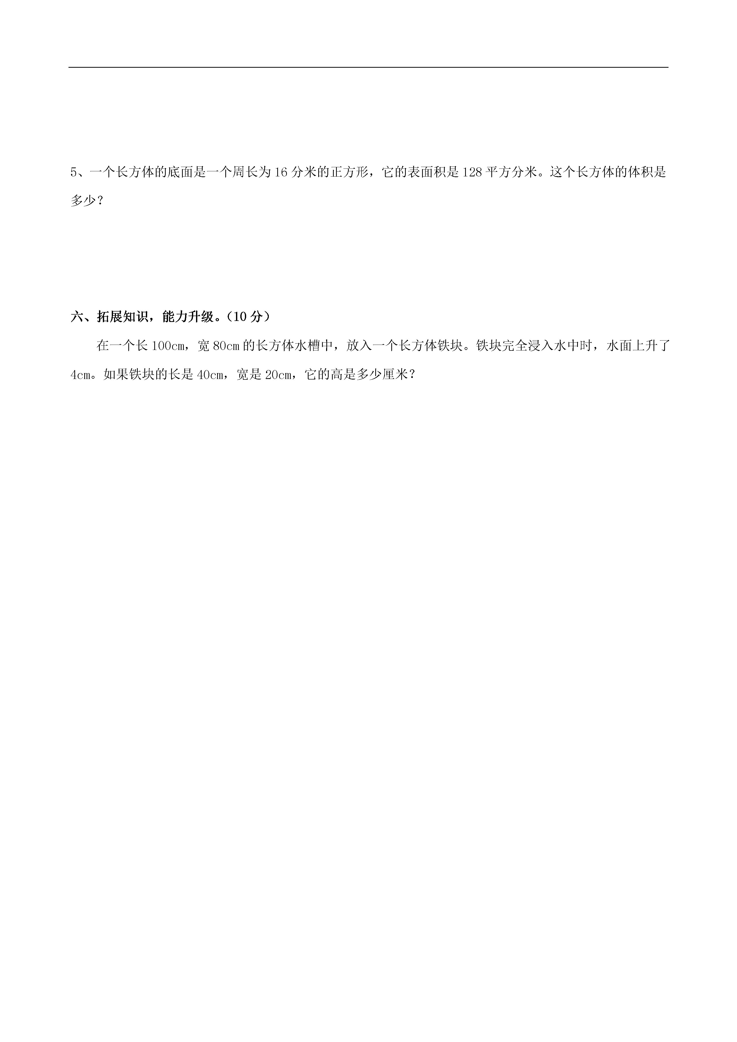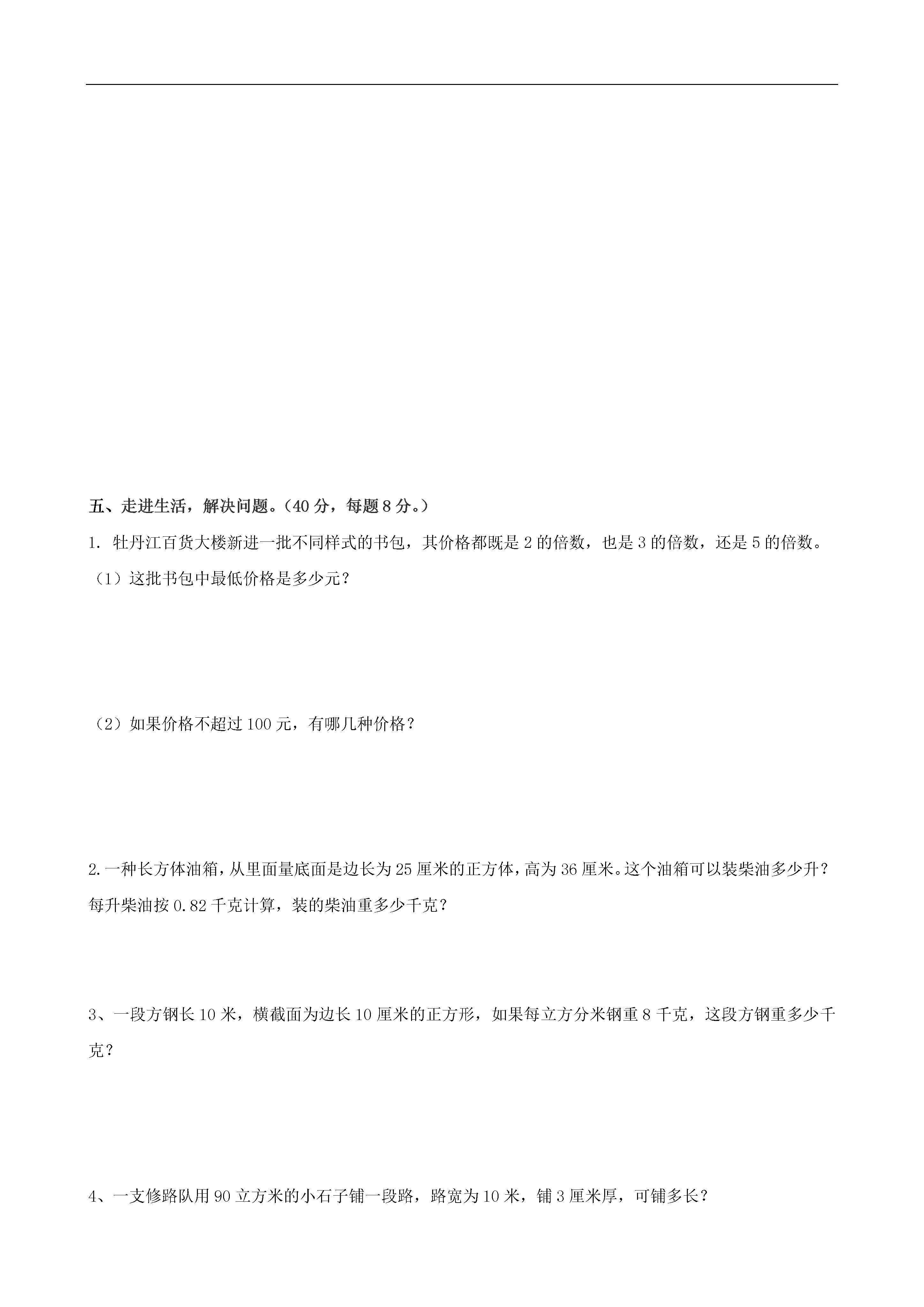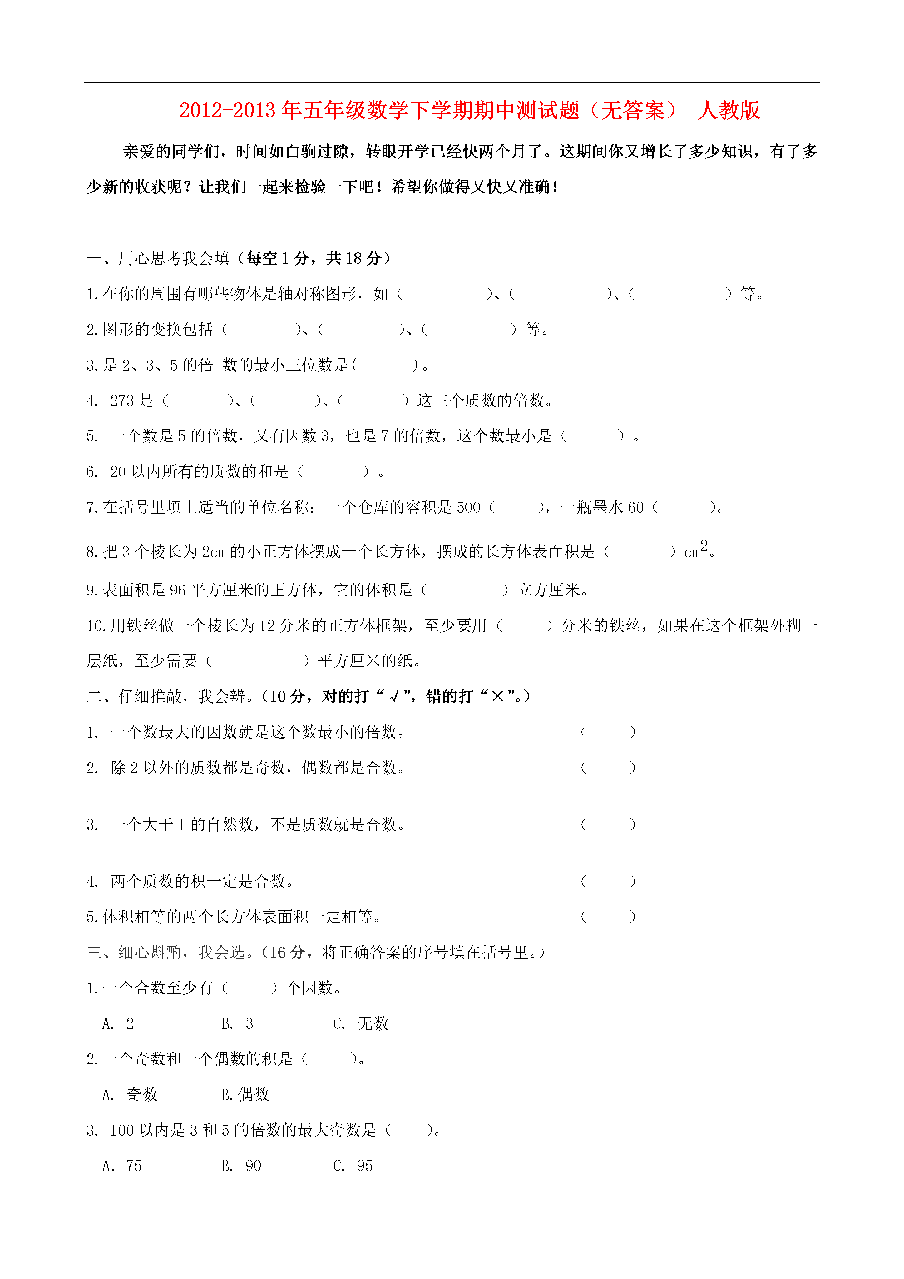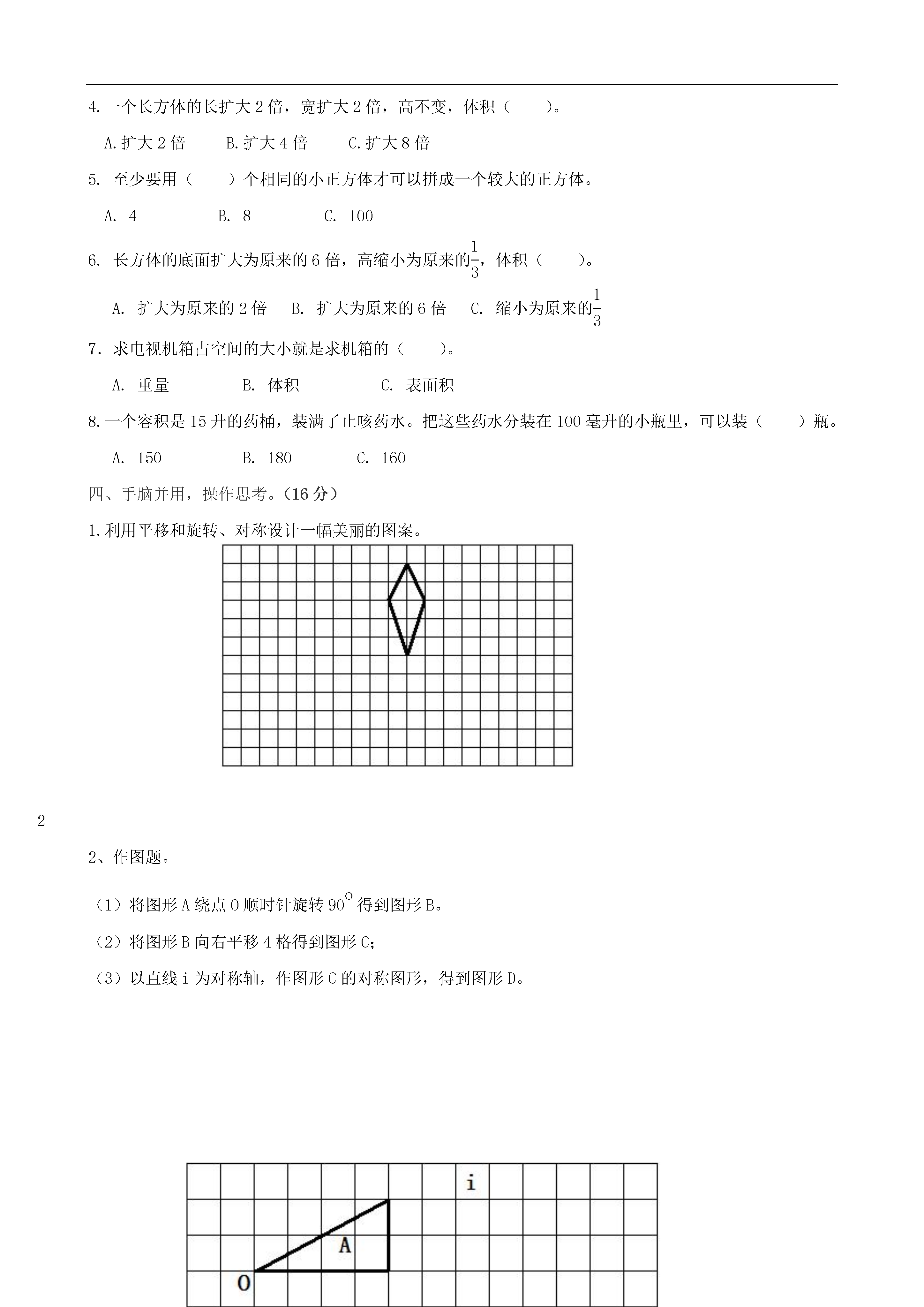 2012-2013年五年级数学下学期期中测试题(无答案)人教版亲爱的同学们,时间如白驹过隙,转眼开学已经快两个月了。这期间你又增长了多少知识,有了多少新的收获呢?让我们一起来检验一下吧!希望你做得又快又准确!一、用心思考我会填(每空1分,共18分)1.在你的周围有哪些物体是轴对称图形,如()、()、()等。2.图形的变换包括()、()、()等。3.是2、3、5的倍数的最小三位数是()。4.273是()、()、()这三个质数的倍数。5.一个数是5的倍数,又有因数3,也是7的倍数,这个数最小是()。6.20以内所有的质数的和是()。7.在括号里填上适当的单位名称:一个仓库的容积是500(),一瓶墨水60()。8.把3个棱长为2cm的小正方体摆成一个长方体,摆成的长方体表面积是()cm2。9.表面积是96平方厘米的正方体,它的体积是()立方厘米。10.用铁丝做一个棱长为12分米的正方体框架,至少要用()分米的铁丝,如果在这个框架外糊一层纸,至少需要()平方厘米的纸。二、仔细推敲,我会辨。(10分,对的打“√”,错的打“×”。)1.一个数最大的因数就是这个数最小的倍数。()2.除2以外的质数都是奇数,偶数都是合数。()3.一个大于1的自然数,不是质数就是合数。()4.两个质数的积一定是合数。()5.体积相等的两个长方体表面积一定相等。()三、细心斟酌,我会选。(16分,将正确答案的序号填在括号里。)1.一个合数至少有()个因数。A.2B.3C.无数2.一个奇数和一个偶数的积是()。A.奇数B.偶数3.100以内是3和5的倍数的最大奇数是()。A.75B.90C.954.一个长方体的长扩大2倍,宽扩大2倍,高不变,体积()。A.扩大2倍B.扩大4倍C.扩大8倍5.至少要用()个相同的小正方体才可以拼成一个较大的正方体。A.4B.8C.1006.长方体的底面扩大为原来的6倍,高缩小为原来的EQ\F(1,3),体积()。A.扩大为原来的2倍B.扩大为原来的6倍C.缩小为原来的EQ\F(1,3)7.求电视机箱占空间的大小就是求机箱的()。A.重量B.体积C.表面积8.一个容积是15升的药桶,装满了止咳药水。把这些药水分装在100毫升的小瓶里,可以装()瓶。A.150B.180C.160四、手脑并用,操作思考。(16分)1.利用平移和旋转、对称设计一幅美丽的图案。22、作图题。(1)将图形A绕点O顺时针旋转90o得到图形B。(2)将图形B向右平移4格得到图形C;(3)以直线i为对称轴,作图形C的对称图形,得到图形D。五、走进生活,解决问题。(40分,每题8分。)1.牡丹江百货大楼新进一批不同样式的书包,其价格都既是2的倍数,也是3的倍数,还是5的倍数。(1)这批书包中最低价格是多少元?(2)如果价格不超过100元,有哪几种价格?2.一种长方体油箱,从里面量底面是边长为25厘米的正方体,高为36厘米。这个油箱可以装柴油多少升?每升柴油按0.82千克计算,装的柴油重多少千克?3、一段方钢长10米,横截面为边长10厘米的正方形,如果每立方分米钢重8千克,这段方钢重多少千克?4、一支修路队用90立方米的小石子铺一段路,路宽为10米,铺3厘米厚,可铺多长?5、一个长方体的底面是一个周长为16分米的正方形,它的表面积是128平方分米。这个长方体的体积是多少?六、拓展知识,能力升级。(10分)在一个长100cm,宽80cm的长方体水槽中,放入一个长方体铁块。铁块完全浸入水中时,水面上升了4cm。如果铁块的长是40cm,宽是20cm,它的高是多少厘米?