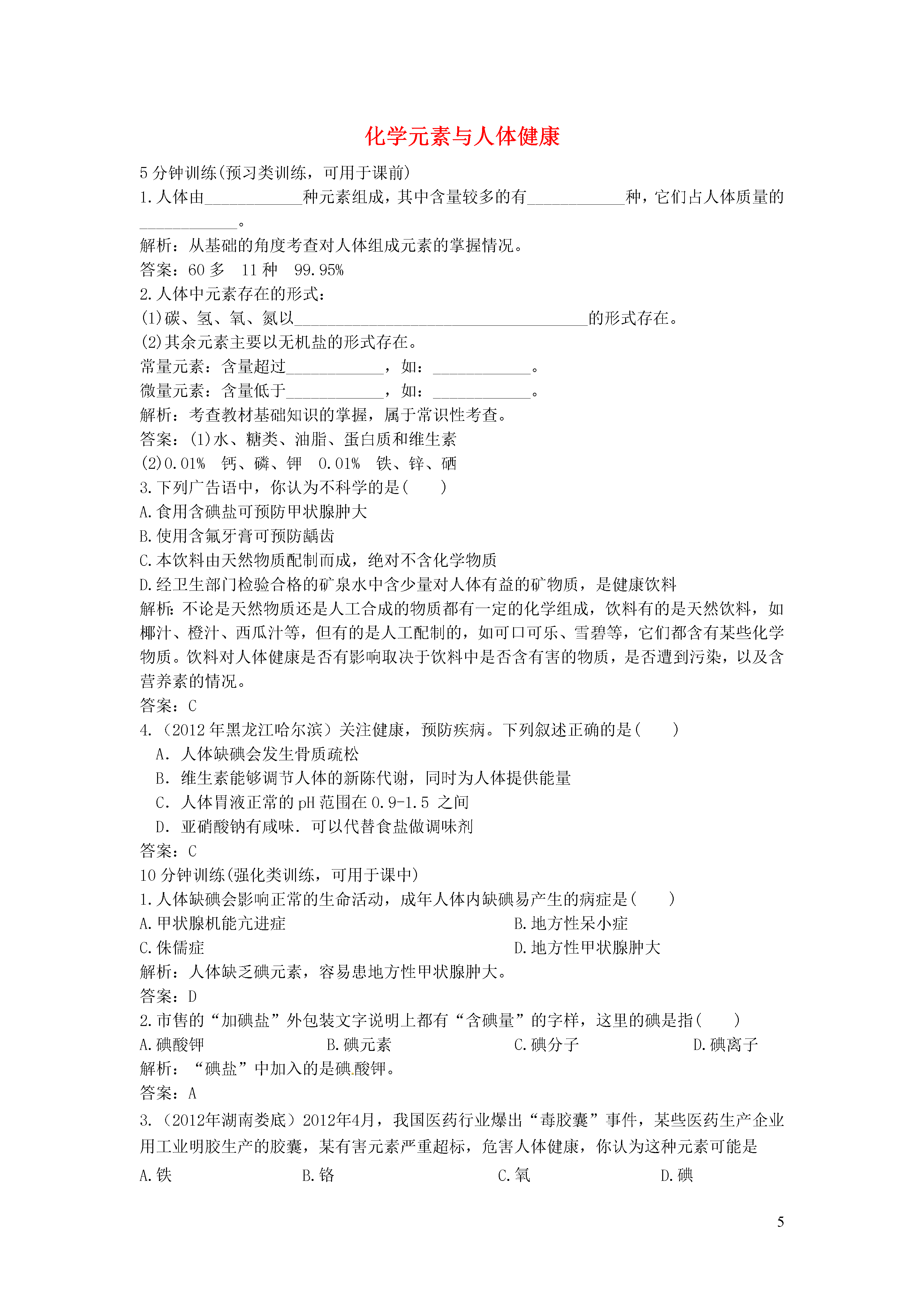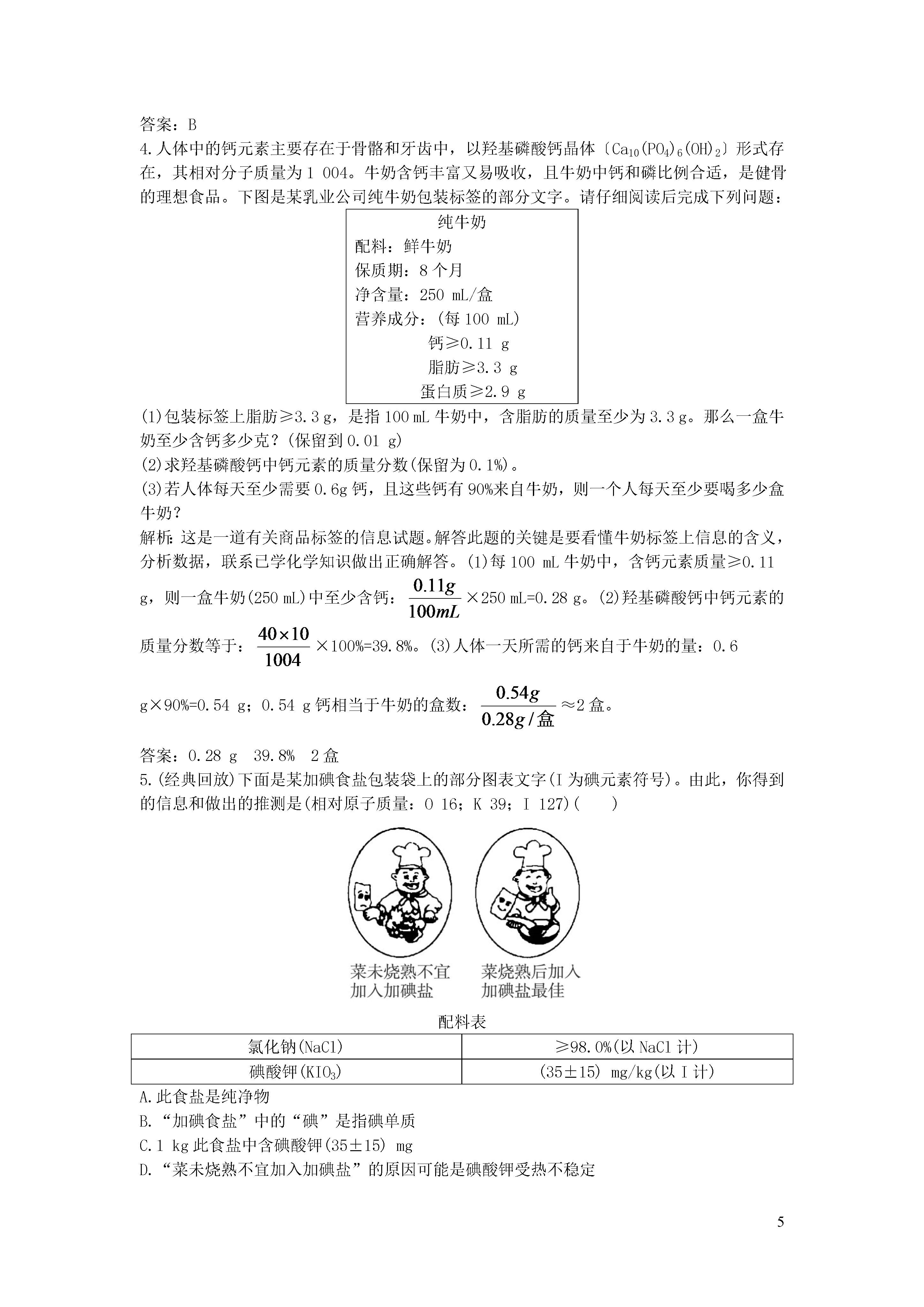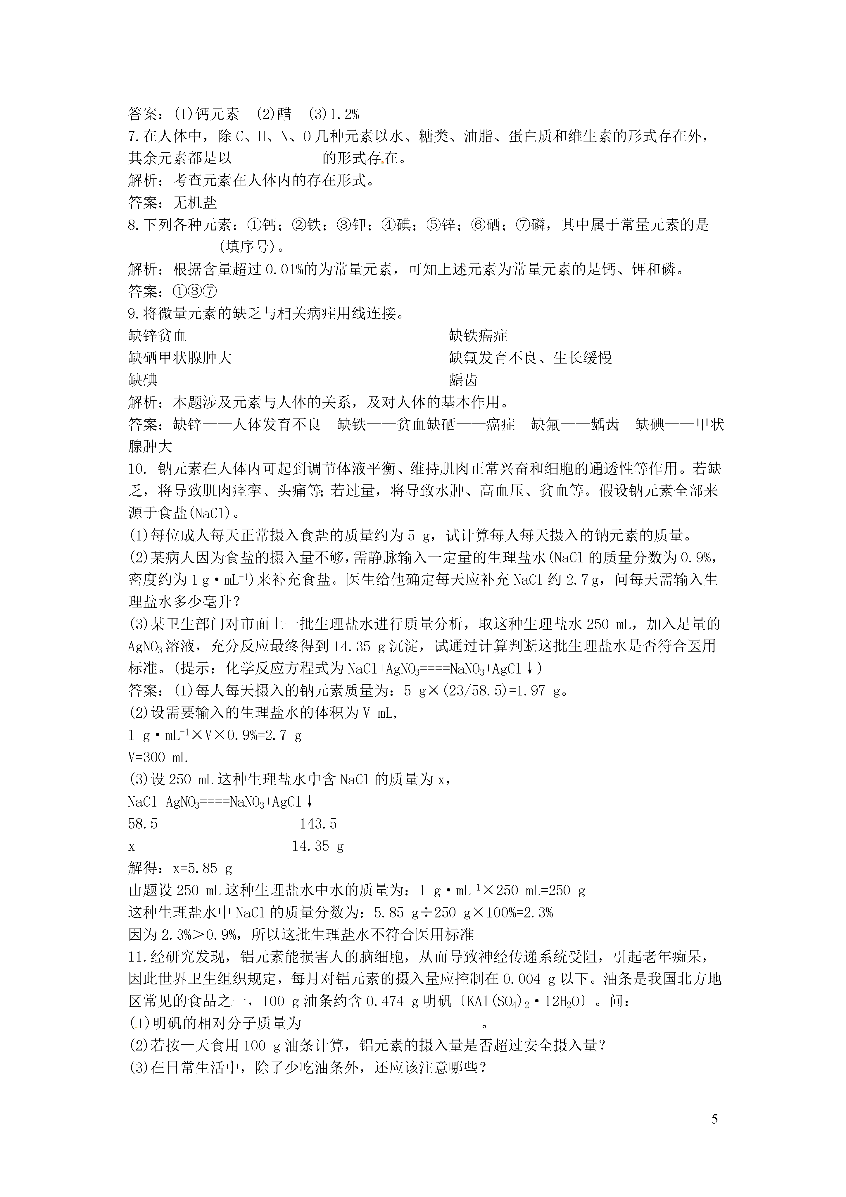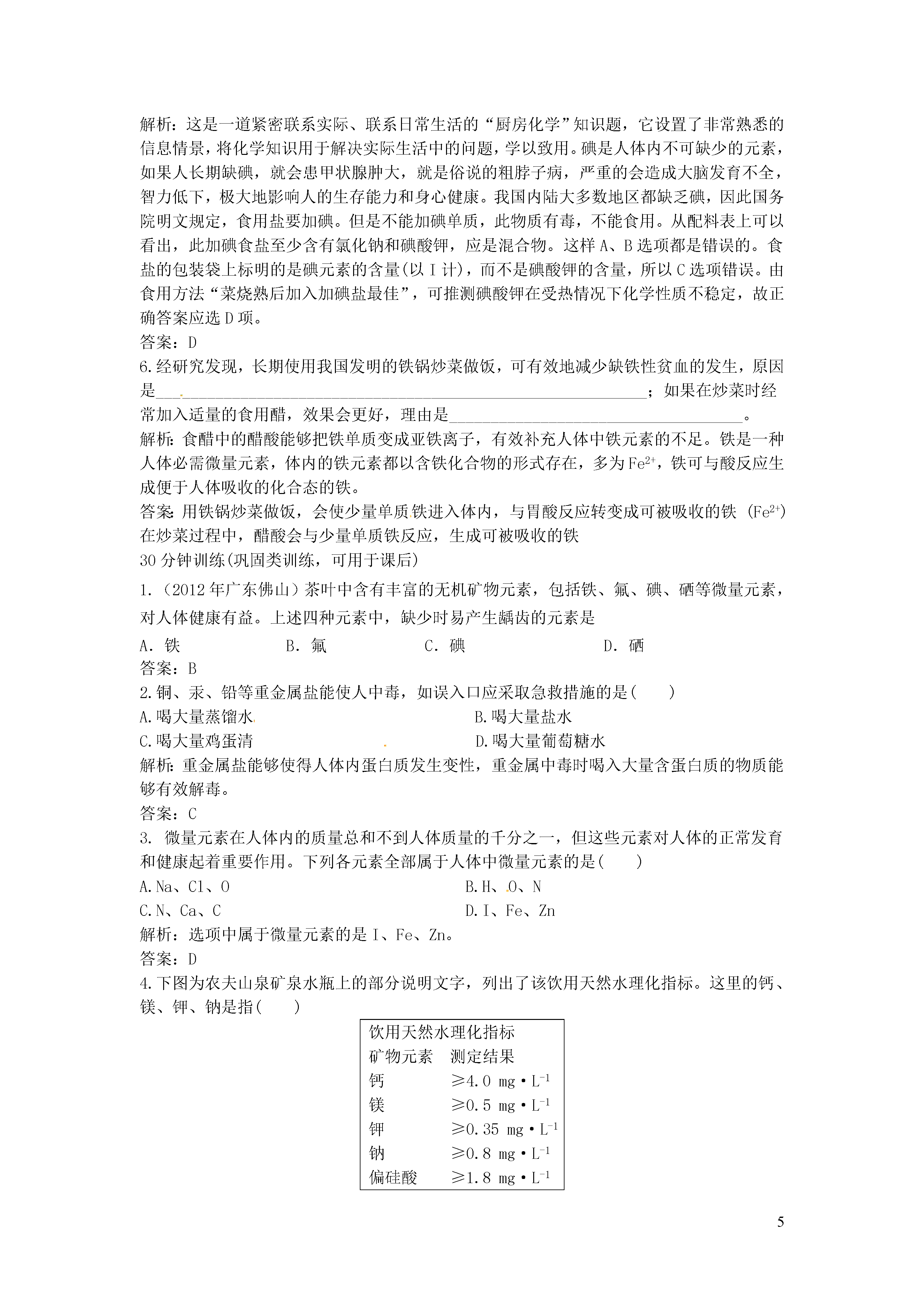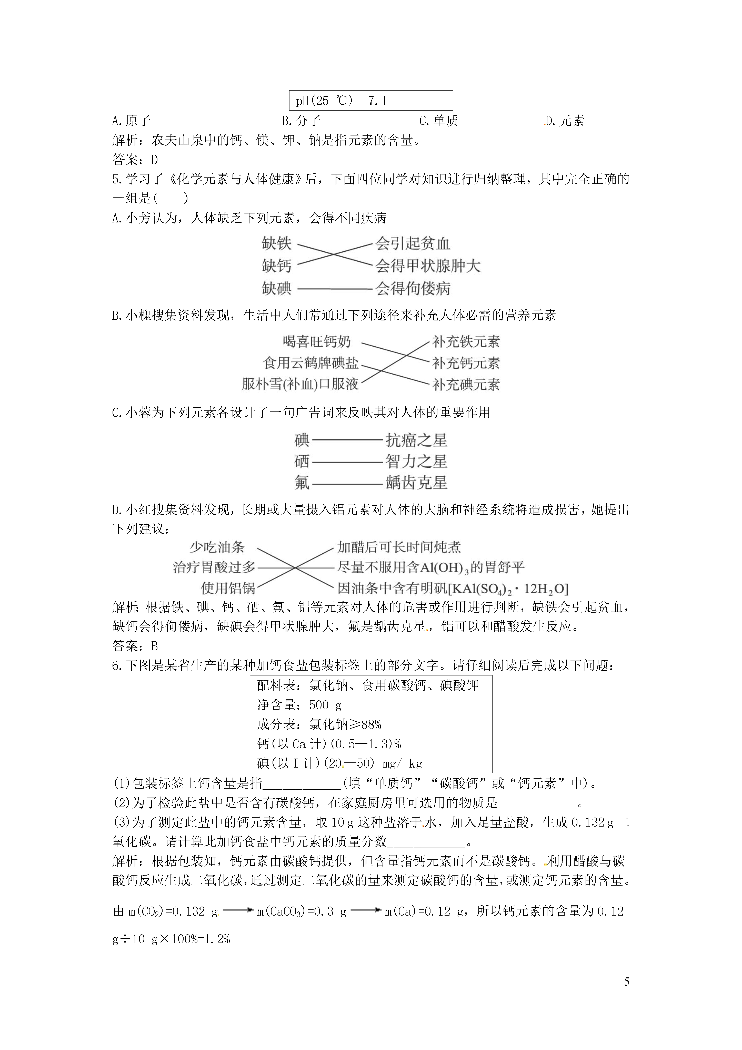 5化学元素与人体健康5分钟训练(预习类训练,可用于课前)1.人体由____________种元素组成,其中含量较多的有____________种,它们占人体质量的____________。解析:从基础的角度考查对人体组成元素的掌握情况。答案:60多11种99.95%2.人体中元素存在的形式:(1)碳、氢、氧、氮以____________________________________的形式存在。(2)其余元素主要以无机盐的形式存在。常量元素:含量超过____________,如:____________。微量元素:含量低于____________,如:____________。解析:考查教材基础知识的掌握,属于常识性考查。答案:(1)水、糖类、油脂、蛋白质和维生素(2)0.01%钙、磷、钾0.01%铁、锌、硒3.下列广告语中,你认为不科学的是()A.食用含碘盐可预防甲状腺肿大B.使用含氟牙膏可预防龋齿C.本饮料由天然物质配制而成,绝对不含化学物质D.经卫生部门检验合格的矿泉水中含少量对人体有益的矿物质,是健康饮料解析:不论是天然物质还是人工合成的物质都有一定的化学组成,饮料有的是天然饮料,如椰汁、橙汁、西瓜汁等,但有的是人工配制的,如可口可乐、雪碧等,它们都含有某些化学物质。饮料对人体健康是否有影响取决于饮料中是否含有害的物质,是否遭到污染,以及含营养素的情况。答案:C4.(2012年黑龙江哈尔滨)关注健康,预防疾病。下列叙述正确的是()A.人体缺碘会发生骨质疏松B.维生素能够调节人体的新陈代谢,同时为人体提供能量C.人体胃液正常的pH范围在0.9-1.5之间D.亚硝酸钠有咸味.可以代替食盐做调味剂答案:C10分钟训练(强化类训练,可用于课中)1.人体缺碘会影响正常的生命活动,成年人体内缺碘易产生的病症是()A.甲状腺机能亢进症B.地方性呆小症C.侏儒症D.地方性甲状腺肿大解析:人体缺乏碘元素,容易患地方性甲状腺肿大。答案:D2.市售的“加碘盐”外包装文字说明上都有“含碘量”的字样,这里的碘是指()A.碘酸钾B.碘元素C.碘分子D.碘离子解析:“碘盐”中加入的是碘酸钾。答案:A3.(2012年湖南娄底)2012年4月,我国医药行业爆出“毒胶囊”事件,某些医药生产企业用工业明胶生产的胶囊,某有害元素严重超标,危害人体健康,你认为这种元素可能是A.铁B.铬C.氧D.碘答案:B4.人体中的钙元素主要存在于骨骼和牙齿中,以羟基磷酸钙晶体〔Ca10(PO4)6(OH)2〕形式存在,其相对分子质量为1004。牛奶含钙丰富又易吸收,且牛奶中钙和磷比例合适,是健骨的理想食品。下图是某乳业公司纯牛奶包装标签的部分文字。请仔细阅读后完成下列问题:纯牛奶配料:鲜牛奶保质期:8个月净含量:250mL/盒营养成分:(每100mL)钙≥0.11g脂肪≥3.3g蛋白质≥2.9g(1)包装标签上脂肪≥3.3g,是指100mL牛奶中,含脂肪的质量至少为3.3g。那么一盒牛奶至少含钙多少克?(保留到0.01g)(2)求羟基磷酸钙中钙元素的质量分数(保留为0.1%)。(3)若人体每天至少需要0.6g钙,且这些钙有90%来自牛奶,则一个人每天至少要喝多少盒牛奶?解析:这是一道有关商品标签的信息试题。解答此题的关键是要看懂牛奶标签上信息的含义,分析数据,联系已学化学知识做出正确解答。(1)每100mL牛奶中,含钙元素质量≥0.11g,则一盒牛奶(250mL)中至少含钙:×250mL=0.28g。(2)羟基磷酸钙中钙元素的质量分数等于:×100%=39.8%。(3)人体一天所需的钙来自于牛奶的量:0.6g×90%=0.54g;0.54g钙相当于牛奶的盒数:≈2盒。答案:0.28g39.8%2盒5.(经典回放)下面是某加碘食盐包装袋上的部分图表文字(I为碘元素符号)。由此,你得到的信息和做出的推测是(相对原子质量:O16;K39;I127)()配料表氯化钠(NaCl)≥98.0%(以NaCl计)碘酸钾(KIO3)(35±15)mg/kg(以I计)A.此食盐是纯净物B.“加碘食盐”中的“碘”是指碘单质C.1kg此食盐中含碘酸钾(35±15)mgD.“菜未烧熟不宜加入加碘盐”的原因可能是碘酸钾受热不稳定解析:这是一道紧密联系实际、联系日常生活的“厨房化学”知识题,它设置了非常熟悉的信息情景,将化学知识用于解决实际生活中的问题,学以致用。碘是人体内不可缺少的元素,如果人长期缺碘,就会患甲状腺肿大,就是俗说的粗脖子病,严重的会造成大脑发育不全,智力低下,极大地影响人的生存能力和身心健康。我国内陆大多数地区都缺乏碘,因此国务院明文规定,食用盐要加碘。但是