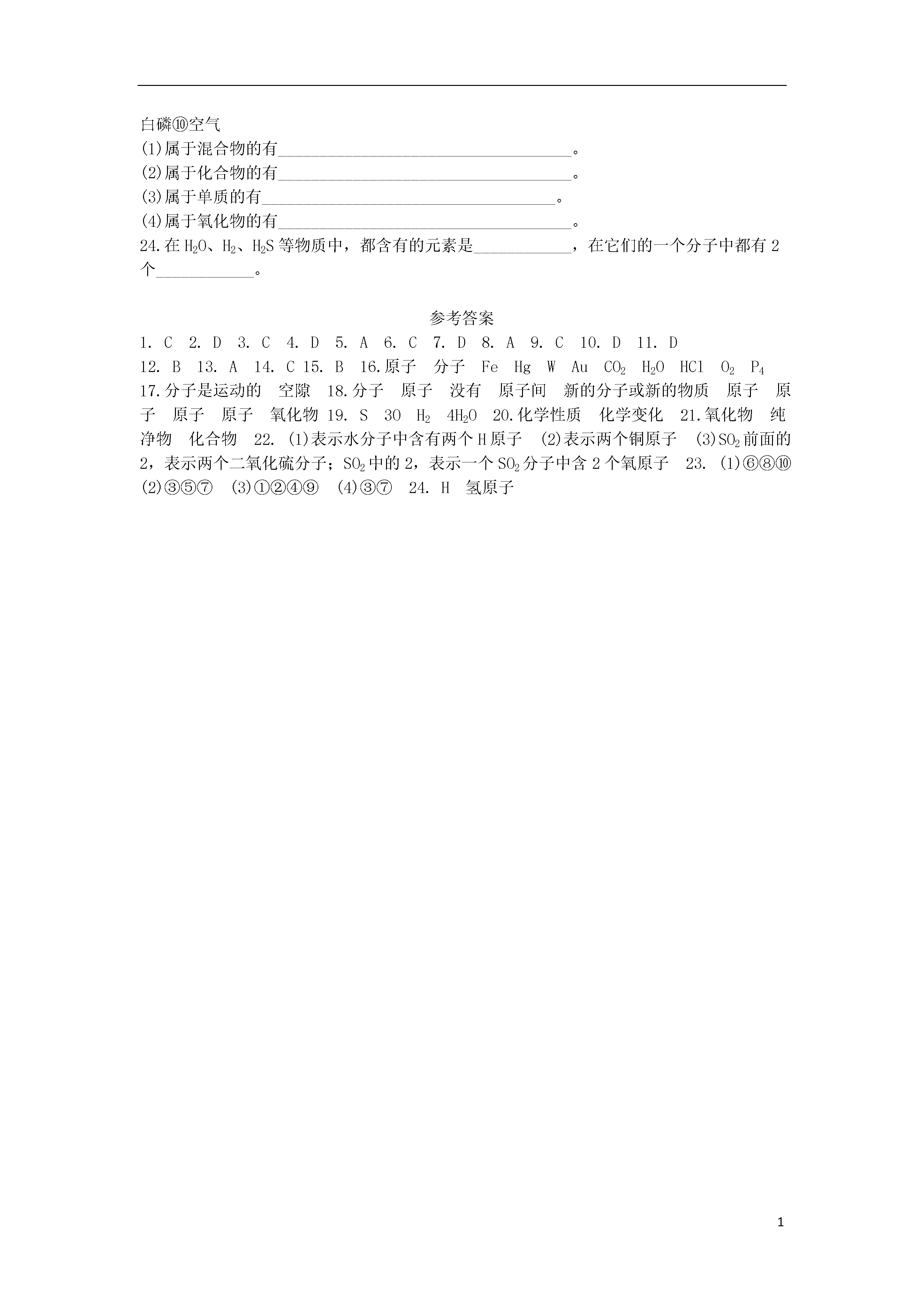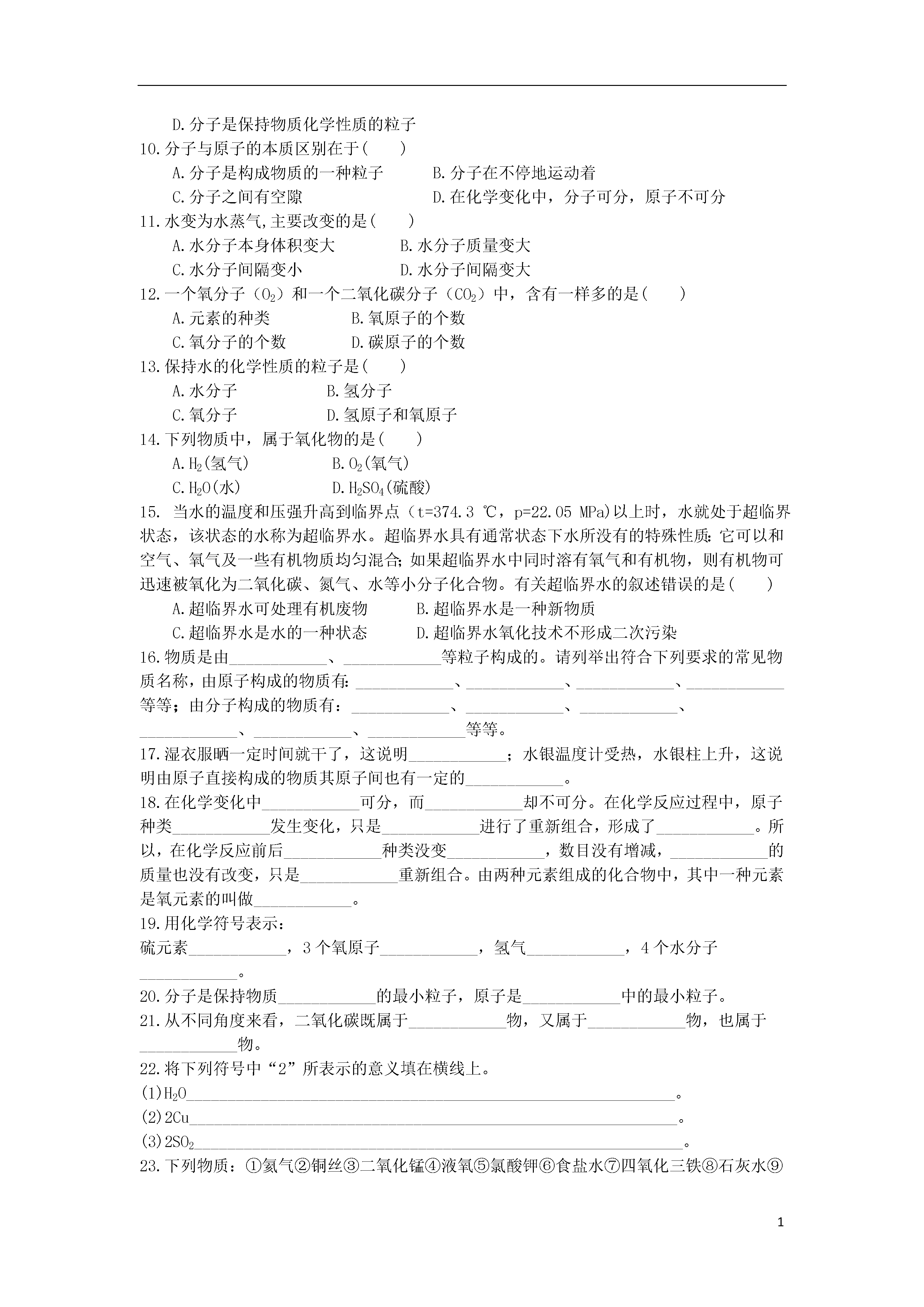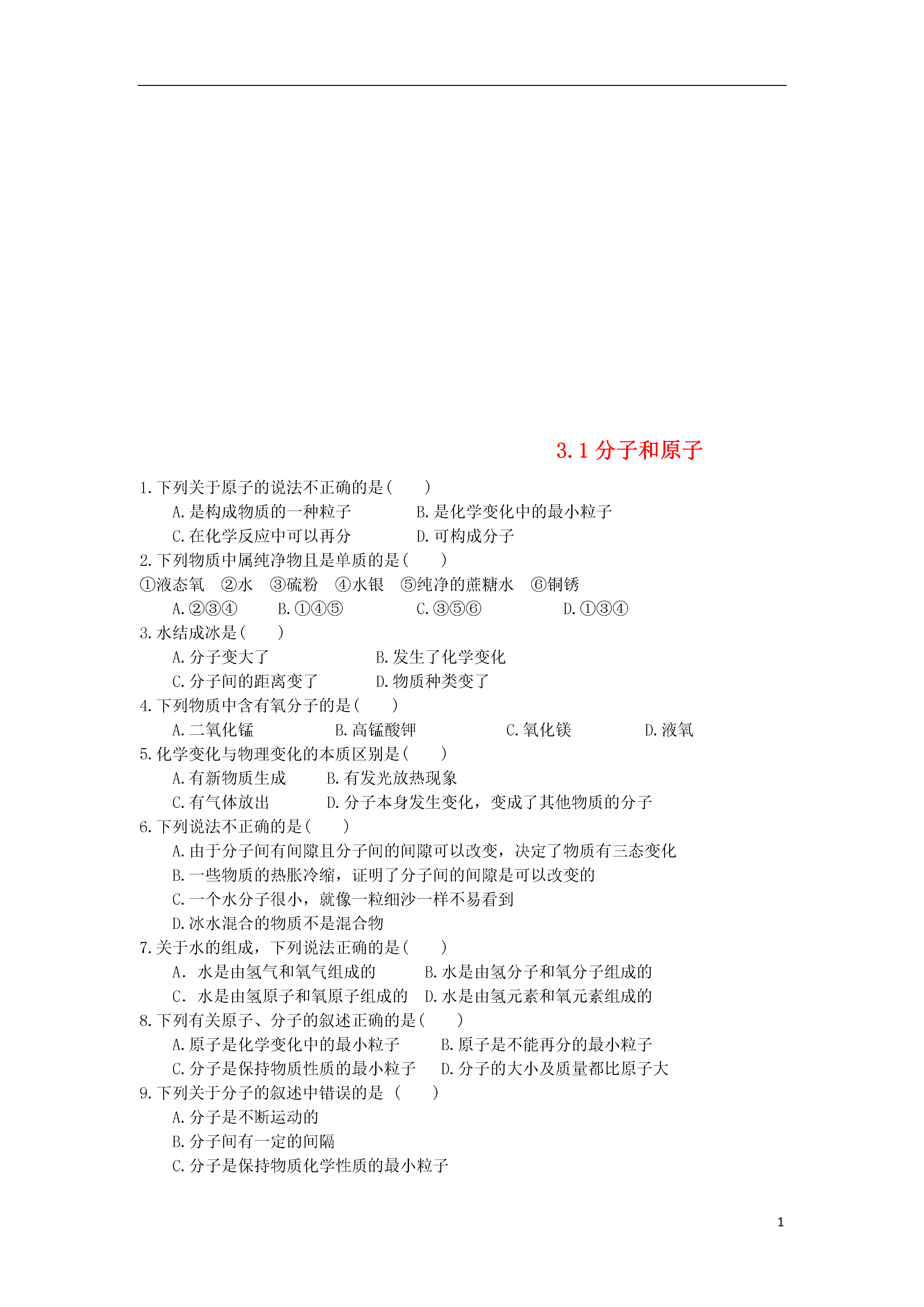 13.1分子和原子1.下列关于原子的说法不正确的是()A.是构成物质的一种粒子B.是化学变化中的最小粒子C.在化学反应中可以再分D.可构成分子2.下列物质中属纯净物且是单质的是()①液态氧②水③硫粉④水银⑤纯净的蔗糖水⑥铜锈A.②③④B.①④⑤C.③⑤⑥D.①③④3.水结成冰是()A.分子变大了B.发生了化学变化C.分子间的距离变了D.物质种类变了4.下列物质中含有氧分子的是()A.二氧化锰B.高锰酸钾C.氧化镁D.液氧5.化学变化与物理变化的本质区别是()A.有新物质生成B.有发光放热现象C.有气体放出D.分子本身发生变化,变成了其他物质的分子6.下列说法不正确的是()A.由于分子间有间隙且分子间的间隙可以改变,决定了物质有三态变化B.一些物质的热胀冷缩,证明了分子间的间隙是可以改变的C.一个水分子很小,就像一粒细沙一样不易看到D.冰水混合的物质不是混合物7.关于水的组成,下列说法正确的是()A.水是由氢气和氧气组成的B.水是由氢分子和氧分子组成的C.水是由氢原子和氧原子组成的D.水是由氢元素和氧元素组成的8.下列有关原子、分子的叙述正确的是()A.原子是化学变化中的最小粒子B.原子是不能再分的最小粒子C.分子是保持物质性质的最小粒子D.分子的大小及质量都比原子大9.下列关于分子的叙述中错误的是()A.分子是不断运动的B.分子间有一定的间隔C.分子是保持物质化学性质的最小粒子D.分子是保持物质化学性质的粒子10.分子与原子的本质区别在于()A.分子是构成物质的一种粒子B.分子在不停地运动着C.分子之间有空隙D.在化学变化中,分子可分,原子不可分11.水变为水蒸气,主要改变的是()A.水分子本身体积变大B.水分子质量变大C.水分子间隔变小D.水分子间隔变大12.一个氧分子(O2)和一个二氧化碳分子(CO2)中,含有一样多的是()A.元素的种类B.氧原子的个数C.氧分子的个数D.碳原子的个数13.保持水的化学性质的粒子是()A.水分子B.氢分子C.氧分子D.氢原子和氧原子14.下列物质中,属于氧化物的是()A.H2(氢气)B.O2(氧气)C.H2O(水)D.H2SO4(硫酸)15.当水的温度和压强升高到临界点(t=374.3℃,p=22.05MPa)以上时,水就处于超临界状态,该状态的水称为超临界水。超临界水具有通常状态下水所没有的特殊性质:它可以和空气、氧气及一些有机物质均匀混合;如果超临界水中同时溶有氧气和有机物,则有机物可迅速被氧化为二氧化碳、氮气、水等小分子化合物。有关超临界水的叙述错误的是()A.超临界水可处理有机废物B.超临界水是一种新物质C.超临界水是水的一种状态D.超临界水氧化技术不形成二次污染16.物质是由____________、____________等粒子构成的。请列举出符合下列要求的常见物质名称,由原子构成的物质有:____________、____________、____________、____________等等;由分子构成的物质有:____________、____________、____________、____________、____________、____________等等。17.湿衣服晒一定时间就干了,这说明____________;水银温度计受热,水银柱上升,这说明由原子直接构成的物质其原子间也有一定的____________。18.在化学变化中____________可分,而____________却不可分。在化学反应过程中,原子种类____________发生变化,只是____________进行了重新组合,形成了____________。所以,在化学反应前后____________种类没变____________,数目没有增减,____________的质量也没有改变,只是____________重新组合。由两种元素组成的化合物中,其中一种元素是氧元素的叫做____________。19.用化学符号表示:硫元素____________,3个氧原子____________,氢气____________,4个水分子____________。20.分子是保持物质____________的最小粒子,原子是____________中的最小粒子。21.从不同角度来看,二氧化碳既属于____________物,又属于____________物,也属于____________物。22.将下列符号中“2”所表示的意义填在横线上。(1)H2O____________________________________________________________