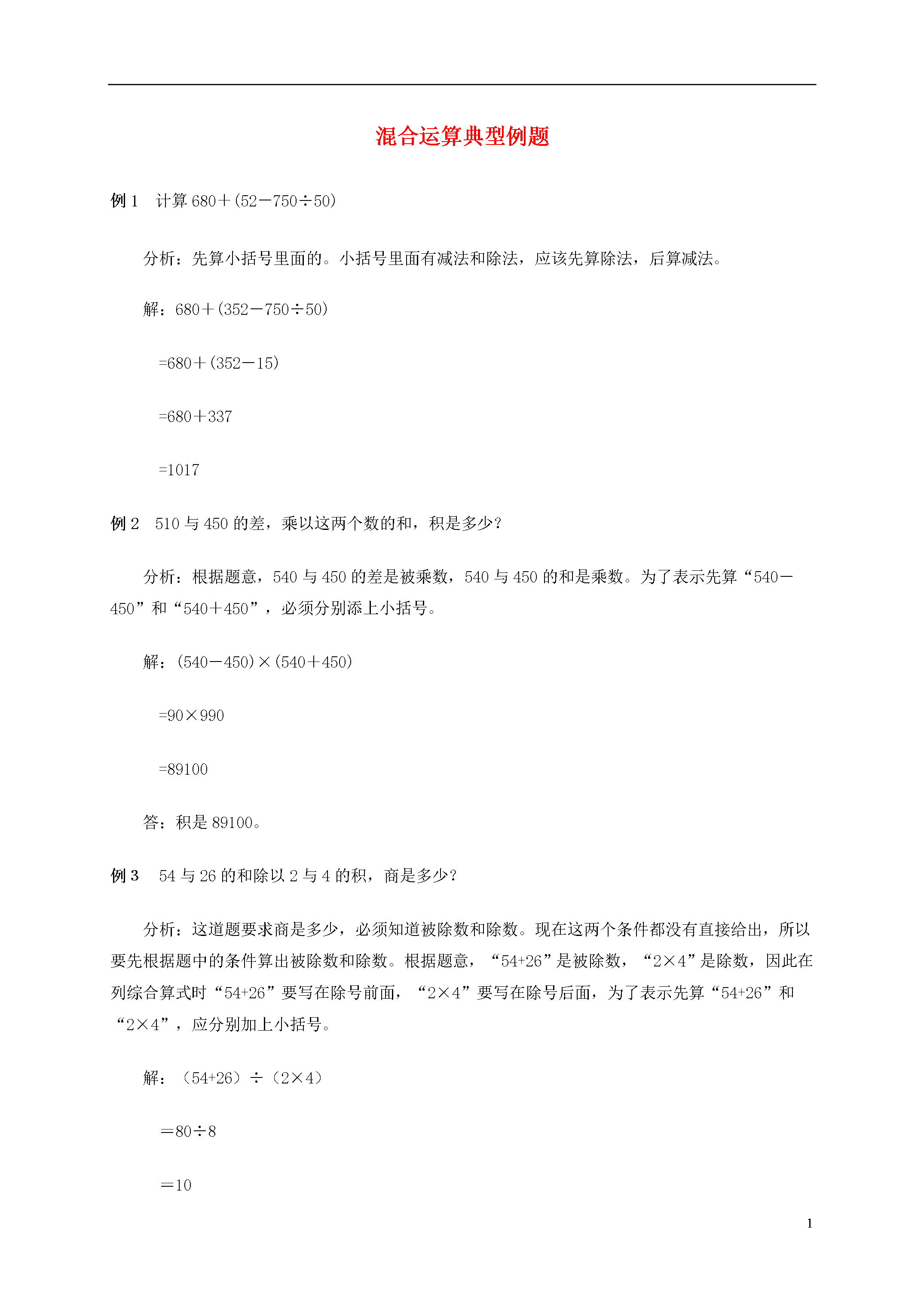 2混合运算典型例题例1计算680+(52-750÷50)分析:先算小括号里面的。小括号里面有减法和除法,应该先算除法,后算减法。解:680+(352-750÷50)=680+(352-15)=680+337=1017例2510与450的差,乘以这两个数的和,积是多少?分析:根据题意,540与450的差是被乘数,540与450的和是乘数。为了表示先算“540-450”和“540+450”,必须分别添上小括号。解:(540-450)×(540+450)=90×990=89100答:积是89100。例354与26的和除以2与4的积,商是多少?分析:这道题要求商是多少,必须知道被除数和除数。现在这两个条件都没有直接给出,所以要先根据题中的条件算出被除数和除数。根据题意,“54+26”是被除数,“2×4”是除数,因此在列综合算式时“54+26”要写在除号前面,“2×4”要写在除号后面,为了表示先算“54+26”和“2×4”,应分别加上小括号。解:(54+26)÷(2×4)=80÷8=10