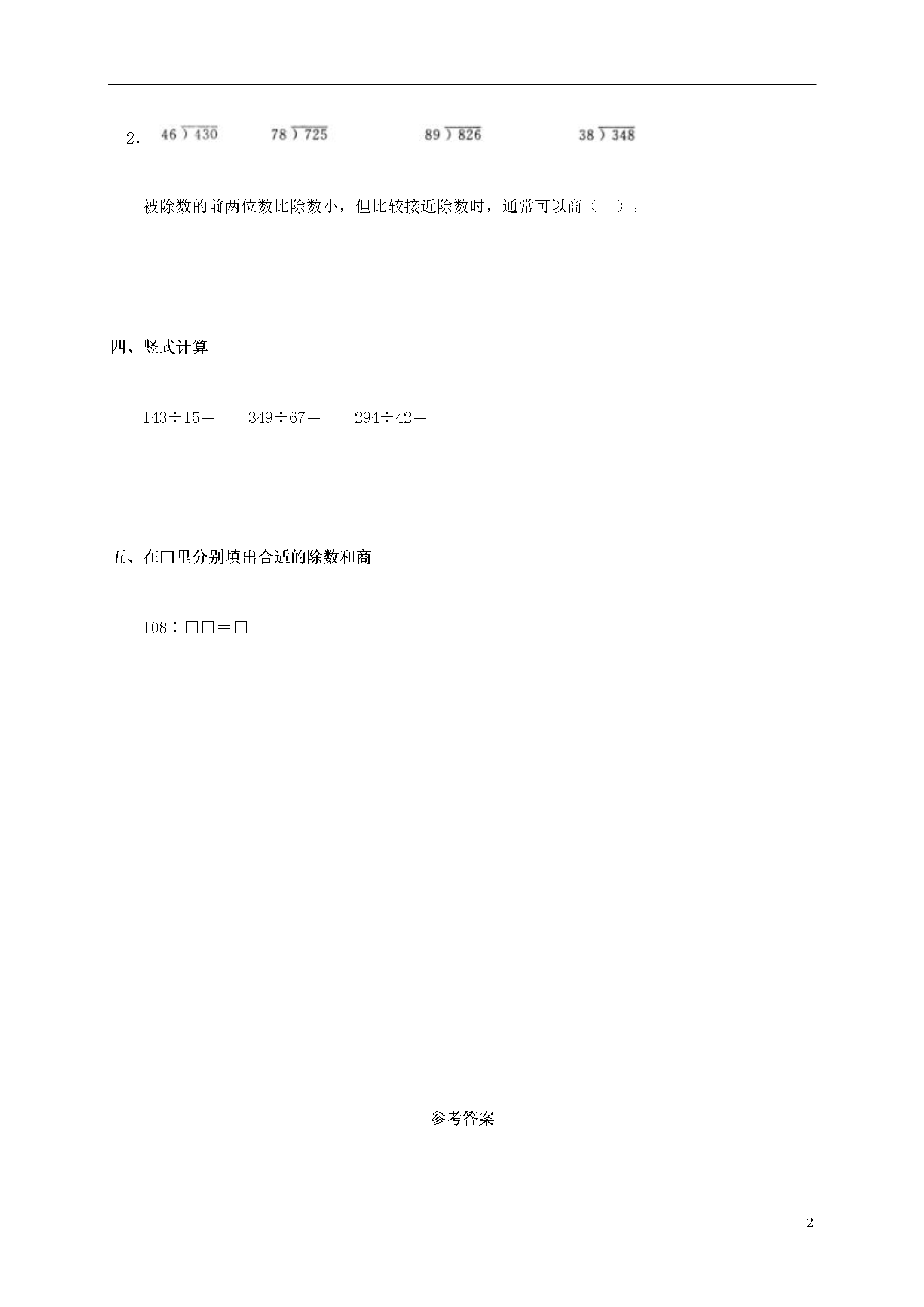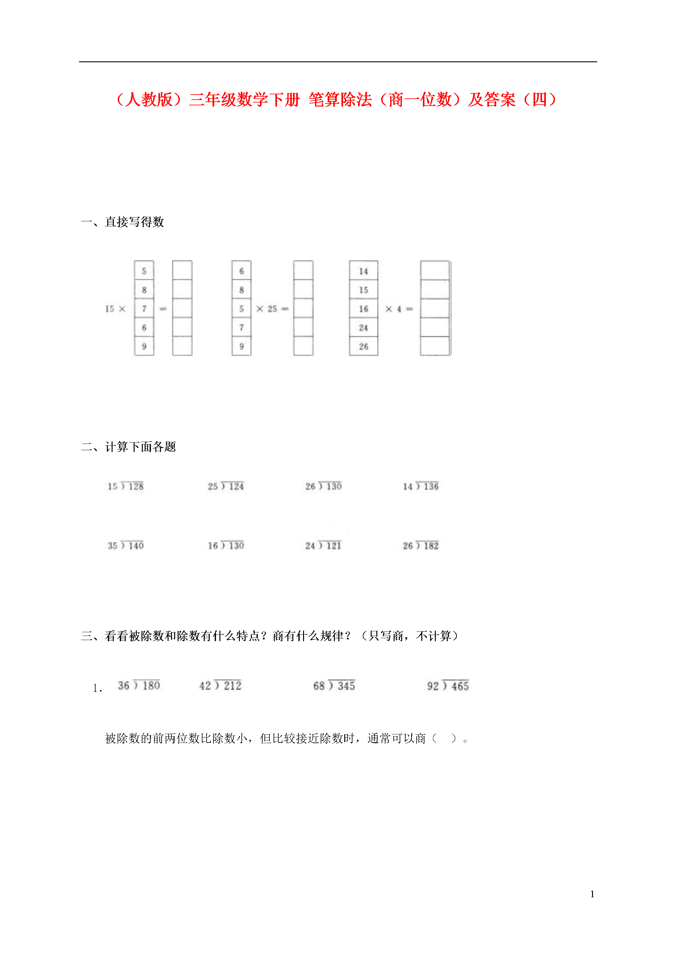 3(人教版)三年级数学下册笔算除法(商一位数)及答案(四)一、直接写得数二、计算下面各题三、看看被除数和除数有什么特点?商有什么规律?(只写商,不计算)1.被除数的前两位数比除数小,但比较接近除数时,通常可以商()。2.被除数的前两位数比除数小,但比较接近除数时,通常可以商()。四、竖式计算143÷15=349÷67=294÷42=五、在□里分别填出合适的除数和商108÷□□=□参考答案一、略二、8……8,4……24,5,9……10,4,8……2,5……1,7三、1.52.9四、9……8,5……14,7五、36,3;54,2;12,9;18,6;27,4(答案共5组)