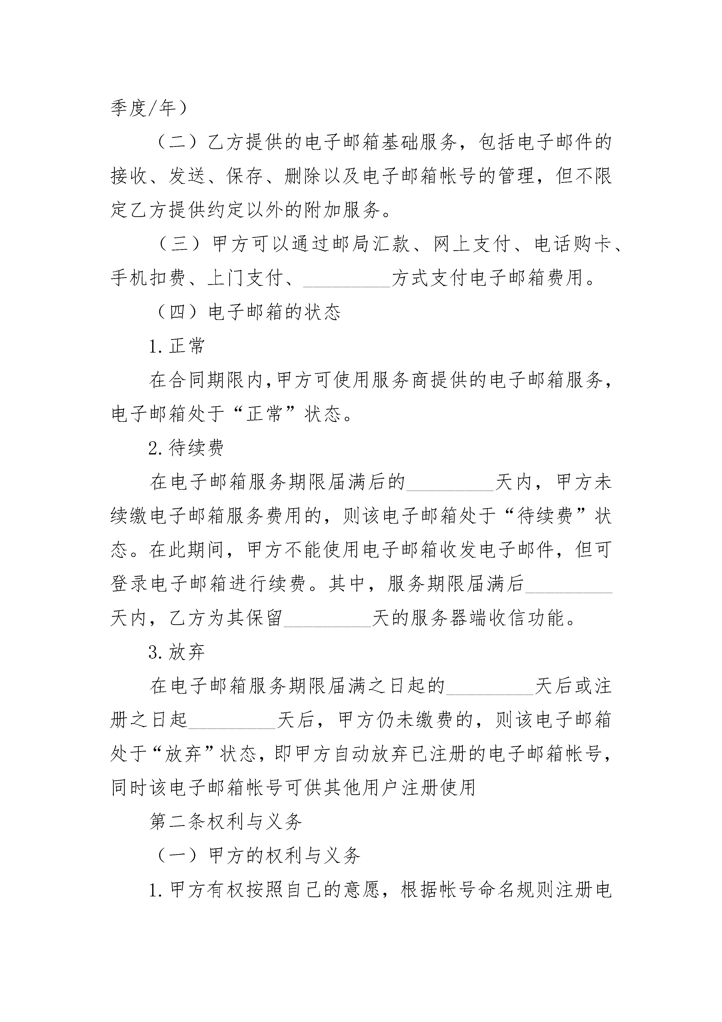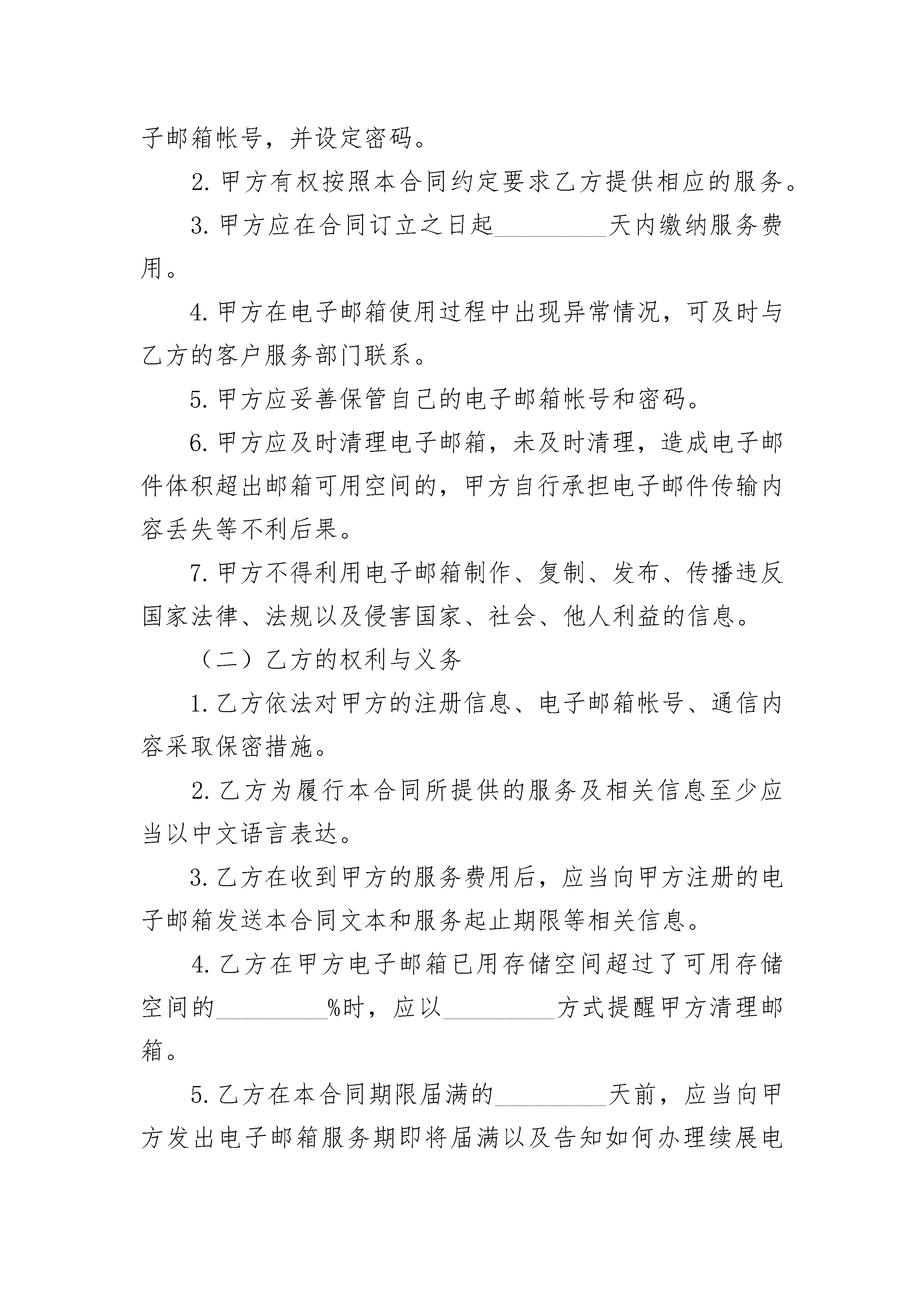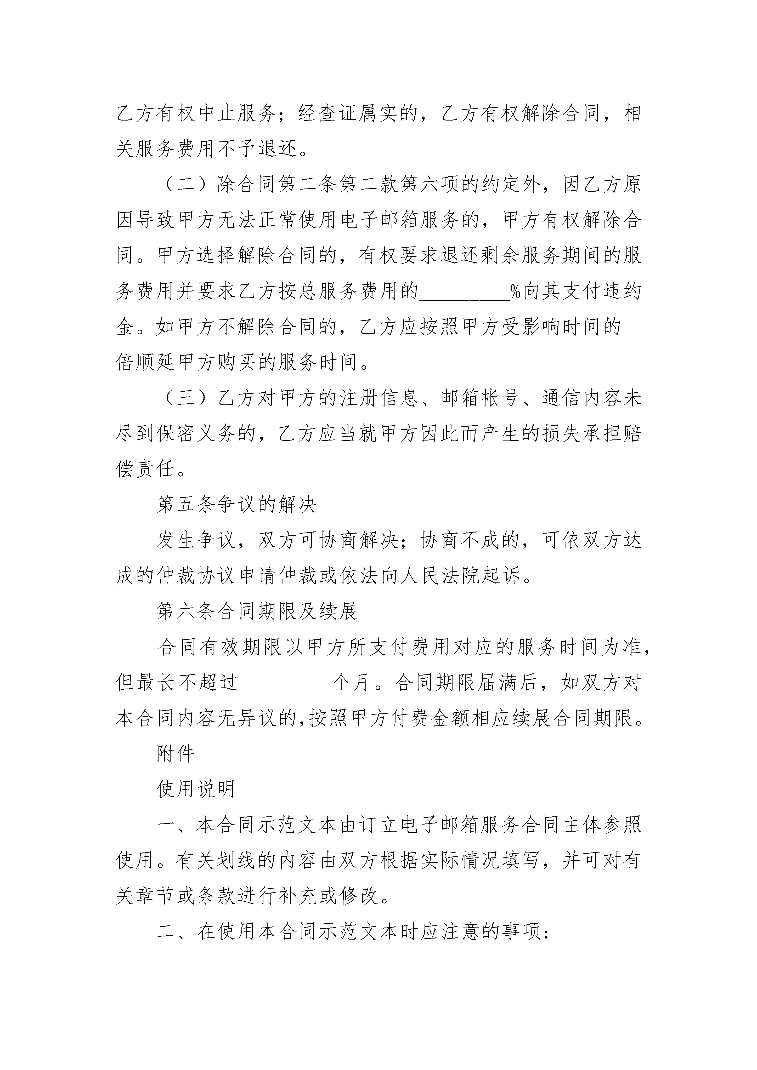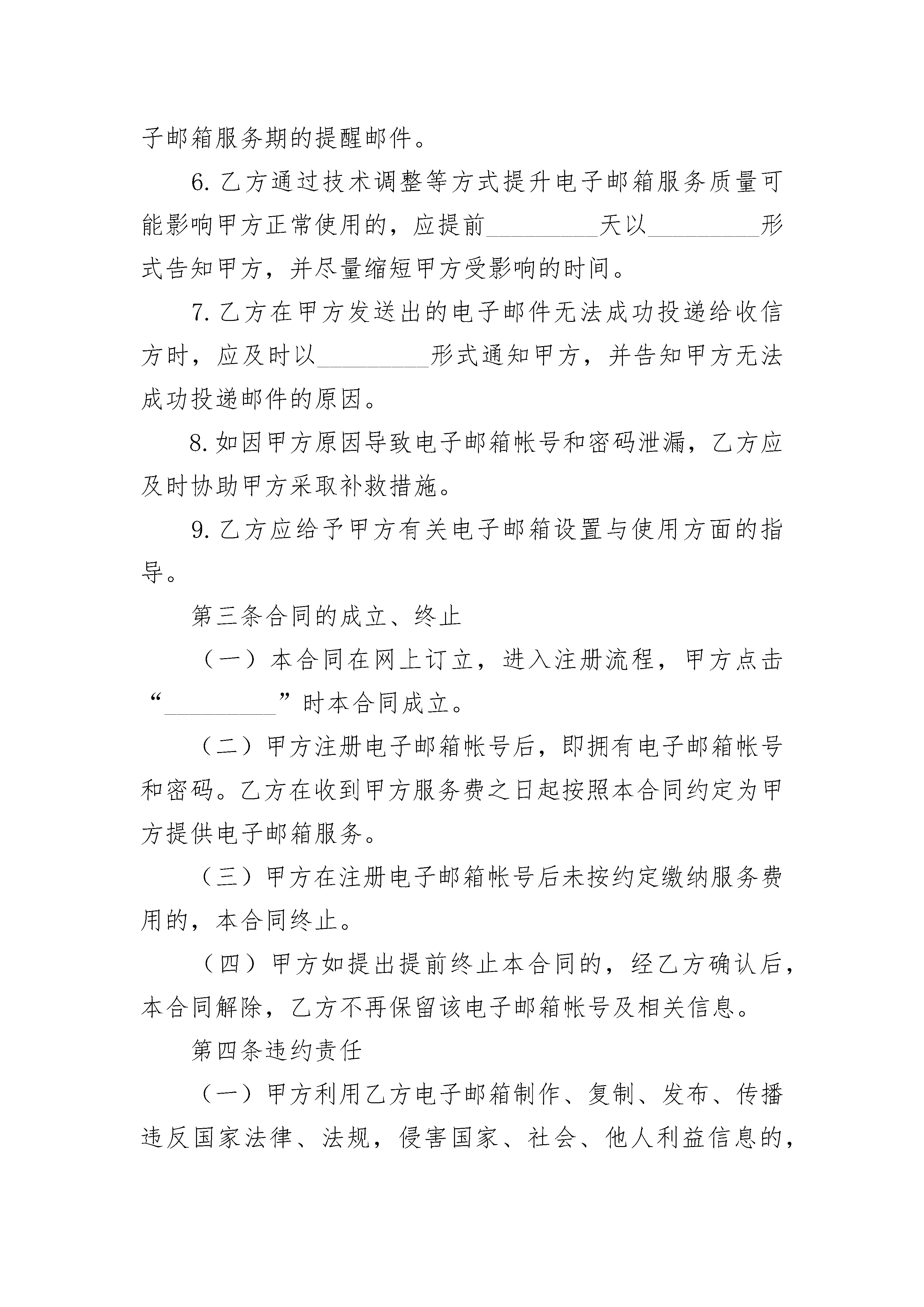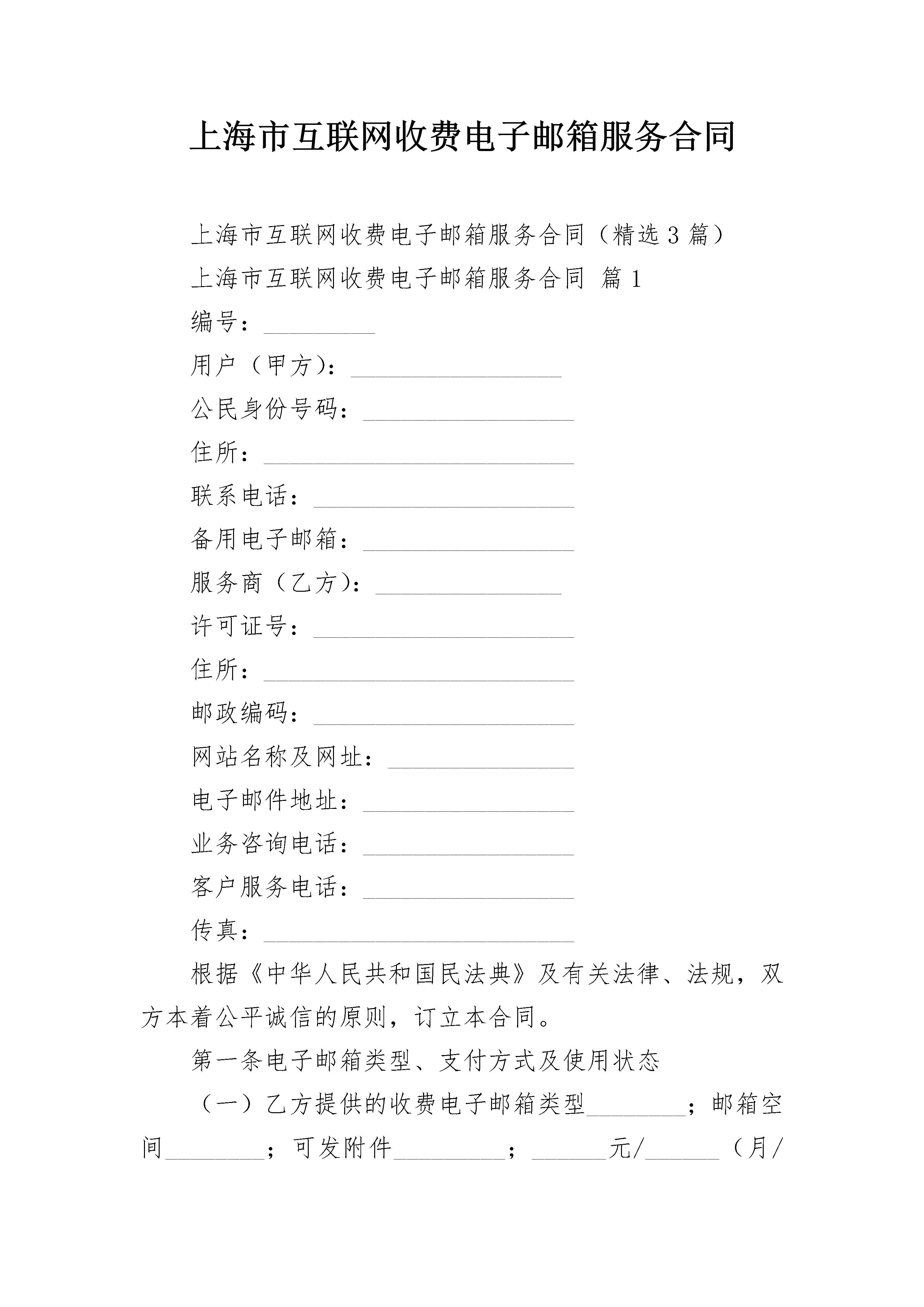 上海市互联网收费电子邮箱服务合同上海市互联网收费电子邮箱服务合同(精选3篇)上海市互联网收费电子邮箱服务合同篇1编号:_________用户(甲方):_________________公民身份号码:_________________住所:_________________________联系电话:_____________________备用电子邮箱:_________________服务商(乙方):_______________许可证号:_____________________住所:_________________________邮政编码:_____________________网站名称及网址:_______________电子邮件地址:_________________业务咨询电话:_________________客户服务电话:_________________传真:_________________________根据《中华人民共和国民法典》及有关法律、法规,双方本着公平诚信的原则,订立本合同。第一条电子邮箱类型、支付方式及使用状态(一)乙方提供的收费电子邮箱类型________;邮箱空间________;可发附件_________;______元/______(月/季度/年)(二)乙方提供的电子邮箱基础服务,包括电子邮件的接收、发送、保存、删除以及电子邮箱帐号的管理,但不限定乙方提供约定以外的附加服务。(三)甲方可以通过邮局汇款、网上支付、电话购卡、手机扣费、上门支付、_________方式支付电子邮箱费用。(四)电子邮箱的状态1.正常在合同期限内,甲方可使用服务商提供的电子邮箱服务,电子邮箱处于“正常”状态。2.待续费在电子邮箱服务期限届满后的_________天内,甲方未续缴电子邮箱服务费用的,则该电子邮箱处于“待续费”状态。在此期间,甲方不能使用电子邮箱收发电子邮件,但可登录电子邮箱进行续费。其中,服务期限届满后_________天内,乙方为其保留_________天的服务器端收信功能。3.放弃在电子邮箱服务期限届满之日起的_________天后或注册之日起_________天后,甲方仍未缴费的,则该电子邮箱处于“放弃”状态,即甲方自动放弃已注册的电子邮箱帐号,同时该电子邮箱帐号可供其他用户注册使用第二条权利与义务(一)甲方的权利与义务1.甲方有权按照自己的意愿,根据帐号命名规则注册电子邮箱帐号,并设定密码。2.甲方有权按照本合同约定要求乙方提供相应的服务。3.甲方应在合同订立之日起_________天内缴纳服务费用。4.甲方在电子邮箱使用过程中出现异常情况,可及时与乙方的客户服务部门联系。5.甲方应妥善保管自己的电子邮箱帐号和密码。6.甲方应及时清理电子邮箱,未及时清理,造成电子邮件体积超出邮箱可用空间的,甲方自行承担电子邮件传输内容丢失等不利后果。7.甲方不得利用电子邮箱制作、复制、发布、传播违反国家法律、法规以及侵害国家、社会、他人利益的信息。(二)乙方的权利与义务1.乙方依法对甲方的注册信息、电子邮箱帐号、通信内容采取保密措施。2.乙方为履行本合同所提供的服务及相关信息至少应当以中文语言表达。3.乙方在收到甲方的服务费用后,应当向甲方注册的电子邮箱发送本合同文本和服务起止期限等相关信息。4.乙方在甲方电子邮箱已用存储空间超过了可用存储空间的_________%时,应以_________方式提醒甲方清理邮箱。5.乙方在本合同期限届满的_________天前,应当向甲方发出电子邮箱服务期即将届满以及告知如何办理续展电子邮箱服务期的提醒邮件。6.乙方通过技术调整等方式提升电子邮箱服务质量可能影响甲方正常使用的,应提前_________天以_________形式告知甲方,并尽量缩短甲方受影响的时间。7.乙方在甲方发送出的电子邮件无法成功投递给收信方时,应及时以_________形式通知甲方,并告知甲方无法成功投递邮件的原因。8.如因甲方原因导致电子邮箱帐号和密码泄漏,乙方应及时协助甲方采取补救措施。9.乙方应给予甲方有关电子邮箱设置与使用方面的指导。第三条合同的成立、终止(一)本合同在网上订立,进入注册流程,甲方点击“_________”时本合同成立。(二)甲方注册电子邮箱帐号后,即拥有电子邮箱帐号和密码。乙方在收到甲方服务费之日起按照本合同约定为甲方提供电子邮箱服务。(三)甲方在注册电子邮箱帐号后未按约定缴纳服务费用的,本合同终止。(四)甲方如提出提前终止本合同的,经乙方确认后,本合同解除,乙方不再保留该电子邮箱帐号及相关信息。第四条违约责任(一)甲方利用乙方电子邮箱制作、复制、发布、传播违反国家法律、法规,侵害国家、社会、他人利益信息的,乙方有权中止服务;经查证属实的,乙方有权解除合同,相关服务费