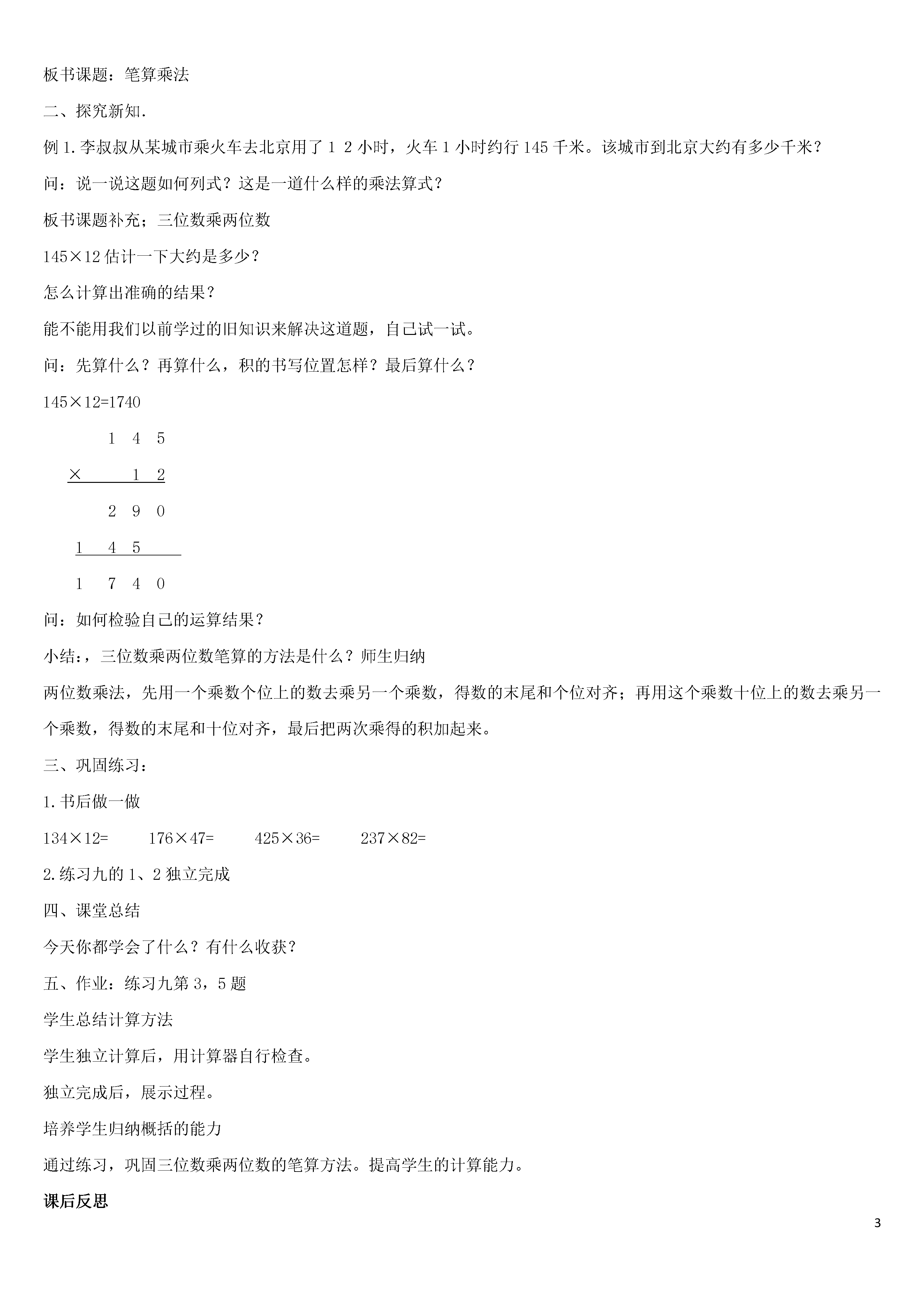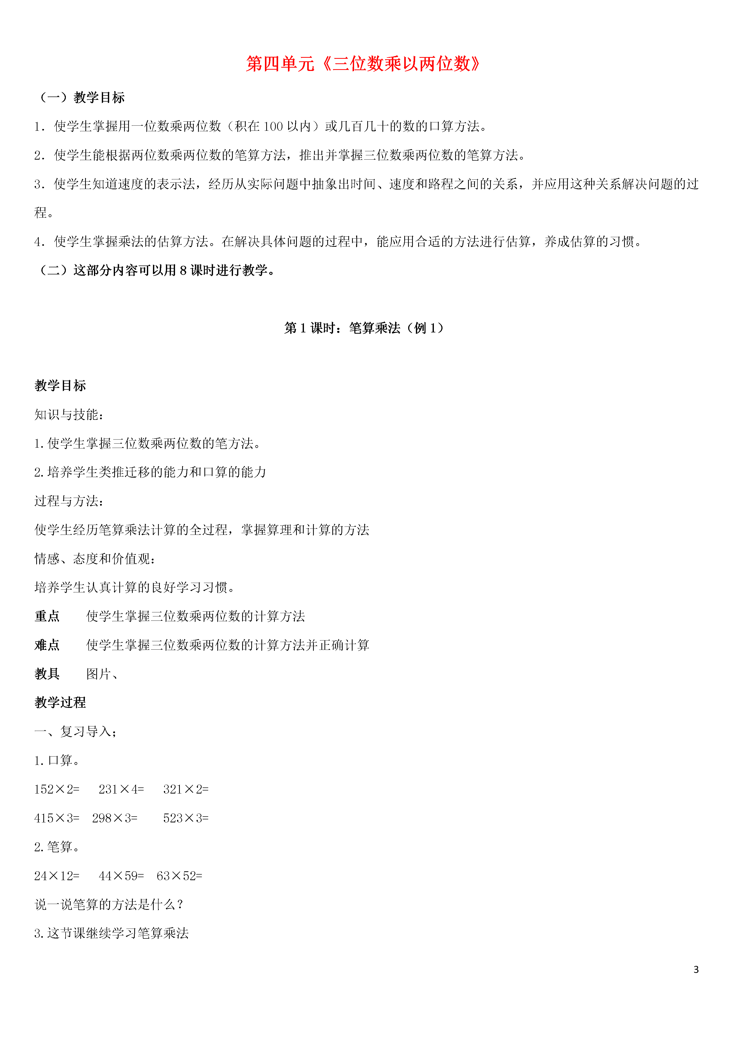 3第四单元《三位数乘以两位数》(一)教学目标1.使学生掌握用一位数乘两位数(积在100以内)或几百几十的数的口算方法。2.使学生能根据两位数乘两位数的笔算方法,推出并掌握三位数乘两位数的笔算方法。3.使学生知道速度的表示法,经历从实际问题中抽象出时间、速度和路程之间的关系,并应用这种关系解决问题的过程。4.使学生掌握乘法的估算方法。在解决具体问题的过程中,能应用合适的方法进行估算,养成估算的习惯。(二)这部分内容可以用8课时进行教学。第1课时:笔算乘法(例1)教学目标知识与技能:1.使学生掌握三位数乘两位数的笔方法。2.培养学生类推迁移的能力和口算的能力过程与方法:使学生经历笔算乘法计算的全过程,掌握算理和计算的方法情感、态度和价值观:培养学生认真计算的良好学习习惯。重点使学生掌握三位数乘两位数的计算方法难点使学生掌握三位数乘两位数的计算方法并正确计算教具图片、教学过程一、复习导入;1.口算。152×2=231×4=321×2=415×3=298×3=523×3=2.笔算。24×12=44×59=63×52=说一说笔算的方法是什么?3.这节课继续学习笔算乘法板书课题:笔算乘法二、探究新知.例1.李叔叔从某城市乘火车去北京用了12小时,火车1小时约行145千米。该城市到北京大约有多少千米?问:说一说这题如何列式?这是一道什么样的乘法算式?板书课题补充;三位数乘两位数145×12估计一下大约是多少?怎么计算出准确的结果?能不能用我们以前学过的旧知识来解决这道题,自己试一试。问:先算什么?再算什么,积的书写位置怎样?最后算什么?145×12=1740145×122901451740问:如何检验自己的运算结果?小结:,三位数乘两位数笔算的方法是什么?师生归纳两位数乘法,先用一个乘数个位上的数去乘另一个乘数,得数的末尾和个位对齐;再用这个乘数十位上的数去乘另一个乘数,得数的末尾和十位对齐,最后把两次乘得的积加起来。三、巩固练习:1.书后做一做134×12=176×47=425×36=237×82=2.练习九的1、2独立完成四、课堂总结今天你都学会了什么?有什么收获?五、作业:练习九第3,5题学生总结计算方法学生独立计算后,用计算器自行检查。独立完成后,展示过程。培养学生归纳概括的能力通过练习,巩固三位数乘两位数的笔算方法。提高学生的计算能力。课后反思更