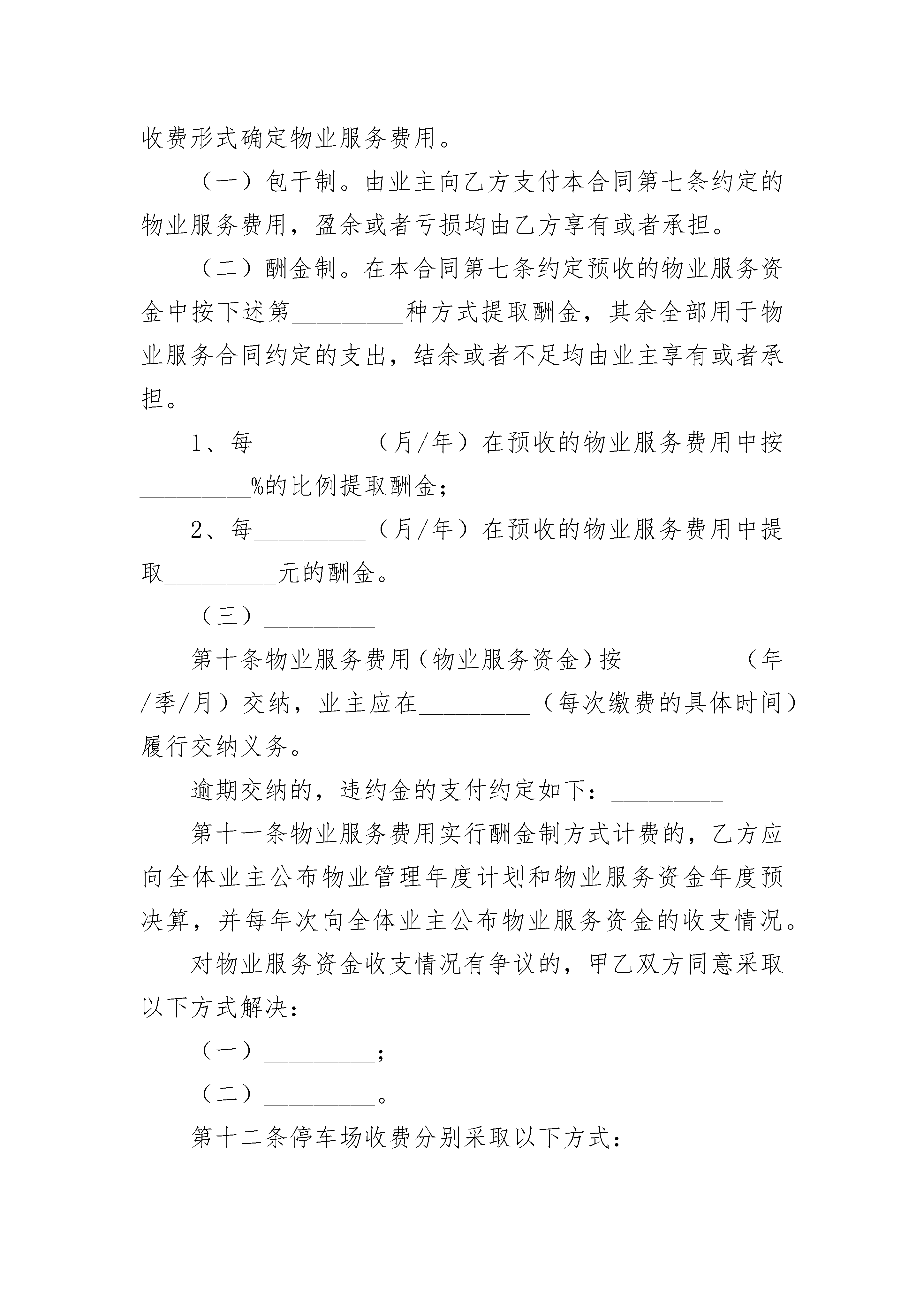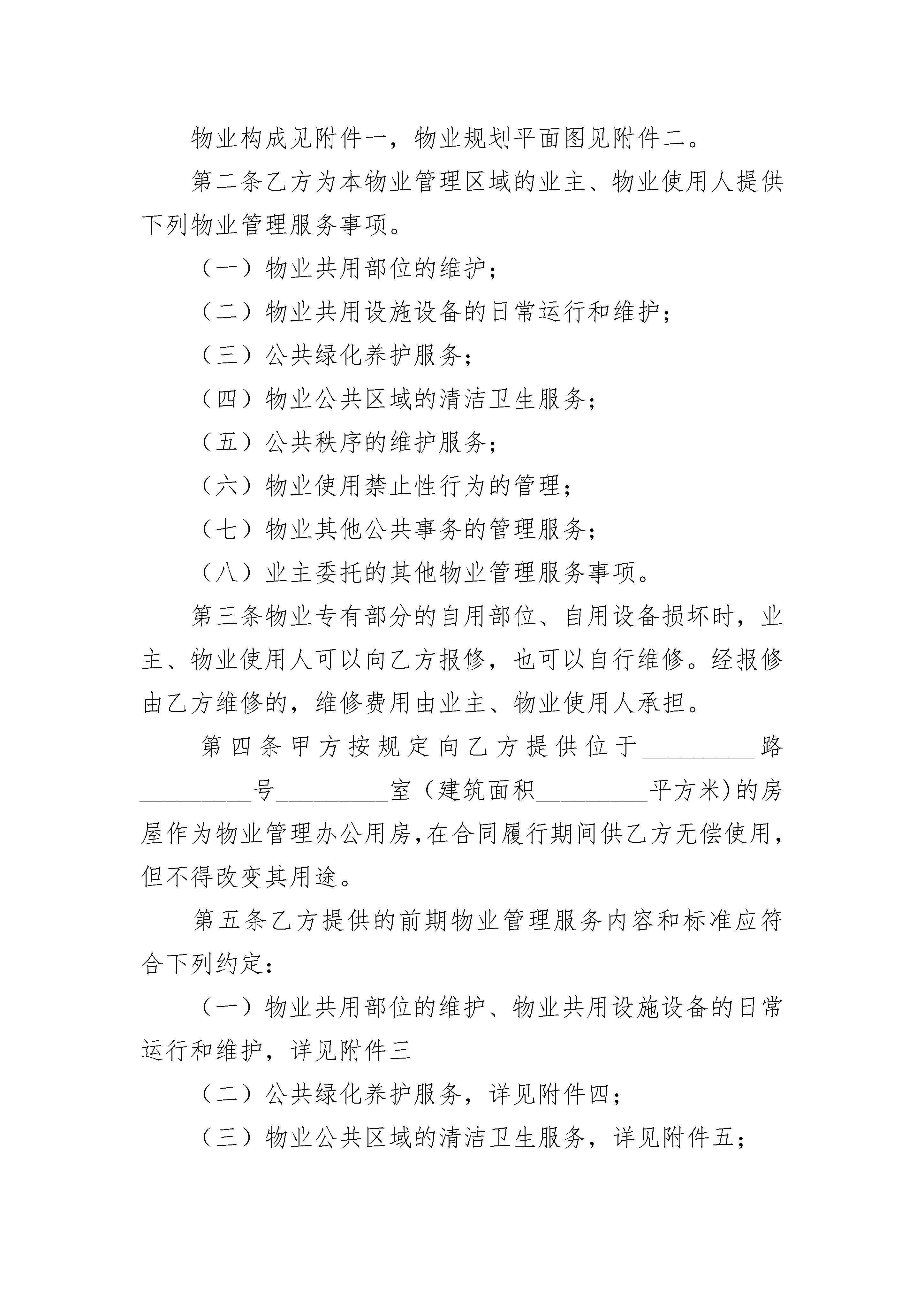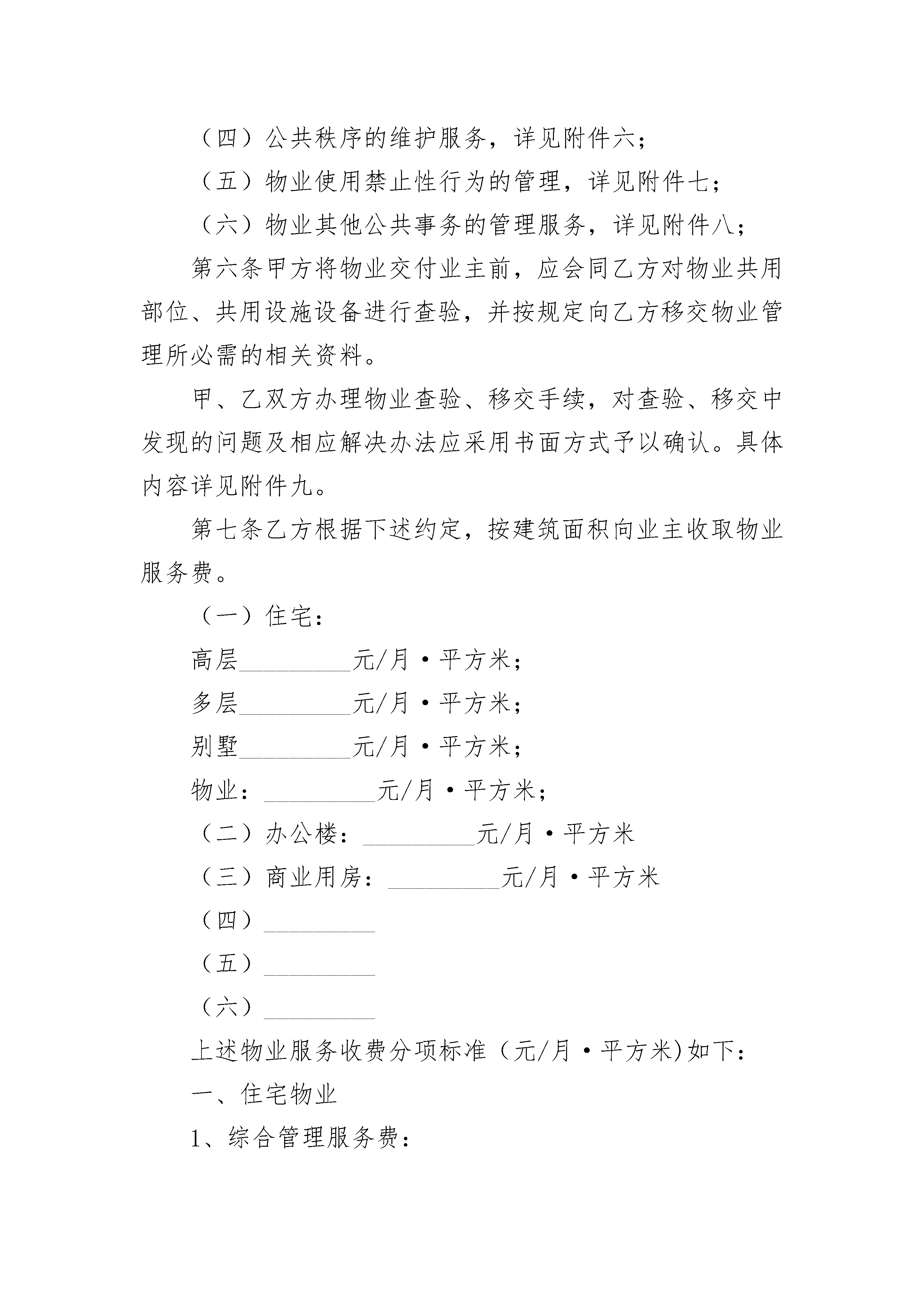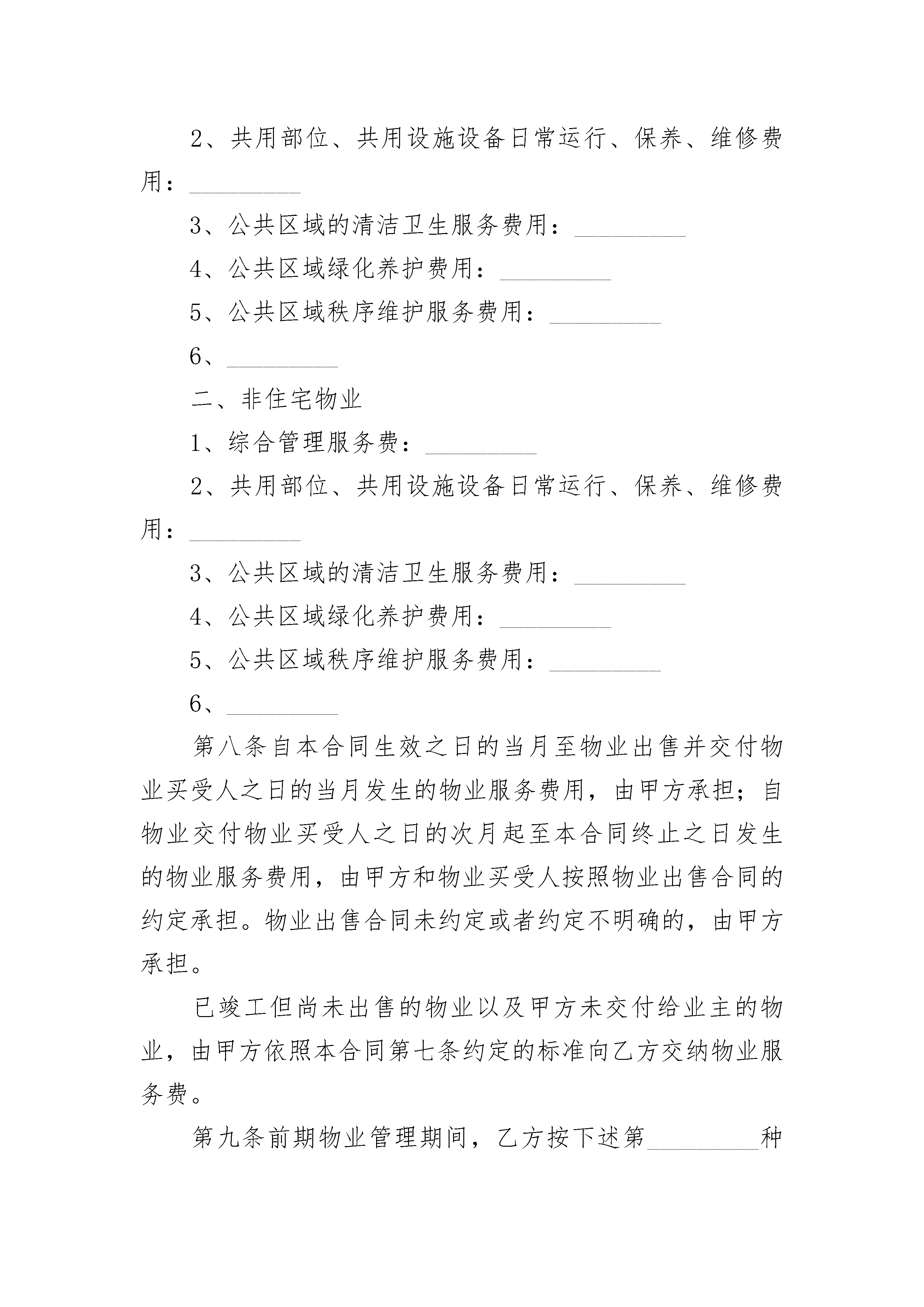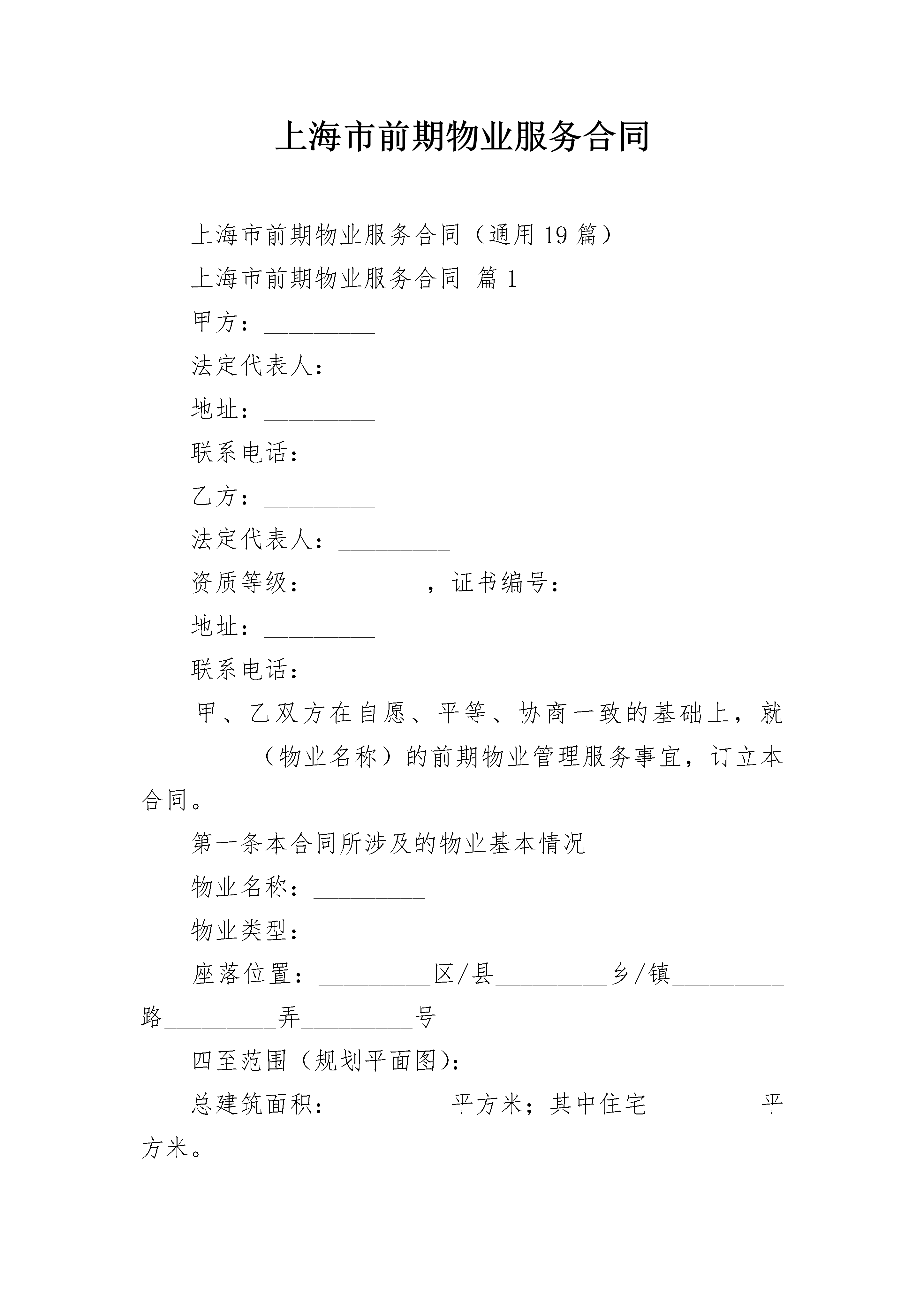 上海市前期物业服务合同上海市前期物业服务合同(通用19篇)上海市前期物业服务合同篇1甲方:_________法定代表人:_________地址:_________联系电话:_________乙方:_________法定代表人:_________资质等级:_________,证书编号:_________地址:_________联系电话:_________甲、乙双方在自愿、平等、协商一致的基础上,就_________(物业名称)的前期物业管理服务事宜,订立本合同。第一条本合同所涉及的物业基本情况物业名称:_________物业类型:_________座落位置:_________区/县_________乡/镇_________路_________弄_________号四至范围(规划平面图):_________总建筑面积:_________平方米;其中住宅_________平方米。物业构成见附件一,物业规划平面图见附件二。第二条乙方为本物业管理区域的业主、物业使用人提供下列物业管理服务事项。(一)物业共用部位的维护;(二)物业共用设施设备的日常运行和维护;(三)公共绿化养护服务;(四)物业公共区域的清洁卫生服务;(五)公共秩序的维护服务;(六)物业使用禁止性行为的管理;(七)物业其他公共事务的管理服务;(八)业主委托的其他物业管理服务事项。第三条物业专有部分的自用部位、自用设备损坏时,业主、物业使用人可以向乙方报修,也可以自行维修。经报修由乙方维修的,维修费用由业主、物业使用人承担。第四条甲方按规定向乙方提供位于_________路_________号_________室(建筑面积_________平方米)的房屋作为物业管理办公用房,在合同履行期间供乙方无偿使用,但不得改变其用途。第五条乙方提供的前期物业管理服务内容和标准应符合下列约定:(一)物业共用部位的维护、物业共用设施设备的日常运行和维护,详见附件三(二)公共绿化养护服务,详见附件四;(三)物业公共区域的清洁卫生服务,详见附件五;(四)公共秩序的维护服务,详见附件六;(五)物业使用禁止性行为的管理,详见附件七;(六)物业其他公共事务的管理服务,详见附件八;第六条甲方将物业交付业主前,应会同乙方对物业共用部位、共用设施设备进行查验,并按规定向乙方移交物业管理所必需的相关资料。甲、乙双方办理物业查验、移交手续,对查验、移交中发现的问题及相应解决办法应采用书面方式予以确认。具体内容详见附件九。第七条乙方根据下述约定,按建筑面积向业主收取物业服务费。(一)住宅:高层_________元/月·平方米;多层_________元/月·平方米;别墅_________元/月·平方米;物业:_________元/月·平方米;(二)办公楼:_________元/月·平方米(三)商业用房:_________元/月·平方米(四)_________(五)_________(六)_________上述物业服务收费分项标准(元/月·平方米)如下:一、住宅物业1、综合管理服务费:2、共用部位、共用设施设备日常运行、保养、维修费用:_________3、公共区域的清洁卫生服务费用:_________4、公共区域绿化养护费用:_________5、公共区域秩序维护服务费用:_________6、_________二、非住宅物业1、综合管理服务费:_________2、共用部位、共用设施设备日常运行、保养、维修费用:_________3、公共区域的清洁卫生服务费用:_________4、公共区域绿化养护费用:_________5、公共区域秩序维护服务费用:_________6、_________第八条自本合同生效之日的当月至物业出售并交付物业买受人之日的当月发生的物业服务费用,由甲方承担;自物业交付物业买受人之日的次月起至本合同终止之日发生的物业服务费用,由甲方和物业买受人按照物业出售合同的约定承担。物业出售合同未约定或者约定不明确的,由甲方承担。已竣工但尚未出售的物业以及甲方未交付给业主的物业,由甲方依照本合同第七条约定的标准向乙方交纳物业服务费。第九条前期物业管理期间,乙方按下述第_________种收费形式确定物业服务费用。(一)包干制。由业主向乙方支付本合同第七条约定的物业服务费用,盈余或者亏损均由乙方享有或者承担。(二)酬金制。在本合同第七条约定预收的物业服务资金中按下述第_________种方式提取酬金,其余全部用于物业服务合同约定的支出,结余或者不足均由业主享有或者承担。1、每_________(月/年)在预收的物业服务费用中按_________%的比例提取酬金;2、每_________(月/年)在预收的物业服务费用中提取_________元的酬金。(三)_________第十条物业服务费用(物业服