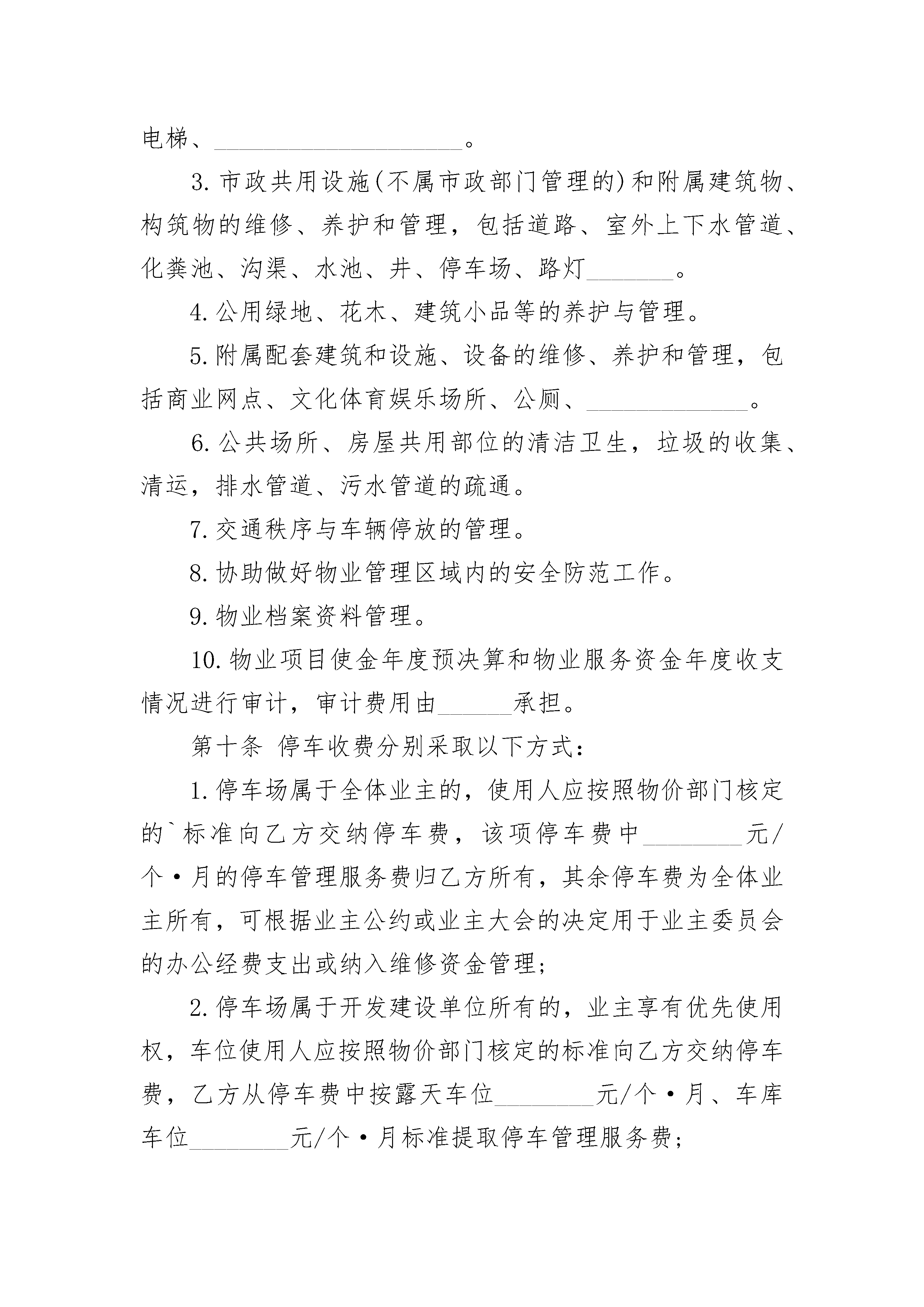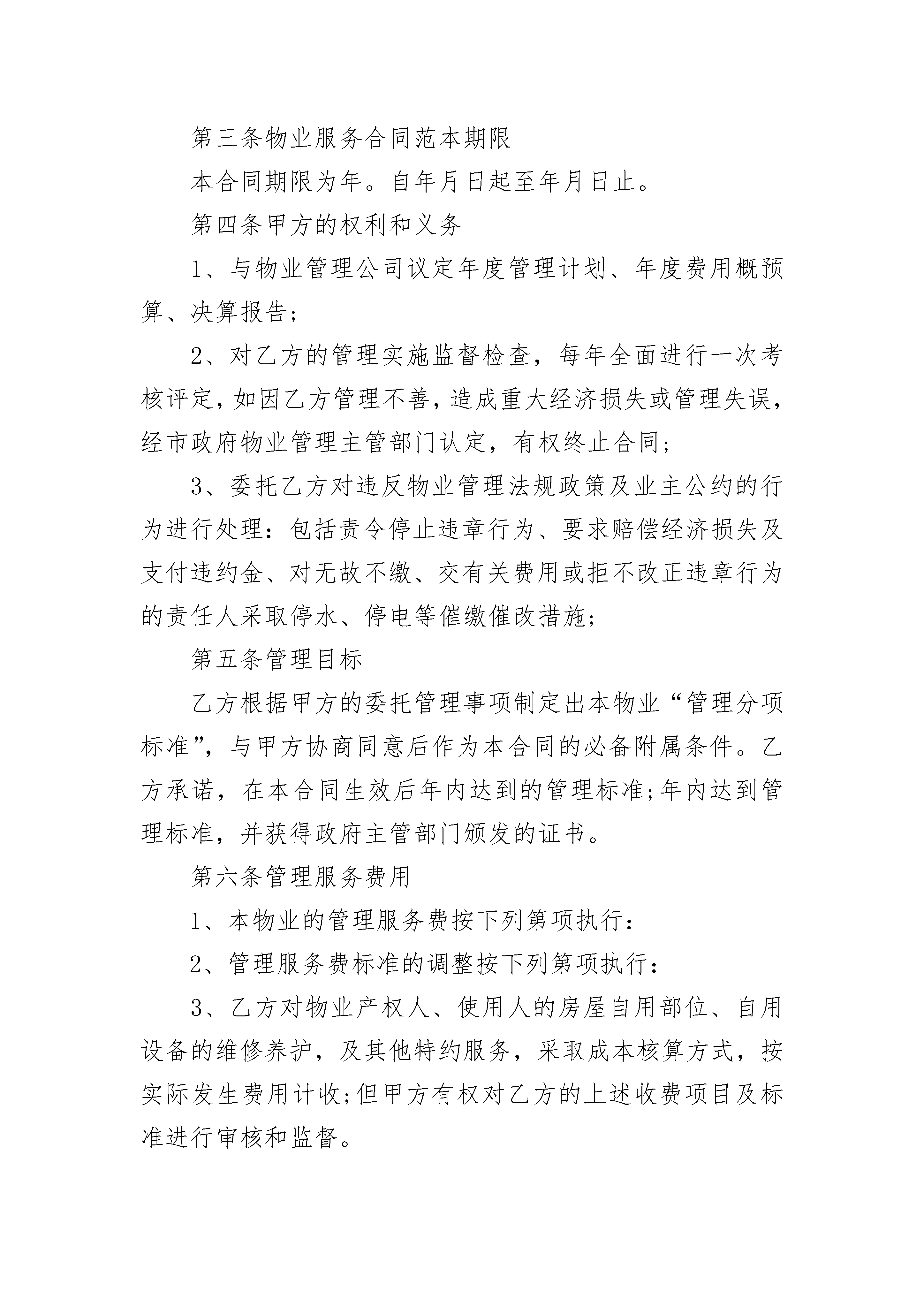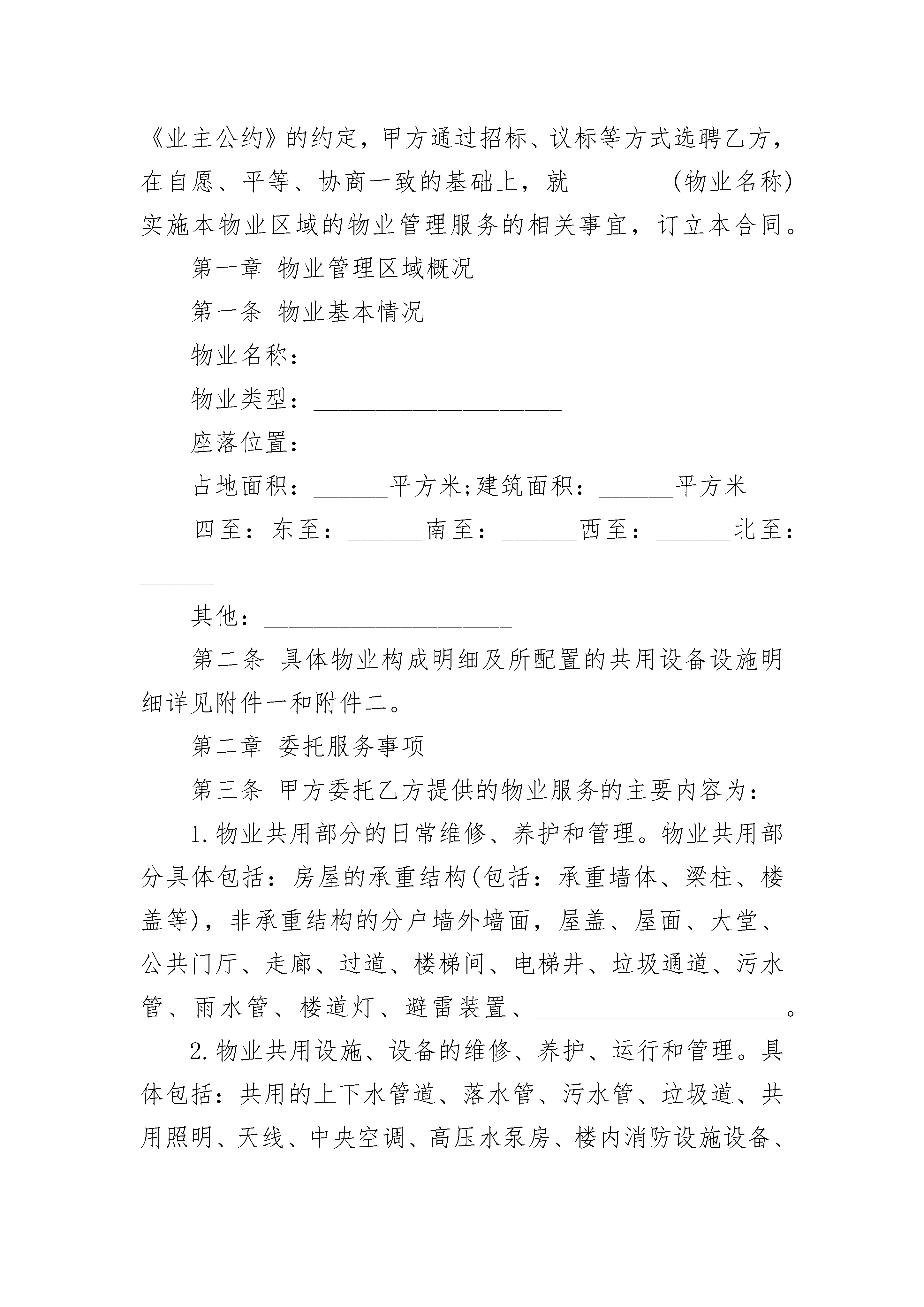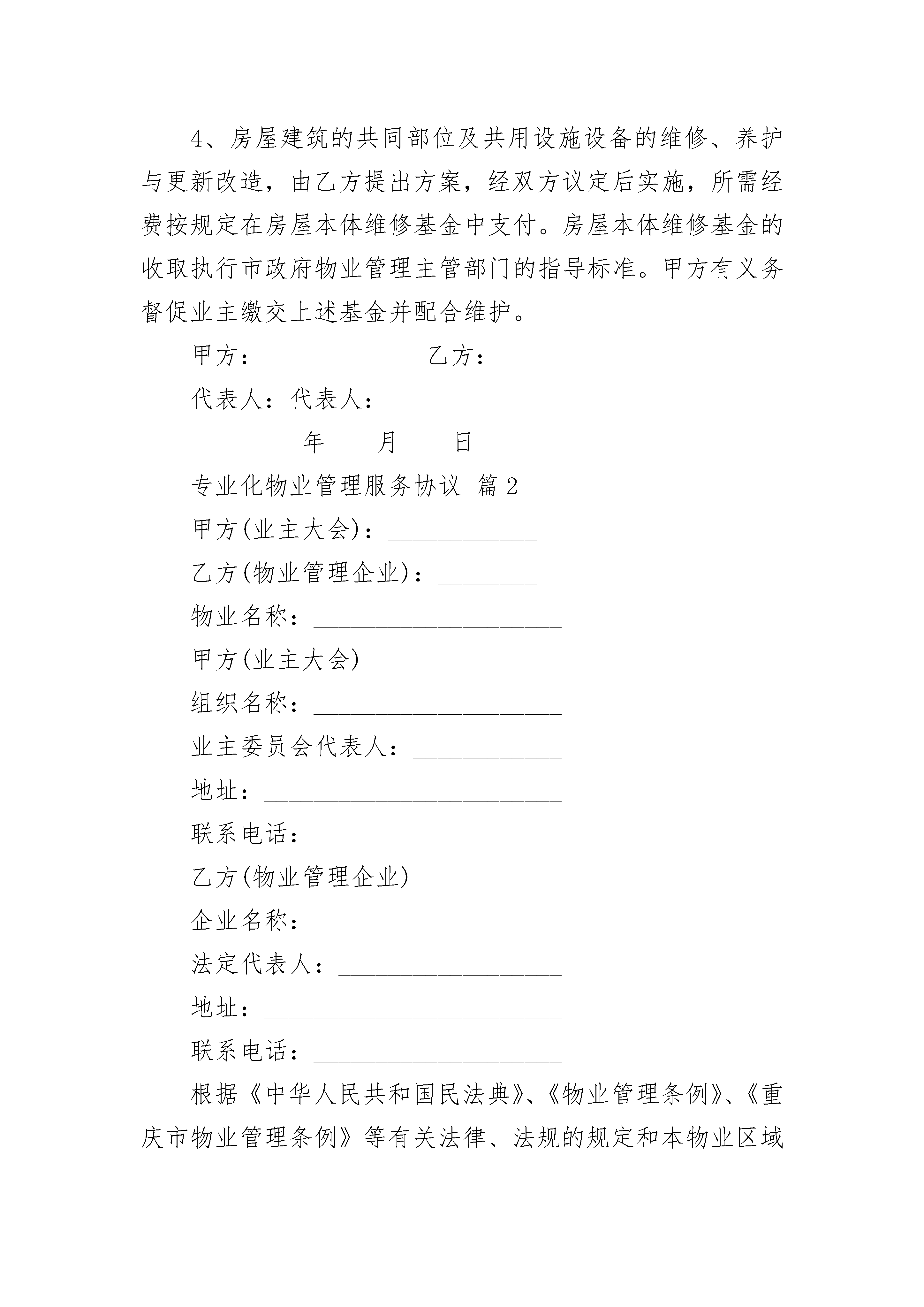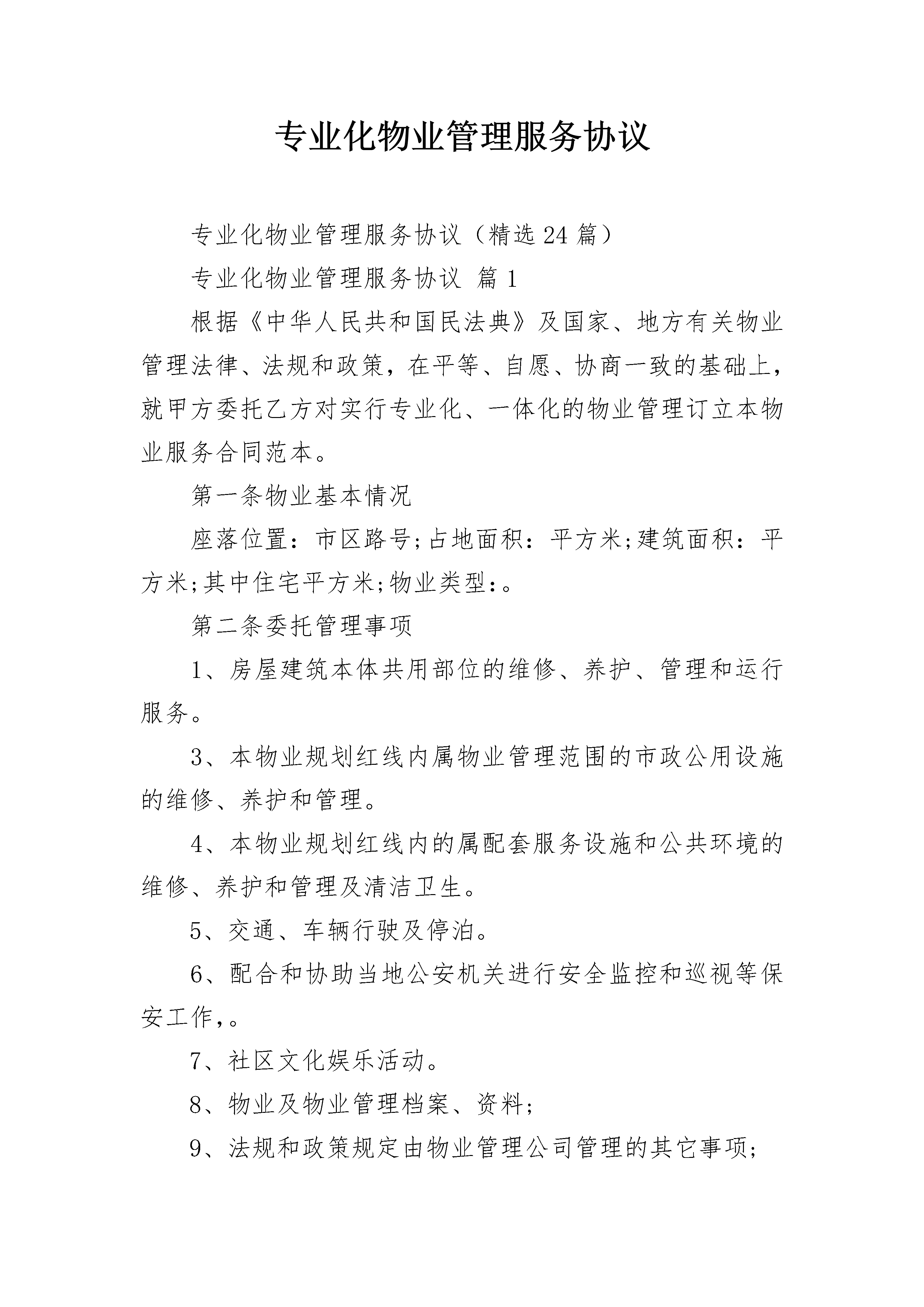 专业化物业管理服务协议专业化物业管理服务协议(精选24篇)专业化物业管理服务协议篇1根据《中华人民共和国民法典》及国家、地方有关物业管理法律、法规和政策,在平等、自愿、协商一致的基础上,就甲方委托乙方对实行专业化、一体化的物业管理订立本物业服务合同范本。第一条物业基本情况座落位置:市区路号;占地面积:平方米;建筑面积:平方米;其中住宅平方米;物业类型:。第二条委托管理事项1、房屋建筑本体共用部位的维修、养护、管理和运行服务。3、本物业规划红线内属物业管理范围的市政公用设施的维修、养护和管理。4、本物业规划红线内的属配套服务设施和公共环境的维修、养护和管理及清洁卫生。5、交通、车辆行驶及停泊。6、配合和协助当地公安机关进行安全监控和巡视等保安工作,。7、社区文化娱乐活动。8、物业及物业管理档案、资料;9、法规和政策规定由物业管理公司管理的其它事项;第三条物业服务合同范本期限本合同期限为年。自年月日起至年月日止。第四条甲方的权利和义务1、与物业管理公司议定年度管理计划、年度费用概预算、决算报告;2、对乙方的管理实施监督检查,每年全面进行一次考核评定,如因乙方管理不善,造成重大经济损失或管理失误,经市政府物业管理主管部门认定,有权终止合同;3、委托乙方对违反物业管理法规政策及业主公约的行为进行处理:包括责令停止违章行为、要求赔偿经济损失及支付违约金、对无故不缴、交有关费用或拒不改正违章行为的责任人采取停水、停电等催缴催改措施;第五条管理目标乙方根据甲方的委托管理事项制定出本物业“管理分项标准”,与甲方协商同意后作为本合同的必备附属条件。乙方承诺,在本合同生效后年内达到的管理标准;年内达到管理标准,并获得政府主管部门颁发的证书。第六条管理服务费用1、本物业的管理服务费按下列第项执行:2、管理服务费标准的调整按下列第项执行:3、乙方对物业产权人、使用人的房屋自用部位、自用设备的维修养护,及其他特约服务,采取成本核算方式,按实际发生费用计收;但甲方有权对乙方的上述收费项目及标准进行审核和监督。4、房屋建筑的共同部位及共用设施设备的维修、养护与更新改造,由乙方提出方案,经双方议定后实施,所需经费按规定在房屋本体维修基金中支付。房屋本体维修基金的收取执行市政府物业管理主管部门的指导标准。甲方有义务督促业主缴交上述基金并配合维护。甲方:_____________乙方:_____________代表人:代表人:_________年____月____日专业化物业管理服务协议篇2甲方(业主大会):____________乙方(物业管理企业):________物业名称:____________________甲方(业主大会)组织名称:____________________业主委员会代表人:____________地址:________________________联系电话:____________________乙方(物业管理企业)企业名称:____________________法定代表人:__________________地址:________________________联系电话:____________________根据《中华人民共和国民法典》、《物业管理条例》、《重庆市物业管理条例》等有关法律、法规的规定和本物业区域《业主公约》的约定,甲方通过招标、议标等方式选聘乙方,在自愿、平等、协商一致的基础上,就________(物业名称)实施本物业区域的物业管理服务的相关事宜,订立本合同。第一章物业管理区域概况第一条物业基本情况物业名称:____________________物业类型:____________________座落位置:____________________占地面积:______平方米;建筑面积:______平方米四至:东至:______南至:______西至:______北至:______其他:____________________第二条具体物业构成明细及所配置的共用设备设施明细详见附件一和附件二。第二章委托服务事项第三条甲方委托乙方提供的物业服务的主要内容为:1.物业共用部分的日常维修、养护和管理。物业共用部分具体包括:房屋的承重结构(包括:承重墙体、梁柱、楼盖等),非承重结构的分户墙外墙面,屋盖、屋面、大堂、公共门厅、走廊、过道、楼梯间、电梯井、垃圾通道、污水管、雨水管、楼道灯、避雷装置、____________________。2.物业共用设施、设备的维修、养护、运行和管理。具体包括:共用的上下水管道、落水管、污水管、垃圾道、共用照明、天线、中央空调、高压水泵房、楼内消防设施设备、电梯、____________________。3.市政共用设施(不属市政部门管理的)和附属建筑物、构筑物的维修、养护和管理,包括