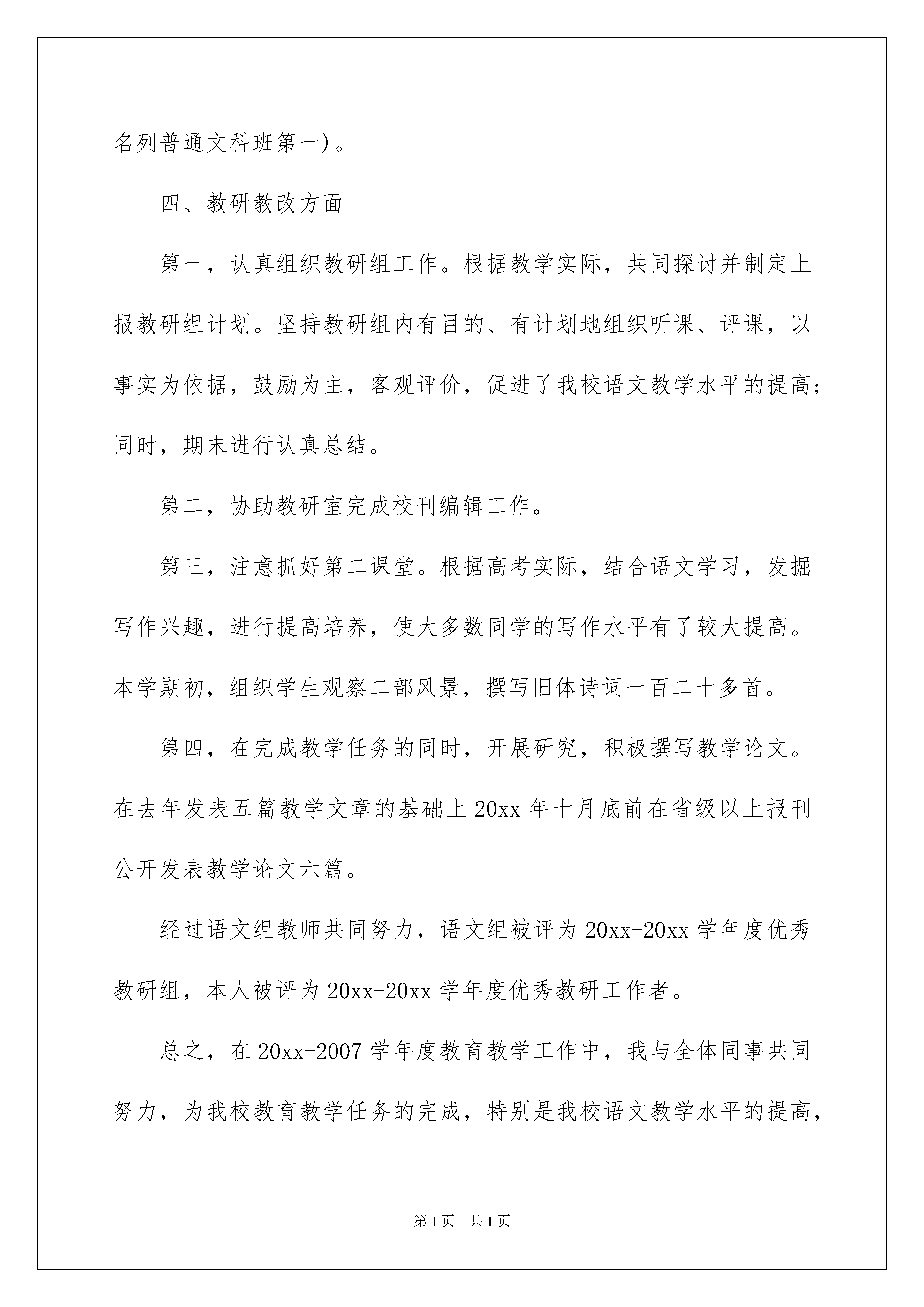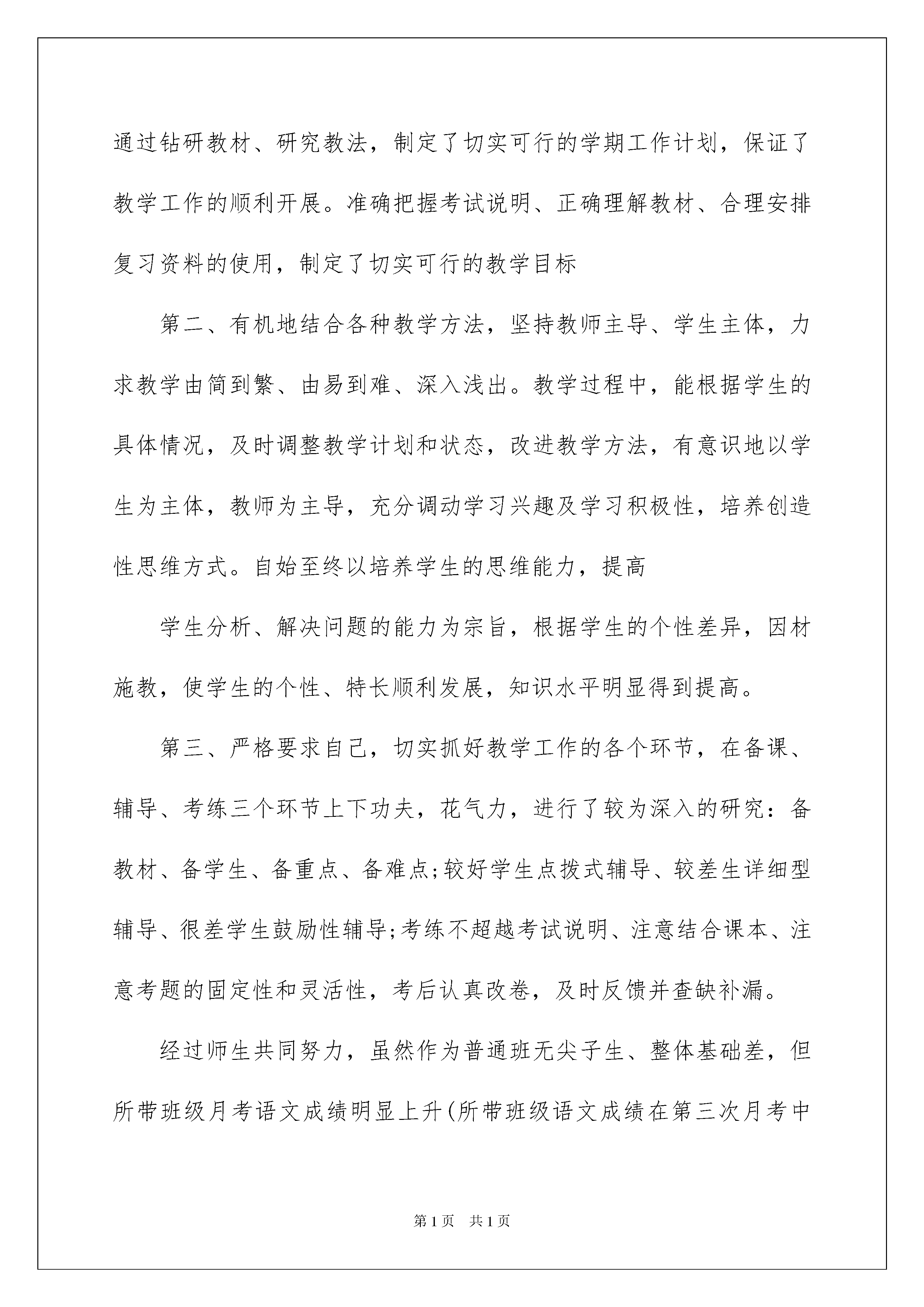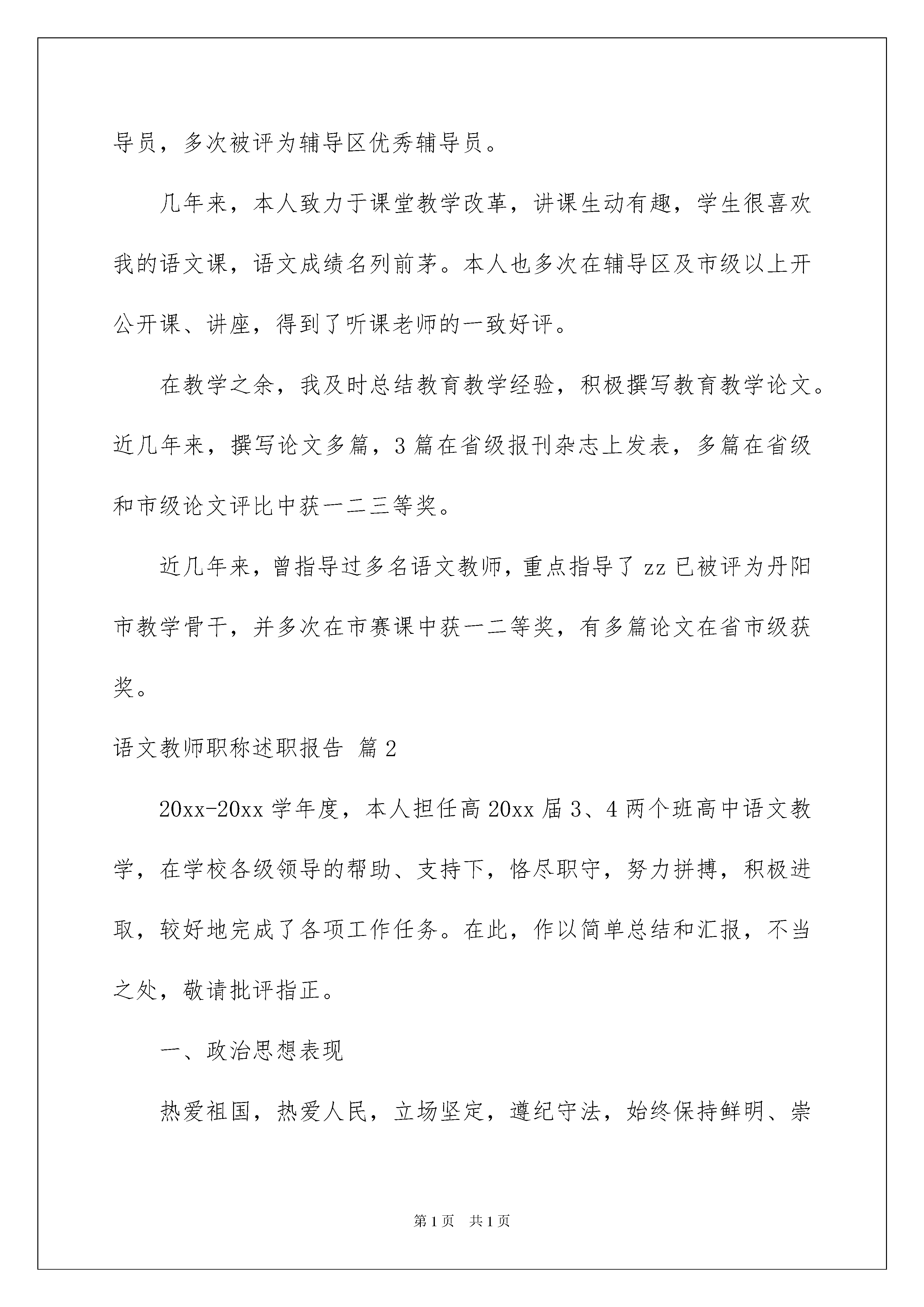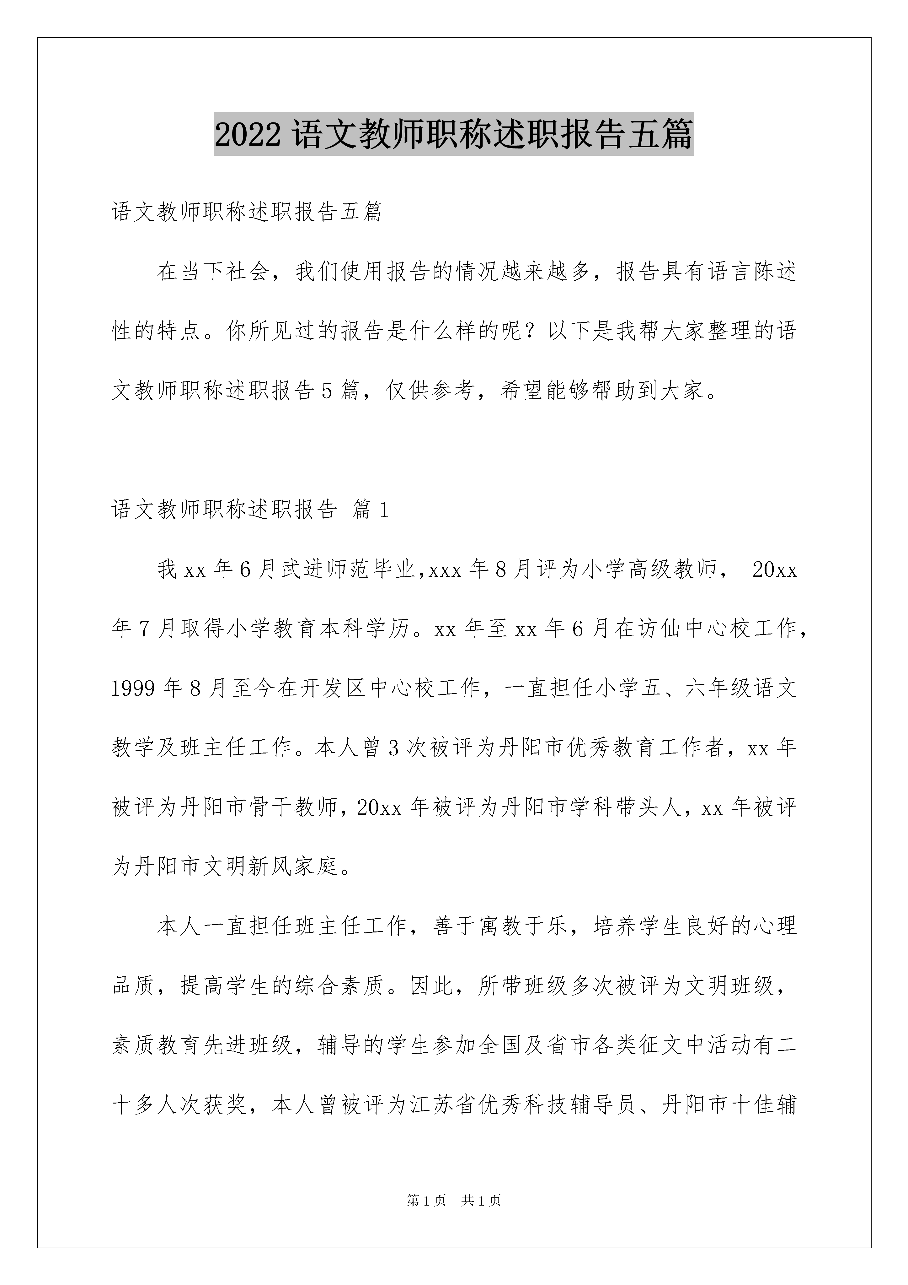 2022语文教师职称述职报告五篇语文教师职称述职报告五篇在当下社会,我们使用报告的情况越来越多,报告具有语言陈述性的特点。你所见过的报告是什么样的呢?以下是我帮大家整理的语文教师职称述职报告5篇,仅供参考,希望能够帮助到大家。语文教师职称述职报告篇1我xx年6月武进师范毕业,xxx年8月评为小学高级教师,20xx年7月取得小学教育本科学历。xx年至xx年6月在访仙中心校工作,1999年8月至今在开发区中心校工作,一直担任小学五、六年级语文教学及班主任工作。本人曾3次被评为丹阳市优秀教育工作者,xx年被评为丹阳市骨干教师,20xx年被评为丹阳市学科带头人,xx年被评为丹阳市文明新风家庭。本人一直担任班主任工作,善于寓教于乐,培养学生良好的心理品质,提高学生的综合素质。因此,所带班级多次被评为文明班级,素质教育先进班级,辅导的学生参加全国及省市各类征文中活动有二十多人次获奖,本人曾被评为江苏省优秀科技辅导员、丹阳市十佳辅导员,多次被评为辅导区优秀辅导员。几年来,本人致力于课堂教学改革,讲课生动有趣,学生很喜欢我的语文课,语文成绩名列前茅。本人也多次在辅导区及市级以上开公开课、讲座,得到了听课老师的一致好评。在教学之余,我及时总结教育教学经验,积极撰写教育教学论文。近几年来,撰写论文多篇,3篇在省级报刊杂志上发表,多篇在省级和市级论文评比中获一二三等奖。近几年来,曾指导过多名语文教师,重点指导了zz已被评为丹阳市教学骨干,并多次在市赛课中获一二等奖,有多篇论文在省市级获奖。语文教师职称述职报告篇220xx-20xx学年度,本人担任高20xx届3、4两个班高中语文教学,在学校各级领导的帮助、支持下,恪尽职守,努力拼搏,积极进取,较好地完成了各项工作任务。在此,作以简单总结和汇报,不当之处,敬请批评指正。一、政治思想表现热爱祖国,热爱人民,立场坚定,遵纪守法,始终保持鲜明、崇高的政治觉悟,政治思想觉悟高,坚持党的四项基本原则;时刻注意思想品德修养,积极参加政治学习,关心时事;忠诚于党的教育事业,坚持教书育人相结合;热爱学校,积极进取,甘于奉献,兢兢业业,尽职尽责,勇于承担工作,任劳任怨,做到个人利益服从集体利益,前后顶课一个月、顶班主任十八天;待人热情,关心集体,处事公正,团结同事。二、思想教育管理第一、保持高度的责任心和严谨的工作作风,注意教师形象和素养,严格按照学校的要求做好教学和辅导、批改作业等工作,能够认真完成教研组和备课组分配的各项任务。第二、热爱、关心所有学生,能够动之以情,晓之以理,帮助学生树立正确的人生观、科学的世界观,培养学生养成勤奋学习、尊敬师长的良好习惯,注意激发学生奋力拼搏的信心和勇气。第三、坚持勤跟,坚持常规工作常抓不懈,严格管理,细心观察,发现问题及时处理;发现错误,坦诚交流。既关心爱护,又严格要求。三、课堂教育教学第一、根据学校的高考任务和教材内容,认真研究资料和方法。通过钻研教材、研究教法,制定了切实可行的学期工作计划,保证了教学工作的顺利开展。准确把握考试说明、正确理解教材、合理安排复习资料的使用,制定了切实可行的教学目标第二、有机地结合各种教学方法,坚持教师主导、学生主体,力求教学由简到繁、由易到难、深入浅出。教学过程中,能根据学生的具体情况,及时调整教学计划和状态,改进教学方法,有意识地以学生为主体,教师为主导,充分调动学习兴趣及学习积极性,培养创造性思维方式。自始至终以培养学生的思维能力,提高学生分析、解决问题的能力为宗旨,根据学生的个性差异,因材施教,使学生的个性、特长顺利发展,知识水平明显得到提高。第三、严格要求自己,切实抓好教学工作的各个环节,在备课、辅导、考练三个环节上下功夫,花气力,进行了较为深入的研究:备教材、备学生、备重点、备难点;较好学生点拨式辅导、较差生详细型辅导、很差学生鼓励性辅导;考练不超越考试说明、注意结合课本、注意考题的固定性和灵活性,考后认真改卷,及时反馈并查缺补漏。经过师生共同努力,虽然作为普通班无尖子生、整体基础差,但所带班级月考语文成绩明显上升(所带班级语文成绩在第三次月考中名列普通文科班第一)。四、教研教改方面第一,认真组织教研组工作。根据教学实际,共同探讨并制定上报教研组计划。坚持教研组内有目的、有计划地组织听课、评课,以事实为依据,鼓励为主,客观评价,促进了我校语文教学水平的提高;同时,期末进行认真总结。第二,协助教研室完成校刊编辑工作。第三,注意抓好第二课堂。根据高考实际,结合语文学习,发掘写作兴趣,进行提高培养,使大多数同学的写作水平有了较大提高。本学期初,组织学生观察二部风景,撰写旧体诗词一百二十