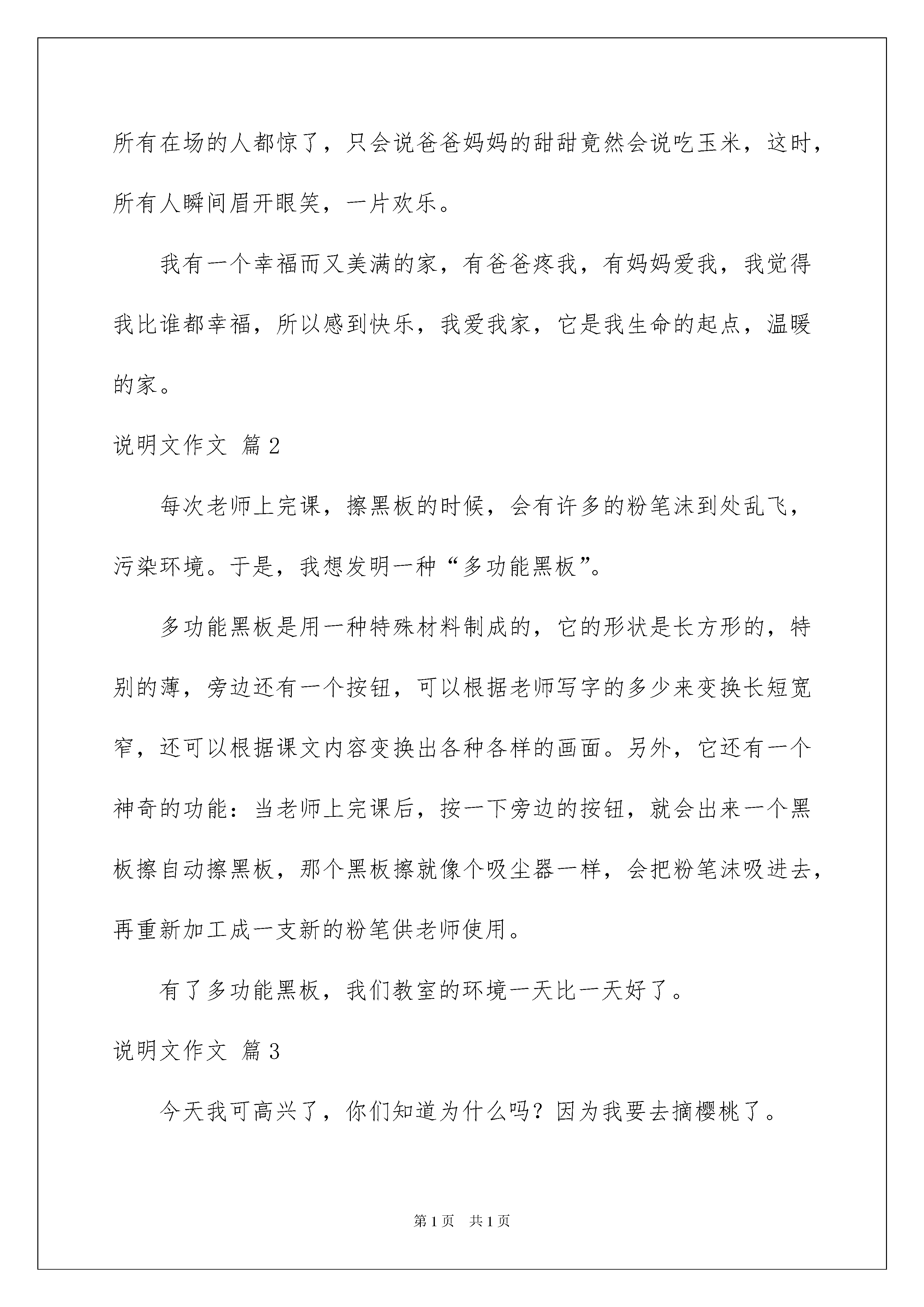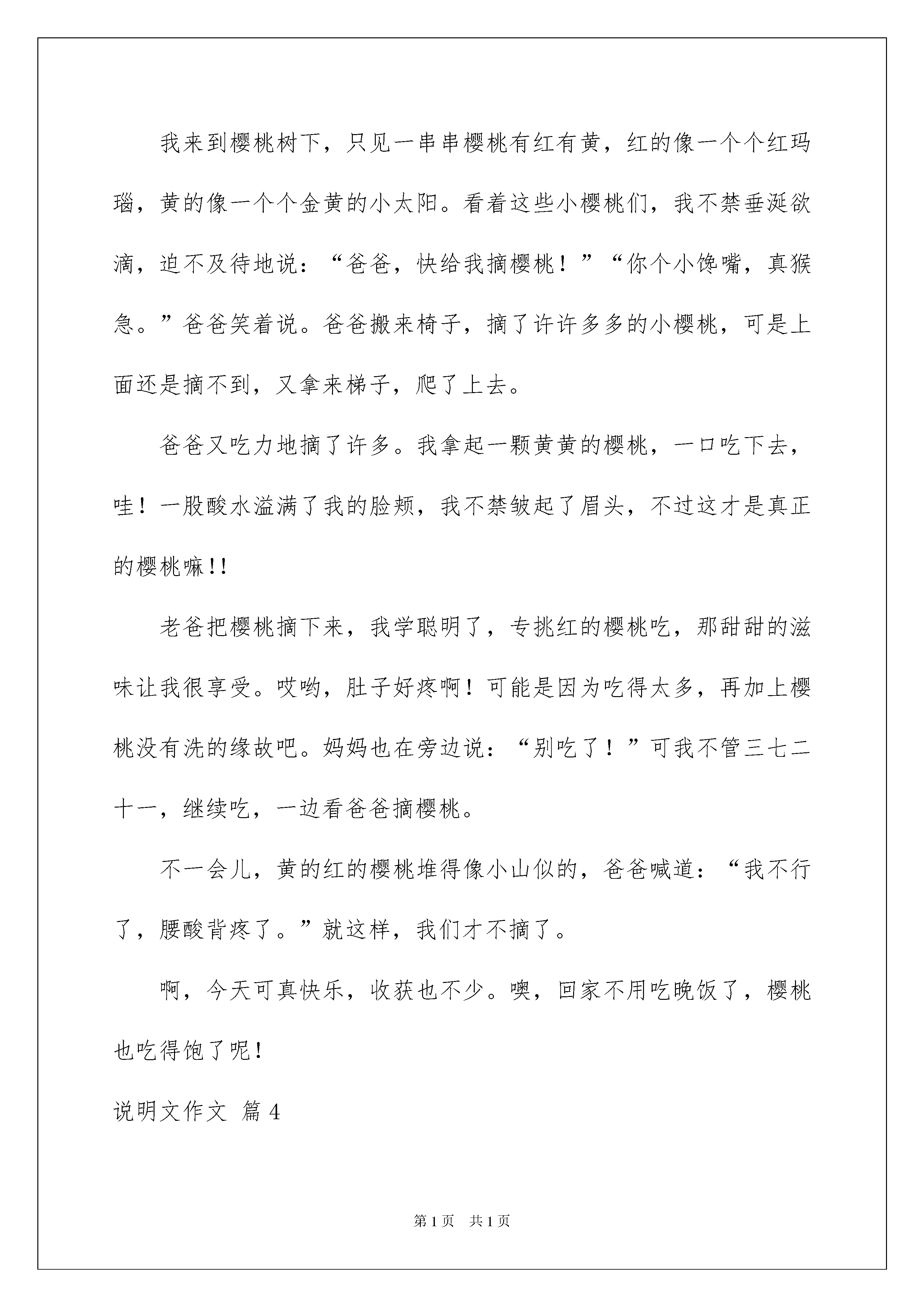 2022说明文作文合集四篇说明文作文无论在学习、工作或是生活中,大家或多或少都会接触过作文吧,借助作文人们可以实现文化交流的目的。相信很多朋友都对写作文感到非常苦恼吧,以下是我收集整理的说明文作文5篇,仅供参考,欢迎大家阅读。说明文作文篇1我有一个和睦而又温馨的家,有爸爸、妈妈和我。三个人各不相同的脾气和特点,虽然各弹个调,但凑到一起却组成了一支和谐的交响乐,使家庭充满了欢乐的气氛。爸爸是一个能吃苦耐劳,干事心细的人。从小在我眼中,爸爸就是一个家的顶梁柱,直到的立着,毫不松弛,我家四分之二的家柜都是爸爸亲手做的,四分之二的家用电器也都是爸爸修好的,爸爸干什么都是靠自己,从不求他人。记的有一次,我家的抽油烟机坏了,不能再用了,只能从买,可爸爸为了剩下钱来,自己就冒着雨,去废品收购站买来旧铁皮,自己在家中研究着做,功夫不负有心人,经过一段时间的努力制作,抽油烟机终于完成了,爸爸手中的油烟机,虽没有商店的样式精致,但效果相当不错。爸爸永远是我心目中的骄傲。妈妈是一个勤劳能干,勤俭节约的人。记得那是烈日炎炎的中午,我们一家人正在吃饭,我吃的最少,所以很快就吃完了,刚要转身走,妈妈严肃地说:“饭还没吃完,走什么。”可我再回头一看,没有啊,碗已经空荡荡的,妈妈指指桌上掉的一粒米,说:“赶快拿筷夹上吃了。”我很难为情的说;:能不能不吃呀?“可妈妈不同意,对我说了这番话:“一粒米是来之不易的,是靠农民伯伯辛勤的汗水换来的,所以,我们要珍惜它们。”说完我就主动把米夹了起来吃,妈妈看了后很高兴。我,是一个活泼可爱,好静的女孩。我是爸爸妈妈的开心果,总能让爸爸妈妈笑上眉梢。爸爸曾给我讲过一个我不到一岁的故事。秋天到了,硕果累累,院里有许多阿姨正在吃玉米,一边吃,还一边逗我,说玉米多好吃,我搀的直流口水,手指着阿姨手中的玉米,叽叽哇哇的叫着,妈妈知道我想吃玉米,就说:“甜甜,你想吃玉米妈妈知道,可你还太小,不能吃,等你长大点再吃。”可是,我看到她们吃地这么香,实在忍不住,就又指着玉米叫起来:“吃玉米。”这时,所有在场的人都惊了,只会说爸爸妈妈的甜甜竟然会说吃玉米,这时,所有人瞬间眉开眼笑,一片欢乐。我有一个幸福而又美满的家,有爸爸疼我,有妈妈爱我,我觉得我比谁都幸福,所以感到快乐,我爱我家,它是我生命的起点,温暖的家。说明文作文篇2每次老师上完课,擦黑板的时候,会有许多的粉笔沫到处乱飞,污染环境。于是,我想发明一种“多功能黑板”。多功能黑板是用一种特殊材料制成的,它的形状是长方形的,特别的薄,旁边还有一个按钮,可以根据老师写字的多少来变换长短宽窄,还可以根据课文内容变换出各种各样的画面。另外,它还有一个神奇的功能:当老师上完课后,按一下旁边的按钮,就会出来一个黑板擦自动擦黑板,那个黑板擦就像个吸尘器一样,会把粉笔沫吸进去,再重新加工成一支新的粉笔供老师使用。有了多功能黑板,我们教室的环境一天比一天好了。说明文作文篇3今天我可高兴了,你们知道为什么吗?因为我要去摘樱桃了。我来到樱桃树下,只见一串串樱桃有红有黄,红的像一个个红玛瑙,黄的像一个个金黄的小太阳。看着这些小樱桃们,我不禁垂涎欲滴,迫不及待地说:“爸爸,快给我摘樱桃!”“你个小馋嘴,真猴急。”爸爸笑着说。爸爸搬来椅子,摘了许许多多的小樱桃,可是上面还是摘不到,又拿来梯子,爬了上去。爸爸又吃力地摘了许多。我拿起一颗黄黄的樱桃,一口吃下去,哇!一股酸水溢满了我的脸颊,我不禁皱起了眉头,不过这才是真正的樱桃嘛!!老爸把樱桃摘下来,我学聪明了,专挑红的樱桃吃,那甜甜的滋味让我很享受。哎哟,肚子好疼啊!可能是因为吃得太多,再加上樱桃没有洗的缘故吧。妈妈也在旁边说:“别吃了!”可我不管三七二十一,继续吃,一边看爸爸摘樱桃。不一会儿,黄的红的樱桃堆得像小山似的,爸爸喊道:“我不行了,腰酸背疼了。”就这样,我们才不摘了。啊,今天可真快乐,收获也不少。噢,回家不用吃晚饭了,樱桃也吃得饱了呢!说明文作文篇4我家养了一只猫,它全身雪白,胖乎乎的,就像一个大圆球,一双水汪汪的,狼眼睛就像两个大大的宝石,一张小嘴嘟着翘了起来,一对尖尖的耳朵,一动一动的,最后,还有它的鼻子,嗅觉非常灵敏,只要远处有吃的,它就会飞奔过来,它的名字叫荷包蛋。老鼠的眼中评价:它简直就是一个死神,就是我们的噩梦。一天,咕我的'肚子饿了,哎呀!我得出去偷东西了。我鬼鬼祟祟地走出了老鼠洞,虽然我走出了老鼠洞,便是进了猫的血盆大口,可为了肚子,还是出去了。我蹑手蹑脚地走进了厨房,一个鲤鱼翻身,跳上了冰箱,为了防止被猫发现,我躲在了冰箱上面的瓶子后面,我慢慢地打开冰箱,拿出了冰箱里面的苹果酱,哎呀!
