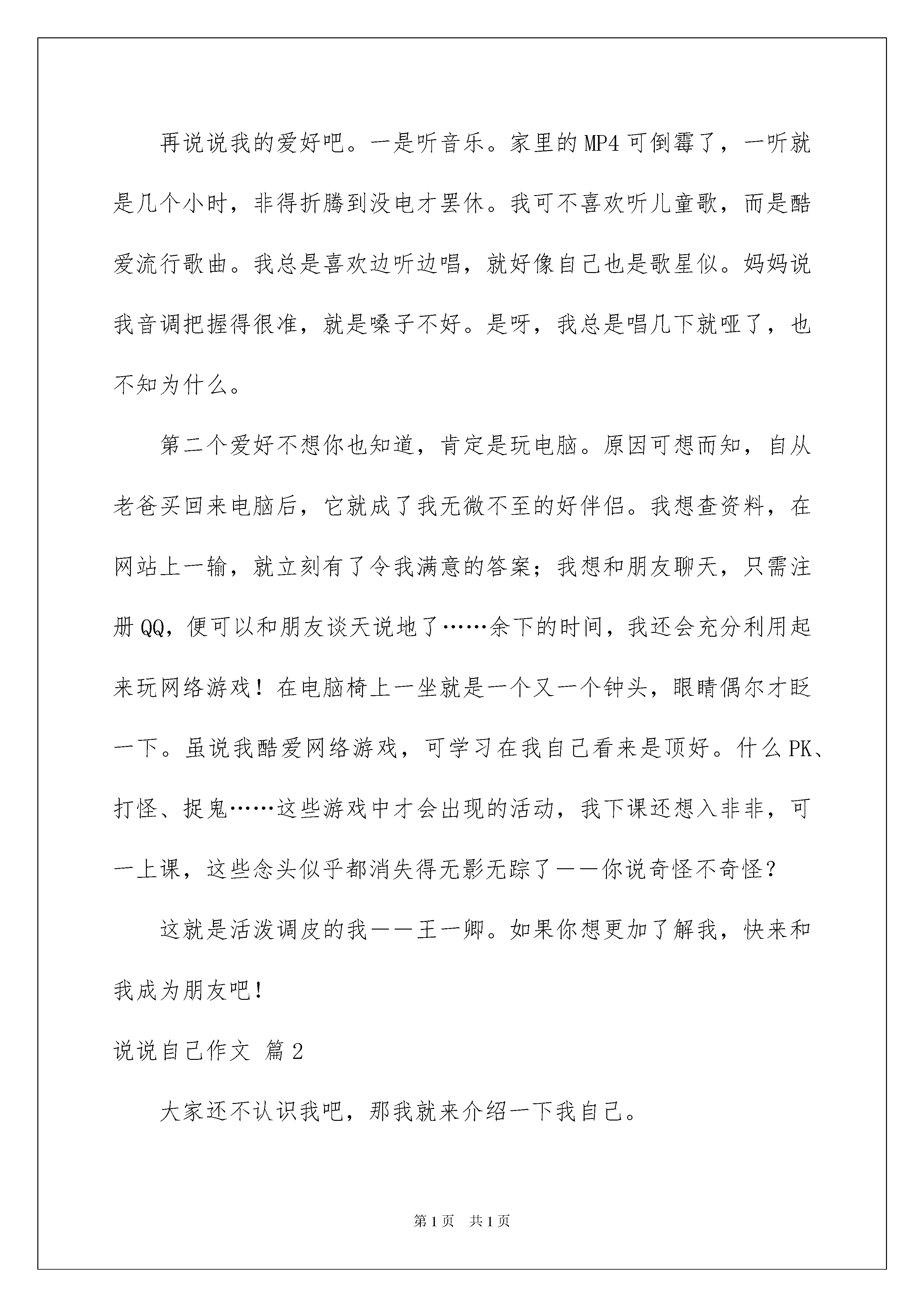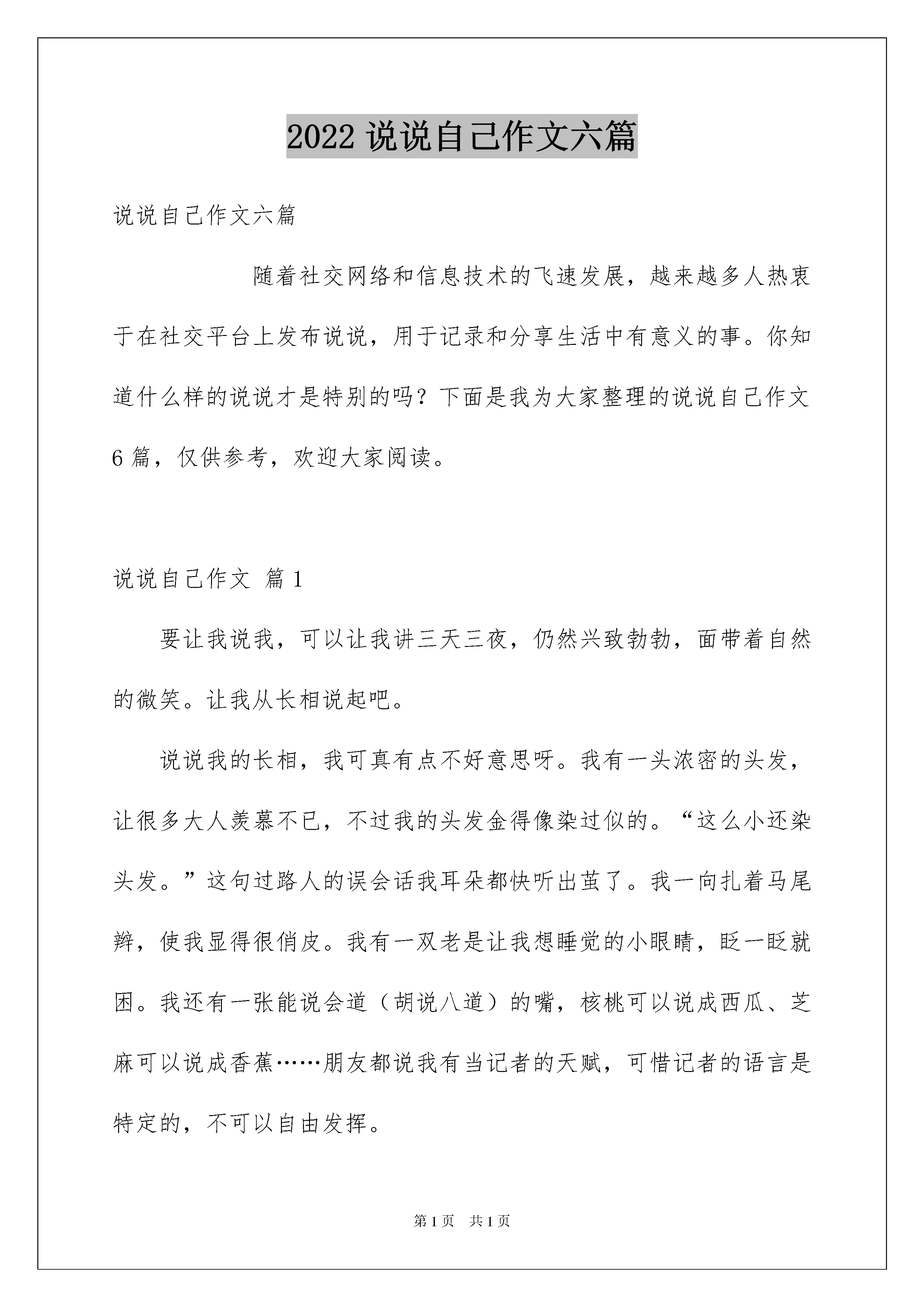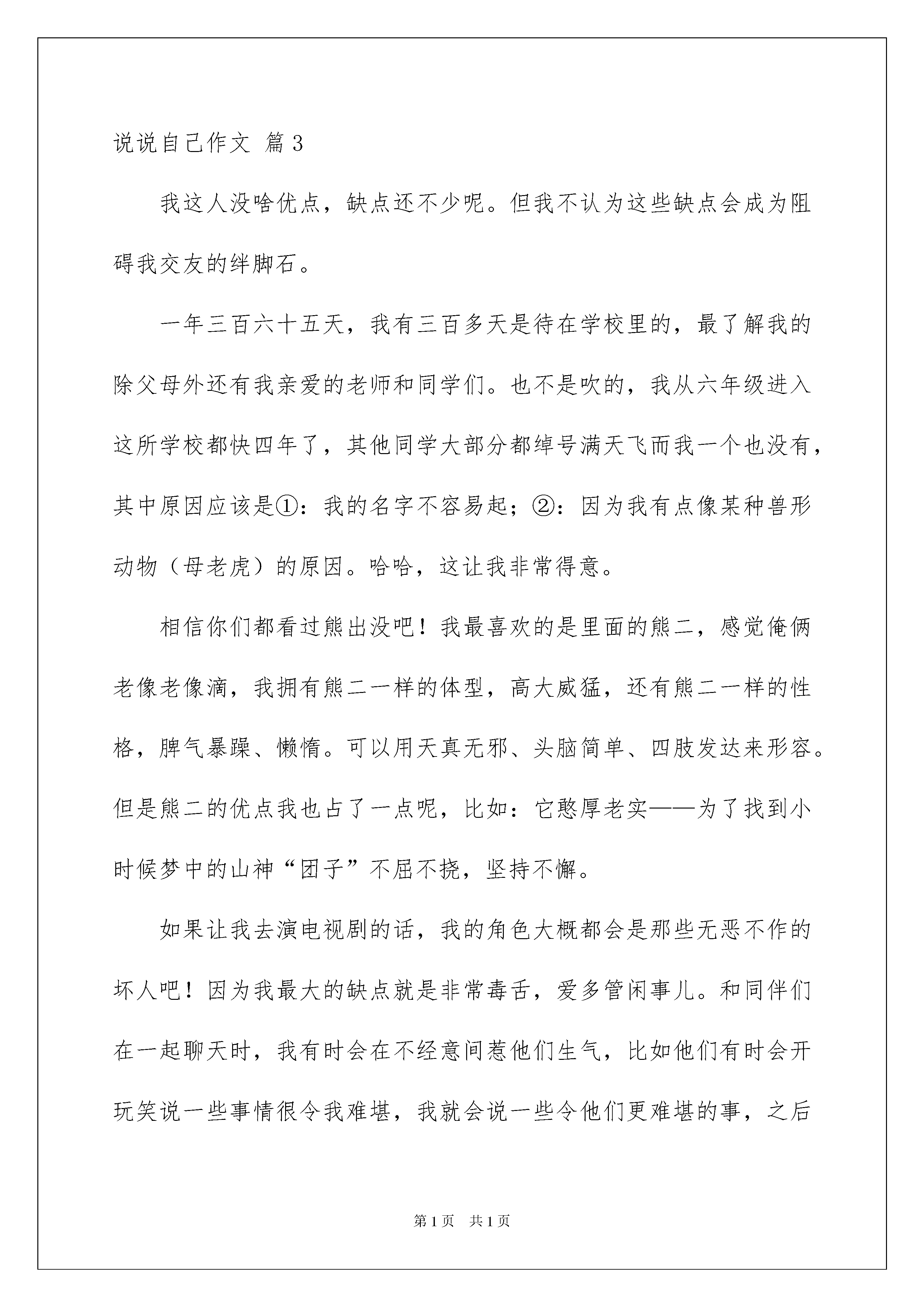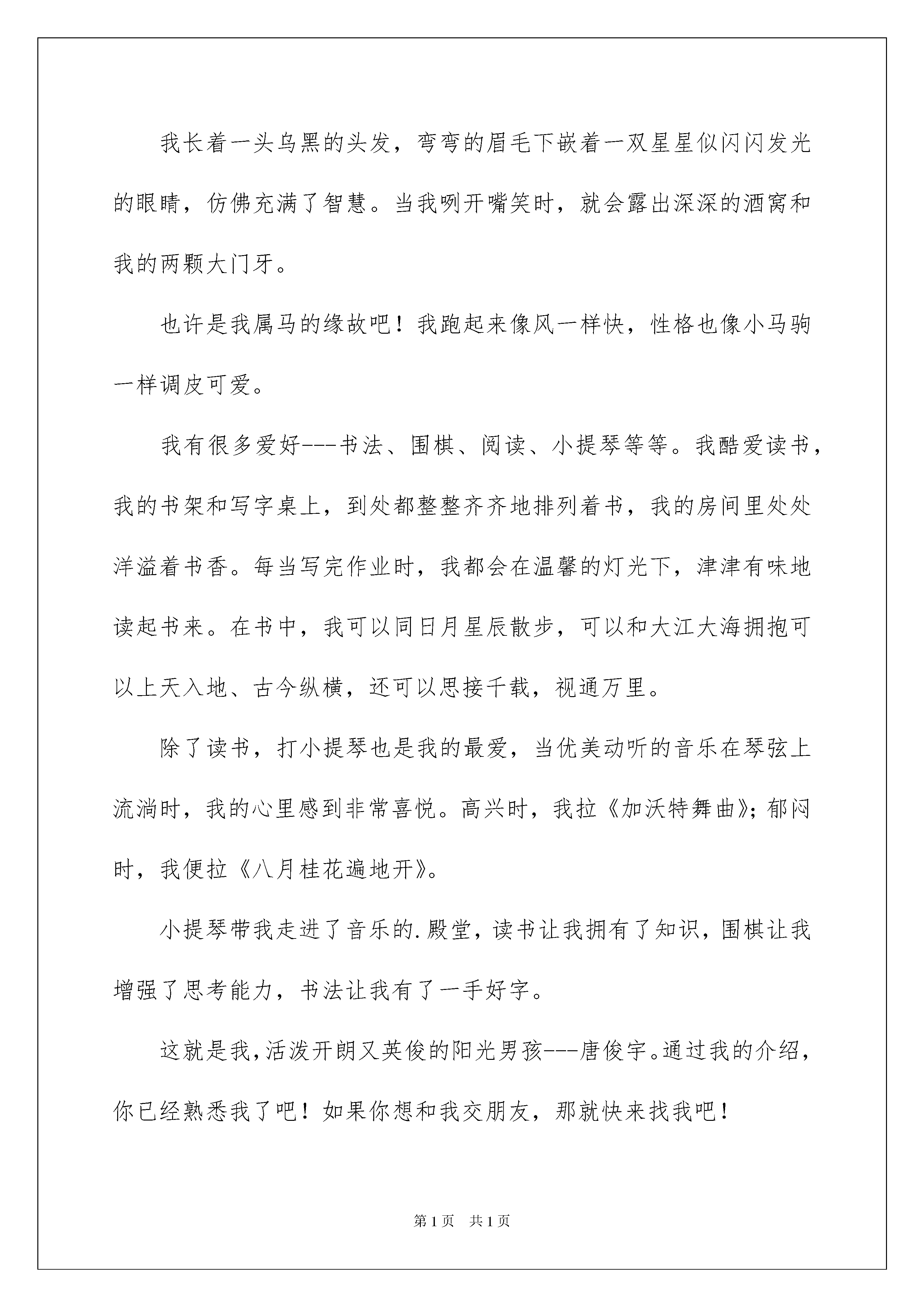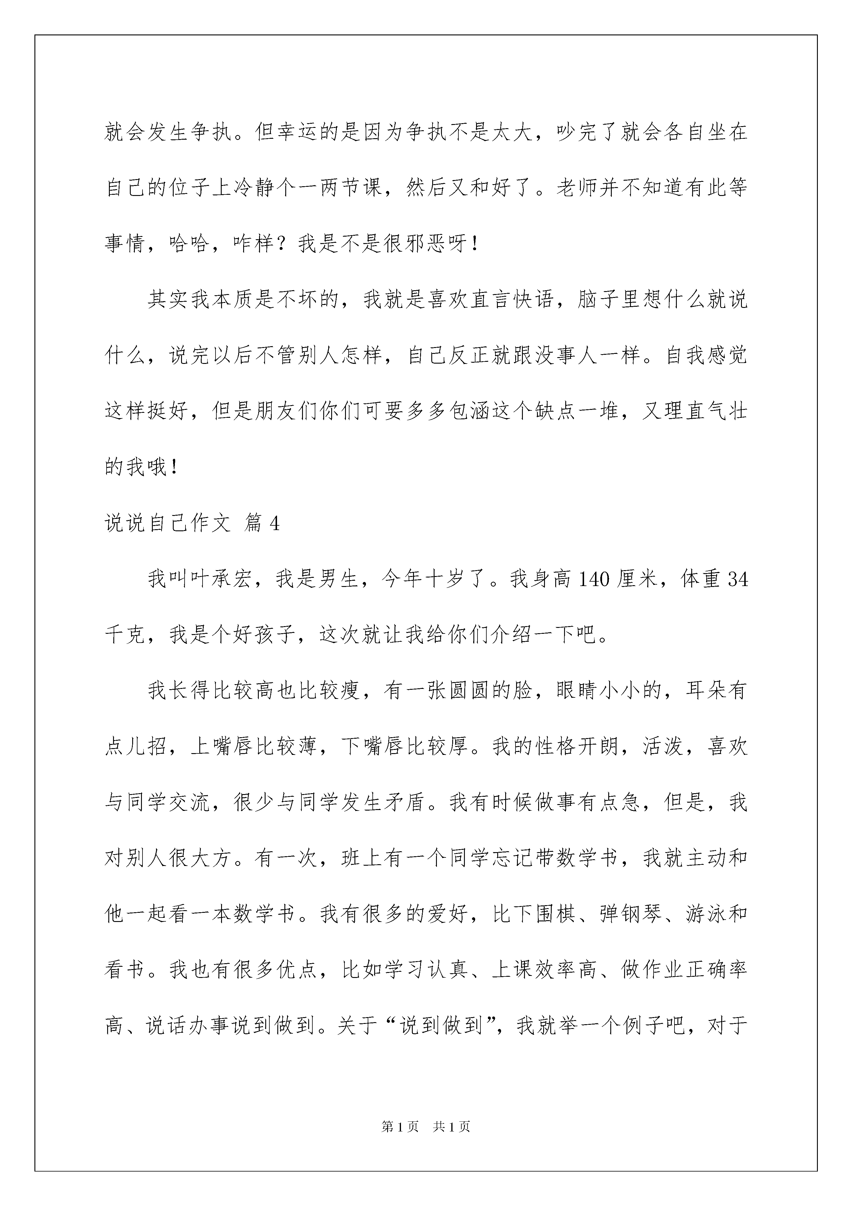 2022说说自己作文六篇说说自己作文六篇随着社交网络和信息技术的飞速发展,越来越多人热衷于在社交平台上发布说说,用于记录和分享生活中有意义的事。你知道什么样的说说才是特别的吗?下面是我为大家整理的说说自己作文6篇,仅供参考,欢迎大家阅读。说说自己作文篇1要让我说我,可以让我讲三天三夜,仍然兴致勃勃,面带着自然的微笑。让我从长相说起吧。说说我的长相,我可真有点不好意思呀。我有一头浓密的头发,让很多大人羡慕不已,不过我的头发金得像染过似的。“这么小还染头发。”这句过路人的误会话我耳朵都快听出茧了。我一向扎着马尾辫,使我显得很俏皮。我有一双老是让我想睡觉的小眼睛,眨一眨就困。我还有一张能说会道(胡说八道)的嘴,核桃可以说成西瓜、芝麻可以说成香蕉……朋友都说我有当记者的天赋,可惜记者的语言是特定的,不可以自由发挥。再说说我的爱好吧。一是听音乐。家里的MP4可倒霉了,一听就是几个小时,非得折腾到没电才罢休。我可不喜欢听儿童歌,而是酷爱流行歌曲。我总是喜欢边听边唱,就好像自己也是歌星似。妈妈说我音调把握得很准,就是嗓子不好。是呀,我总是唱几下就哑了,也不知为什么。第二个爱好不想你也知道,肯定是玩电脑。原因可想而知,自从老爸买回来电脑后,它就成了我无微不至的好伴侣。我想查资料,在网站上一输,就立刻有了令我满意的答案;我想和朋友聊天,只需注册QQ,便可以和朋友谈天说地了……余下的时间,我还会充分利用起来玩网络游戏!在电脑椅上一坐就是一个又一个钟头,眼睛偶尔才眨一下。虽说我酷爱网络游戏,可学习在我自己看来是顶好。什么PK、打怪、捉鬼……这些游戏中才会出现的活动,我下课还想入非非,可一上课,这些念头似乎都消失得无影无踪了――你说奇怪不奇怪?这就是活泼调皮的我――王一卿。如果你想更加了解我,快来和我成为朋友吧!说说自己作文篇2大家还不认识我吧,那我就来介绍一下我自己。我长着一头乌黑的头发,弯弯的眉毛下嵌着一双星星似闪闪发光的眼睛,仿佛充满了智慧。当我咧开嘴笑时,就会露出深深的酒窝和我的两颗大门牙。也许是我属马的缘故吧!我跑起来像风一样快,性格也像小马驹一样调皮可爱。我有很多爱好---书法、围棋、阅读、小提琴等等。我酷爱读书,我的书架和写字桌上,到处都整整齐齐地排列着书,我的房间里处处洋溢着书香。每当写完作业时,我都会在温馨的灯光下,津津有味地读起书来。在书中,我可以同日月星辰散步,可以和大江大海拥抱可以上天入地、古今纵横,还可以思接千载,视通万里。除了读书,打小提琴也是我的最爱,当优美动听的音乐在琴弦上流淌时,我的心里感到非常喜悦。高兴时,我拉《加沃特舞曲》;郁闷时,我便拉《八月桂花遍地开》。小提琴带我走进了音乐的.殿堂,读书让我拥有了知识,围棋让我增强了思考能力,书法让我有了一手好字。这就是我,活泼开朗又英俊的阳光男孩---唐俊宇。通过我的介绍,你已经熟悉我了吧!如果你想和我交朋友,那就快来找我吧!说说自己作文篇3我这人没啥优点,缺点还不少呢。但我不认为这些缺点会成为阻碍我交友的绊脚石。一年三百六十五天,我有三百多天是待在学校里的,最了解我的除父母外还有我亲爱的老师和同学们。也不是吹的,我从六年级进入这所学校都快四年了,其他同学大部分都绰号满天飞而我一个也没有,其中原因应该是①:我的名字不容易起;②:因为我有点像某种兽形动物(母老虎)的原因。哈哈,这让我非常得意。相信你们都看过熊出没吧!我最喜欢的是里面的熊二,感觉俺俩老像老像滴,我拥有熊二一样的体型,高大威猛,还有熊二一样的性格,脾气暴躁、懒惰。可以用天真无邪、头脑简单、四肢发达来形容。但是熊二的优点我也占了一点呢,比如:它憨厚老实——为了找到小时候梦中的山神“团子”不屈不挠,坚持不懈。如果让我去演电视剧的话,我的角色大概都会是那些无恶不作的坏人吧!因为我最大的缺点就是非常毒舌,爱多管闲事儿。和同伴们在一起聊天时,我有时会在不经意间惹他们生气,比如他们有时会开玩笑说一些事情很令我难堪,我就会说一些令他们更难堪的事,之后就会发生争执。但幸运的是因为争执不是太大,吵完了就会各自坐在自己的位子上冷静个一两节课,然后又和好了。老师并不知道有此等事情,哈哈,咋样?我是不是很邪恶呀!其实我本质是不坏的,我就是喜欢直言快语,脑子里想什么就说什么,说完以后不管别人怎样,自己反正就跟没事人一样。自我感觉这样挺好,但是朋友们你们可要多多包涵这个缺点一堆,又理直气壮的我哦!说说自己作文篇4我叫叶承宏,我是男生,今年十岁了。我身高140厘米,体重34千克,我是个好孩子,这次就让我给你们介绍一下吧。我长得比较高也比较瘦,有一张圆圆的脸,眼睛小小的,耳朵有点儿招,上嘴