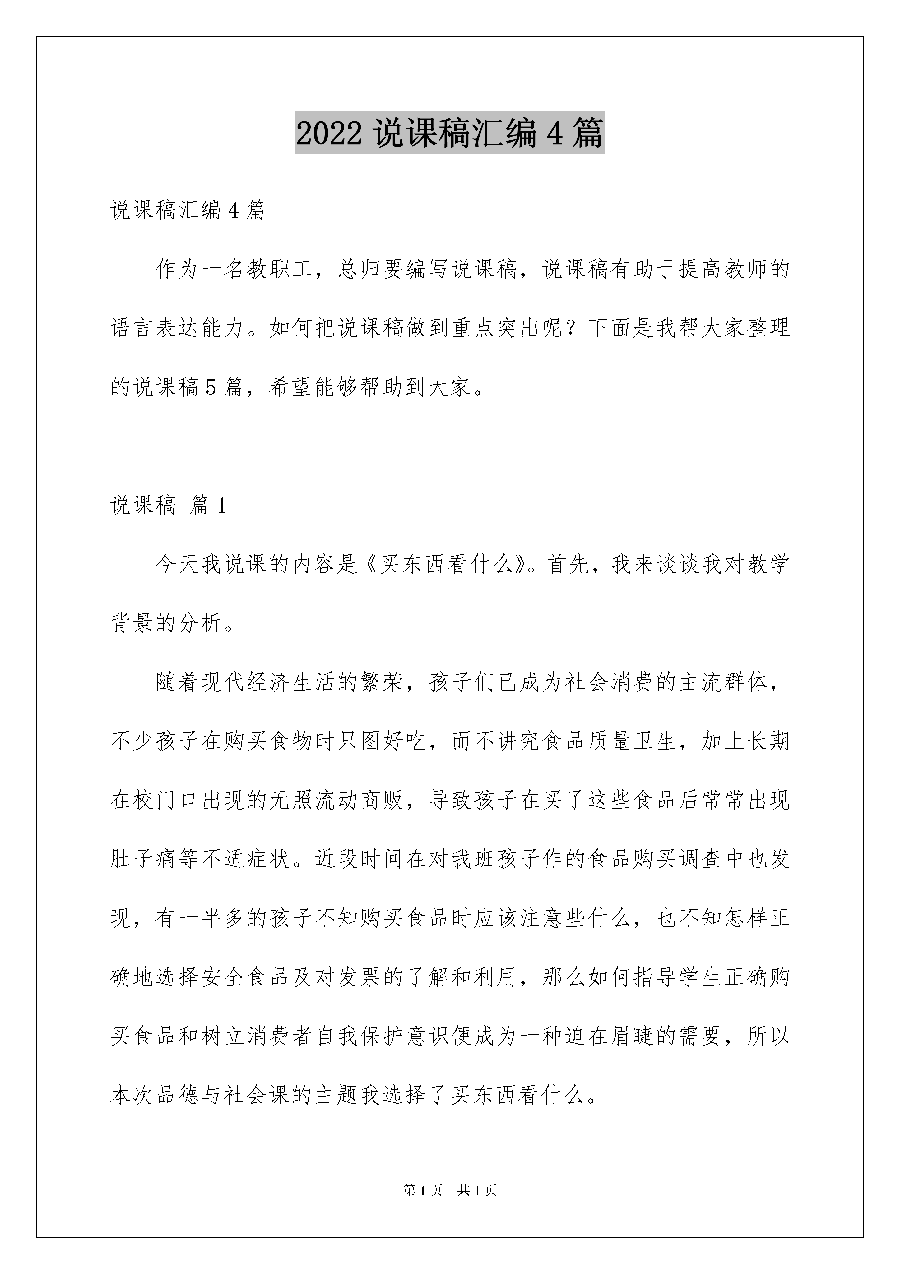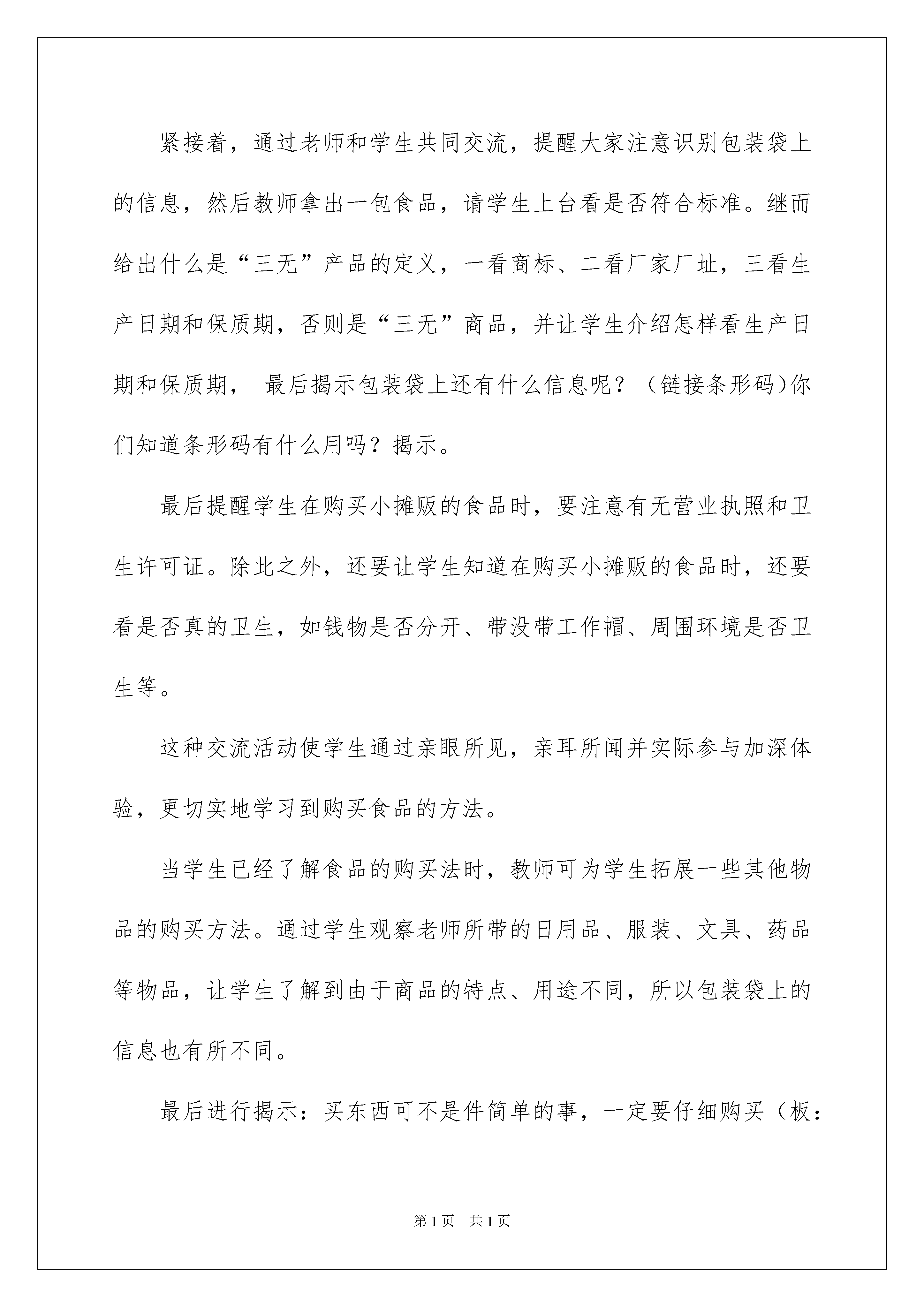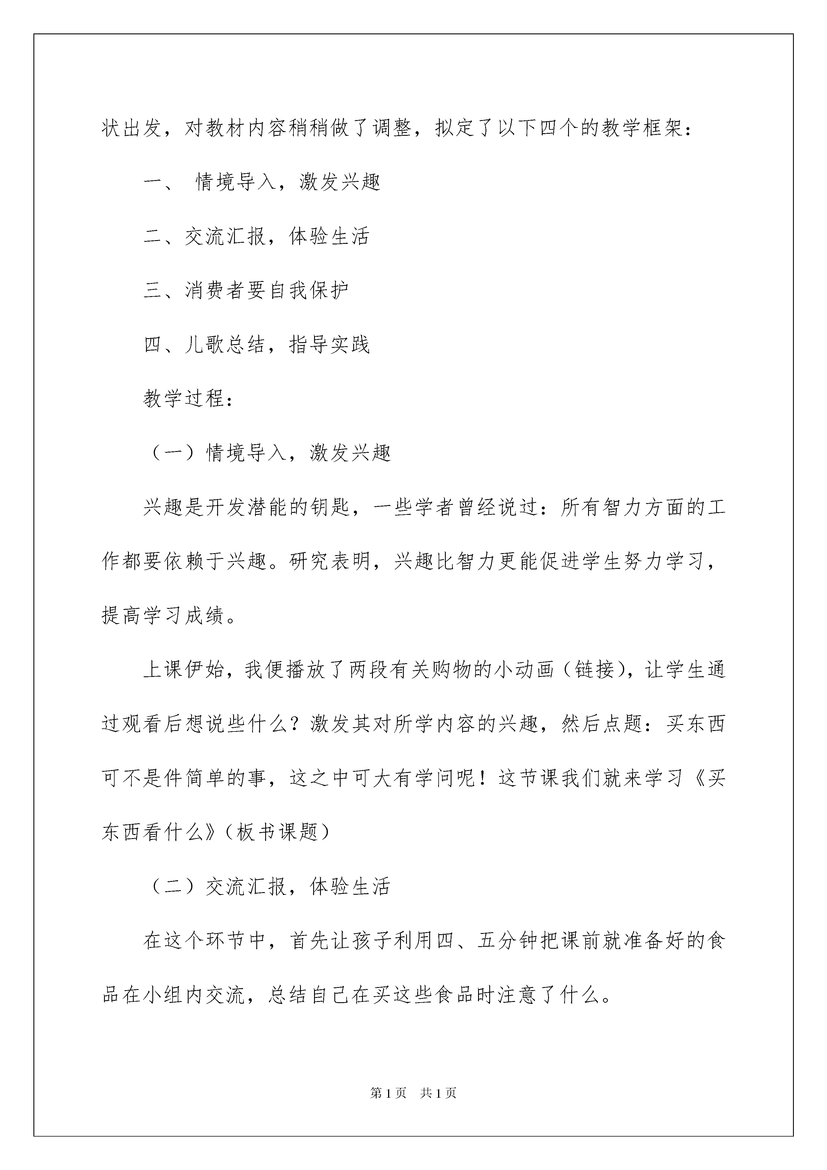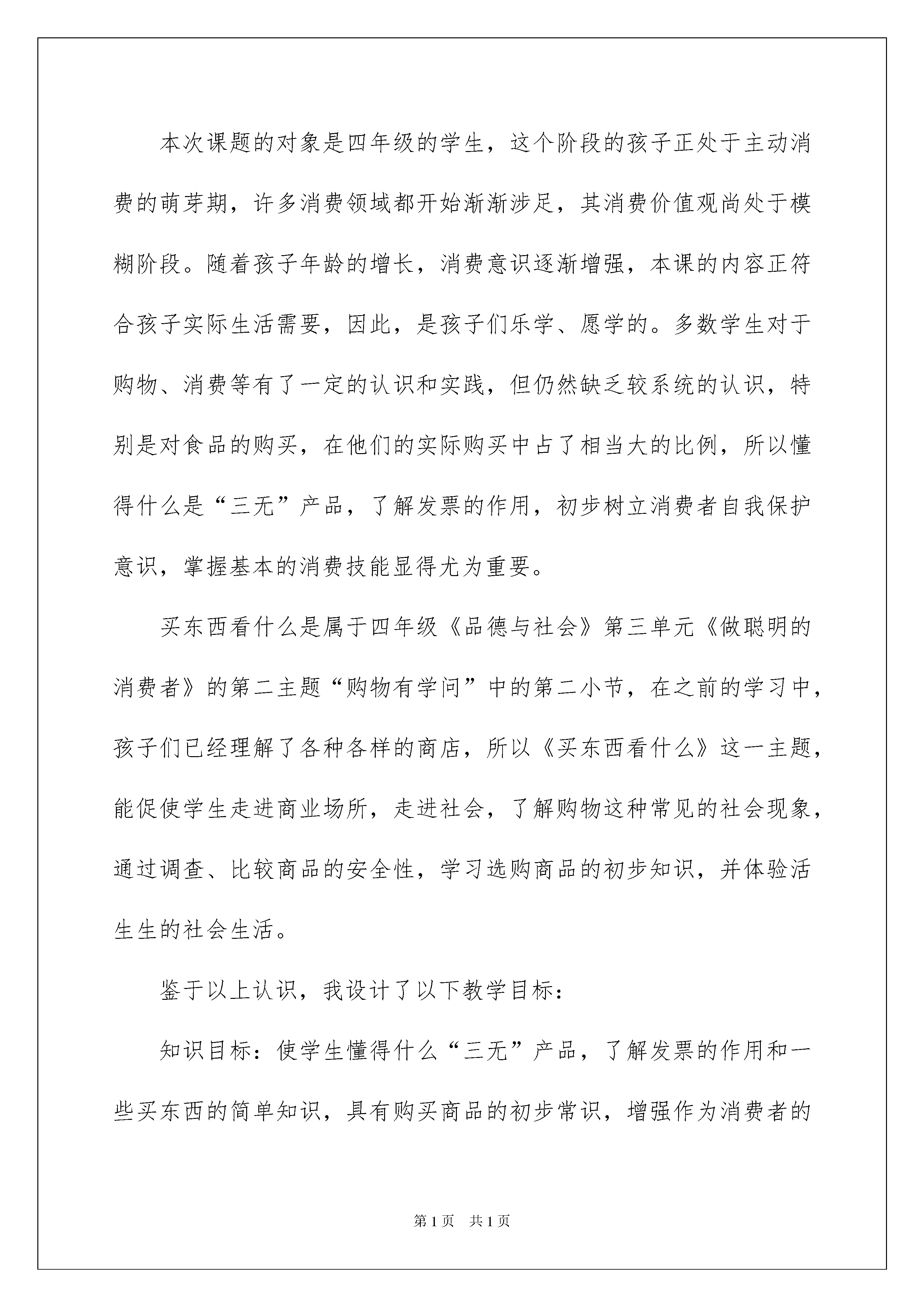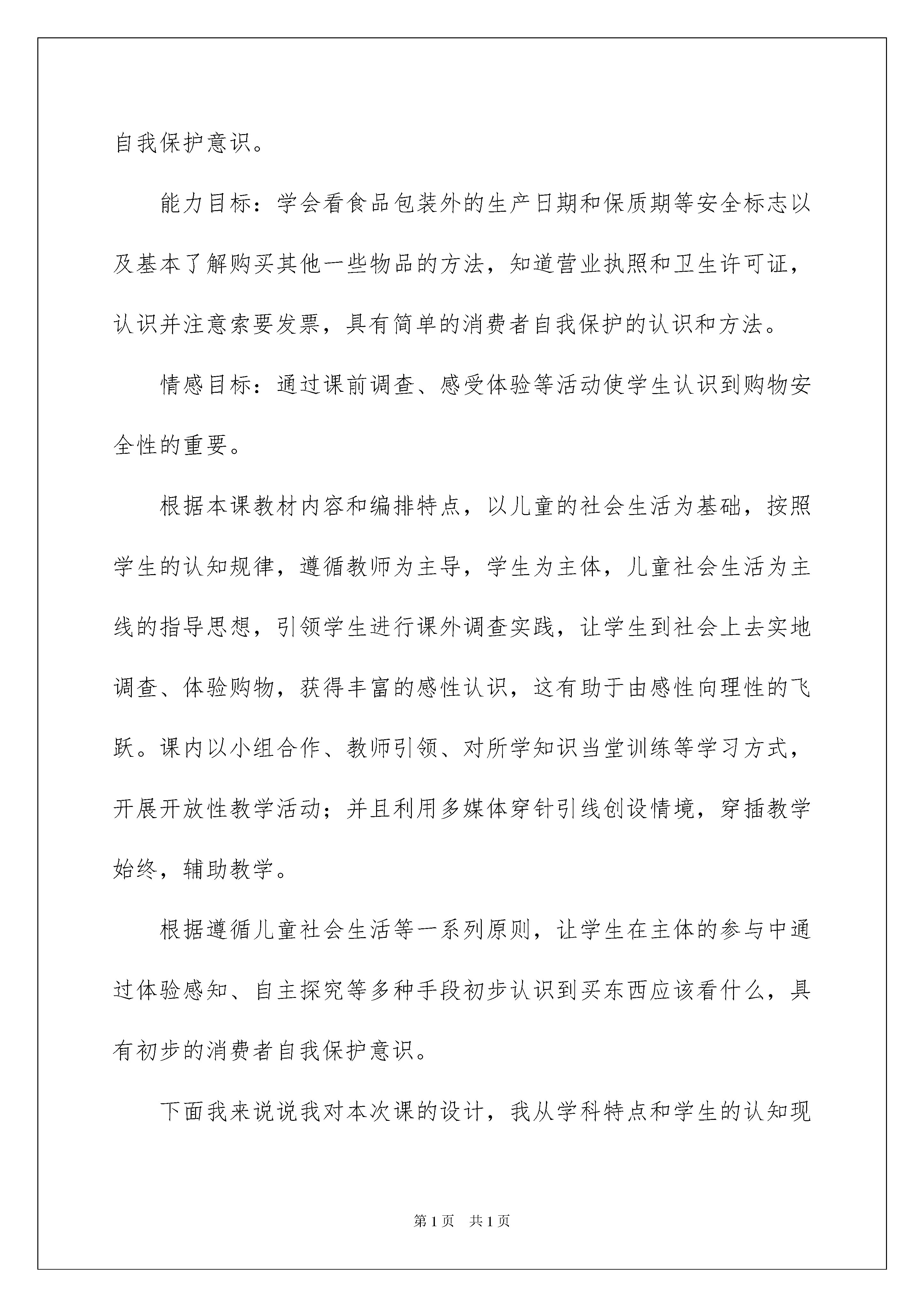 2022说课稿汇编4篇说课稿汇编4篇作为一名教职工,总归要编写说课稿,说课稿有助于提高教师的语言表达能力。如何把说课稿做到重点突出呢?下面是我帮大家整理的说课稿5篇,希望能够帮助到大家。说课稿篇1今天我说课的内容是《买东西看什么》。首先,我来谈谈我对教学背景的分析。随着现代经济生活的繁荣,孩子们已成为社会消费的主流群体,不少孩子在购买食物时只图好吃,而不讲究食品质量卫生,加上长期在校门口出现的无照流动商贩,导致孩子在买了这些食品后常常出现肚子痛等不适症状。近段时间在对我班孩子作的食品购买调查中也发现,有一半多的孩子不知购买食品时应该注意些什么,也不知怎样正确地选择安全食品及对发票的了解和利用,那么如何指导学生正确购买食品和树立消费者自我保护意识便成为一种迫在眉睫的需要,所以本次品德与社会课的主题我选择了买东西看什么。本次课题的对象是四年级的学生,这个阶段的孩子正处于主动消费的萌芽期,许多消费领域都开始渐渐涉足,其消费价值观尚处于模糊阶段。随着孩子年龄的增长,消费意识逐渐增强,本课的内容正符合孩子实际生活需要,因此,是孩子们乐学、愿学的。多数学生对于购物、消费等有了一定的认识和实践,但仍然缺乏较系统的认识,特别是对食品的购买,在他们的实际购买中占了相当大的比例,所以懂得什么是“三无”产品,了解发票的作用,初步树立消费者自我保护意识,掌握基本的消费技能显得尤为重要。买东西看什么是属于四年级《品德与社会》第三单元《做聪明的消费者》的第二主题“购物有学问”中的第二小节,在之前的学习中,孩子们已经理解了各种各样的商店,所以《买东西看什么》这一主题,能促使学生走进商业场所,走进社会,了解购物这种常见的社会现象,通过调查、比较商品的安全性,学习选购商品的初步知识,并体验活生生的社会生活。鉴于以上认识,我设计了以下教学目标:知识目标:使学生懂得什么“三无”产品,了解发票的作用和一些买东西的简单知识,具有购买商品的初步常识,增强作为消费者的自我保护意识。能力目标:学会看食品包装外的生产日期和保质期等安全标志以及基本了解购买其他一些物品的方法,知道营业执照和卫生许可证,认识并注意索要发票,具有简单的消费者自我保护的认识和方法。情感目标:通过课前调查、感受体验等活动使学生认识到购物安全性的重要。根据本课教材内容和编排特点,以儿童的社会生活为基础,按照学生的认知规律,遵循教师为主导,学生为主体,儿童社会生活为主线的指导思想,引领学生进行课外调查实践,让学生到社会上去实地调查、体验购物,获得丰富的感性认识,这有助于由感性向理性的飞跃。课内以小组合作、教师引领、对所学知识当堂训练等学习方式,开展开放性教学活动;并且利用多媒体穿针引线创设情境,穿插教学始终,辅助教学。根据遵循儿童社会生活等一系列原则,让学生在主体的参与中通过体验感知、自主探究等多种手段初步认识到买东西应该看什么,具有初步的消费者自我保护意识。下面我来说说我对本次课的设计,我从学科特点和学生的认知现状出发,对教材内容稍稍做了调整,拟定了以下四个的教学框架:一、情境导入,激发兴趣二、交流汇报,体验生活三、消费者要自我保护四、儿歌总结,指导实践教学过程:(一)情境导入,激发兴趣兴趣是开发潜能的钥匙,一些学者曾经说过:所有智力方面的工作都要依赖于兴趣。研究表明,兴趣比智力更能促进学生努力学习,提高学习成绩。上课伊始,我便播放了两段有关购物的小动画(链接),让学生通过观看后想说些什么?激发其对所学内容的兴趣,然后点题:买东西可不是件简单的事,这之中可大有学问呢!这节课我们就来学习《买东西看什么》(板书课题)(二)交流汇报,体验生活在这个环节中,首先让孩子利用四、五分钟把课前就准备好的食品在小组内交流,总结自己在买这些食品时注意了什么。紧接着,通过老师和学生共同交流,提醒大家注意识别包装袋上的信息,然后教师拿出一包食品,请学生上台看是否符合标准。继而给出什么是“三无”产品的定义,一看商标、二看厂家厂址,三看生产日期和保质期,否则是“三无”商品,并让学生介绍怎样看生产日期和保质期,最后揭示包装袋上还有什么信息呢?(链接条形码)你们知道条形码有什么用吗?揭示。最后提醒学生在购买小摊贩的食品时,要注意有无营业执照和卫生许可证。除此之外,还要让学生知道在购买小摊贩的食品时,还要看是否真的卫生,如钱物是否分开、带没带工作帽、周围环境是否卫生等。这种交流活动使学生通过亲眼所见,亲耳所闻并实际参与加深体验,更切实地学习到购买食品的方法。当学生已经了解食品的购买法时,教师可为学生拓展一些其他物品的购买方法。通过学生观察老师所带的日用品、服装、文具、药品等物品,让