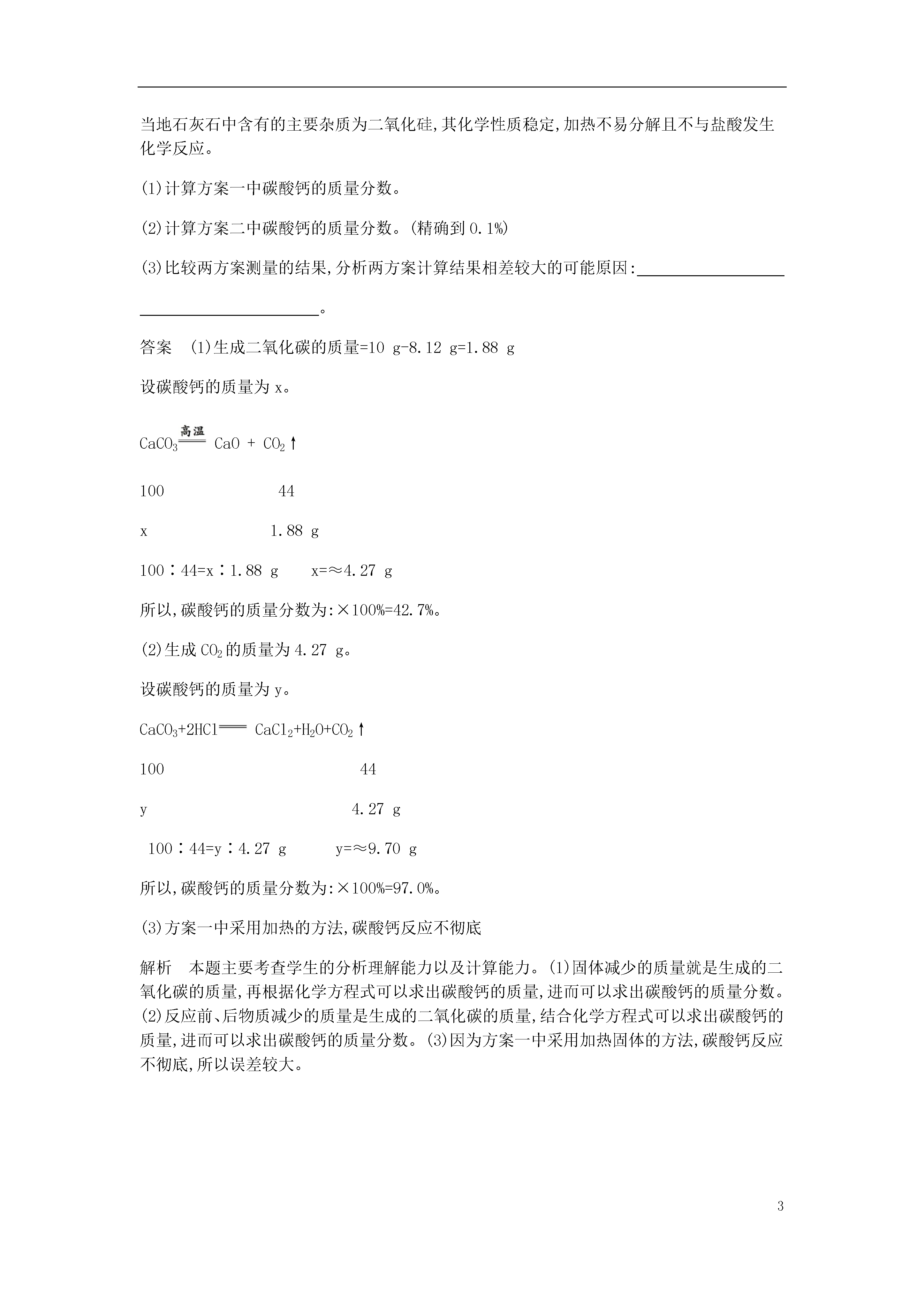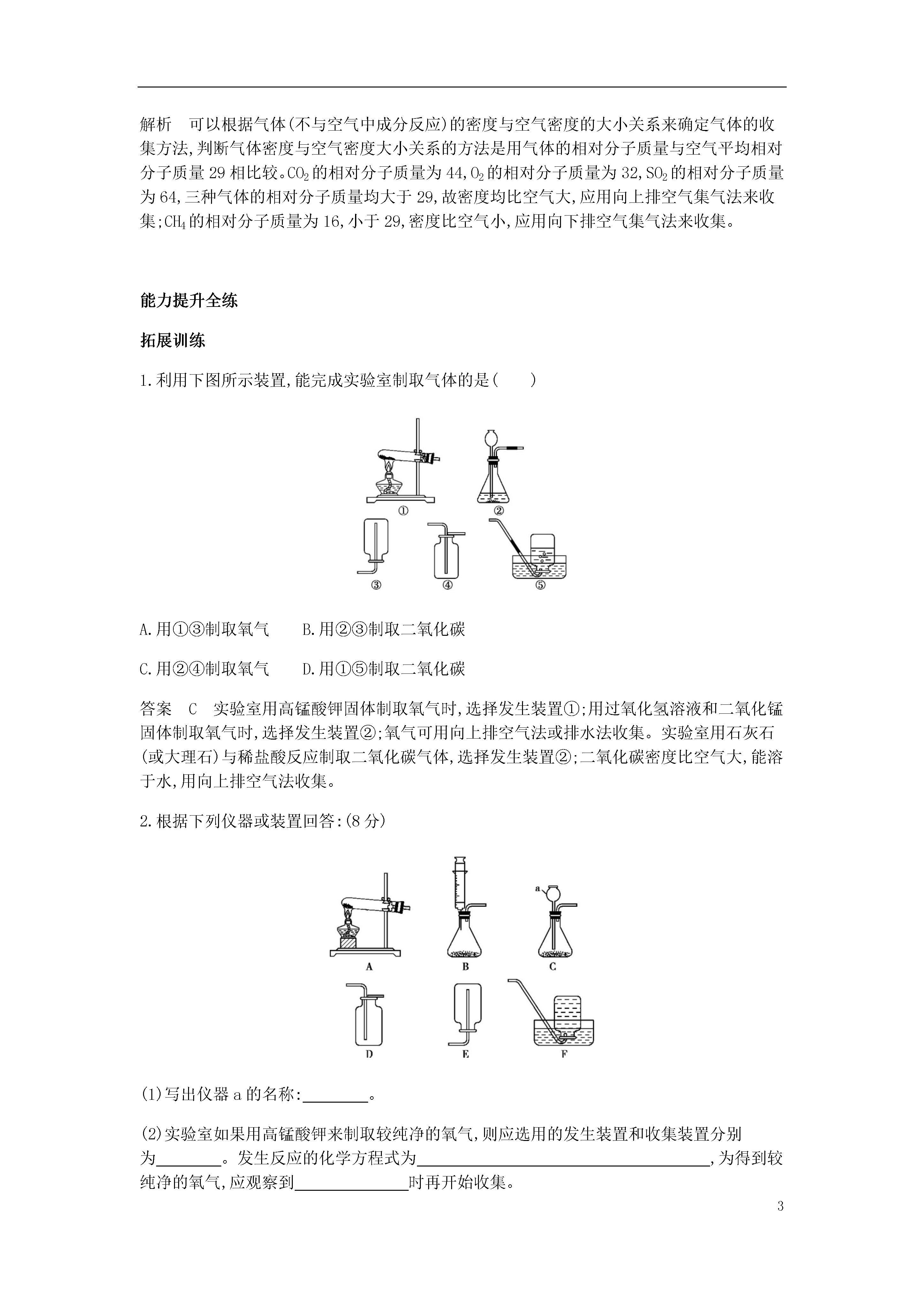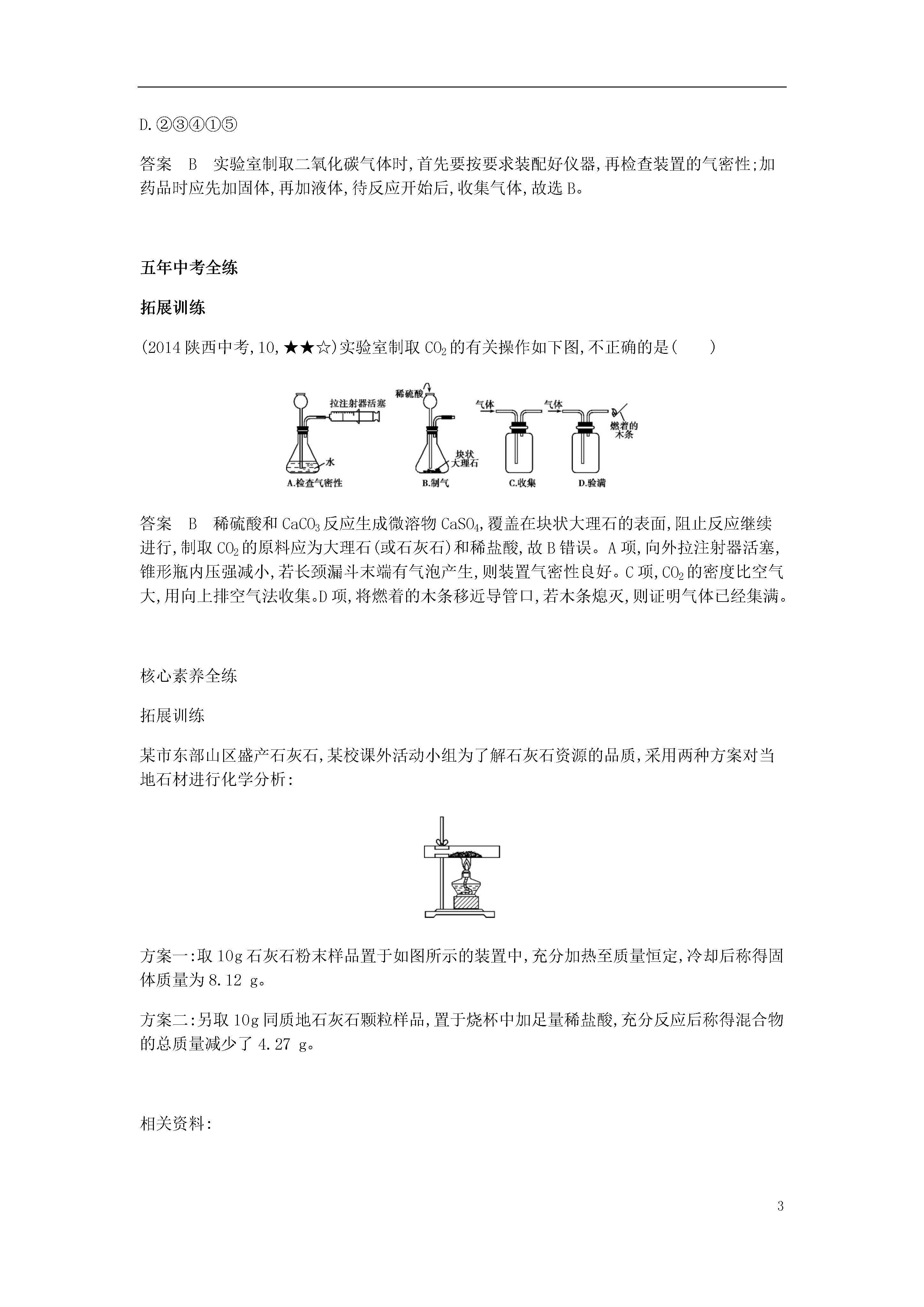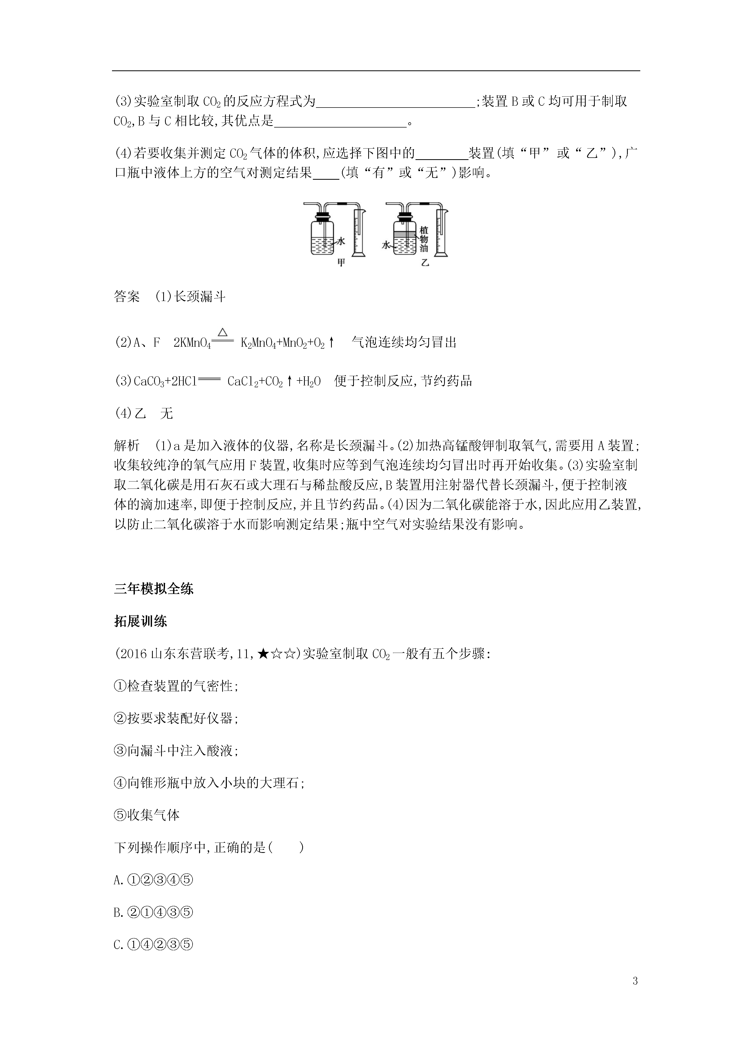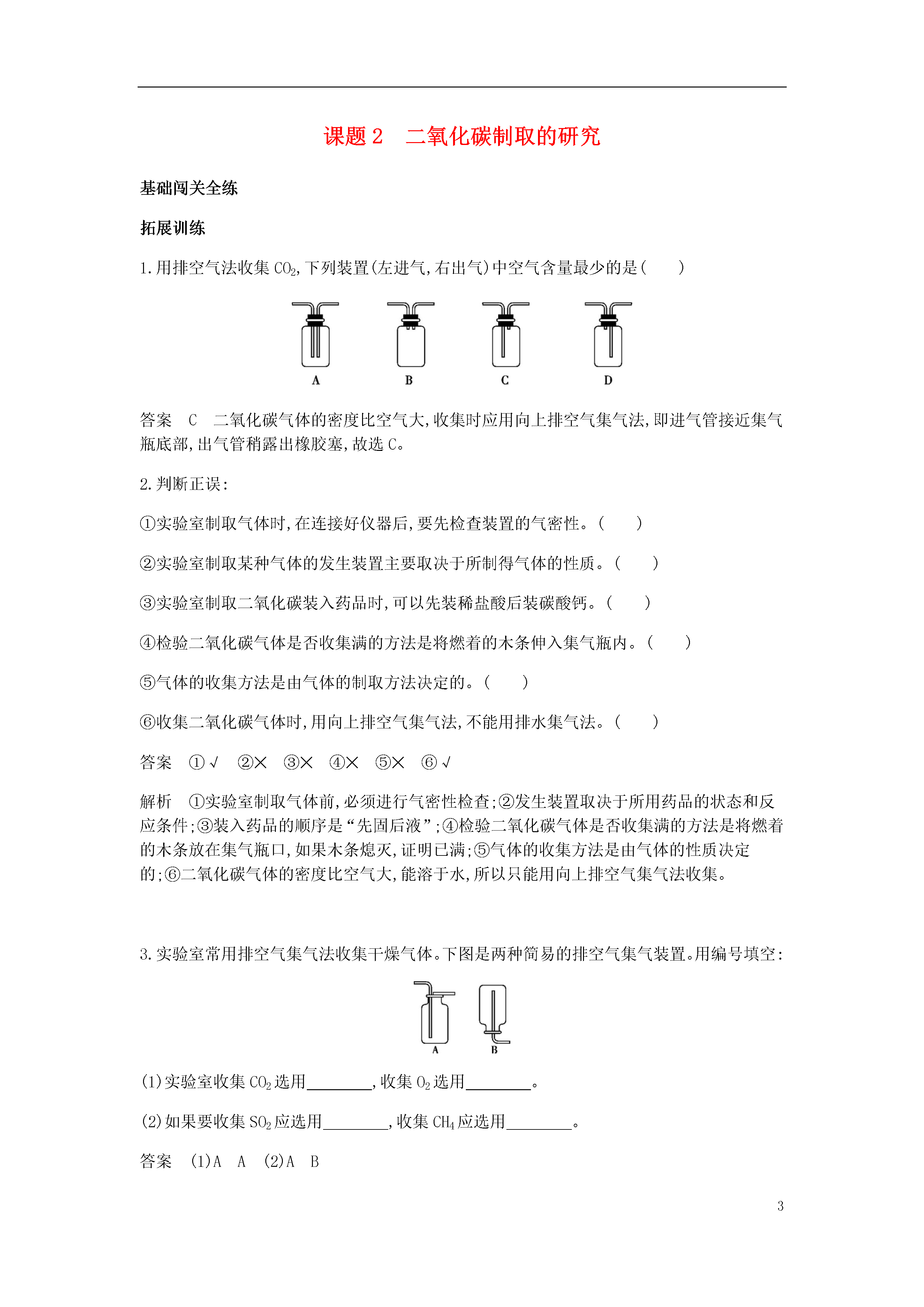 3课题2二氧化碳制取的研究基础闯关全练拓展训练1.用排空气法收集CO2,下列装置(左进气,右出气)中空气含量最少的是()答案C二氧化碳气体的密度比空气大,收集时应用向上排空气集气法,即进气管接近集气瓶底部,出气管稍露出橡胶塞,故选C。2.判断正误:①实验室制取气体时,在连接好仪器后,要先检查装置的气密性。()②实验室制取某种气体的发生装置主要取决于所制得气体的性质。()③实验室制取二氧化碳装入药品时,可以先装稀盐酸后装碳酸钙。()④检验二氧化碳气体是否收集满的方法是将燃着的木条伸入集气瓶内。()⑤气体的收集方法是由气体的制取方法决定的。()⑥收集二氧化碳气体时,用向上排空气集气法,不能用排水集气法。()答案①√②✕③✕④✕⑤✕⑥√解析①实验室制取气体前,必须进行气密性检查;②发生装置取决于所用药品的状态和反应条件;③装入药品的顺序是“先固后液”;④检验二氧化碳气体是否收集满的方法是将燃着的木条放在集气瓶口,如果木条熄灭,证明已满;⑤气体的收集方法是由气体的性质决定的;⑥二氧化碳气体的密度比空气大,能溶于水,所以只能用向上排空气集气法收集。3.实验室常用排空气集气法收集干燥气体。下图是两种简易的排空气集气装置。用编号填空:(1)实验室收集CO2选用,收集O2选用。(2)如果要收集SO2应选用,收集CH4应选用。答案(1)AA(2)AB解析可以根据气体(不与空气中成分反应)的密度与空气密度的大小关系来确定气体的收集方法,判断气体密度与空气密度大小关系的方法是用气体的相对分子质量与空气平均相对分子质量29相比较。CO2的相对分子质量为44,O2的相对分子质量为32,SO2的相对分子质量为64,三种气体的相对分子质量均大于29,故密度均比空气大,应用向上排空气集气法来收集;CH4的相对分子质量为16,小于29,密度比空气小,应用向下排空气集气法来收集。能力提升全练拓展训练1.利用下图所示装置,能完成实验室制取气体的是()A.用①③制取氧气B.用②③制取二氧化碳C.用②④制取氧气D.用①⑤制取二氧化碳答案C实验室用高锰酸钾固体制取氧气时,选择发生装置①;用过氧化氢溶液和二氧化锰固体制取氧气时,选择发生装置②;氧气可用向上排空气法或排水法收集。实验室用石灰石(或大理石)与稀盐酸反应制取二氧化碳气体,选择发生装置②;二氧化碳密度比空气大,能溶于水,用向上排空气法收集。2.根据下列仪器或装置回答:(8分)(1)写出仪器a的名称:。(2)实验室如果用高锰酸钾来制取较纯净的氧气,则应选用的发生装置和收集装置分别为。发生反应的化学方程式为,为得到较纯净的氧气,应观察到时再开始收集。(3)实验室制取CO2的反应方程式为;装置B或C均可用于制取CO2,B与C相比较,其优点是。(4)若要收集并测定CO2气体的体积,应选择下图中的装置(填“甲”或“乙”),广口瓶中液体上方的空气对测定结果(填“有”或“无”)影响。答案(1)长颈漏斗(2)A、F2KMnO4K2MnO4+MnO2+O2↑气泡连续均匀冒出(3)CaCO3+2HClCaCl2+CO2↑+H2O便于控制反应,节约药品(4)乙无解析(1)a是加入液体的仪器,名称是长颈漏斗。(2)加热高锰酸钾制取氧气,需要用A装置;收集较纯净的氧气应用F装置,收集时应等到气泡连续均匀冒出时再开始收集。(3)实验室制取二氧化碳是用石灰石或大理石与稀盐酸反应,B装置用注射器代替长颈漏斗,便于控制液体的滴加速率,即便于控制反应,并且节约药品。(4)因为二氧化碳能溶于水,因此应用乙装置,以防止二氧化碳溶于水而影响测定结果;瓶中空气对实验结果没有影响。三年模拟全练拓展训练(2016山东东营联考,11,★☆☆)实验室制取CO2一般有五个步骤:①检查装置的气密性;②按要求装配好仪器;③向漏斗中注入酸液;④向锥形瓶中放入小块的大理石;⑤收集气体下列操作顺序中,正确的是()A.①②③④⑤B.②①④③⑤C.①④②③⑤D.②③④①⑤答案B实验室制取二氧化碳气体时,首先要按要求装配好仪器,再检查装置的气密性;加药品时应先加固体,再加液体,待反应开始后,收集气体,故选B。五年中考全练拓展训练(2014陕西中考,10,★★☆)实验室制取CO2的有关操作如下图,不正确的是()答案B稀硫酸和CaCO3反应生成微溶物CaSO4,覆盖在块状大理石的表面,阻止反应继续进行,制取CO2的原料应为大理石(或石灰石)和稀盐酸,故B错误。A项,向外拉注射器活塞,锥形瓶内压强减小,若长颈漏斗末端有气泡产生,则装置气密性良好。C项,CO2的密度比空气大,用向上排空气法收集。D项,将燃着的木条移近导管口,若木条熄灭,则证