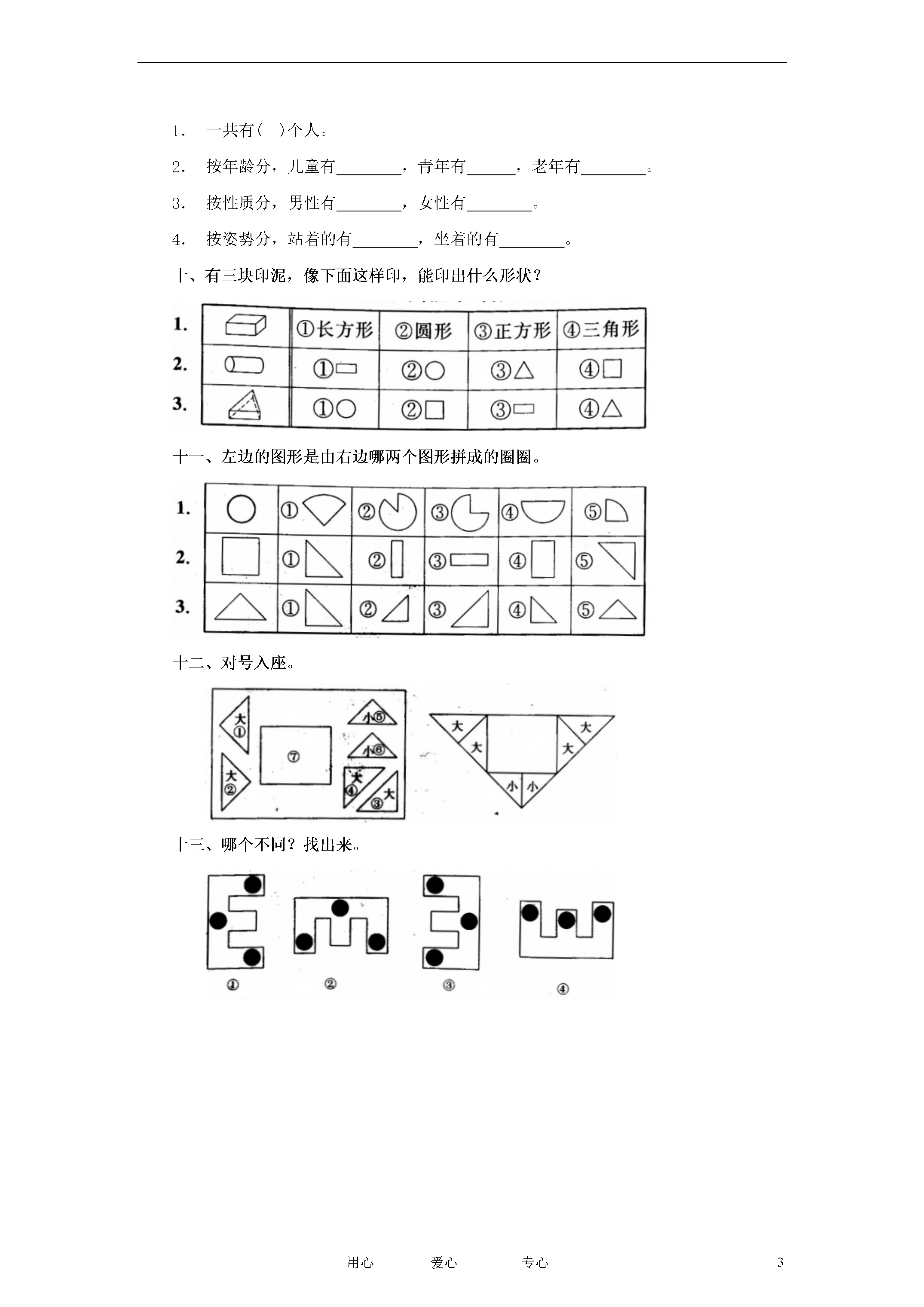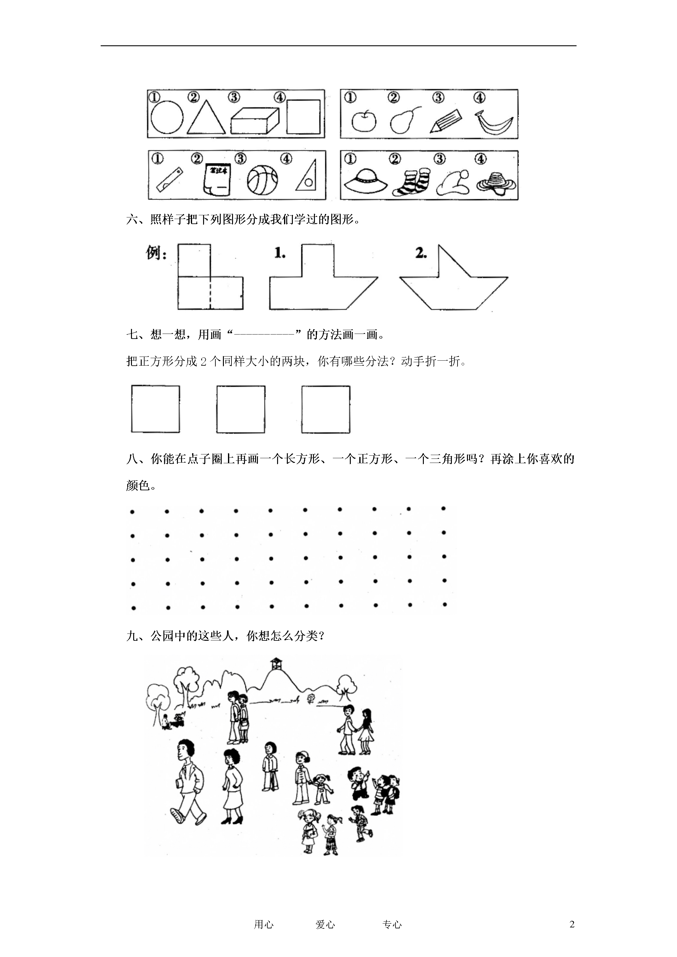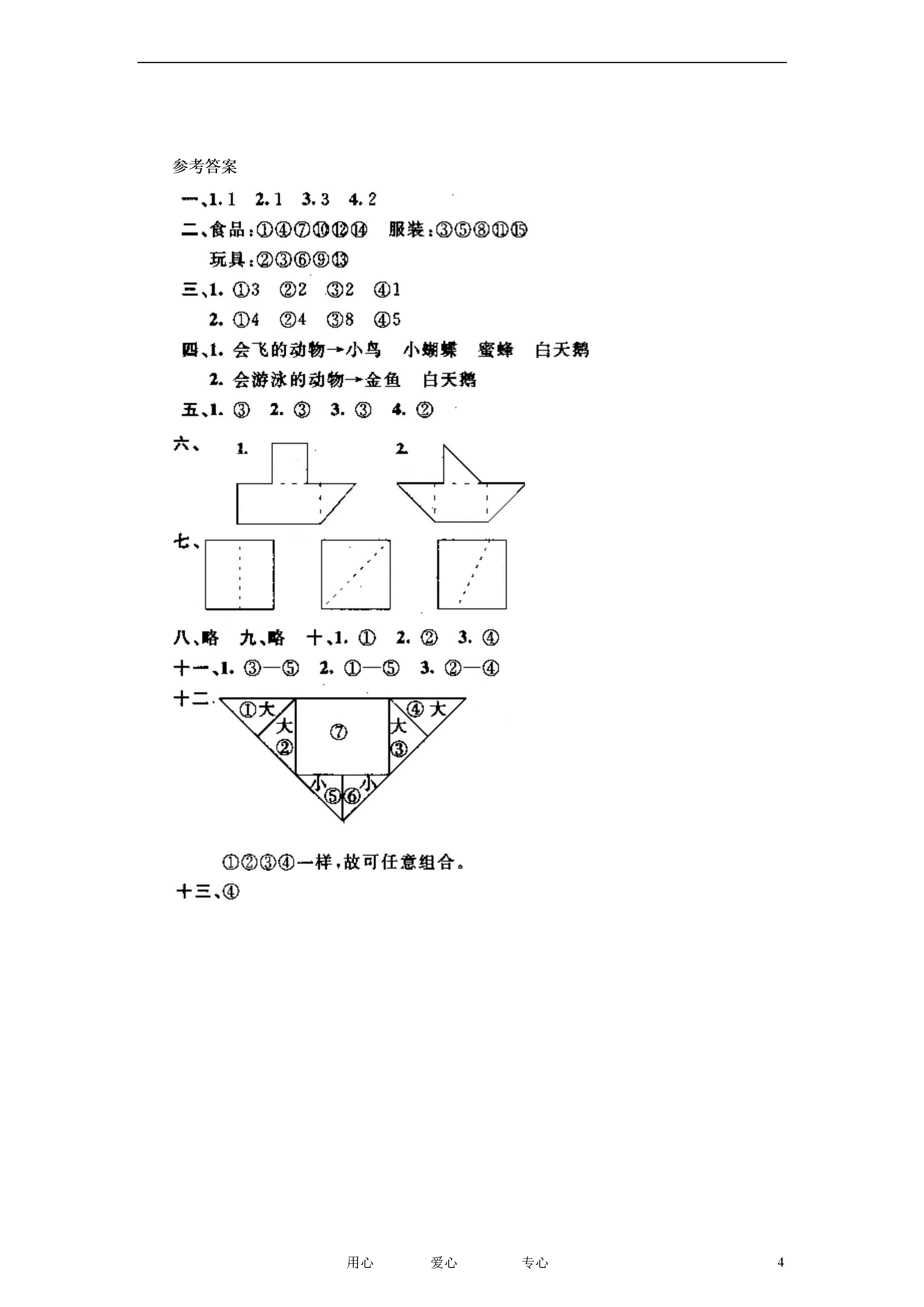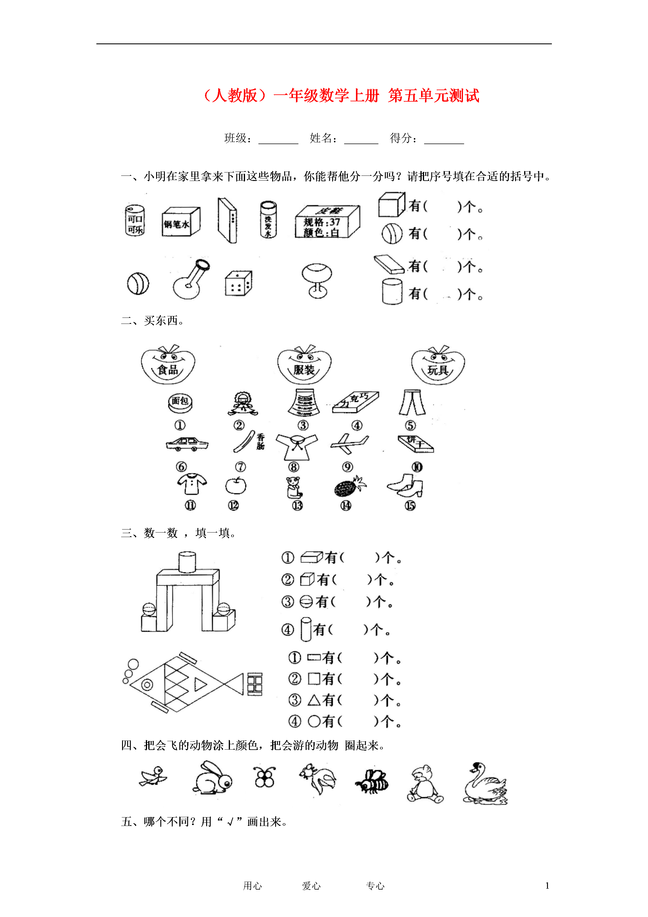 4用心爱心专心(人教版)一年级数学上册第五单元测试班级:姓名:得分:一、小明在家里拿来下面这些物品,你能帮他分一分吗?请把序号填在合适的括号中。二、买东西。三、数一数,填一填。四、把会飞的动物涂上颜色,把会游的动物圈起来。五、哪个不同?用“√”画出来。六、照样子把下列图形分成我们学过的图形。七、想一想,用画“----------”的方法画一画。把正方形分成2个同样大小的两块,你有哪些分法?动手折一折。八、你能在点子圈上再画一个长方形、一个正方形、一个三角形吗?再涂上你喜欢的颜色。九、公园中的这些人,你想怎么分类?一共有()个人。按年龄分,儿童有,青年有,老年有。按性质分,男性有,女性有。按姿势分,站着的有,坐着的有。十、有三块印泥,像下面这样印,能印出什么形状?十一、左边的图形是由右边哪两个图形拼成的圈圈。十二、对号入座。十三、哪个不同?找出来。参考答案