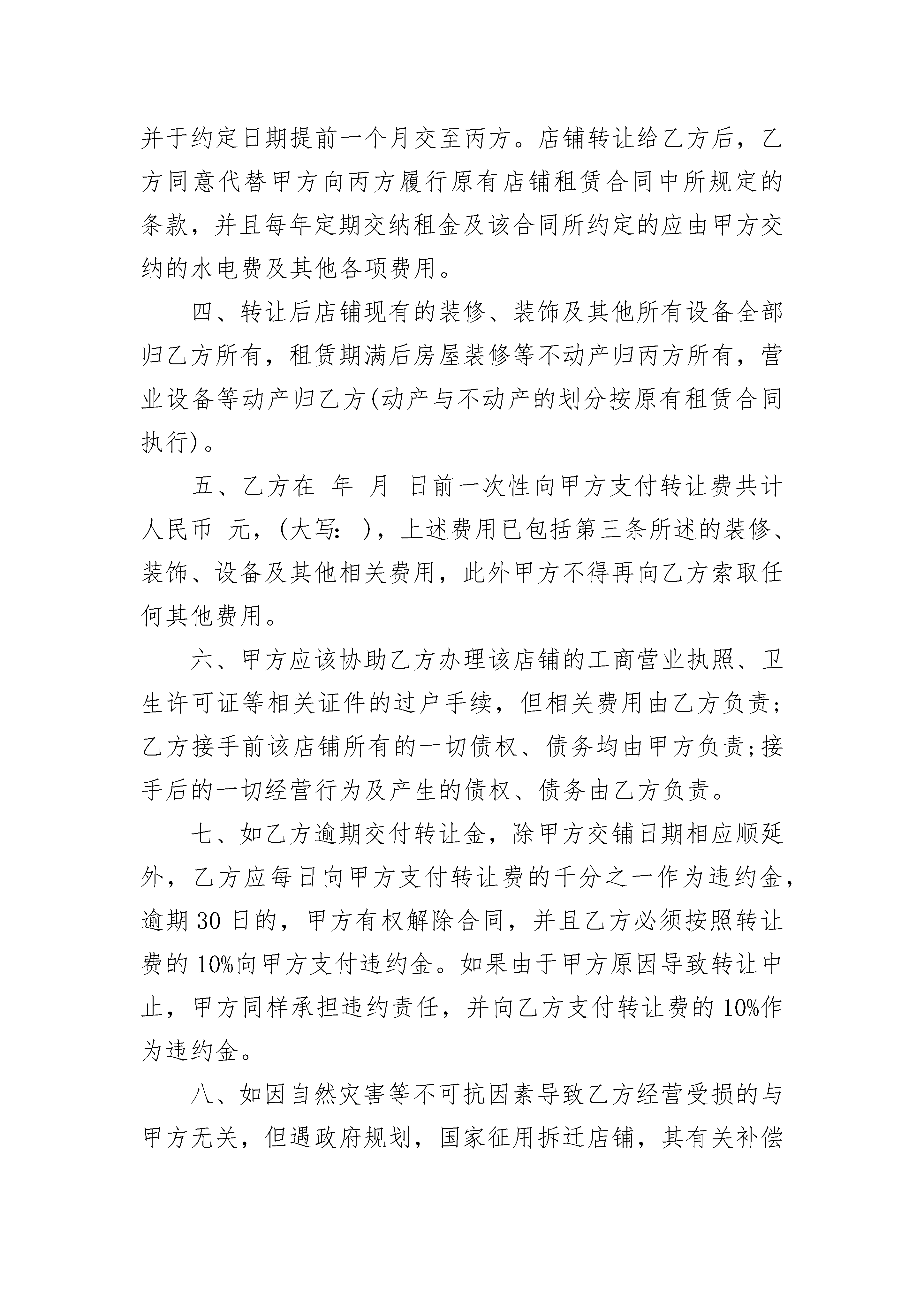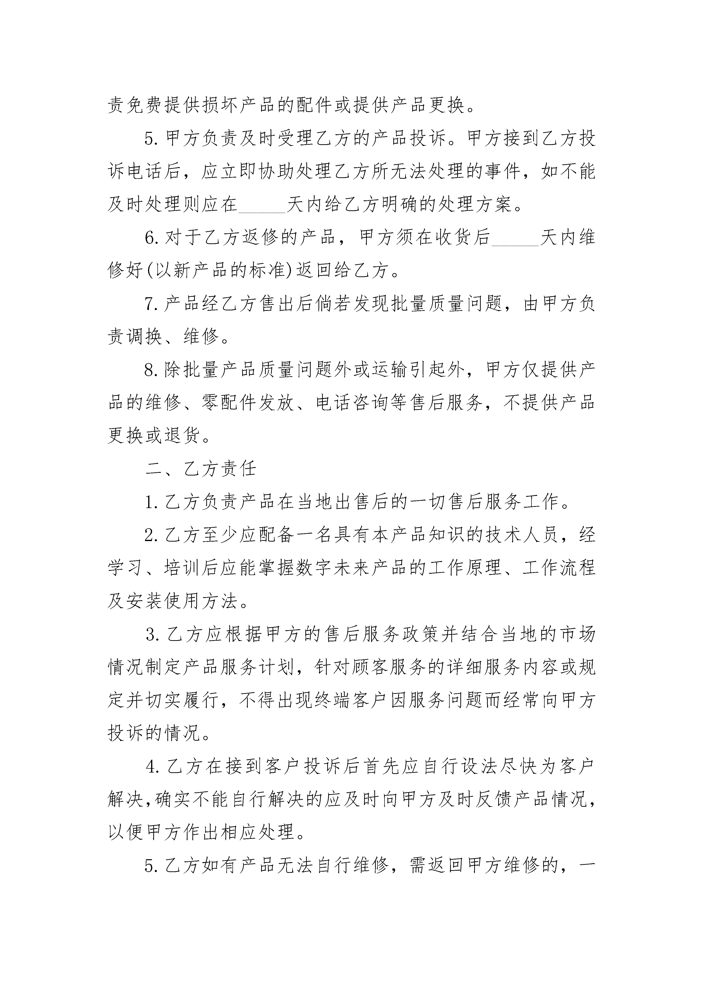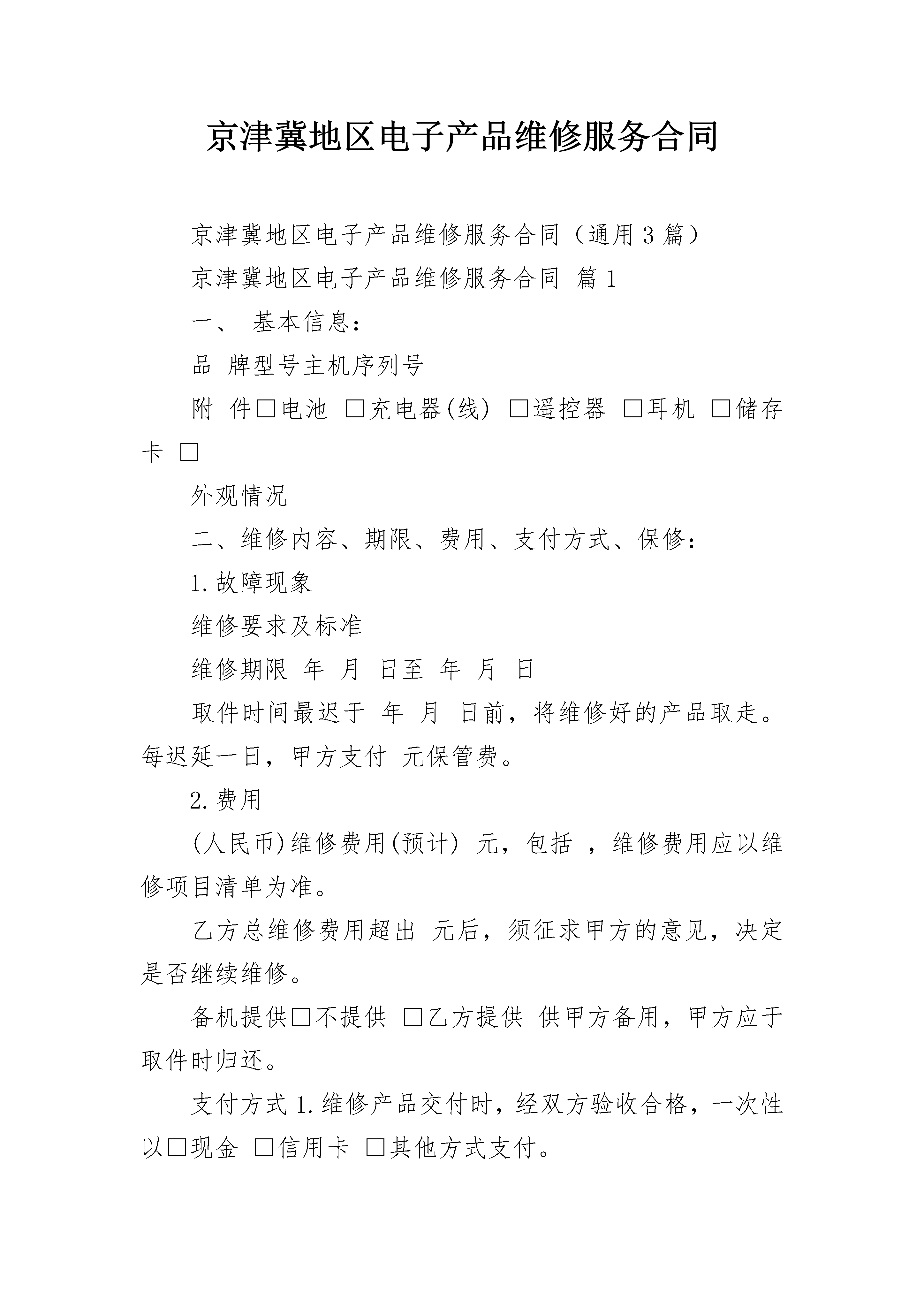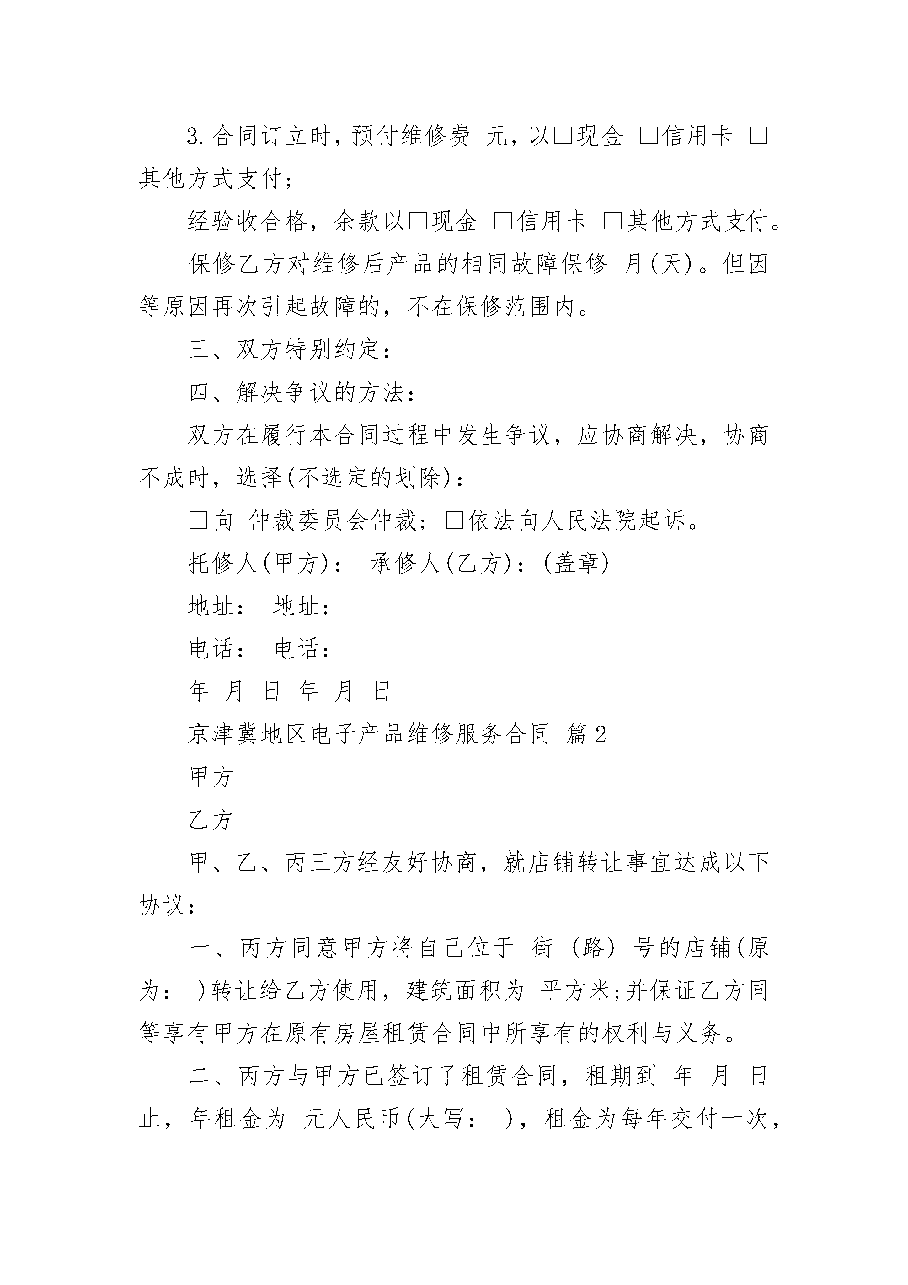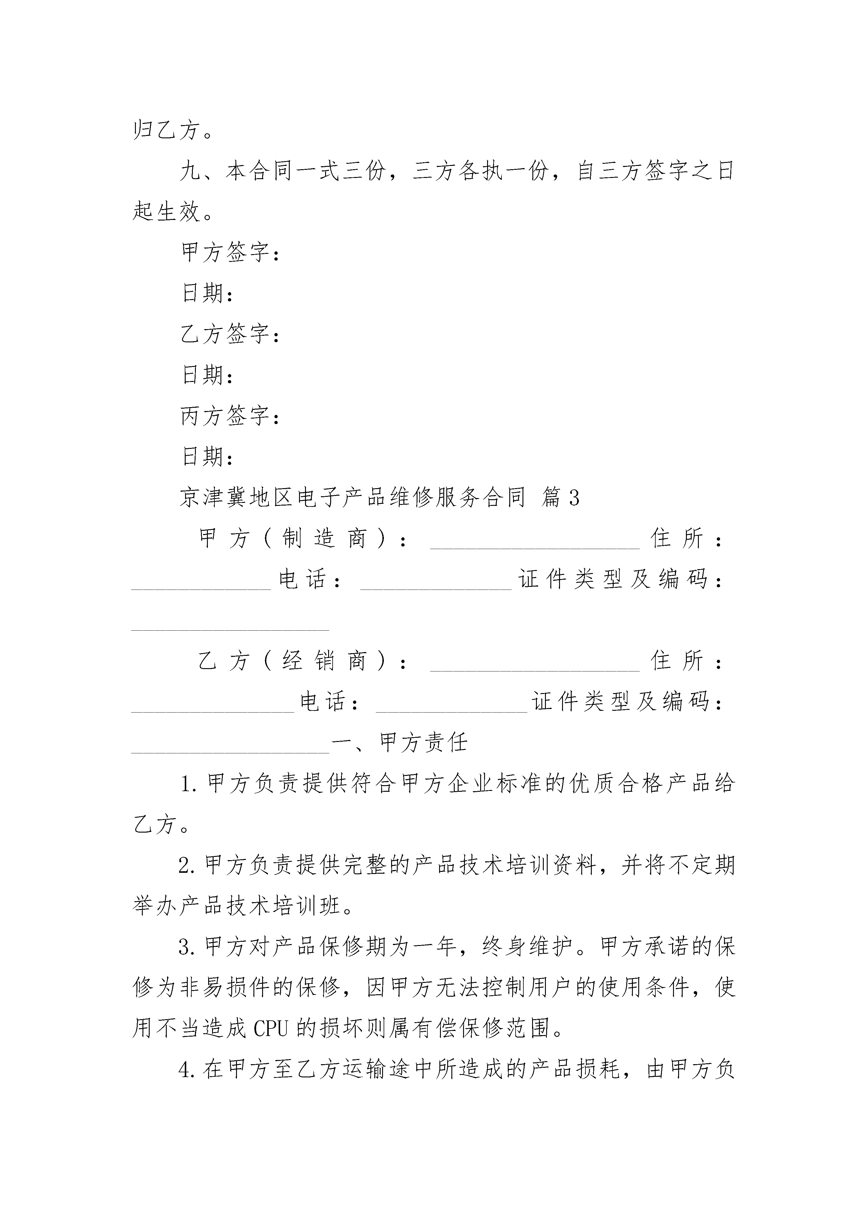 京津冀地区电子产品维修服务合同京津冀地区电子产品维修服务合同(通用3篇)京津冀地区电子产品维修服务合同篇1一、基本信息:品牌型号主机序列号附件□电池□充电器(线)□遥控器□耳机□储存卡□外观情况二、维修内容、期限、费用、支付方式、保修:1.故障现象维修要求及标准维修期限年月日至年月日取件时间最迟于年月日前,将维修好的产品取走。每迟延一日,甲方支付元保管费。2.费用(人民币)维修费用(预计)元,包括,维修费用应以维修项目清单为准。乙方总维修费用超出元后,须征求甲方的意见,决定是否继续维修。备机提供□不提供□乙方提供供甲方备用,甲方应于取件时归还。支付方式1.维修产品交付时,经双方验收合格,一次性以□现金□信用卡□其他方式支付。3.合同订立时,预付维修费元,以□现金□信用卡□其他方式支付;经验收合格,余款以□现金□信用卡□其他方式支付。保修乙方对维修后产品的相同故障保修月(天)。但因等原因再次引起故障的,不在保修范围内。三、双方特别约定:四、解决争议的方法:双方在履行本合同过程中发生争议,应协商解决,协商不成时,选择(不选定的划除):□向仲裁委员会仲裁;□依法向人民法院起诉。托修人(甲方):承修人(乙方):(盖章)地址:地址:电话:电话:年月日年月日京津冀地区电子产品维修服务合同篇2甲方乙方甲、乙、丙三方经友好协商,就店铺转让事宜达成以下协议:一、丙方同意甲方将自己位于街(路)号的店铺(原为:)转让给乙方使用,建筑面积为平方米;并保证乙方同等享有甲方在原有房屋租赁合同中所享有的权利与义务。二、丙方与甲方已签订了租赁合同,租期到年月日止,年租金为元人民币(大写:),租金为每年交付一次,并于约定日期提前一个月交至丙方。店铺转让给乙方后,乙方同意代替甲方向丙方履行原有店铺租赁合同中所规定的条款,并且每年定期交纳租金及该合同所约定的应由甲方交纳的水电费及其他各项费用。四、转让后店铺现有的装修、装饰及其他所有设备全部归乙方所有,租赁期满后房屋装修等不动产归丙方所有,营业设备等动产归乙方(动产与不动产的划分按原有租赁合同执行)。五、乙方在年月日前一次性向甲方支付转让费共计人民币元,(大写:),上述费用已包括第三条所述的装修、装饰、设备及其他相关费用,此外甲方不得再向乙方索取任何其他费用。六、甲方应该协助乙方办理该店铺的工商营业执照、卫生许可证等相关证件的过户手续,但相关费用由乙方负责;乙方接手前该店铺所有的一切债权、债务均由甲方负责;接手后的一切经营行为及产生的债权、债务由乙方负责。七、如乙方逾期交付转让金,除甲方交铺日期相应顺延外,乙方应每日向甲方支付转让费的千分之一作为违约金,逾期30日的,甲方有权解除合同,并且乙方必须按照转让费的10%向甲方支付违约金。如果由于甲方原因导致转让中止,甲方同样承担违约责任,并向乙方支付转让费的10%作为违约金。八、如因自然灾害等不可抗因素导致乙方经营受损的与甲方无关,但遇政府规划,国家征用拆迁店铺,其有关补偿归乙方。九、本合同一式三份,三方各执一份,自三方签字之日起生效。甲方签字:日期:乙方签字:日期:丙方签字:日期:京津冀地区电子产品维修服务合同篇3甲方(制造商):__________________住所:____________电话:_____________证件类型及编码:_________________乙方(经销商):__________________住所:______________电话:_____________证件类型及编码:_________________一、甲方责任1.甲方负责提供符合甲方企业标准的优质合格产品给乙方。2.甲方负责提供完整的产品技术培训资料,并将不定期举办产品技术培训班。3.甲方对产品保修期为一年,终身维护。甲方承诺的保修为非易损件的保修,因甲方无法控制用户的使用条件,使用不当造成CPU的损坏则属有偿保修范围。4.在甲方至乙方运输途中所造成的产品损耗,由甲方负责免费提供损坏产品的配件或提供产品更换。5.甲方负责及时受理乙方的产品投诉。甲方接到乙方投诉电话后,应立即协助处理乙方所无法处理的事件,如不能及时处理则应在_____天内给乙方明确的处理方案。6.对于乙方返修的产品,甲方须在收货后_____天内维修好(以新产品的标准)返回给乙方。7.产品经乙方售出后倘若发现批量质量问题,由甲方负责调换、维修。8.除批量产品质量问题外或运输引起外,甲方仅提供产品的维修、零配件发放、电话咨询等售后服务,不提供产品更换或退货。二、乙方责任1.乙方负责产品在当地出售后的一切售后服务工作。2.乙方至少应配备一名具有本产品知识的技术人员,经学习、培训后应能掌握数字未来产品的工作原理、工作流程及安装使用方法。3.乙方应根据甲方的售后服务政策并结合当地的市场情况制定产品服务计划,针对顾客服