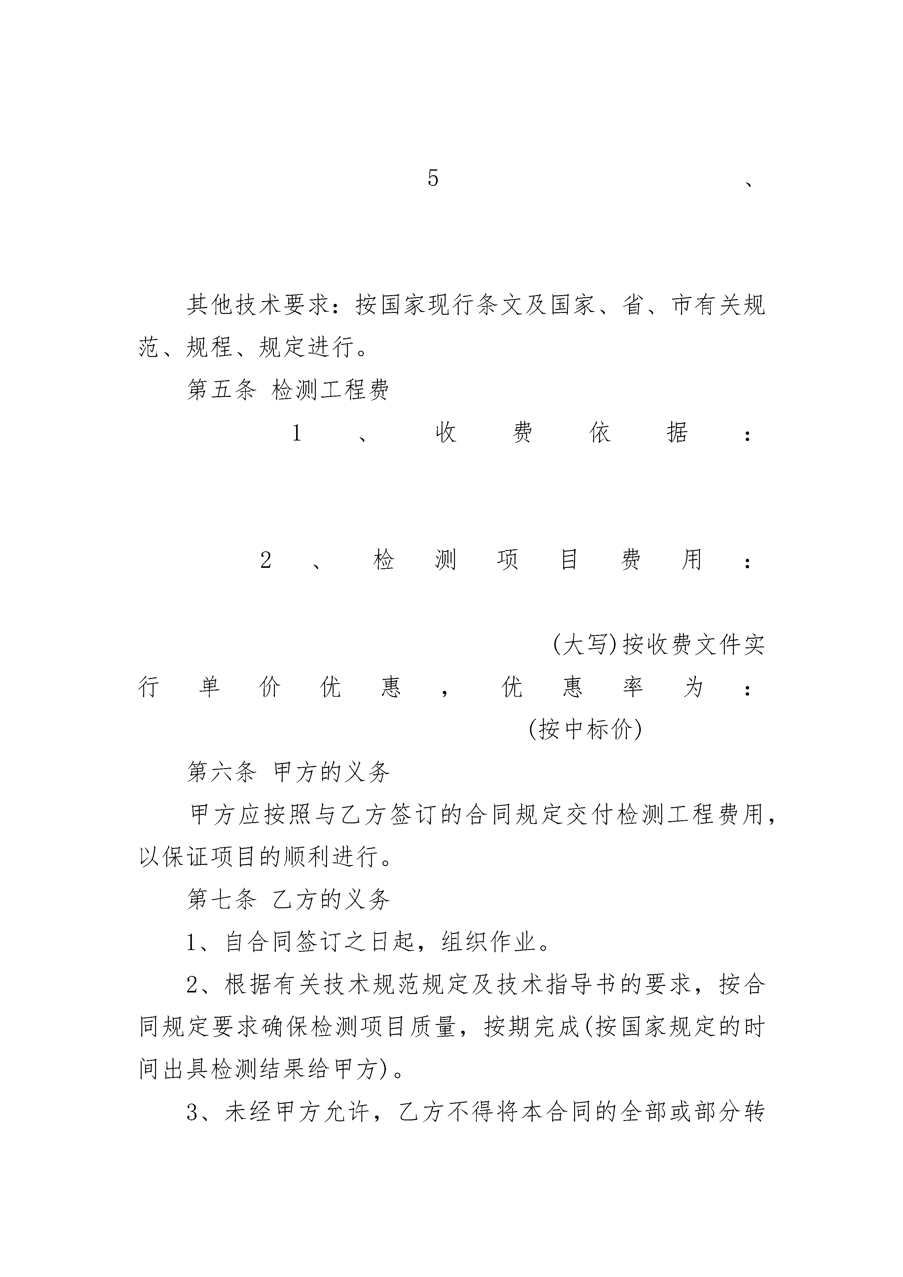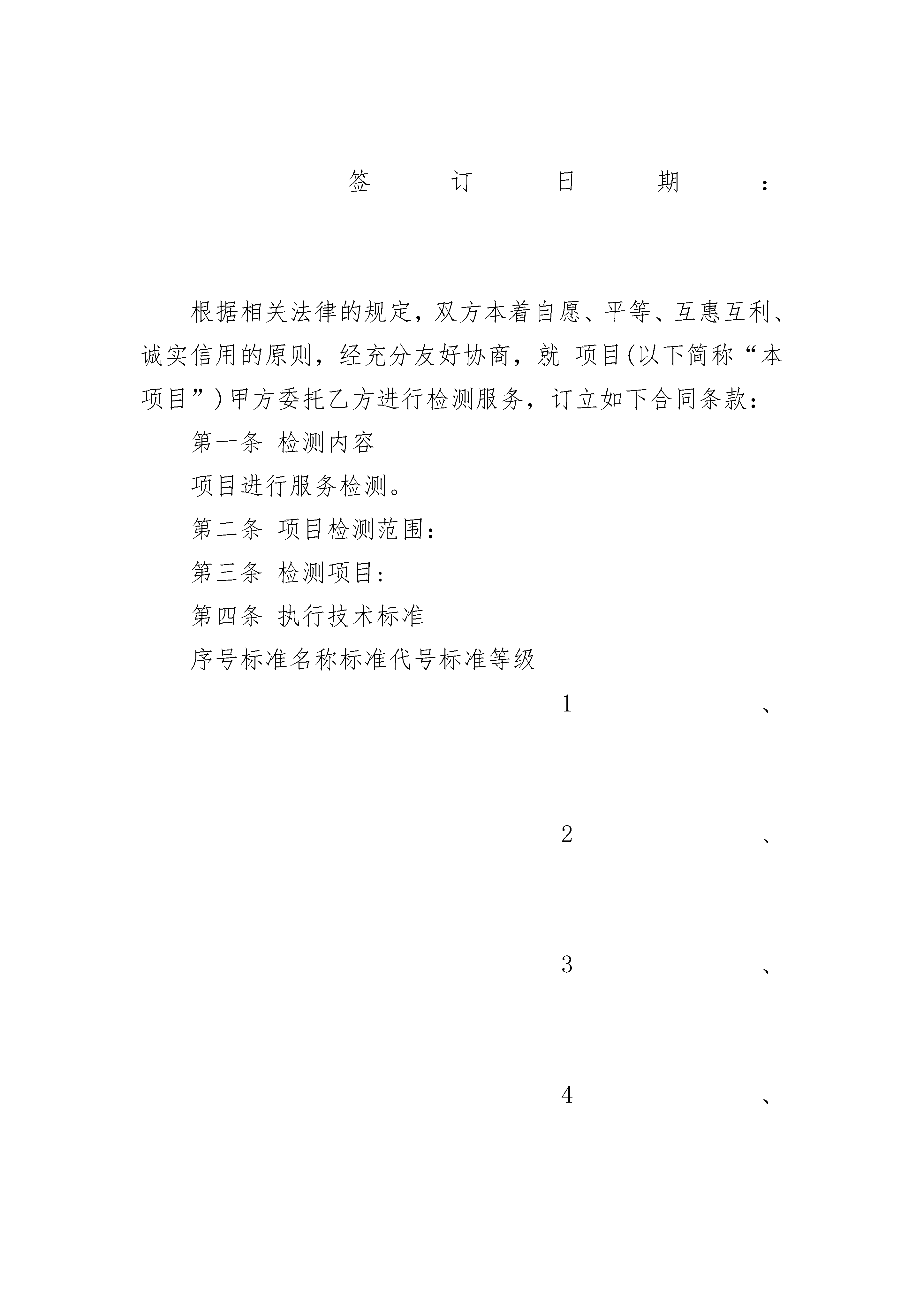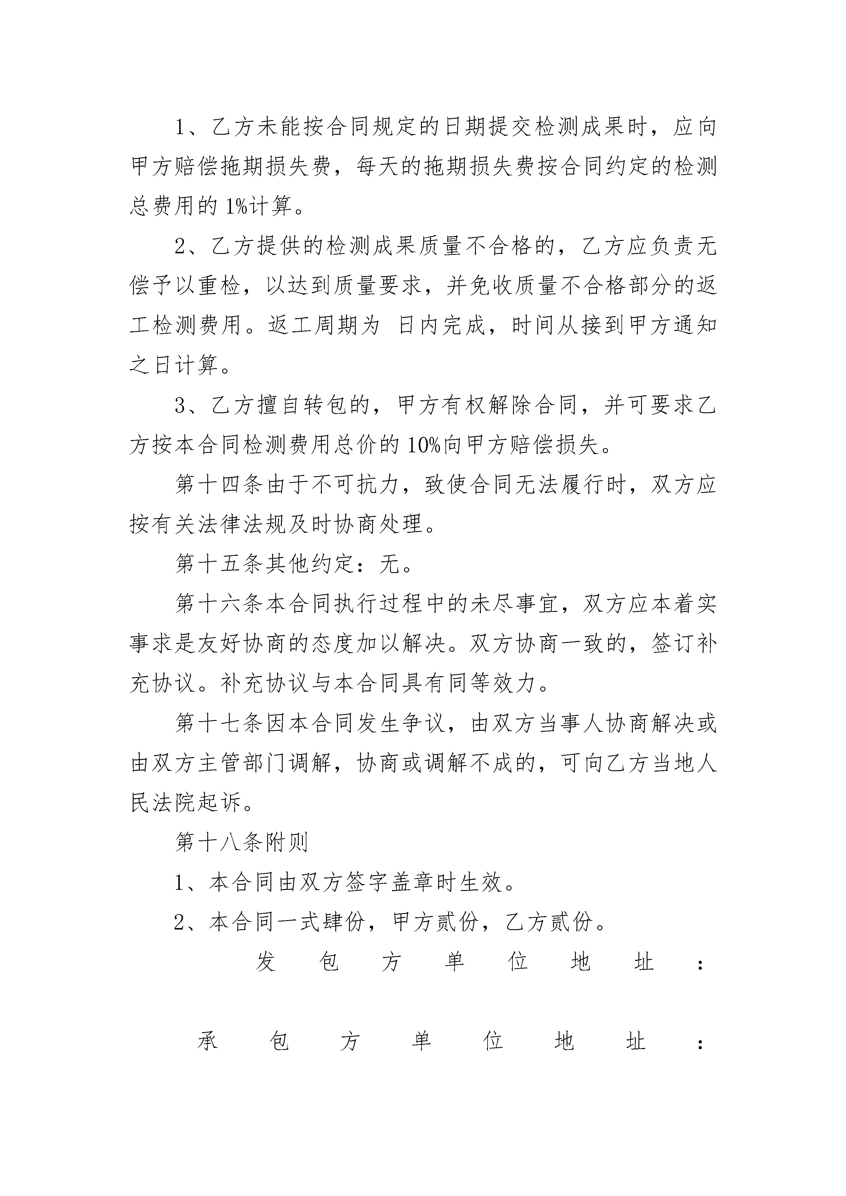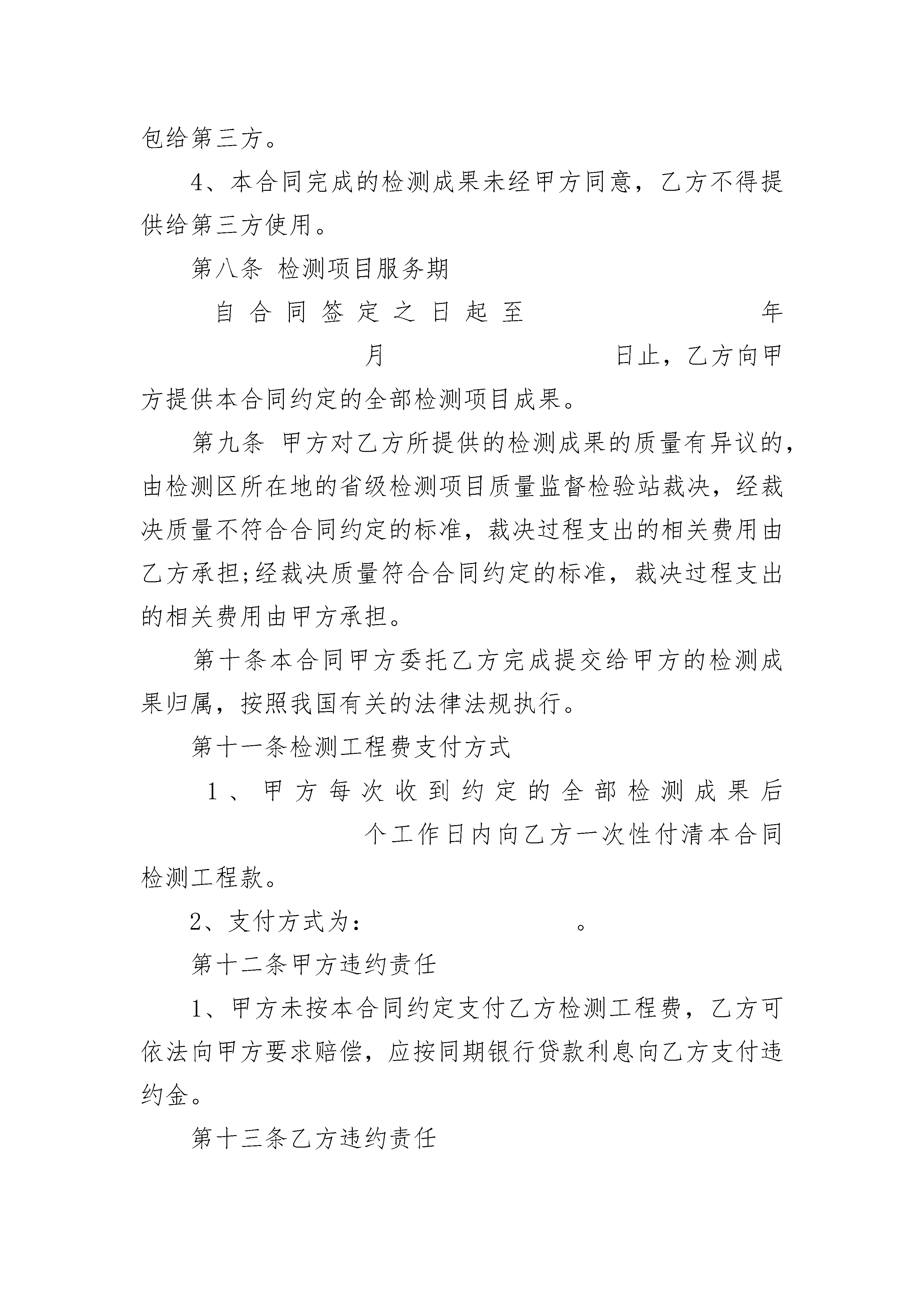 企业检查服务合同企业检查服务合同(精选3篇)企业检查服务合同篇1项目名称:项目编号:检测类别:委托单位:检测单位:委托单位(甲方):检测单位(乙方):签订日期:根据相关法律的规定,双方本着自愿、平等、互惠互利、诚实信用的原则,经充分友好协商,就项目(以下简称“本项目”)甲方委托乙方进行检测服务,订立如下合同条款:第一条检测内容项目进行服务检测。第二条项目检测范围:第三条检测项目:第四条执行技术标准序号标准名称标准代号标准等级1、2、3、4、5、其他技术要求:按国家现行条文及国家、省、市有关规范、规程、规定进行。第五条检测工程费1、收费依据:2、检测项目费用:(大写)按收费文件实行单价优惠,优惠率为:(按中标价)第六条甲方的义务甲方应按照与乙方签订的合同规定交付检测工程费用,以保证项目的顺利进行。第七条乙方的义务1、自合同签订之日起,组织作业。2、根据有关技术规范规定及技术指导书的要求,按合同规定要求确保检测项目质量,按期完成(按国家规定的时间出具检测结果给甲方)。3、未经甲方允许,乙方不得将本合同的全部或部分转包给第三方。4、本合同完成的检测成果未经甲方同意,乙方不得提供给第三方使用。第八条检测项目服务期自合同签定之日起至年月日止,乙方向甲方提供本合同约定的全部检测项目成果。第九条甲方对乙方所提供的检测成果的质量有异议的,由检测区所在地的省级检测项目质量监督检验站裁决,经裁决质量不符合合同约定的标准,裁决过程支出的相关费用由乙方承担;经裁决质量符合合同约定的标准,裁决过程支出的相关费用由甲方承担。第十条本合同甲方委托乙方完成提交给甲方的检测成果归属,按照我国有关的法律法规执行。第十一条检测工程费支付方式1、甲方每次收到约定的全部检测成果后个工作日内向乙方一次性付清本合同检测工程款。2、支付方式为:。第十二条甲方违约责任1、甲方未按本合同约定支付乙方检测工程费,乙方可依法向甲方要求赔偿,应按同期银行贷款利息向乙方支付违约金。第十三条乙方违约责任1、乙方未能按合同规定的日期提交检测成果时,应向甲方赔偿拖期损失费,每天的拖期损失费按合同约定的检测总费用的1%计算。2、乙方提供的检测成果质量不合格的,乙方应负责无偿予以重检,以达到质量要求,并免收质量不合格部分的返工检测费用。返工周期为日内完成,时间从接到甲方通知之日计算。3、乙方擅自转包的,甲方有权解除合同,并可要求乙方按本合同检测费用总价的10%向甲方赔偿损失。第十四条由于不可抗力,致使合同无法履行时,双方应按有关法律法规及时协商处理。第十五条其他约定:无。第十六条本合同执行过程中的未尽事宜,双方应本着实事求是友好协商的态度加以解决。双方协商一致的,签订补充协议。补充协议与本合同具有同等效力。第十七条因本合同发生争议,由双方当事人协商解决或由双方主管部门调解,协商或调解不成的,可向乙方当地人民法院起诉。第十八条附则1、本合同由双方签字盖章时生效。2、本合同一式肆份,甲方贰份,乙方贰份。发包方单位地址:承包方单位地址:邮政编码:
