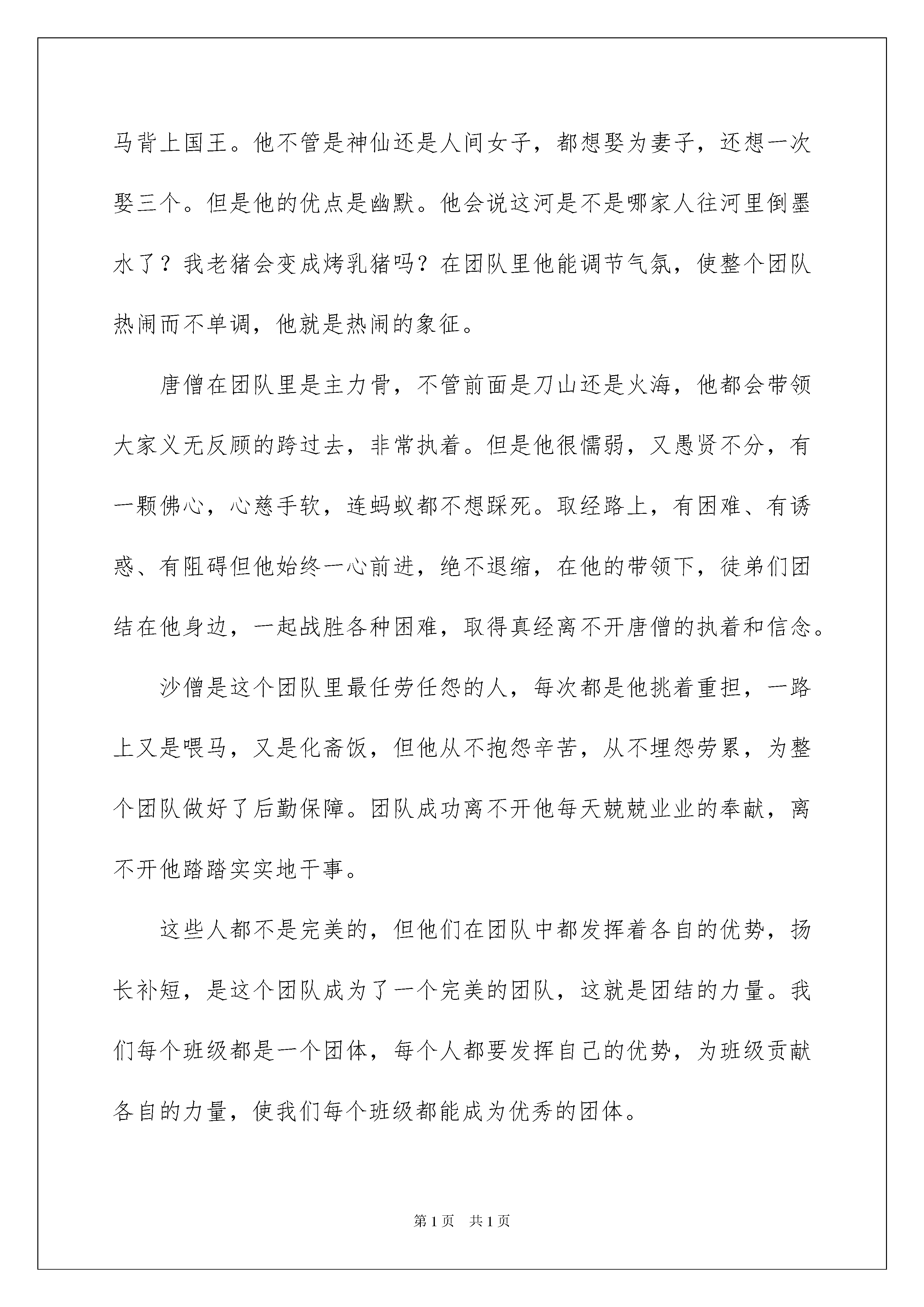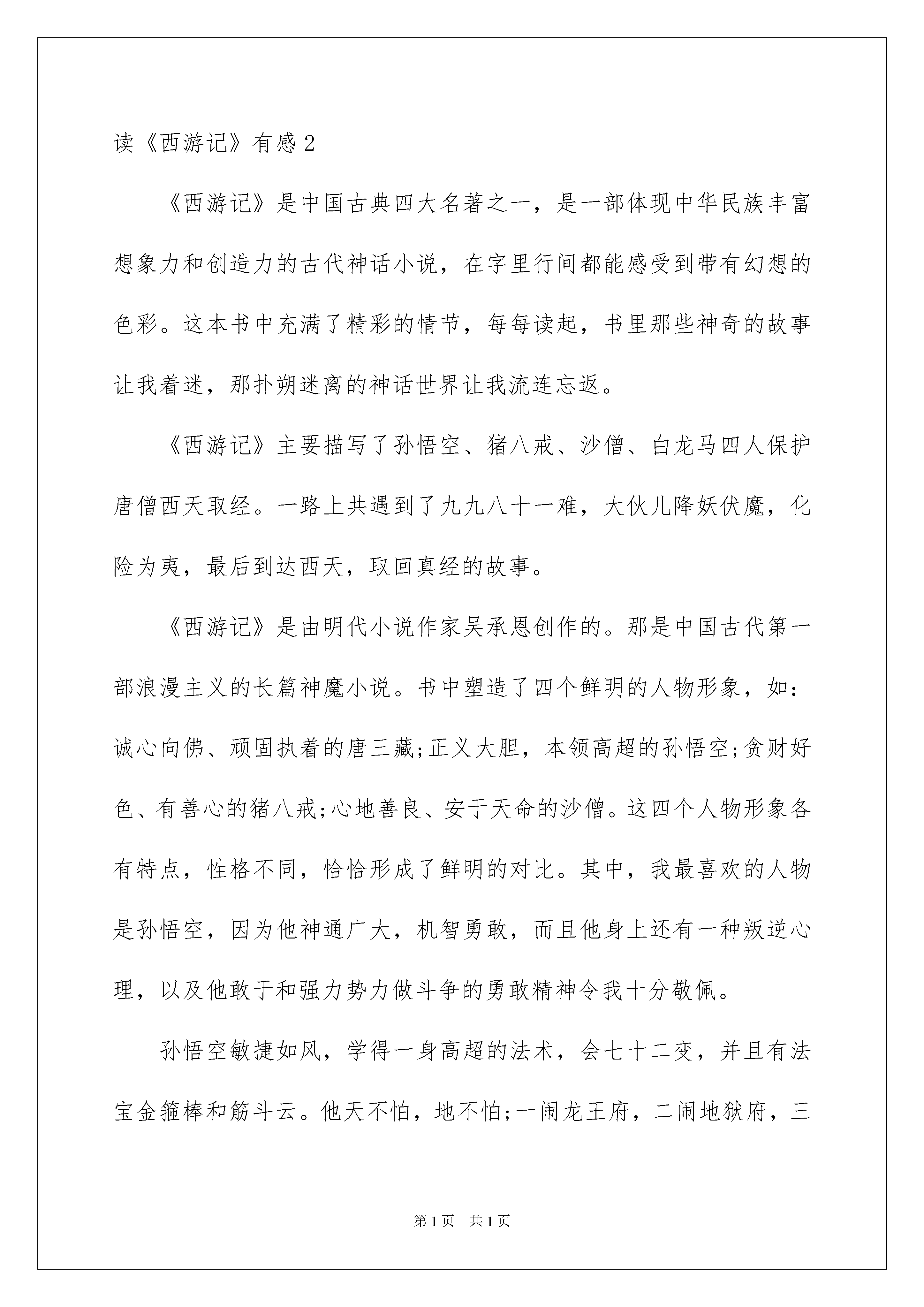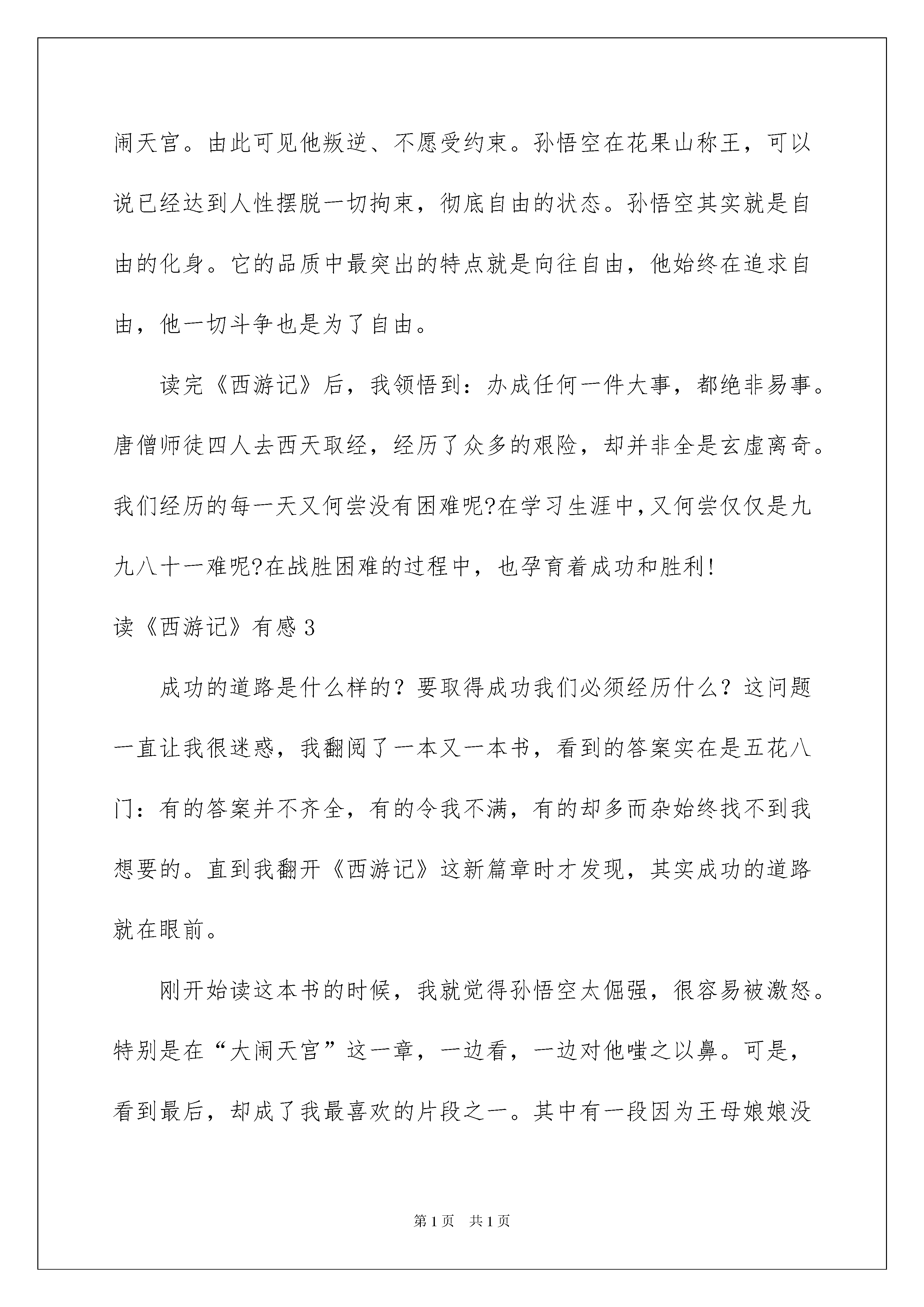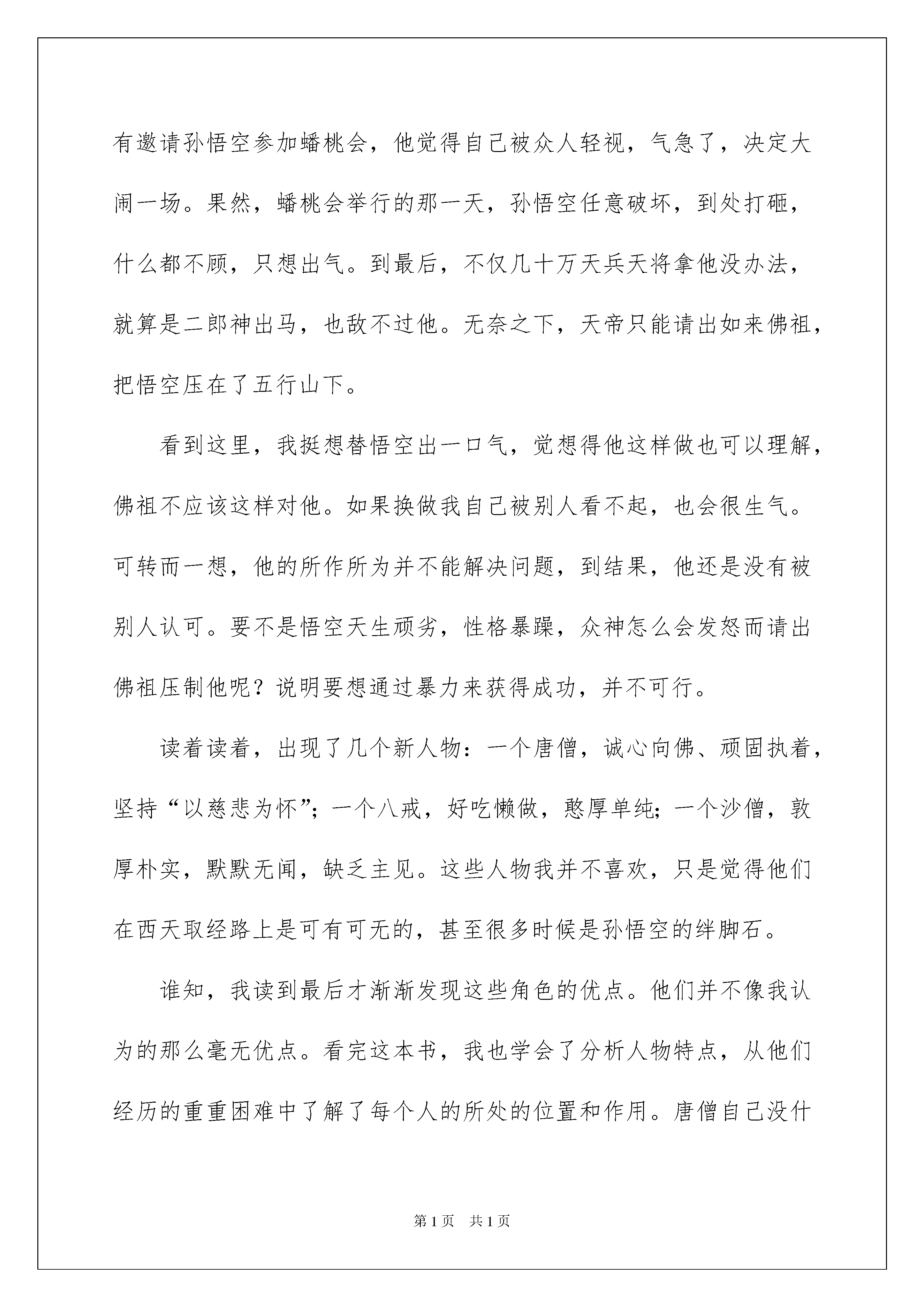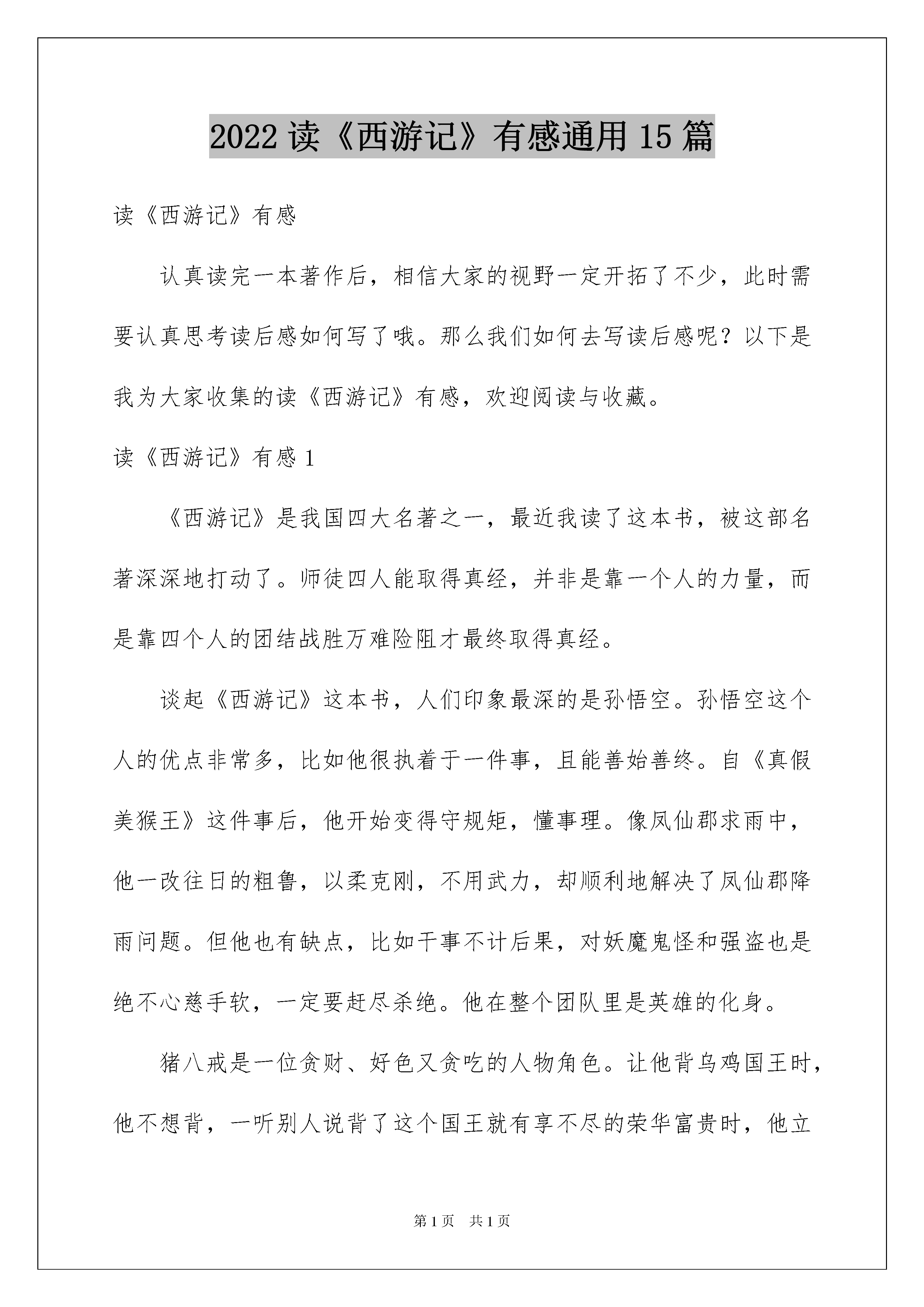 2022读《西游记》有感通用15篇读《西游记》有感认真读完一本著作后,相信大家的视野一定开拓了不少,此时需要认真思考读后感如何写了哦。那么我们如何去写读后感呢?以下是我为大家收集的读《西游记》有感,欢迎阅读与收藏。读《西游记》有感1《西游记》是我国四大名著之一,最近我读了这本书,被这部名著深深地打动了。师徒四人能取得真经,并非是靠一个人的力量,而是靠四个人的团结战胜万难险阻才最终取得真经。谈起《西游记》这本书,人们印象最深的是孙悟空。孙悟空这个人的优点非常多,比如他很执着于一件事,且能善始善终。自《真假美猴王》这件事后,他开始变得守规矩,懂事理。像凤仙郡求雨中,他一改往日的粗鲁,以柔克刚,不用武力,却顺利地解决了凤仙郡降雨问题。但他也有缺点,比如干事不计后果,对妖魔鬼怪和强盗也是绝不心慈手软,一定要赶尽杀绝。他在整个团队里是英雄的化身。猪八戒是一位贪财、好色又贪吃的人物角色。让他背乌鸡国王时,他不想背,一听别人说背了这个国王就有享不尽的荣华富贵时,他立马背上国王。他不管是神仙还是人间女子,都想娶为妻子,还想一次娶三个。但是他的优点是幽默。他会说这河是不是哪家人往河里倒墨水了?我老猪会变成烤乳猪吗?在团队里他能调节气氛,使整个团队热闹而不单调,他就是热闹的象征。唐僧在团队里是主力骨,不管前面是刀山还是火海,他都会带领大家义无反顾的跨过去,非常执着。但是他很懦弱,又愚贤不分,有一颗佛心,心慈手软,连蚂蚁都不想踩死。取经路上,有困难、有诱惑、有阻碍但他始终一心前进,绝不退缩,在他的带领下,徒弟们团结在他身边,一起战胜各种困难,取得真经离不开唐僧的执着和信念。沙僧是这个团队里最任劳任怨的人,每次都是他挑着重担,一路上又是喂马,又是化斋饭,但他从不抱怨辛苦,从不埋怨劳累,为整个团队做好了后勤保障。团队成功离不开他每天兢兢业业的奉献,离不开他踏踏实实地干事。这些人都不是完美的,但他们在团队中都发挥着各自的优势,扬长补短,是这个团队成为了一个完美的团队,这就是团结的力量。我们每个班级都是一个团体,每个人都要发挥自己的优势,为班级贡献各自的力量,使我们每个班级都能成为优秀的团体。读《西游记》有感2《西游记》是中国古典四大名著之一,是一部体现中华民族丰富想象力和创造力的古代神话小说,在字里行间都能感受到带有幻想的色彩。这本书中充满了精彩的情节,每每读起,书里那些神奇的故事让我着迷,那扑朔迷离的神话世界让我流连忘返。《西游记》主要描写了孙悟空、猪八戒、沙僧、白龙马四人保护唐僧西天取经。一路上共遇到了九九八十一难,大伙儿降妖伏魔,化险为夷,最后到达西天,取回真经的故事。《西游记》是由明代小说作家吴承恩创作的。那是中国古代第一部浪漫主义的长篇神魔小说。书中塑造了四个鲜明的人物形象,如:诚心向佛、顽固执着的唐三藏;正义大胆,本领高超的孙悟空;贪财好色、有善心的猪八戒;心地善良、安于天命的沙僧。这四个人物形象各有特点,性格不同,恰恰形成了鲜明的对比。其中,我最喜欢的人物是孙悟空,因为他神通广大,机智勇敢,而且他身上还有一种叛逆心理,以及他敢于和强力势力做斗争的勇敢精神令我十分敬佩。孙悟空敏捷如风,学得一身高超的法术,会七十二变,并且有法宝金箍棒和筋斗云。他天不怕,地不怕;一闹龙王府,二闹地狱府,三闹天宫。由此可见他叛逆、不愿受约束。孙悟空在花果山称王,可以说已经达到人性摆脱一切拘束,彻底自由的状态。孙悟空其实就是自由的化身。它的品质中最突出的特点就是向往自由,他始终在追求自由,他一切斗争也是为了自由。读完《西游记》后,我领悟到:办成任何一件大事,都绝非易事。唐僧师徒四人去西天取经,经历了众多的艰险,却并非全是玄虚离奇。我们经历的每一天又何尝没有困难呢?在学习生涯中,又何尝仅仅是九九八十一难呢?在战胜困难的过程中,也孕育着成功和胜利!读《西游记》有感3成功的道路是什么样的?要取得成功我们必须经历什么?这问题一直让我很迷惑,我翻阅了一本又一本书,看到的答案实在是五花八门:有的答案并不齐全,有的令我不满,有的却多而杂始终找不到我想要的。直到我翻开《西游记》这新篇章时才发现,其实成功的道路就在眼前。刚开始读这本书的时候,我就觉得孙悟空太倔强,很容易被激怒。特别是在“大闹天宫”这一章,一边看,一边对他嗤之以鼻。可是,看到最后,却成了我最喜欢的片段之一。其中有一段因为王母娘娘没有邀请孙悟空参加蟠桃会,他觉得自己被众人轻视,气急了,决定大闹一场。果然,蟠桃会举行的那一天,孙悟空任意破坏,到处打砸,什么都不顾,只想出气。到最后,不仅几十万天兵天将拿他没办法,就算是二郎神出马,也敌不过他。无奈之下,天帝只能请出如来佛