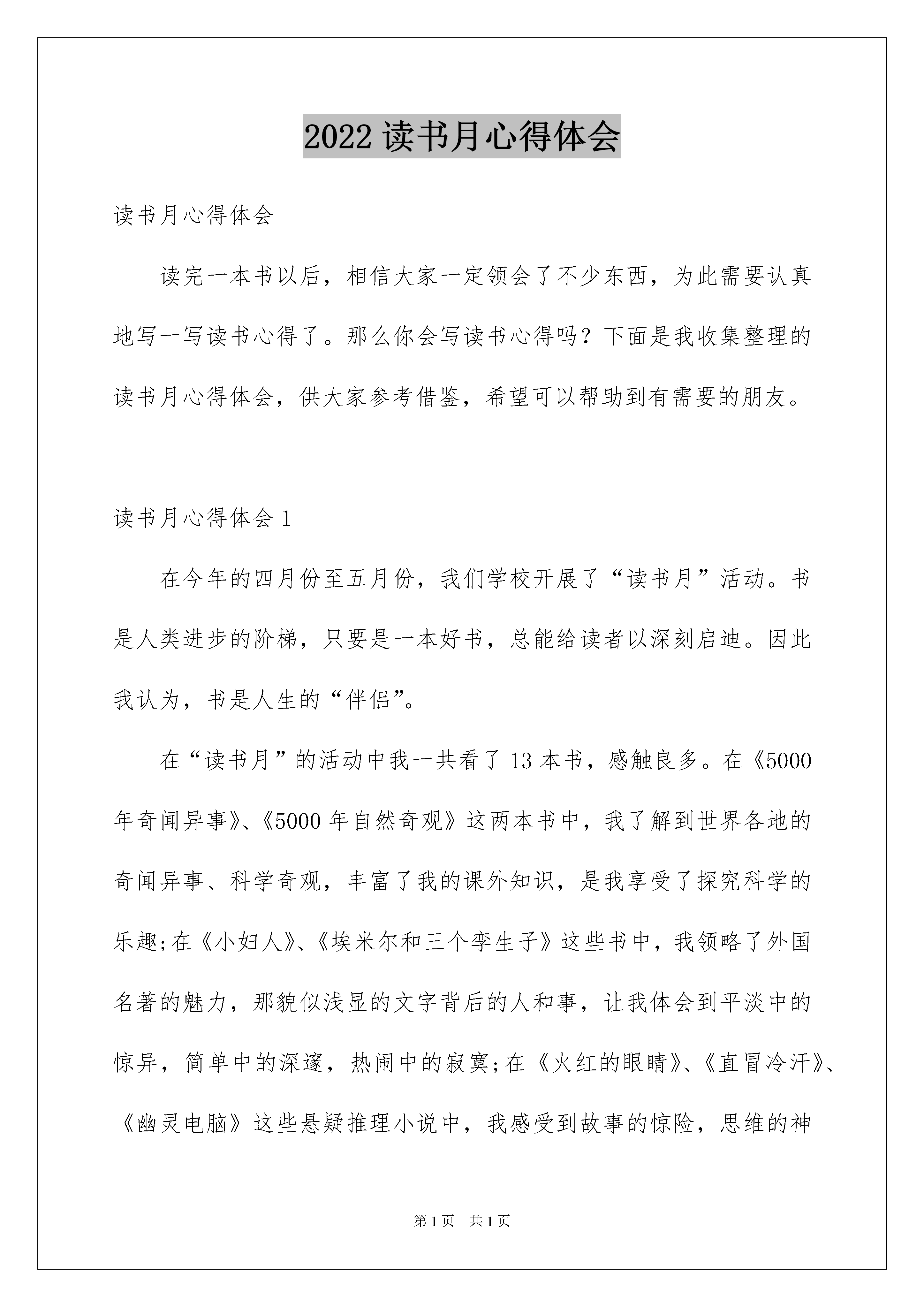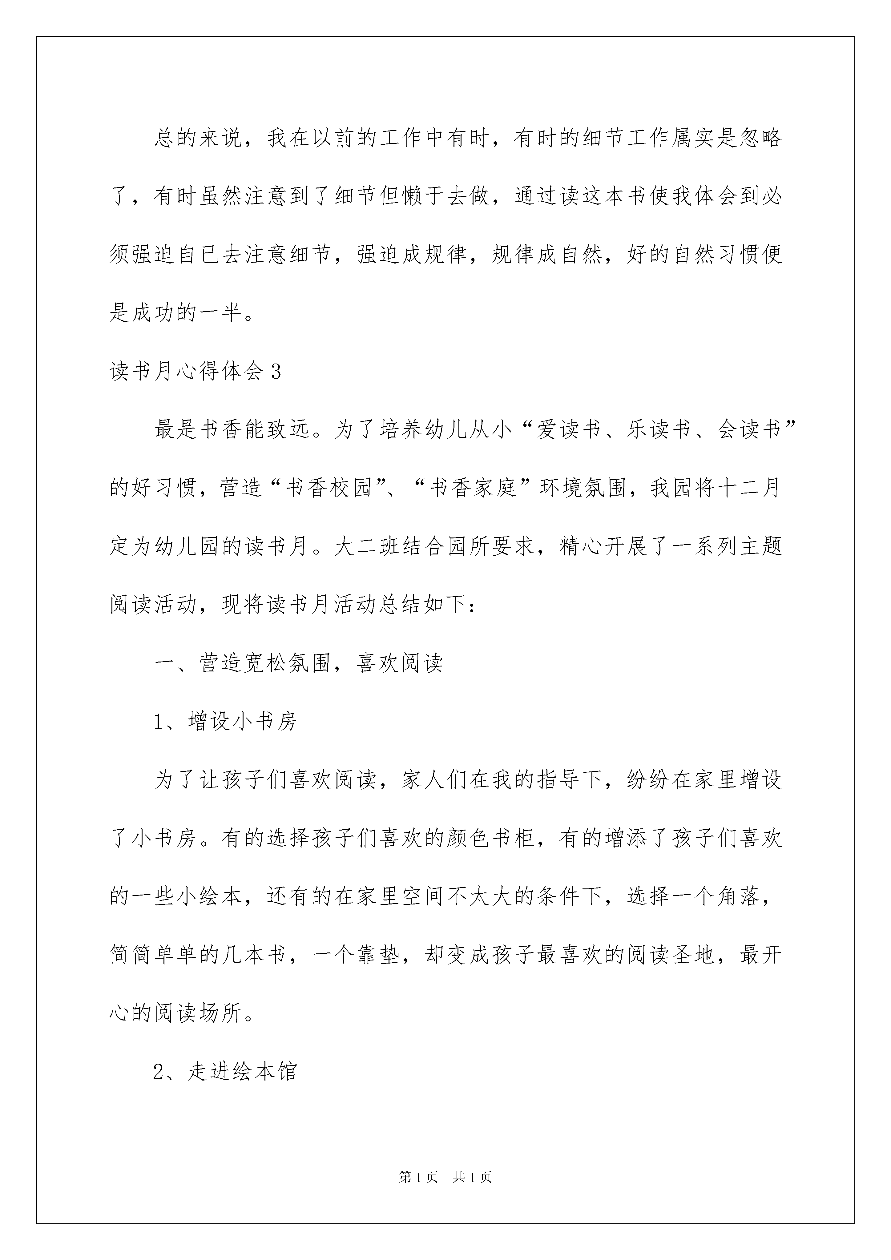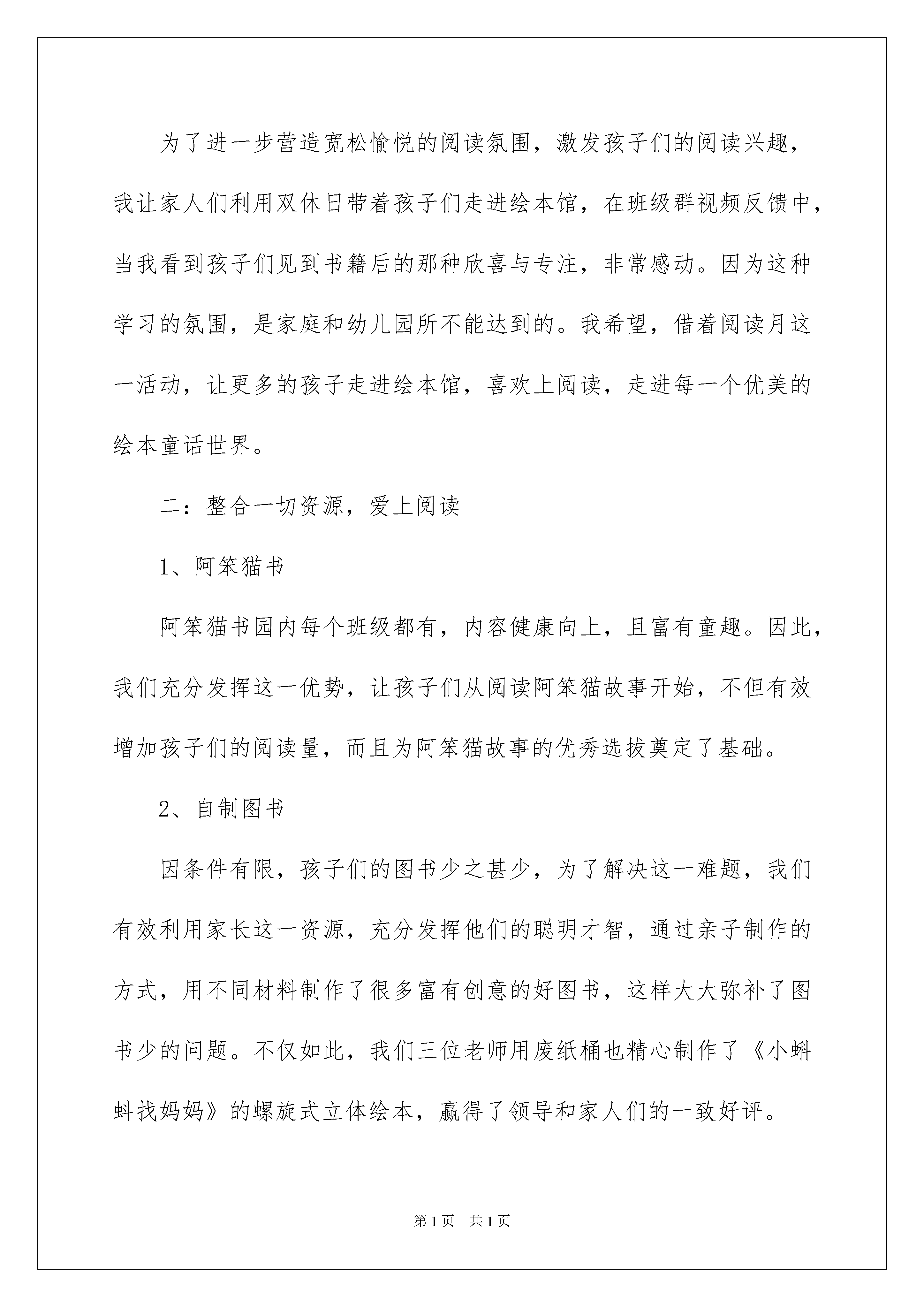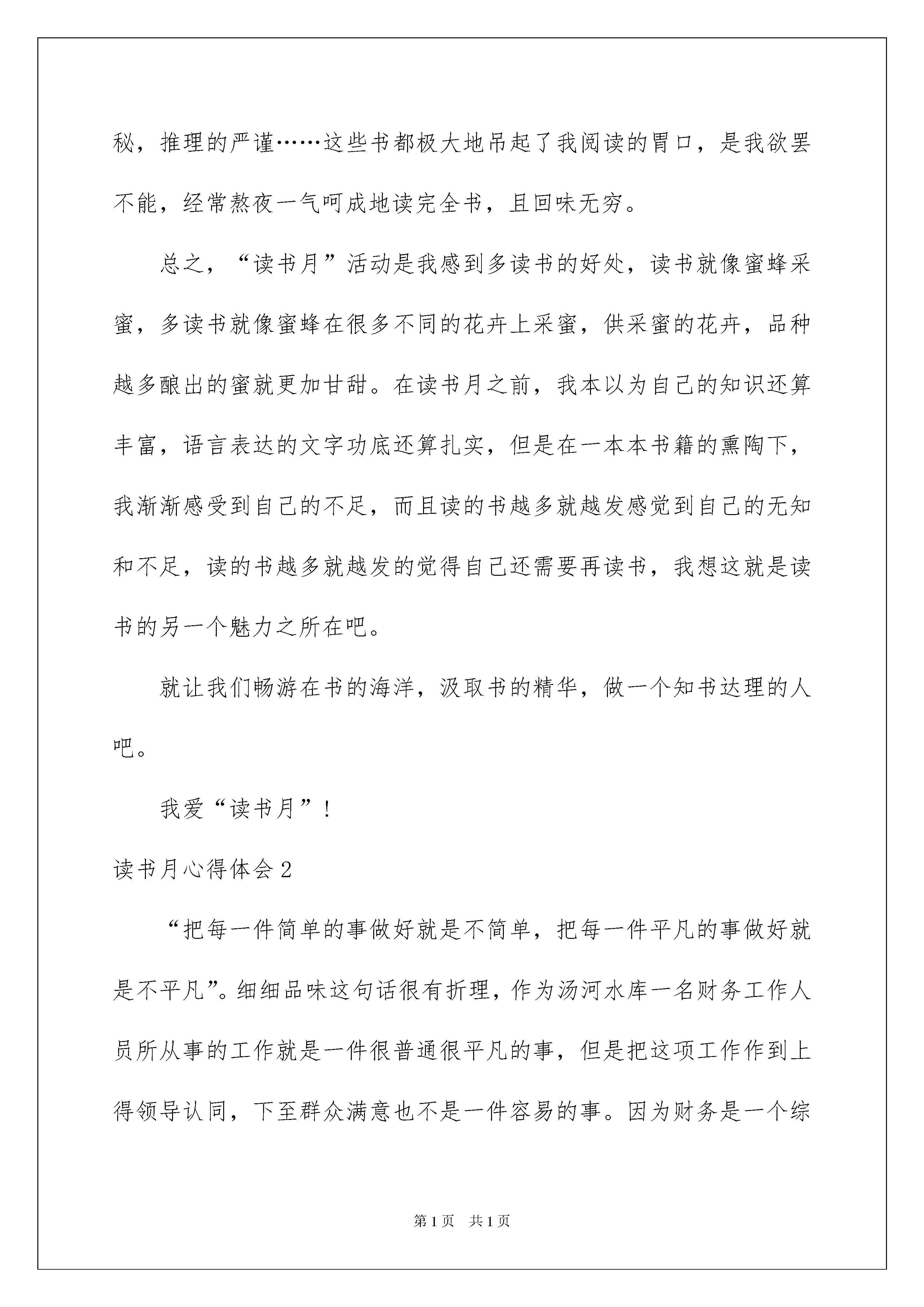 2022读书月心得体会读书月心得体会读完一本书以后,相信大家一定领会了不少东西,为此需要认真地写一写读书心得了。那么你会写读书心得吗?下面是我收集整理的读书月心得体会,供大家参考借鉴,希望可以帮助到有需要的朋友。读书月心得体会1在今年的四月份至五月份,我们学校开展了“读书月”活动。书是人类进步的阶梯,只要是一本好书,总能给读者以深刻启迪。因此我认为,书是人生的“伴侣”。在“读书月”的活动中我一共看了13本书,感触良多。在《5000年奇闻异事》、《5000年自然奇观》这两本书中,我了解到世界各地的奇闻异事、科学奇观,丰富了我的课外知识,是我享受了探究科学的乐趣;在《小妇人》、《埃米尔和三个孪生子》这些书中,我领略了外国名著的魅力,那貌似浅显的文字背后的人和事,让我体会到平淡中的惊异,简单中的深邃,热闹中的寂寞;在《火红的眼睛》、《直冒冷汗》、《幽灵电脑》这些悬疑推理小说中,我感受到故事的惊险,思维的神秘,推理的严谨……这些书都极大地吊起了我阅读的胃口,是我欲罢不能,经常熬夜一气呵成地读完全书,且回味无穷。总之,“读书月”活动是我感到多读书的好处,读书就像蜜蜂采蜜,多读书就像蜜蜂在很多不同的花卉上采蜜,供采蜜的花卉,品种越多酿出的蜜就更加甘甜。在读书月之前,我本以为自己的知识还算丰富,语言表达的文字功底还算扎实,但是在一本本书籍的熏陶下,我渐渐感受到自己的不足,而且读的书越多就越发感觉到自己的无知和不足,读的书越多就越发的觉得自己还需要再读书,我想这就是读书的另一个魅力之所在吧。就让我们畅游在书的海洋,汲取书的精华,做一个知书达理的人吧。我爱“读书月”!读书月心得体会2“把每一件简单的事做好就是不简单,把每一件平凡的事做好就是不平凡”。细细品味这句话很有折理,作为汤河水库一名财务工作人员所从事的工作就是一件很普通很平凡的事,但是把这项工作作到上得领导认同,下至群众满意也不是一件容易的事。因为财务是一个综合业务部门,所从事的是整个公司经济核算。对主管单位要核算出考核支出和非考核支出的费用和成本;对税务部门核算出应交地方税务局的各项税金;对地方财政又要核算出财务的各项重要指标。对公司内部职工又要进行住房公积金和医疗保险的核算。平时最明显的是每周二给公司职工进行的报销业务。从这件看是简单容易的小事可以折射出每一个财务人员的工作态度和工作人员本身的个人素质。从办理业务职工的反馈意见就可以了解到我们这项工作作得成功还是失败。读书心得体会范文节选!要想把这项工作作好,首先作为财务工作人员必须端正态度。具体来说财务工作也是一个服务行业,作为服务人员首先想到的就是让办事人员感受到热情舒服。每周只有周二进行现金核算,这就要求财务工作人员作好细节准备。首先调查好各科室所需的现金数额,然后在超出所需数额又不违背现金库存额的要求情况下,去银行取出现金。在进行业务授理时,按先后顺序给每一个办理业务人员进行业务处理。遇到不合财务要求的凭证,财务工作人员要做好耐心的解释工作,告之正确的方法,我想这样做起来即做好了自已的本职工作,又方便了公司的报销人员,即使得不到好评,我们也做得问心无愧。总的来说,我在以前的工作中有时,有时的细节工作属实是忽略了,有时虽然注意到了细节但懒于去做,通过读这本书使我体会到必须强迫自已去注意细节,强迫成规律,规律成自然,好的自然习惯便是成功的一半。读书月心得体会3最是书香能致远。为了培养幼儿从小“爱读书、乐读书、会读书”的好习惯,营造“书香校园”、“书香家庭”环境氛围,我园将十二月定为幼儿园的读书月。大二班结合园所要求,精心开展了一系列主题阅读活动,现将读书月活动总结如下:一、营造宽松氛围,喜欢阅读1、增设小书房为了让孩子们喜欢阅读,家人们在我的指导下,纷纷在家里增设了小书房。有的选择孩子们喜欢的颜色书柜,有的增添了孩子们喜欢的一些小绘本,还有的在家里空间不太大的条件下,选择一个角落,简简单单的几本书,一个靠垫,却变成孩子最喜欢的阅读圣地,最开心的阅读场所。2、走进绘本馆为了进一步营造宽松愉悦的阅读氛围,激发孩子们的阅读兴趣,我让家人们利用双休日带着孩子们走进绘本馆,在班级群视频反馈中,当我看到孩子们见到书籍后的那种欣喜与专注,非常感动。因为这种学习的氛围,是家庭和幼儿园所不能达到的。我希望,借着阅读月这一活动,让更多的孩子走进绘本馆,喜欢上阅读,走进每一个优美的绘本童话世界。二:整合一切资源,爱上阅读1、阿笨猫书阿笨猫书园内每个班级都有,内容健康向上,且富有童趣。因此,我们充分发挥这一优势,让孩子们从阅读阿笨猫故事开始,不但有效增加孩子们的阅读量,而且为阿笨猫故事的优秀选拔奠定