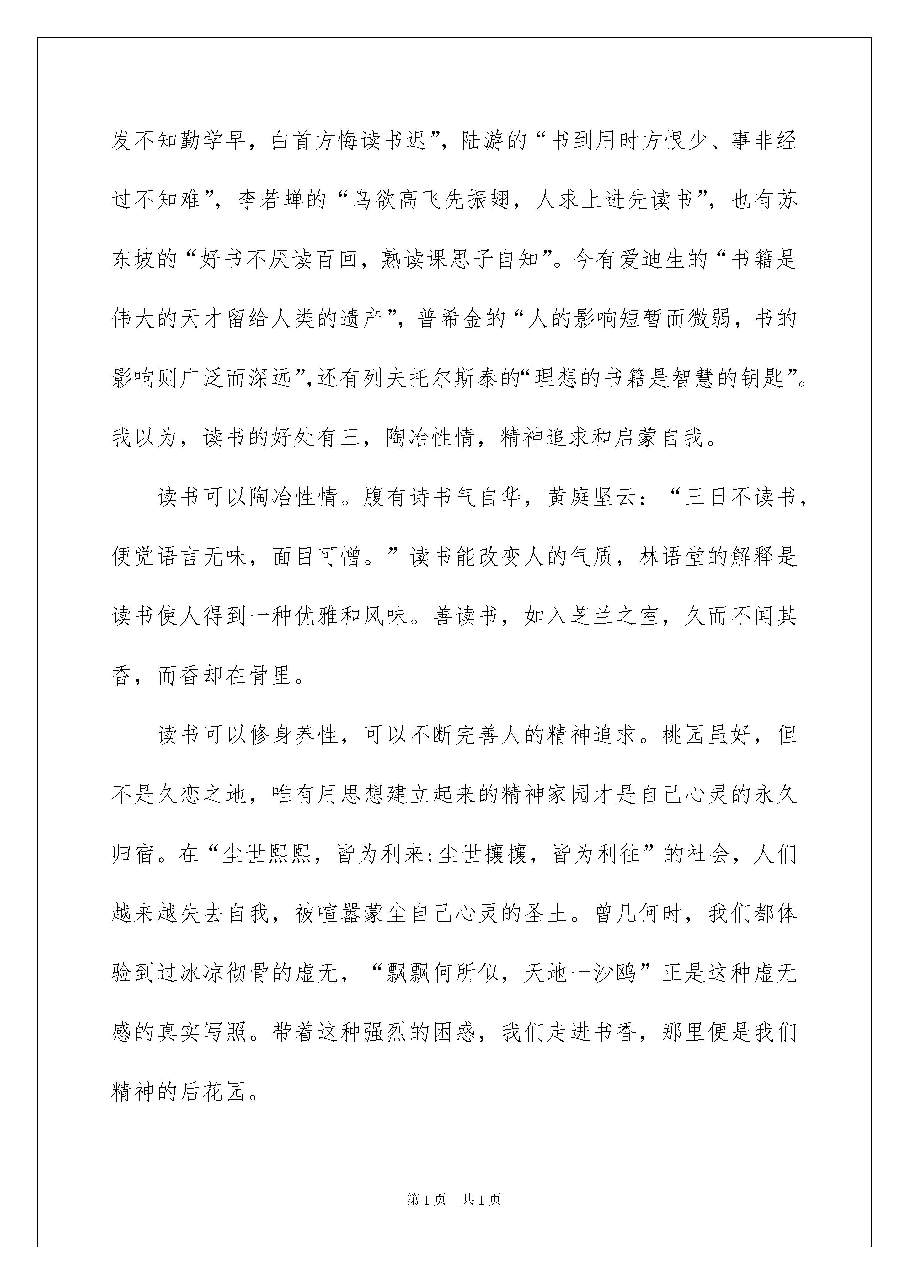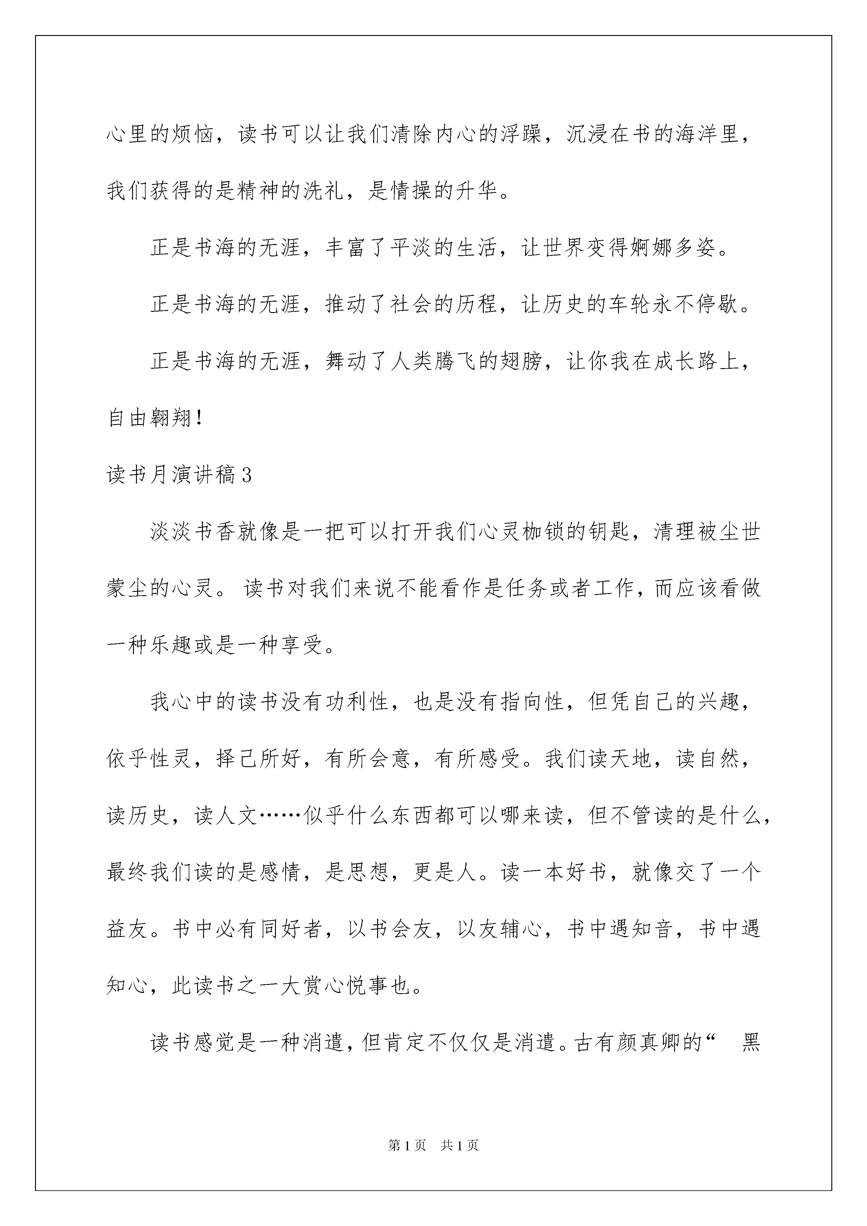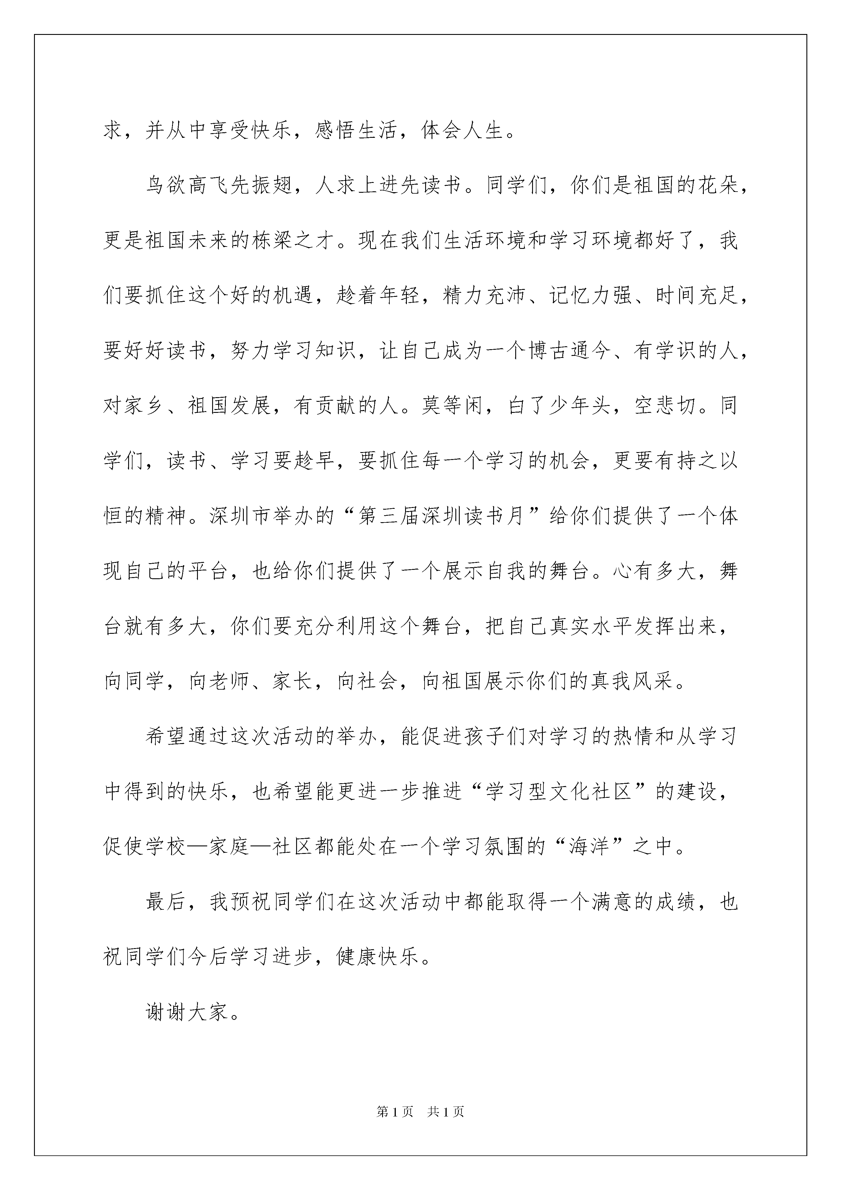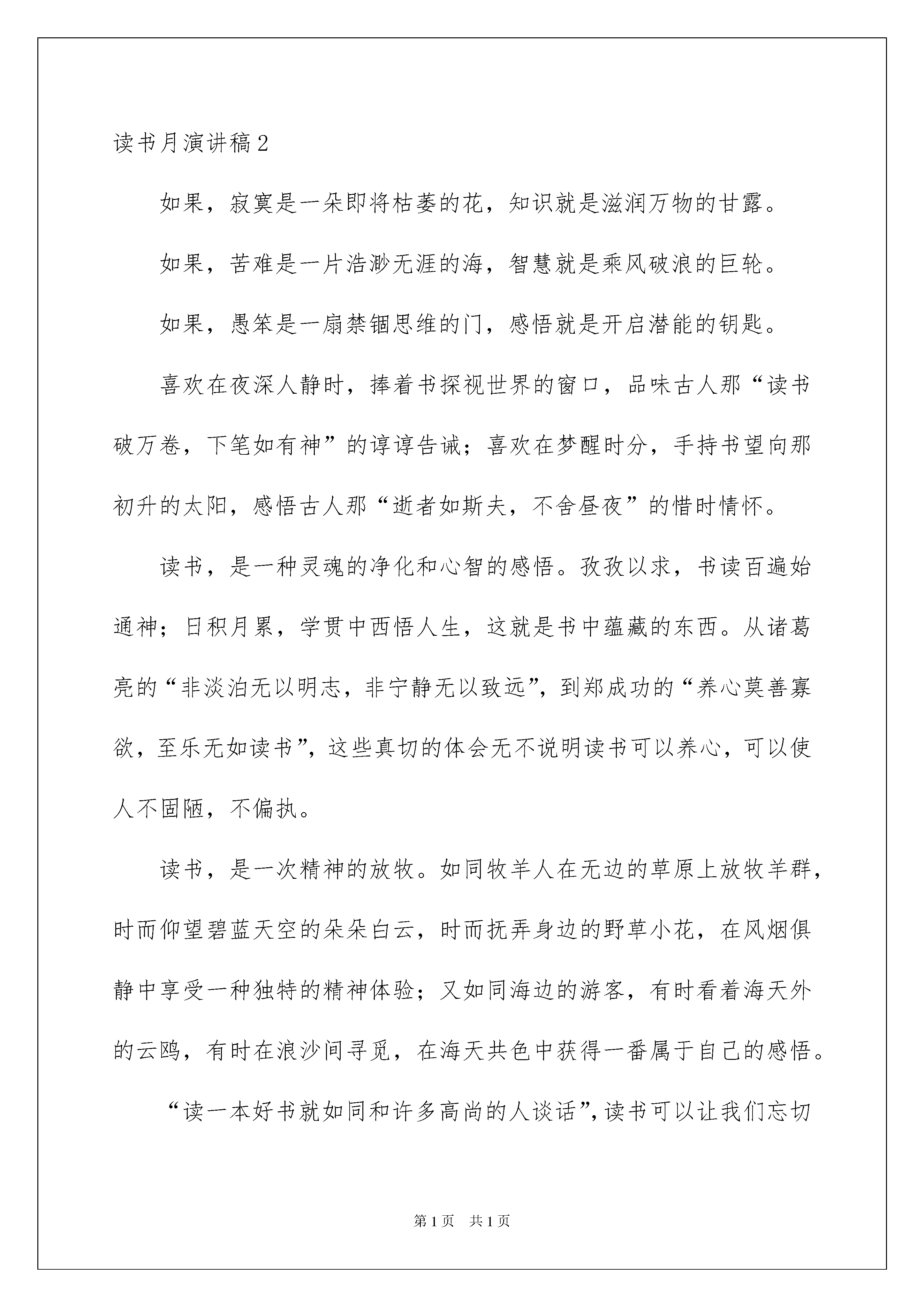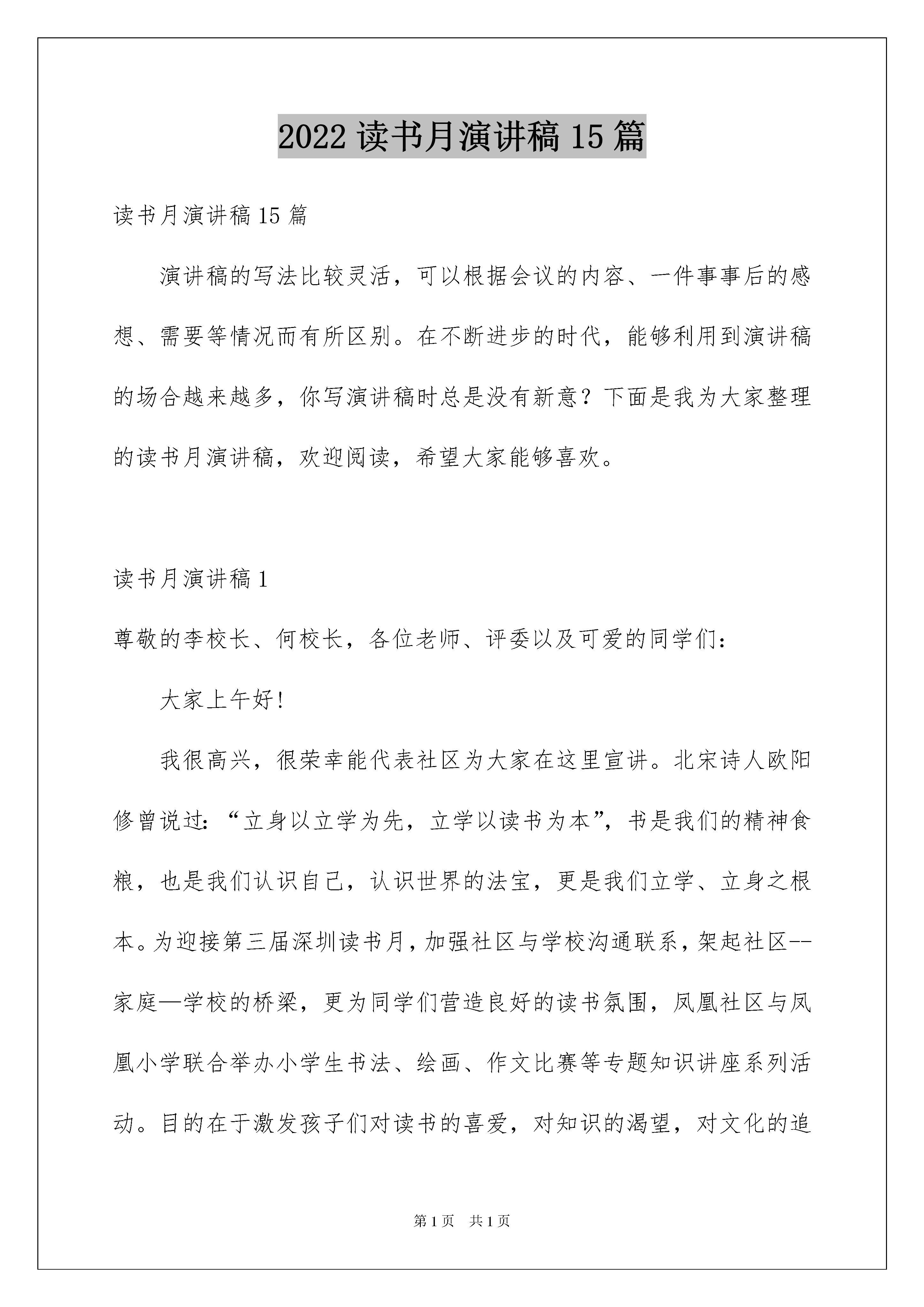 2022读书月演讲稿15篇读书月演讲稿15篇演讲稿的写法比较灵活,可以根据会议的内容、一件事事后的感想、需要等情况而有所区别。在不断进步的时代,能够利用到演讲稿的场合越来越多,你写演讲稿时总是没有新意?下面是我为大家整理的读书月演讲稿,欢迎阅读,希望大家能够喜欢。读书月演讲稿1尊敬的李校长、何校长,各位老师、评委以及可爱的同学们:大家上午好!我很高兴,很荣幸能代表社区为大家在这里宣讲。北宋诗人欧阳修曾说过:“立身以立学为先,立学以读书为本”,书是我们的精神食粮,也是我们认识自己,认识世界的法宝,更是我们立学、立身之根本。为迎接第三届深圳读书月,加强社区与学校沟通联系,架起社区--家庭—学校的桥梁,更为同学们营造良好的读书氛围,凤凰社区与凤凰小学联合举办小学生书法、绘画、作文比赛等专题知识讲座系列活动。目的在于激发孩子们对读书的喜爱,对知识的渴望,对文化的追求,并从中享受快乐,感悟生活,体会人生。鸟欲高飞先振翅,人求上进先读书。同学们,你们是祖国的花朵,更是祖国未来的栋梁之才。现在我们生活环境和学习环境都好了,我们要抓住这个好的机遇,趁着年轻,精力充沛、记忆力强、时间充足,要好好读书,努力学习知识,让自己成为一个博古通今、有学识的人,对家乡、祖国发展,有贡献的人。莫等闲,白了少年头,空悲切。同学们,读书、学习要趁早,要抓住每一个学习的机会,更要有持之以恒的精神。深圳市举办的“第三届深圳读书月”给你们提供了一个体现自己的平台,也给你们提供了一个展示自我的舞台。心有多大,舞台就有多大,你们要充分利用这个舞台,把自己真实水平发挥出来,向同学,向老师、家长,向社会,向祖国展示你们的真我风采。希望通过这次活动的举办,能促进孩子们对学习的热情和从学习中得到的快乐,也希望能更进一步推进“学习型文化社区”的建设,促使学校—家庭—社区都能处在一个学习氛围的“海洋”之中。最后,我预祝同学们在这次活动中都能取得一个满意的成绩,也祝同学们今后学习进步,健康快乐。谢谢大家。读书月演讲稿2如果,寂寞是一朵即将枯萎的花,知识就是滋润万物的甘露。如果,苦难是一片浩渺无涯的海,智慧就是乘风破浪的巨轮。如果,愚笨是一扇禁锢思维的门,感悟就是开启潜能的钥匙。喜欢在夜深人静时,捧着书探视世界的窗口,品味古人那“读书破万卷,下笔如有神”的谆谆告诫;喜欢在梦醒时分,手持书望向那初升的太阳,感悟古人那“逝者如斯夫,不舍昼夜”的惜时情怀。读书,是一种灵魂的净化和心智的感悟。孜孜以求,书读百遍始通神;日积月累,学贯中西悟人生,这就是书中蕴藏的东西。从诸葛亮的“非淡泊无以明志,非宁静无以致远”,到郑成功的“养心莫善寡欲,至乐无如读书”,这些真切的体会无不说明读书可以养心,可以使人不固陋,不偏执。读书,是一次精神的放牧。如同牧羊人在无边的草原上放牧羊群,时而仰望碧蓝天空的朵朵白云,时而抚弄身边的野草小花,在风烟俱静中享受一种独特的精神体验;又如同海边的游客,有时看着海天外的云鸥,有时在浪沙间寻觅,在海天共色中获得一番属于自己的感悟。“读一本好书就如同和许多高尚的人谈话”,读书可以让我们忘切心里的烦恼,读书可以让我们清除内心的浮躁,沉浸在书的海洋里,我们获得的是精神的洗礼,是情操的升华。正是书海的无涯,丰富了平淡的生活,让世界变得婀娜多姿。正是书海的无涯,推动了社会的历程,让历史的车轮永不停歇。正是书海的无涯,舞动了人类腾飞的翅膀,让你我在成长路上,自由翱翔!读书月演讲稿3淡淡书香就像是一把可以打开我们心灵枷锁的钥匙,清理被尘世蒙尘的心灵。读书对我们来说不能看作是任务或者工作,而应该看做一种乐趣或是一种享受。我心中的读书没有功利性,也是没有指向性,但凭自己的兴趣,依乎性灵,择己所好,有所会意,有所感受。我们读天地,读自然,读历史,读人文……似乎什么东西都可以哪来读,但不管读的是什么,最终我们读的是感情,是思想,更是人。读一本好书,就像交了一个益友。书中必有同好者,以书会友,以友辅心,书中遇知音,书中遇知心,此读书之一大赏心悦事也。读书感觉是一种消遣,但肯定不仅仅是消遣。古有颜真卿的“黑发不知勤学早,白首方悔读书迟”,陆游的“书到用时方恨少、事非经过不知难”,李若蝉的“鸟欲高飞先振翅,人求上进先读书”,也有苏东坡的“好书不厌读百回,熟读课思子自知”。今有爱迪生的“书籍是伟大的天才留给人类的遗产”,普希金的“人的影响短暂而微弱,书的影响则广泛而深远”,还有列夫托尔斯泰的“理想的书籍是智慧的钥匙”。我以为,读书的好处有三,陶冶性情,精神追求和启蒙自我。读书可以陶冶性情。腹有诗书气自华,黄庭坚云:“三日不读书,便觉语言无味,面目可憎。”
