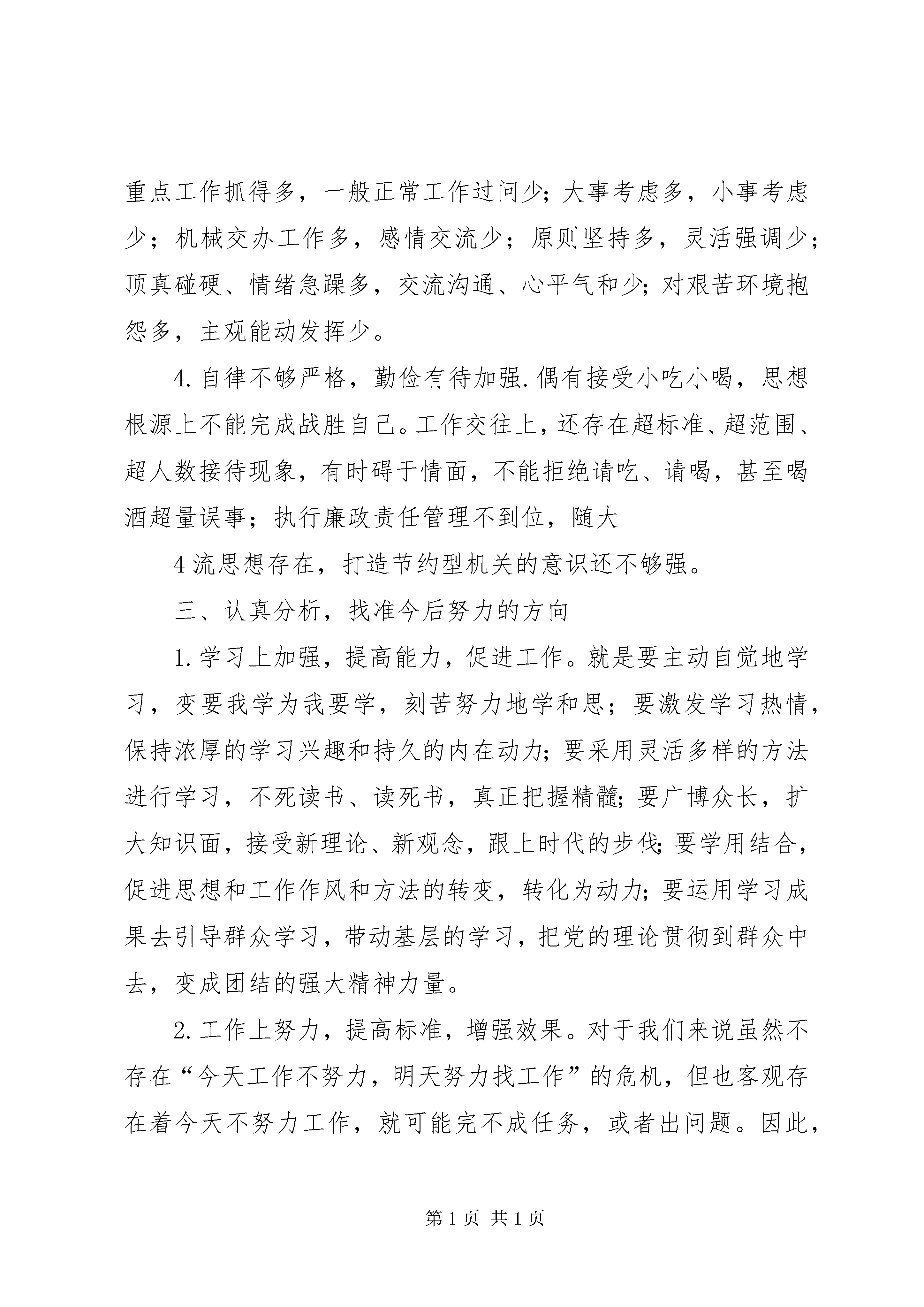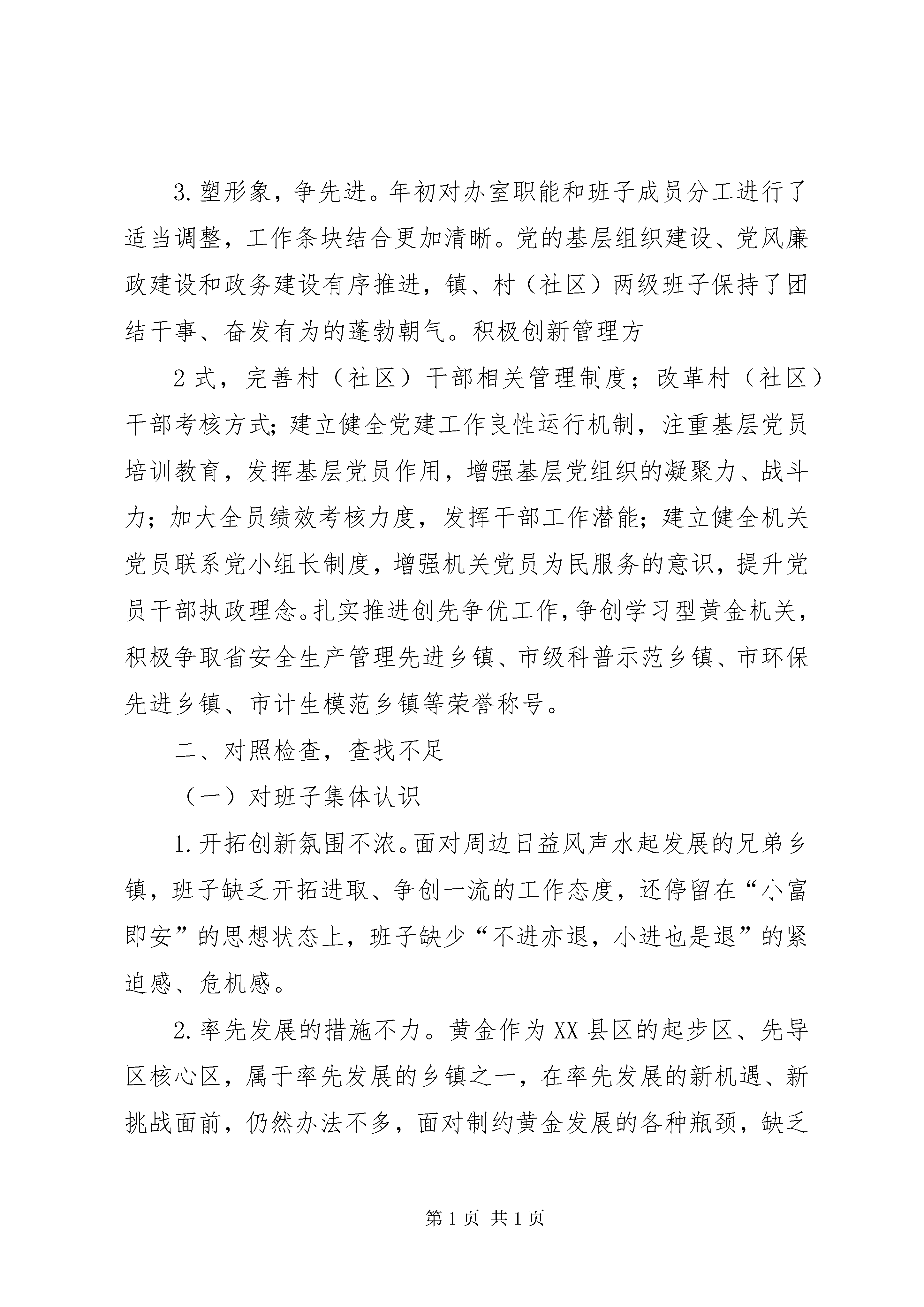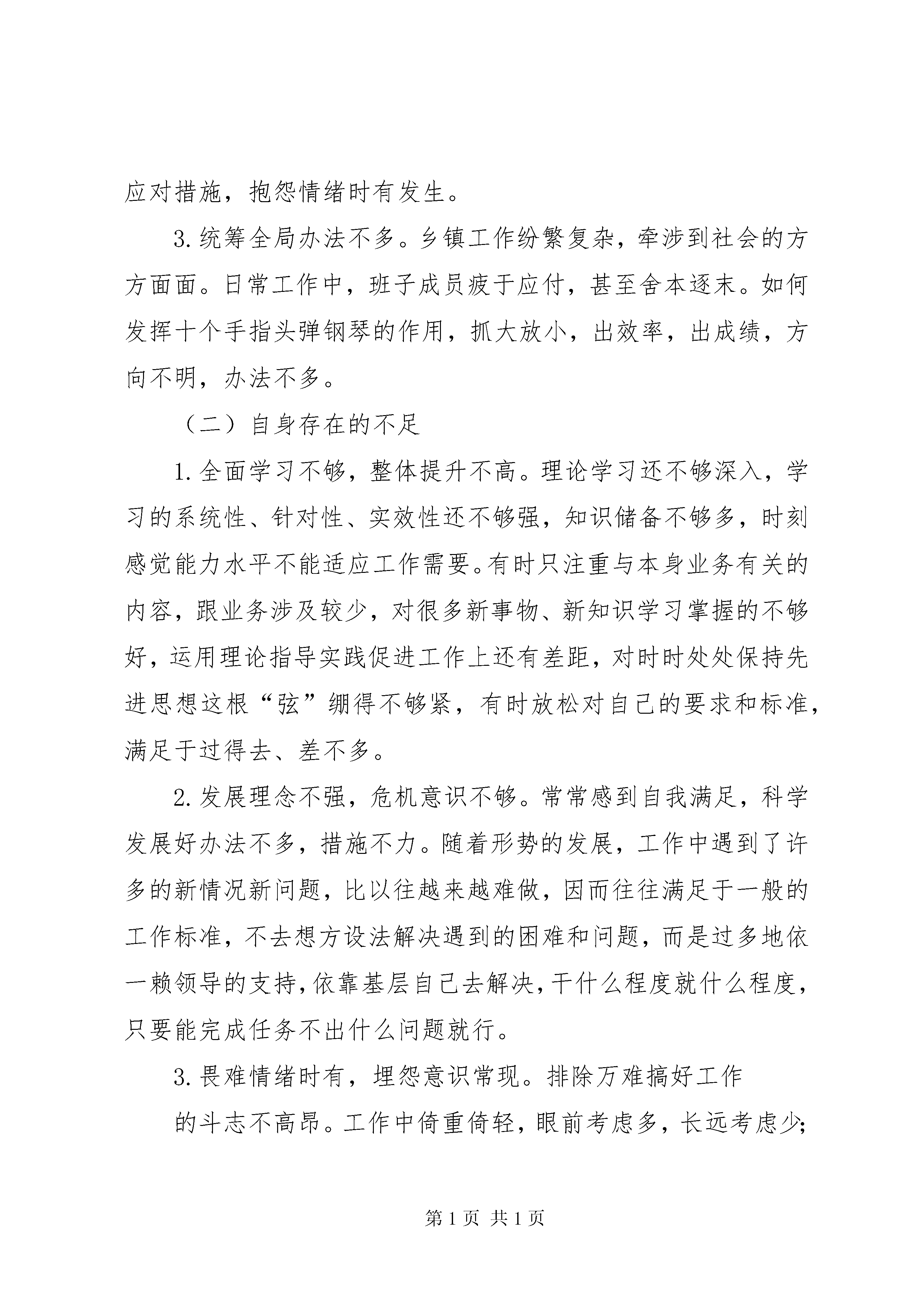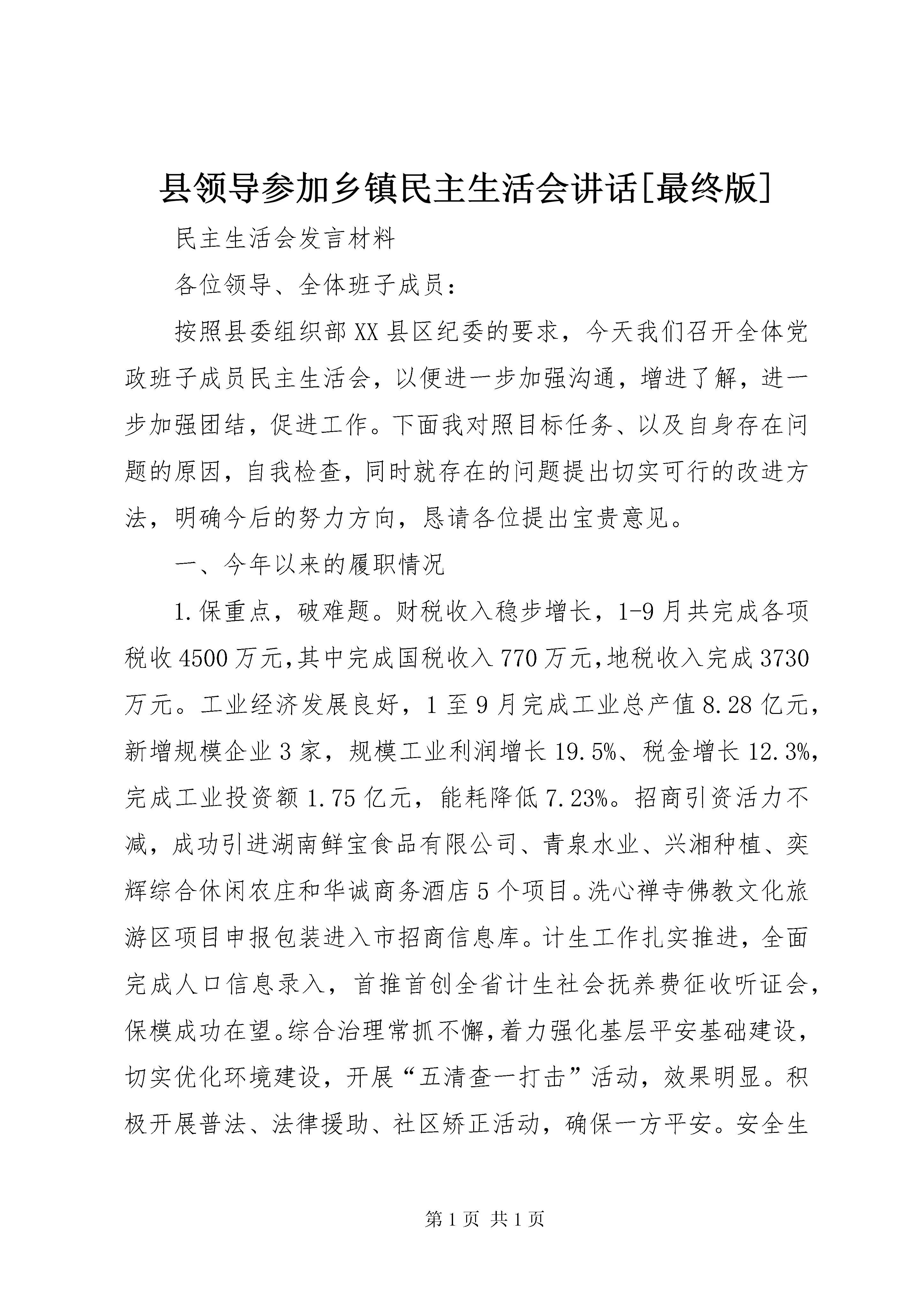 县领导参加乡镇民主生活会讲话[最终版]民主生活会发言材料各位领导、全体班子成员:按照县委组织部XX县区纪委的要求,今天我们召开全体党政班子成员民主生活会,以便进一步加强沟通,增进了解,进一步加强团结,促进工作。下面我对照目标任务、以及自身存在问题的原因,自我检查,同时就存在的问题提出切实可行的改进方法,明确今后的努力方向,恳请各位提出宝贵意见。一、今年以来的履职情况1.保重点,破难题。财税收入稳步增长,1-9月共完成各项税收4500万元,其中完成国税收入770万元,地税收入完成3730万元。工业经济发展良好,1至9月完成工业总产值8.28亿元,新增规模企业3家,规模工业利润增长19.5%、税金增长12.3%,完成工业投资额1.75亿元,能耗降低7.23%。招商引资活力不减,成功引进湖南鲜宝食品有限公司、青泉水业、兴湘种植、奕辉综合休闲农庄和华诚商务酒店5个项目。洗心禅寺佛教文化旅游区项目申报包装进入市招商信息库。计生工作扎实推进,全面完成人口信息录入,首推首创全省计生社会抚养费征收听证会,保模成功在望。综合治理常抓不懈,着力强化基层平安基础建设,切实优化环境建设,开展“五清查一打击”活动,效果明显。积极开展普法、法律援助、社区矫正活动,确保一方平安。安全生产警钟长鸣,建立健全安全生产管理制度,完善安全生产管理台帐,加大安全生产排查力度,安全生产形势保持稳定。解决中粮、金麓房产数年来的胶着状态,经多方努力,中粮北纬28°房产项目一期如期开盘,二期地质勘探正在进行。金麓房产拆迁正在强力推进。湖南日报房产Ⅰ期建设基本完成,Ⅱ期建设完成土方平整。岳麓大道长沙西收费站开始营业。黄桥大道(一段)已完成路基土方工程,周边顺接道路和水系建设同步推进。黄金机械化和黄桥大道(三段)拆迁工作正在进行。农贸市场多方协调,全面启动建设,力争11月份竣工验收。新东阳几经努力,投资幅度有望增加。2.强基础,促均衡。华瑞生态农场实现土地二次流转,成功引进长沙旺丹养殖有限公司原生态绿壳蛋鸡。新组建兴湘种植合作社等5个农业合作社。引进金山桥新能源节能灯具和廖家坪省农科院科研试验基地两项新技术、新成果转化。桐林坳小学合格化学校和金坪学校建设全面启动,全镇校舍安全工程、危房改造工程建设已全面完成。低保半年度审核“阳光行动”全面完成。完成许龙线黄金境内5.7公里的路面硬化。完成市级“科普示范镇”的准备工作。农村环境卫生治理工作取得初步成效,机制进一步完善,人口普查、城乡居民保险、合作医疗、土地量调查、三冬工作、节约集约用地创模等工作有序推进。3.塑形象,争先进。年初对办室职能和班子成员分工进行了适当调整,工作条块结合更加清晰。党的基层组织建设、党风廉政建设和政务建设有序推进,镇、村(社区)两级班子保持了团结干事、奋发有为的蓬勃朝气。积极创新管理方2式,完善村(社区)干部相关管理制度;改革村(社区)干部考核方式;建立健全党建工作良性运行机制,注重基层党员培训教育,发挥基层党员作用,增强基层党组织的凝聚力、战斗力;加大全员绩效考核力度,发挥干部工作潜能;建立健全机关党员联系党小组长制度,增强机关党员为民服务的意识,提升党员干部执政理念。扎实推进创先争优工作,争创学习型黄金机关,积极争取省安全生产管理先进乡镇、市级科普示范乡镇、市环保先进乡镇、市计生模范乡镇等荣誉称号。二、对照检查,查找不足(一)对班子集体认识1.开拓创新氛围不浓。面对周边日益风声水起发展的兄弟乡镇,班子缺乏开拓进取、争创一流的工作态度,还停留在“小富即安”的思想状态上,班子缺少“不进亦退,小进也是退”的紧迫感、危机感。2.率先发展的措施不力。黄金作为XX县区的起步区、先导区核心区,属于率先发展的乡镇之一,在率先发展的新机遇、新挑战面前,仍然办法不多,面对制约黄金发展的各种瓶颈,缺乏应对措施,抱怨情绪时有发生。3.统筹全局办法不多。乡镇工作纷繁复杂,牵涉到社会的方方面面。日常工作中,班子成员疲于应付,甚至舍本逐末。如何发挥十个手指头弹钢琴的作用,抓大放小,出效率,出成绩,方向不明,办法不多。(二)自身存在的不足1.全面学习不够,整体提升不高。理论学习还不够深入,学习的系统性、针对性、实效性还不够强,知识储备不够多,时刻感觉能力水平不能适应工作需要。有时只注重与本身业务有关的内容,跟业务涉及较少,对很多新事物、新知识学习掌握的不够好,运用理论指导实践促进工作上还有差距,对时时处处保持先进思想这根“弦”绷得不够紧,有时放松对自己的要求和标准,满足于过得去、差不多。2.发展理念不强,危机意识不够。常常感到自我满足,科学发展好办法不多,措施不力。随着形势的发展,工作中遇到了许多的新情况新问题,比以往越来越难做,因而往往满足于一般的工作标准,不去想方设法解决遇到的困难和问题,而是过多地依一赖