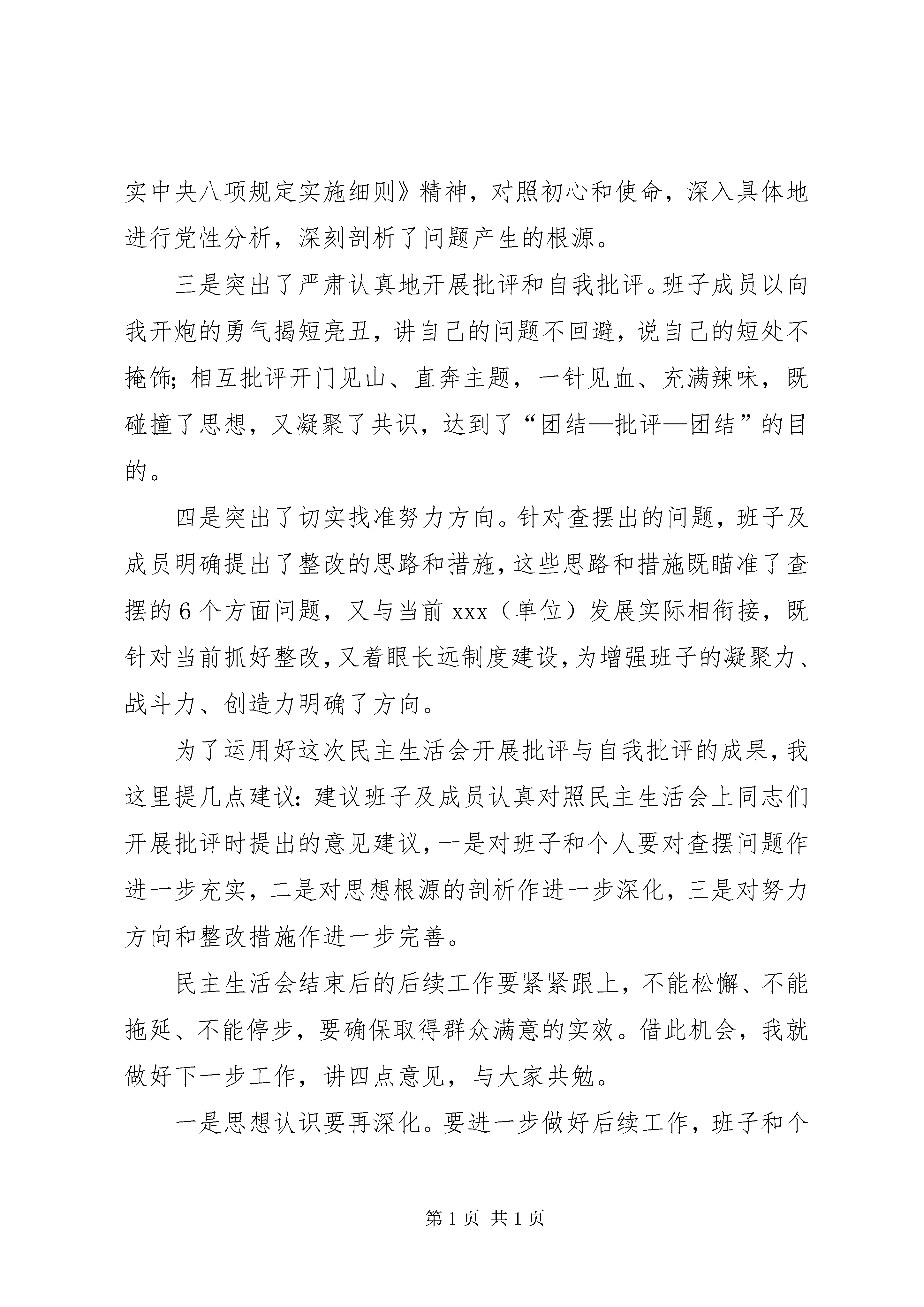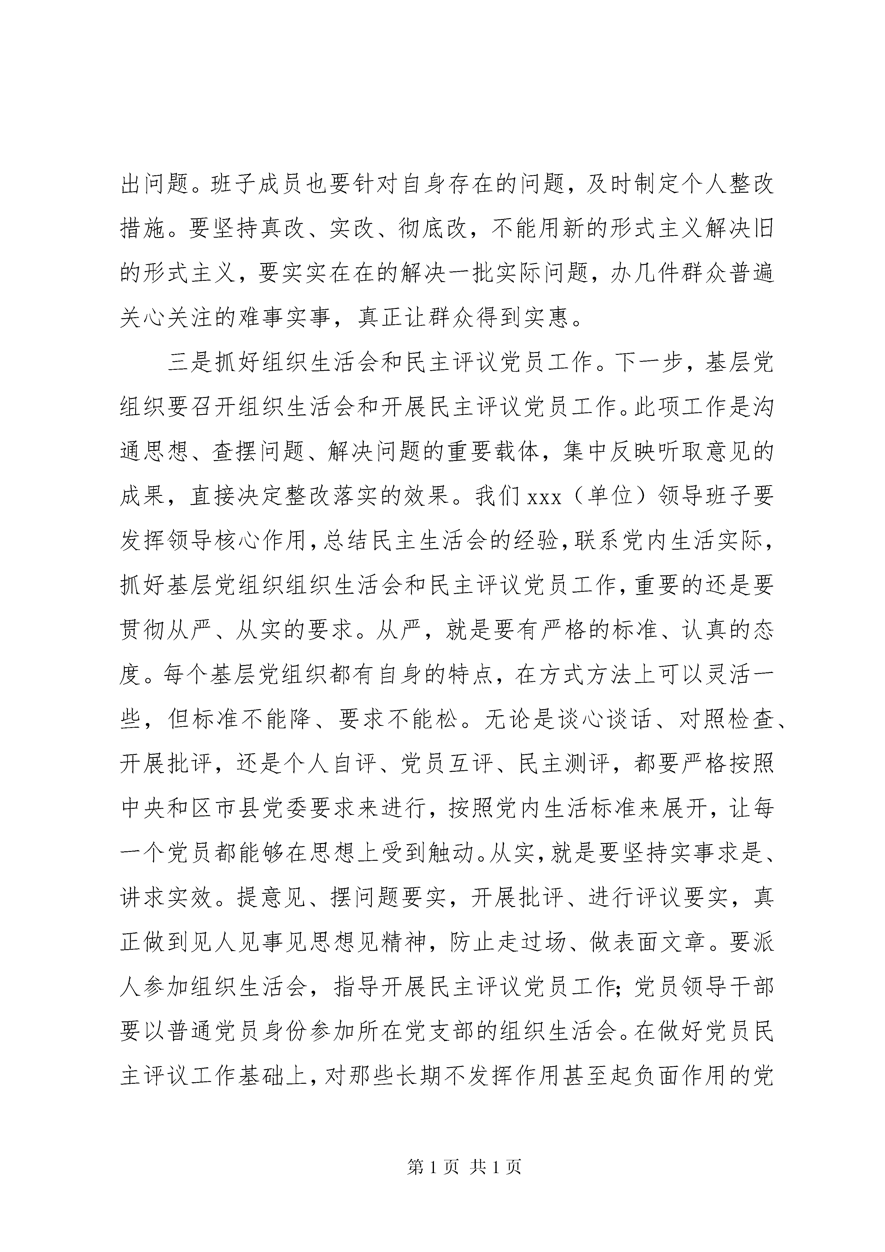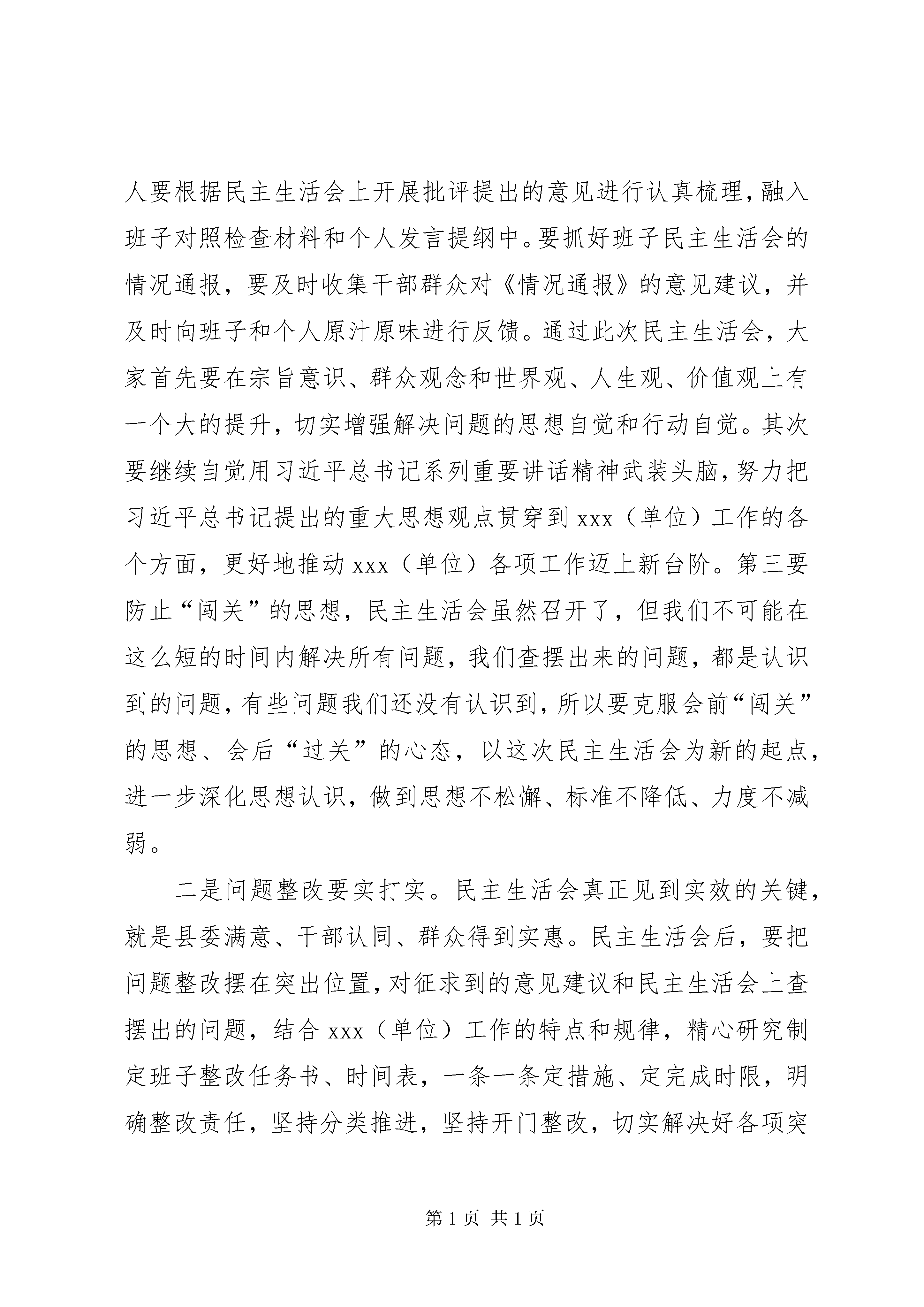 县领导在乡镇部门领导班子XX年度专题民主生活会上的讲话(通稿)在xxx(单位)党员领导干部民主生活会上的讲话(县领导讲话通稿)同志们:今天我全程参加了xxx(单位)党员领导干部民主生活会,很有收获,也很受教育。刚才,xxx同志对xxx(单位)民主生活会作了很好的点评,请大家认真领会,抓好贯彻落实。此次会议达到了统一思想、改进作风、增进团结的目的,是一次较高质量的民主生活会。具体表现在:一是突出了坚持问题导向紧扣主题查摆问题。班子及班子成员认真查找了在学习贯彻习近平新时代中国特色社会主义思想、认真执行党中央决策部署和上级党委决议决定、对党忠诚老实、担当负责、纠正“四风”、严格执行廉洁自律准则6个方面存在的突出问题。查摆问题比较准、比较实,回应了干部群众的意见建议,与事对接,与人见面,见事见人见思想,符合实际。二是突出了深刻剖析思想根源。同志们以党的宗旨为坐标,运用马克思主义的立场、观点、方法,紧扣世界观、人生观、价值观这个总开关,对照党章,对照《中共中央政治局关于加强和维护党中央集中统一领导的若干规定》《中共中央政治局贯彻落实中央八项规定实施细则》精神,对照初心和使命,深入具体地进行党性分析,深刻剖析了问题产生的根源。三是突出了严肃认真地开展批评和自我批评。班子成员以向我开炮的勇气揭短亮丑,讲自己的问题不回避,说自己的短处不掩饰;相互批评开门见山、直奔主题,一针见血、充满辣味,既碰撞了思想,又凝聚了共识,达到了“团结—批评—团结”的目的。四是突出了切实找准努力方向。针对查摆出的问题,班子及成员明确提出了整改的思路和措施,这些思路和措施既瞄准了查摆的6个方面问题,又与当前xxx(单位)发展实际相衔接,既针对当前抓好整改,又着眼长远制度建设,为增强班子的凝聚力、战斗力、创造力明确了方向。为了运用好这次民主生活会开展批评与自我批评的成果,我这里提几点建议:建议班子及成员认真对照民主生活会上同志们开展批评时提出的意见建议,一是对班子和个人要对查摆问题作进一步充实,二是对思想根源的剖析作进一步深化,三是对努力方向和整改措施作进一步完善。民主生活会结束后的后续工作要紧紧跟上,不能松懈、不能拖延、不能停步,要确保取得群众满意的实效。借此机会,我就做好下一步工作,讲四点意见,与大家共勉。一是思想认识要再深化。要进一步做好后续工作,班子和个人要根据民主生活会上开展批评提出的意见进行认真梳理,融入班子对照检查材料和个人发言提纲中。要抓好班子民主生活会的情况通报,要及时收集干部群众对《情况通报》的意见建议,并及时向班子和个人原汁原味进行反馈。通过此次民主生活会,大家首先要在宗旨意识、群众观念和世界观、人生观、价值观上有一个大的提升,切实增强解决问题的思想自觉和行动自觉。其次要继续自觉用习近平总书记系列重要讲话精神武装头脑,努力把习近平总书记提出的重大思想观点贯穿到xxx(单位)工作的各个方面,更好地推动xxx(单位)各项工作迈上新台阶。第三要防止“闯关”的思想,民主生活会虽然召开了,但我们不可能在这么短的时间内解决所有问题,我们查摆出来的问题,都是认识到的问题,有些问题我们还没有认识到,所以要克服会前“闯关”的思想、会后“过关”的心态,以这次民主生活会为新的起点,进一步深化思想认识,做到思想不松懈、标准不降低、力度不减弱。二是问题整改要实打实。民主生活会真正见到实效的关键,就是县委满意、干部认同、群众得到实惠。民主生活会后,要把问题整改摆在突出位置,对征求到的意见建议和民主生活会上查摆出的问题,结合xxx(单位)工作的特点和规律,精心研究制定班子整改任务书、时间表,一条一条定措施、定完成时限,明确整改责任,坚持分类推进,坚持开门整改,切实解决好各项突出问题。班子成员也要针对自身存在的问题,及时制定个人整改措施。要坚持真改、实改、彻底改,不能用新的形式主义解决旧的形式主义,要实实在在的解决一批实际问题,办几件群众普遍关心关注的难事实事,真正让群众得到实惠。三是抓好组织生活会和民主评议党员工作。下一步,基层党组织要召开组织生活会和开展民主评议党员工作。此项工作是沟通思想、查摆问题、解决问题的重要载体,集中反映听取意见的成果,直接决定整改落实的效果。我们xxx(单位)领导班子要发挥领导核心作用,总结民主生活会的经验,联系党内生活实际,抓好基层党组织组织生活会和民主评议党员工作,重要的还是要贯彻从严、从实的要求。从严,就是要有严格的标准、认真的态度。每个基层党组织都有自身的特点,在方式方法上可以灵活一些,但标准不能降、要求不能松。无论是谈心谈话、对照检查、开展批评,还是个人自评、党员互评、民主测评,都要严格按照中央和区市县党委要求来进行,按照党内生活标准来展开,让每一个党员都能够在思想上受到触动。从实,就是要坚持实事求是、讲求实效。