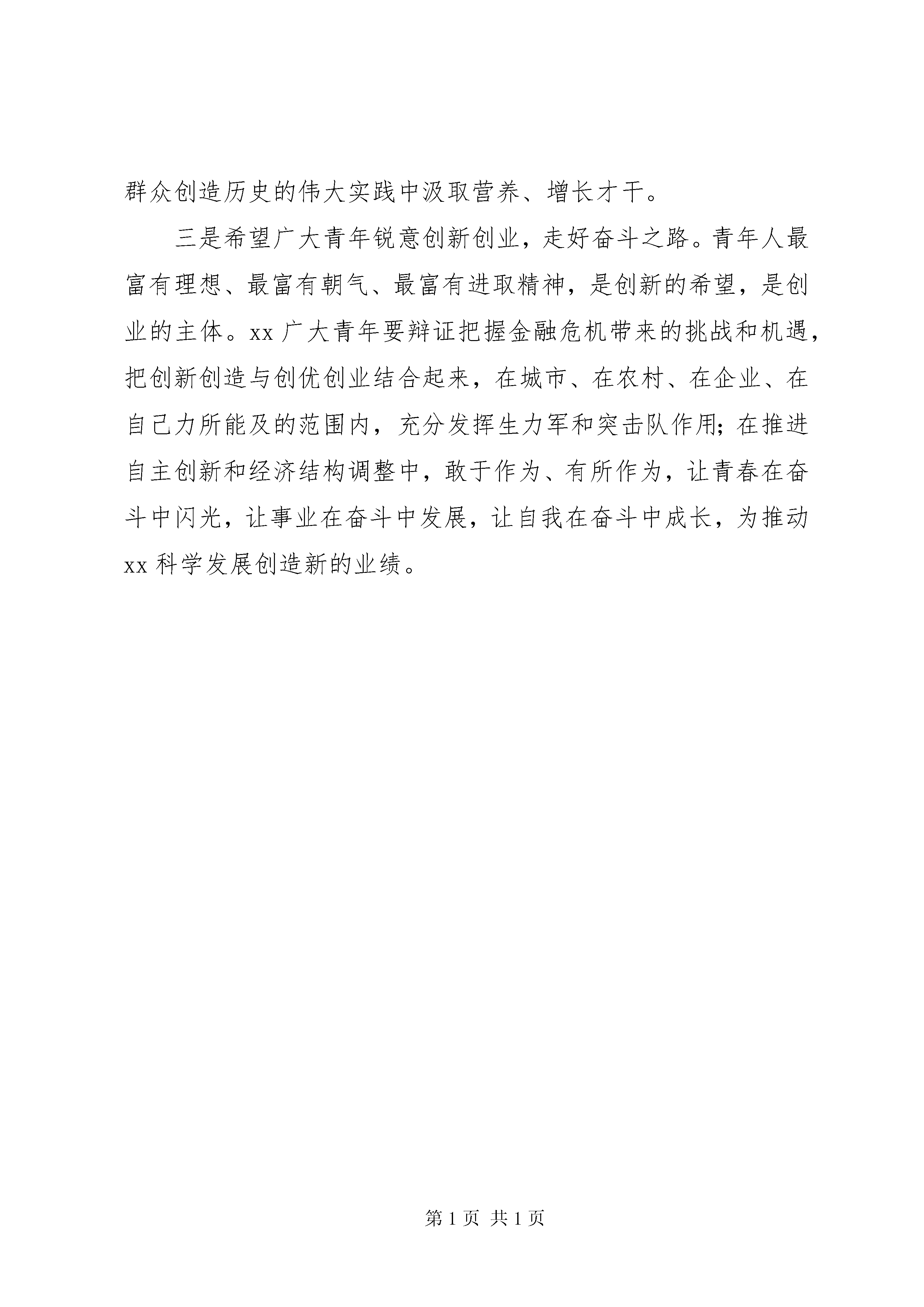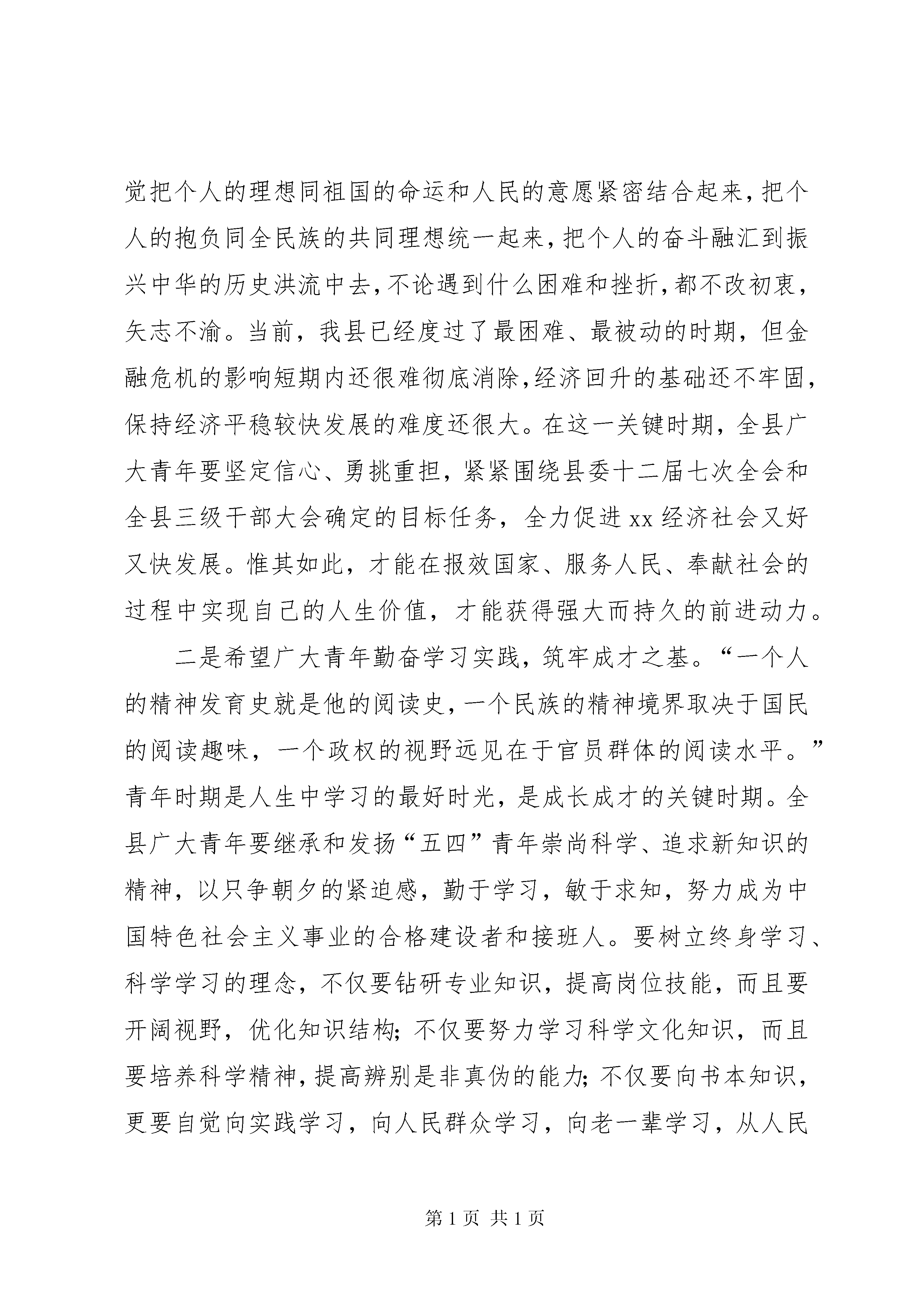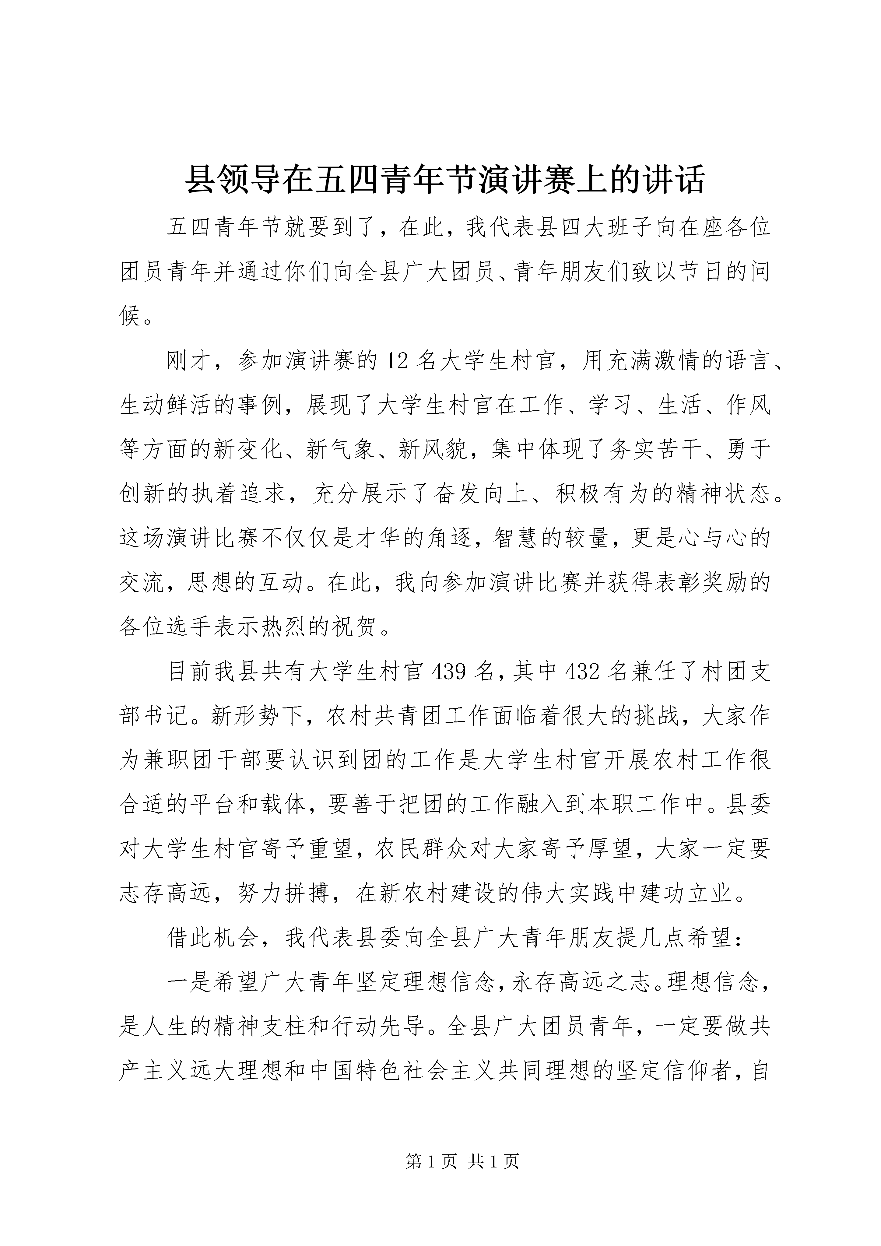 县领导在五四青年节演讲赛上的讲话五四青年节就要到了,在此,我代表县四大班子向在座各位团员青年并通过你们向全县广大团员、青年朋友们致以节日的问候。刚才,参加演讲赛的12名大学生村官,用充满激情的语言、生动鲜活的事例,展现了大学生村官在工作、学习、生活、作风等方面的新变化、新气象、新风貌,集中体现了务实苦干、勇于创新的执着追求,充分展示了奋发向上、积极有为的精神状态。这场演讲比赛不仅仅是才华的角逐,智慧的较量,更是心与心的交流,思想的互动。在此,我向参加演讲比赛并获得表彰奖励的各位选手表示热烈的祝贺。目前我县共有大学生村官439名,其中432名兼任了村团支部书记。新形势下,农村共青团工作面临着很大的挑战,大家作为兼职团干部要认识到团的工作是大学生村官开展农村工作很合适的平台和载体,要善于把团的工作融入到本职工作中。县委对大学生村官寄予重望,农民群众对大家寄予厚望,大家一定要志存高远,努力拼搏,在新农村建设的伟大实践中建功立业。借此机会,我代表县委向全县广大青年朋友提几点希望:一是希望广大青年坚定理想信念,永存高远之志。理想信念,是人生的精神支柱和行动先导。全县广大团员青年,一定要做共产主义远大理想和中国特色社会主义共同理想的坚定信仰者,自觉把个人的理想同祖国的命运和人民的意愿紧密结合起来,把个人的抱负同全民族的共同理想统一起来,把个人的奋斗融汇到振兴中华的历史洪流中去,不论遇到什么困难和挫折,都不改初衷,矢志不渝。当前,我县已经度过了最困难、最被动的时期,但金融危机的影响短期内还很难彻底消除,经济回升的基础还不牢固,保持经济平稳较快发展的难度还很大。在这一关键时期,全县广大青年要坚定信心、勇挑重担,紧紧围绕县委十二届七次全会和全县三级干部大会确定的目标任务,全力促进xx经济社会又好又快发展。惟其如此,才能在报效国家、服务人民、奉献社会的过程中实现自己的人生价值,才能获得强大而持久的前进动力。二是希望广大青年勤奋学习实践,筑牢成才之基。“一个人的精神发育史就是他的阅读史,一个民族的精神境界取决于国民的阅读趣味,一个政权的视野远见在于官员群体的阅读水平。”青年时期是人生中学习的最好时光,是成长成才的关键时期。全县广大青年要继承和发扬“五四”青年崇尚科学、追求新知识的精神,以只争朝夕的紧迫感,勤于学习,敏于求知,努力成为中国特色社会主义事业的合格建设者和接班人。要树立终身学习、科学学习的理念,不仅要钻研专业知识,提高岗位技能,而且要开阔视野,优化知识结构;不仅要努力学习科学文化知识,而且要培养科学精神,提高辨别是非真伪的能力;不仅要向书本知识,更要自觉向实践学习,向人民群众学习,向老一辈学习,从人民群众创造历史的伟大实践中汲取营养、增长才干。三是希望广大青年锐意创新创业,走好奋斗之路。青年人最富有理想、最富有朝气、最富有进取精神,是创新的希望,是创业的主体。xx广大青年要辩证把握金融危机带来的挑战和机遇,把创新创造与创优创业结合起来,在城市、在农村、在企业、在自己力所能及的范围内,充分发挥生力军和突击队作用;在推进自主创新和经济结构调整中,敢于作为、有所作为,让青春在奋斗中闪光,让事业在奋斗中发展,让自我在奋斗中成长,为推动xx科学发展创造新的业绩。