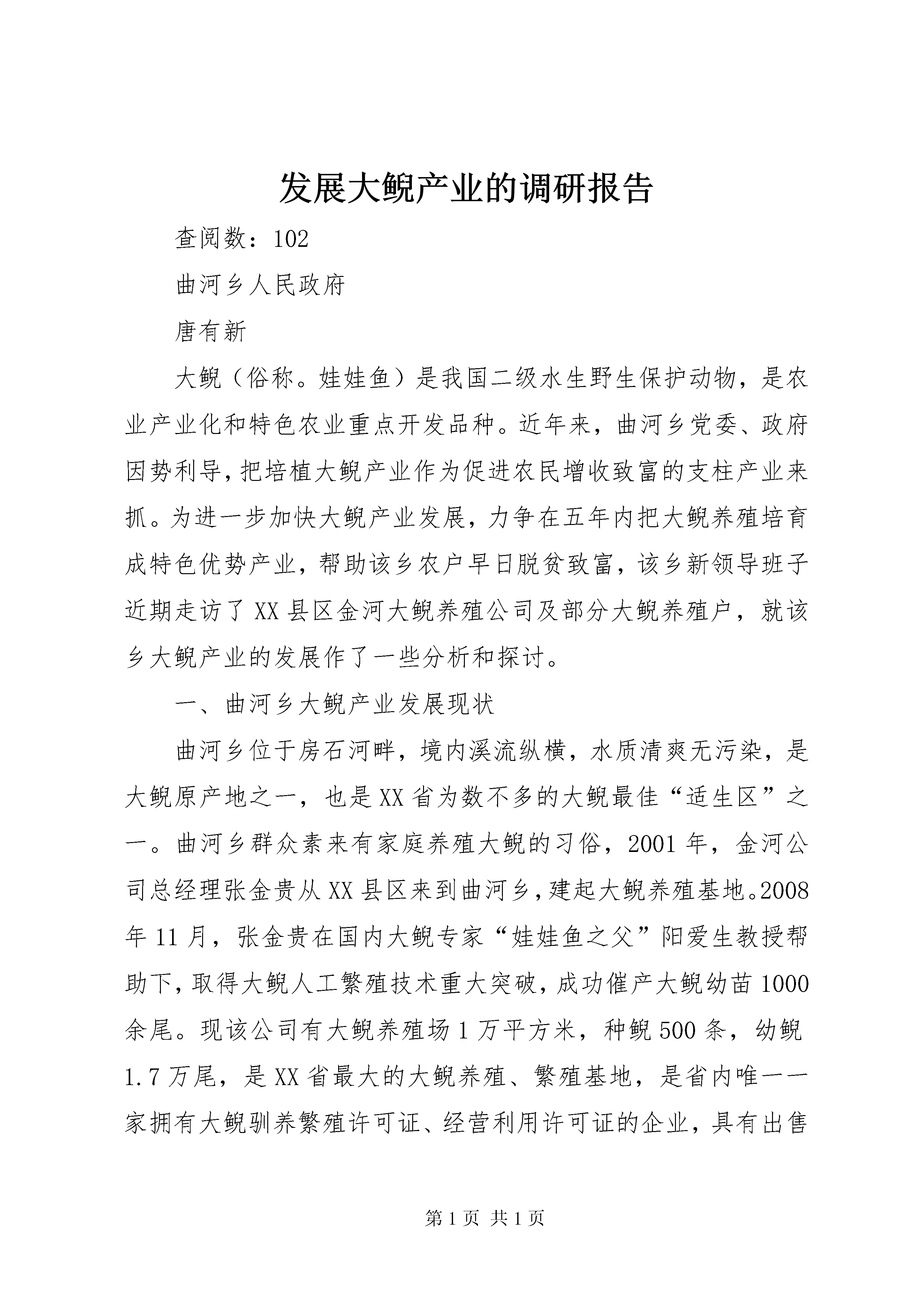 发展大鲵产业的调研报告查阅数:102曲河乡人民政府唐有新大鲵(俗称。娃娃鱼)是我国二级水生野生保护动物,是农业产业化和特色农业重点开发品种。近年来,曲河乡党委、政府因势利导,把培植大鲵产业作为促进农民增收致富的支柱产业来抓。为进一步加快大鲵产业发展,力争在五年内把大鲵养殖培育成特色优势产业,帮助该乡农户早日脱贫致富,该乡新领导班子近期走访了XX县区金河大鲵养殖公司及部分大鲵养殖户,就该乡大鲵产业的发展作了一些分析和探讨。一、曲河乡大鲵产业发展现状曲河乡位于房石河畔,境内溪流纵横,水质清爽无污染,是大鲵原产地之一,也是XX省为数不多的大鲵最佳“适生区”之一。曲河乡群众素来有家庭养殖大鲵的习俗,2001年,金河公司总经理张金贵从XX县区来到曲河乡,建起大鲵养殖基地。2008年11月,张金贵在国内大鲵专家“娃娃鱼之父”阳爱生教授帮助下,取得大鲵人工繁殖技术重大突破,成功催产大鲵幼苗1000余尾。现该公司有大鲵养殖场1万平方米,种鲵500条,幼鲵1.7万尾,是XX省最大的大鲵养殖、繁殖基地,是省内唯一一家拥有大鲵驯养繁殖许可证、经营利用许可证的企业,具有出售商品大鲵(子二代)经营资格。2009年,曲河乡党委、政府争取XX县区援建资金40万元,将大鲵人工养殖作为助农增收的特色优势产业进行培育发展,先后两次组织32户农户赴陕西汉中考察学习大鲵养殖,专题组织大鲵养殖技术培训一次,培训农户250余人,2010年上半年成功在青城、王家发展大鲵养殖户50户,养殖大鲵1120尾。在曲河繁殖、发展大鲵产业具有明显的生态优势、技术优势、价格优势和品牌优势,经济效益十分显著,是农民致富的好门路。但是,我们也发现,由于大鲵产业的高投入,农户自主发展积极性不高,同时,随着大鲵产业的快速发展,面临着疫病、市场等风险,亟待政府引导、规范和解决。二、存在问题及原因分析(一)缺乏资金投入,农户养殖规模小根据今年市场综合行情测算,5-6cm幼鲵售价在每尾600至650元之间,按照每户养殖50尾计算,仅购鱼苗一项就需一次性投入3万元以上,目前,我乡农户在农房重建后普遍缺乏资金,养殖(户)很难从银行获得贷款,绝大多数只能靠从亲戚朋友筹借,融资数额非常有限,致使养殖规模化小。到现在为止,我乡养殖规模达200尾以上的农户仅有李婷婷一家,而有一些条件、有技术的养殖户如李廷树、张大鹏等,都因资金不足,养殖规模一直徘徊在50尾左右。(二)农户缺乏投资意识,农户养殖发展慢大鲵养殖产业是一项高回报产业,但同时也是一项高投入、高风险产业,成品鲵的成长周期一般3-4年,收益见效相对较慢,受市场影响大,具有一定风险,发展大鲵产业,农户必须要有较强的投资意识和风险意识。目前,曲河大多数农户虽有意发展大鲵产业,但真正舍得投入资金发展的农户不是很多,造成我乡大鲵产业主要集中在金河大鲵养殖公司,群众参与度低,产业总体发展较慢。(三)缺乏技术力量,养殖风险大大鲵在人工养殖环境中,由于环境、饵料、密度等影响,发病率较高,需要养殖户掌握较好的技术,同时,需要农户加强日常管理,注重预防,如有疾病发生,普通养殖户由于缺乏技术很难防治,大鲵死亡率较高,会给农户造成较大的经济损失。同时,农户缺乏大鲵人工繁殖技术,目前只有金河大鲵养殖公司掌握了大鲵人工繁殖技术,技术较好的李婷婷养殖户,由于场地环境等条件限制无法开展人工繁殖,而大鲵产业中繁殖利润远远高于养殖利润,且市场风险相对较小。(四)缺乏政策扶持,服务滞后曲河大鲵产业的快速发展,是在曲河乡党委、政府的高度重视下以及在巨大的效益驱动下的群众积极参与。但目前政策上没有一定的扶持措施,产业尚处于相对自由发展阶段。面对这一新兴特种养殖产业,渔政部门没有建立起技术、疫病防治、流通等服务体系,大鲵属国家二级野生保护动物,根据国家《野生动物保护法》和《水生野生动物保护实施条例》等规定,驯养繁殖大鲵需要办理省级驯养繁殖许可证;经营利用需要办理国家经营利用许可证;销售运输要办省级运输证。我乡除金河大鲵养殖公司外大鲵驯养户属于无证驯养繁殖和经营利用,养殖户的权利得不到有效保障。三、大鲵产业前景分析大鲵市场需求大,社会风险小,养殖效益突出,养殖技术简单,便于大规模推广。目前,XX省、XX省、XX省部分市、县早已确立了大鲵的主导产业地位,发展力度大,势头猛。我乡发展大鲵起步较早,群众基础较好,位于曲河乡的金河大鲵养殖公司通过近十年的发展,成功地掌握了大鲵人工繁育、养殖技术,为曲河和青川较大规模发展大鲵产业奠定了扎实基础,优势明显,目前,曲河大鲵产业走在XX市乃至XX省的前列。(一)大鲵市场需求大随着人们生活水平提高,对大鲵的消费需求逐年增加,而科学研究、展览、药用等行业对大鲵的需求也有增无减,当前市场上主要以活体商品鲵为产品直接销售至酒店,一般池边价3000元