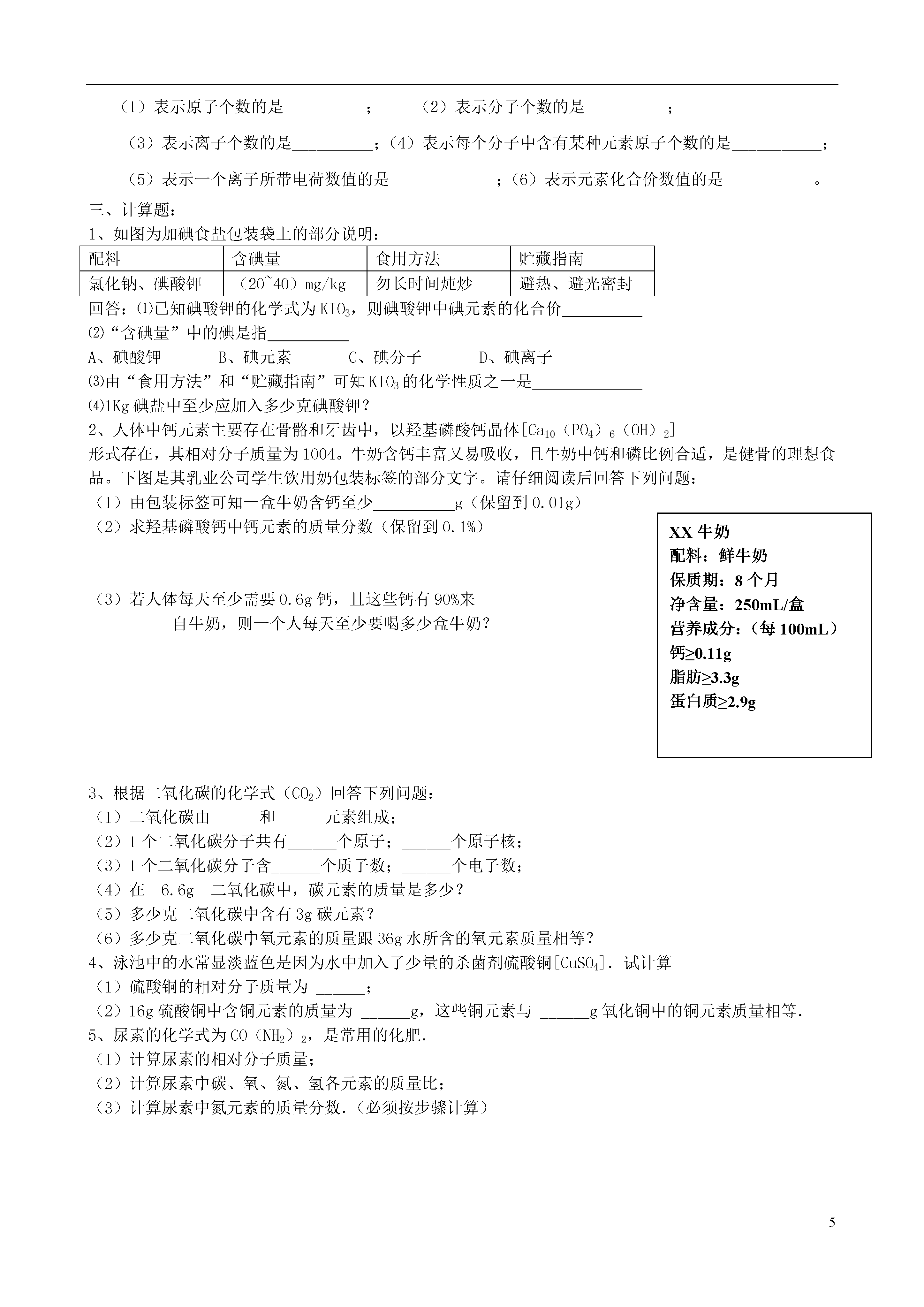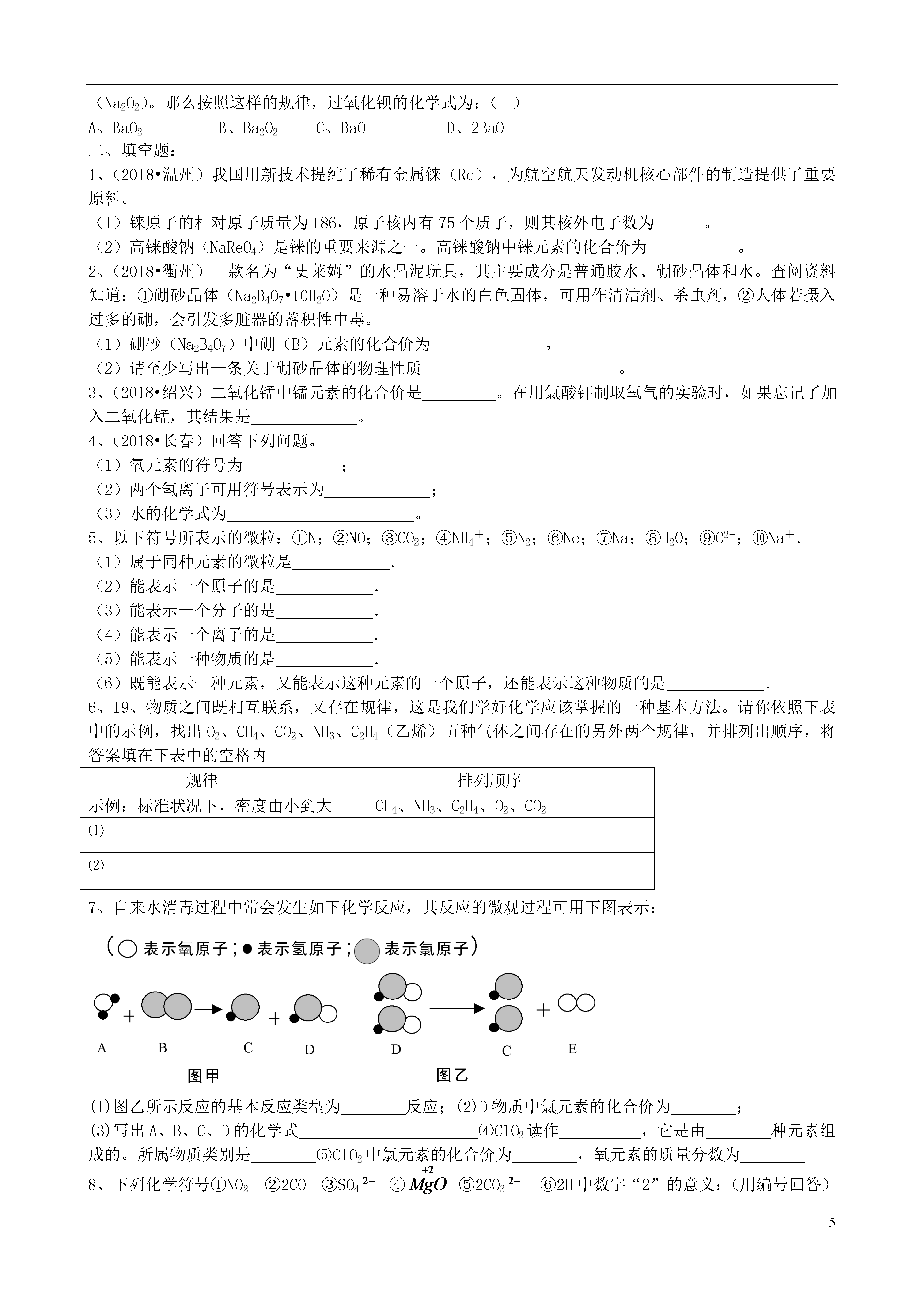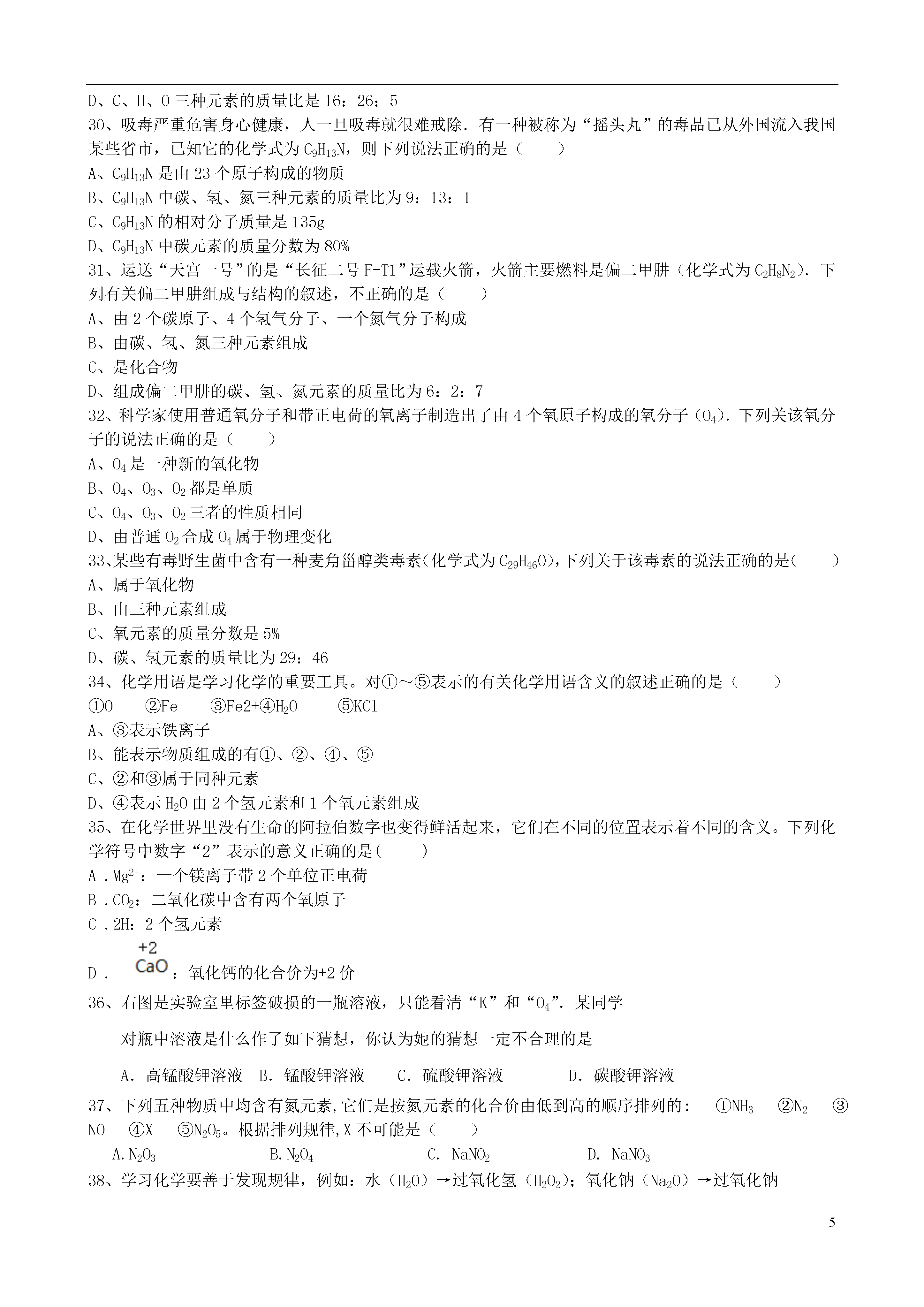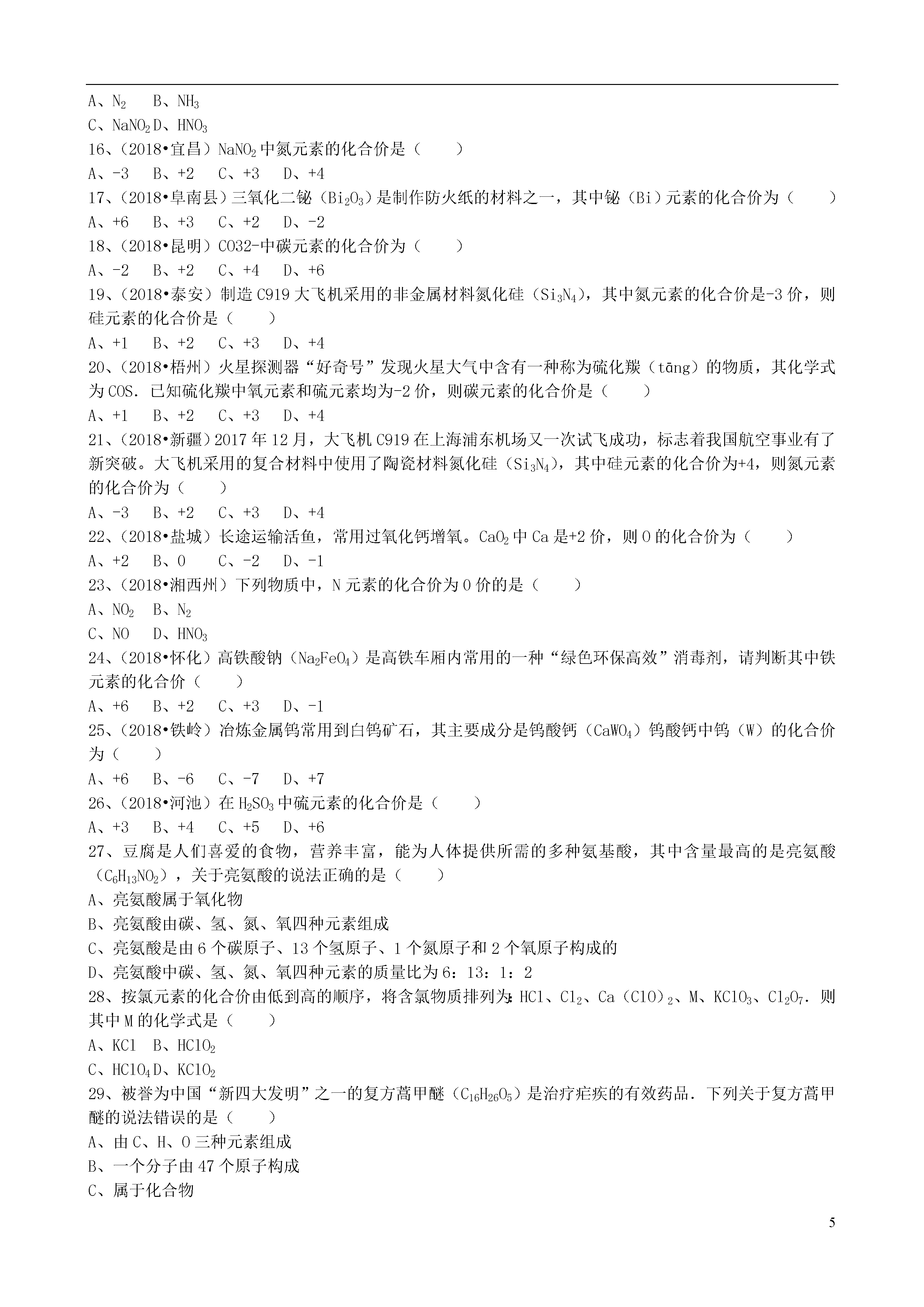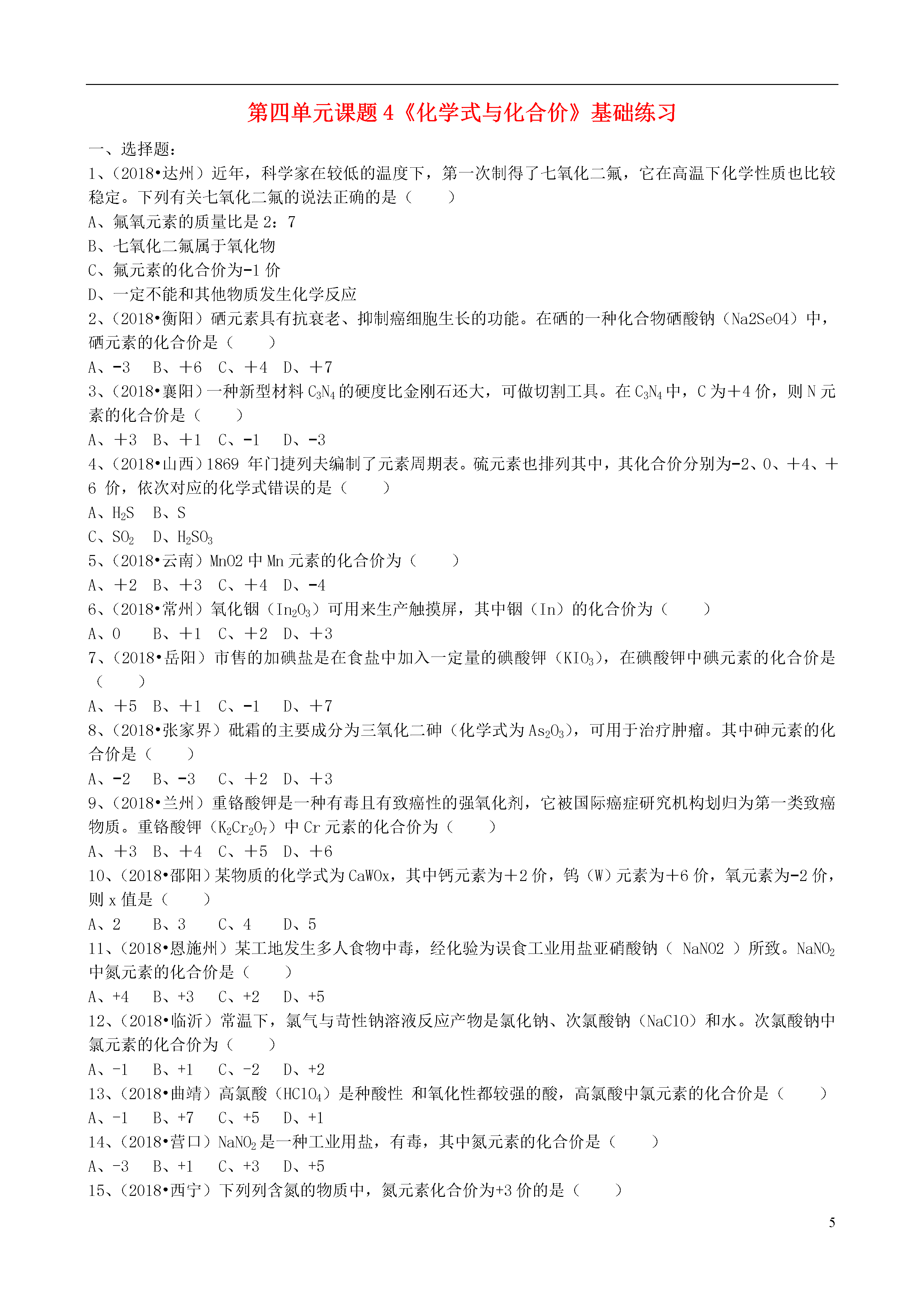 5第四单元课题4《化学式与化合价》基础练习一、选择题:1、(2018•达州)近年,科学家在较低的温度下,第一次制得了七氧化二氟,它在高温下化学性质也比较稳定。下列有关七氧化二氟的说法正确的是()A、氟氧元素的质量比是2:7B、七氧化二氟属于氧化物C、氟元素的化合价为−1价D、一定不能和其他物质发生化学反应2、(2018•衡阳)硒元素具有抗衰老、抑制癌细胞生长的功能。在硒的一种化合物硒酸钠(Na2SeO4)中,硒元素的化合价是()A、−3B、+6C、+4D、+73、(2018•襄阳)一种新型材料C3N4的硬度比金刚石还大,可做切割工具。在C3N4中,C为+4价,则N元素的化合价是()A、+3B、+1C、−1D、−34、(2018•山西)1869年门捷列夫编制了元素周期表。硫元素也排列其中,其化合价分别为−2、0、+4、+6价,依次对应的化学式错误的是()A、H2SB、SC、SO2D、H2SO35、(2018•云南)MnO2中Mn元素的化合价为()A、+2B、+3C、+4D、−46、(2018•常州)氧化铟(In2O3)可用来生产触摸屏,其中铟(In)的化合价为()A、0B、+1C、+2D、+37、(2018•岳阳)市售的加碘盐是在食盐中加入一定量的碘酸钾(KIO3),在碘酸钾中碘元素的化合价是()A、+5B、+1C、−1D、+78、(2018•张家界)砒霜的主要成分为三氧化二砷(化学式为As2O3),可用于治疗肿瘤。其中砷元素的化合价是()A、−2B、−3C、+2D、+39、(2018•兰州)重铬酸钾是一种有毒且有致癌性的强氧化剂,它被国际癌症研究机构划归为第一类致癌物质。重铬酸钾(K2Cr2O7)中Cr元素的化合价为()A、+3B、+4C、+5D、+610、(2018•邵阳)某物质的化学式为CaWOx,其中钙元素为+2价,钨(W)元素为+6价,氧元素为−2价,则x值是()A、2B、3C、4D、511、(2018•恩施州)某工地发生多人食物中毒,经化验为误食工业用盐亚硝酸钠(NaNO2)所致。NaNO2中氮元素的化合价是()A、+4B、+3C、+2D、+512、(2018•临沂)常温下,氯气与苛性钠溶液反应产物是氯化钠、次氯酸钠(NaClO)和水。次氯酸钠中氯元素的化合价为()A、-1B、+1C、-2D、+213、(2018•曲靖)高氯酸(HClO4)是种酸性和氧化性都较强的酸,高氯酸中氯元素的化合价是()A、-1B、+7C、+5D、+114、(2018•营口)NaNO2是一种工业用盐,有毒,其中氮元素的化合价是()A、-3B、+1C、+3D、+515、(2018•西宁)下列列含氮的物质中,氮元素化合价为+3价的是()A、N2B、NH3C、NaNO2D、HNO316、(2018•宜昌)NaNO2中氮元素的化合价是()A、-3B、+2C、+3D、+417、(2018•阜南县)三氧化二铋(Bi2O3)是制作防火纸的材料之一,其中铋(Bi)元素的化合价为()A、+6B、+3C、+2D、-218、(2018•昆明)CO32-中碳元素的化合价为()A、-2B、+2C、+4D、+619、(2018•泰安)制造C919大飞机采用的非金属材料氮化硅(Si3N4),其中氮元素的化合价是-3价,则硅元素的化合价是()A、+1B、+2C、+3D、+420、(2018•梧州)火星探测器“好奇号”发现火星大气中含有一种称为硫化羰(tāng)的物质,其化学式为COS.已知硫化羰中氧元素和硫元素均为-2价,则碳元素的化合价是()A、+1B、+2C、+3D、+421、(2018•新疆)2017年12月,大飞机C919在上海浦东机场又一次试飞成功,标志着我国航空事业有了新突破。大飞机采用的复合材料中使用了陶瓷材料氮化硅(Si3N4),其中硅元素的化合价为+4,则氮元素的化合价为()A、-3B、+2C、+3D、+422、(2018•盐城)长途运输活鱼,常用过氧化钙增氧。CaO2中Ca是+2价,则O的化合价为()A、+2B、0C、-2D、-123、(2018•湘西州)下列物质中,N元素的化合价为0价的是()A、NO2B、N2C、NOD、HNO324、(2018•怀化)高铁酸钠(Na2FeO4)是高铁车厢内常用的一种“绿色环保高效”消毒剂,请判断其中铁元素的化合价()A、+6B、+2C、+3D、-125、(2018•铁岭)冶炼金属钨常用到白钨矿石,其主要成分是钨酸钙(CaWO4)钨酸钙中钨(W)的化合价为()A、+6B、-6C、-7D、+726、(2018•河池)在H2SO3中硫元素的化合价是()A、+3B、+4C、+5D、+627、
