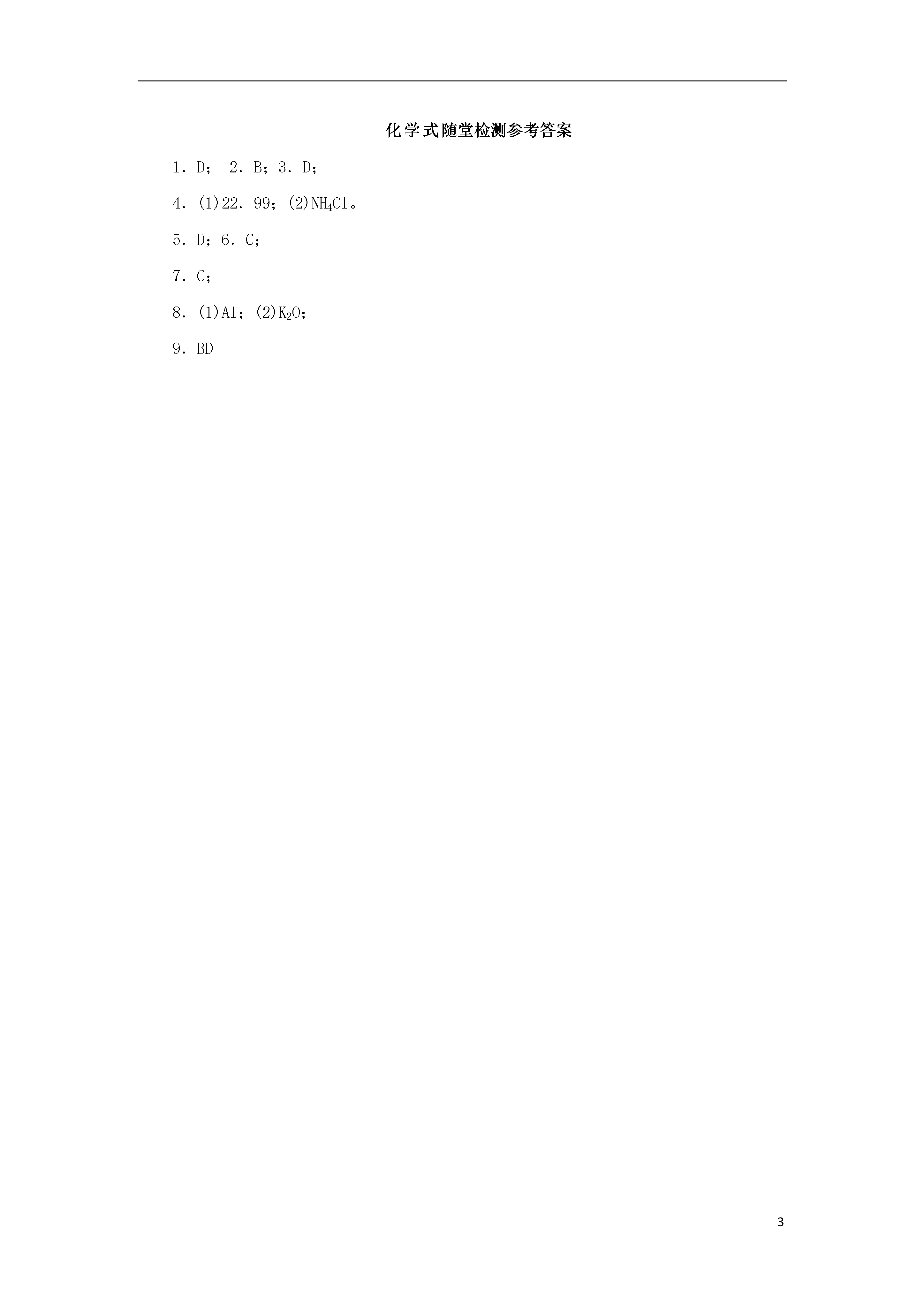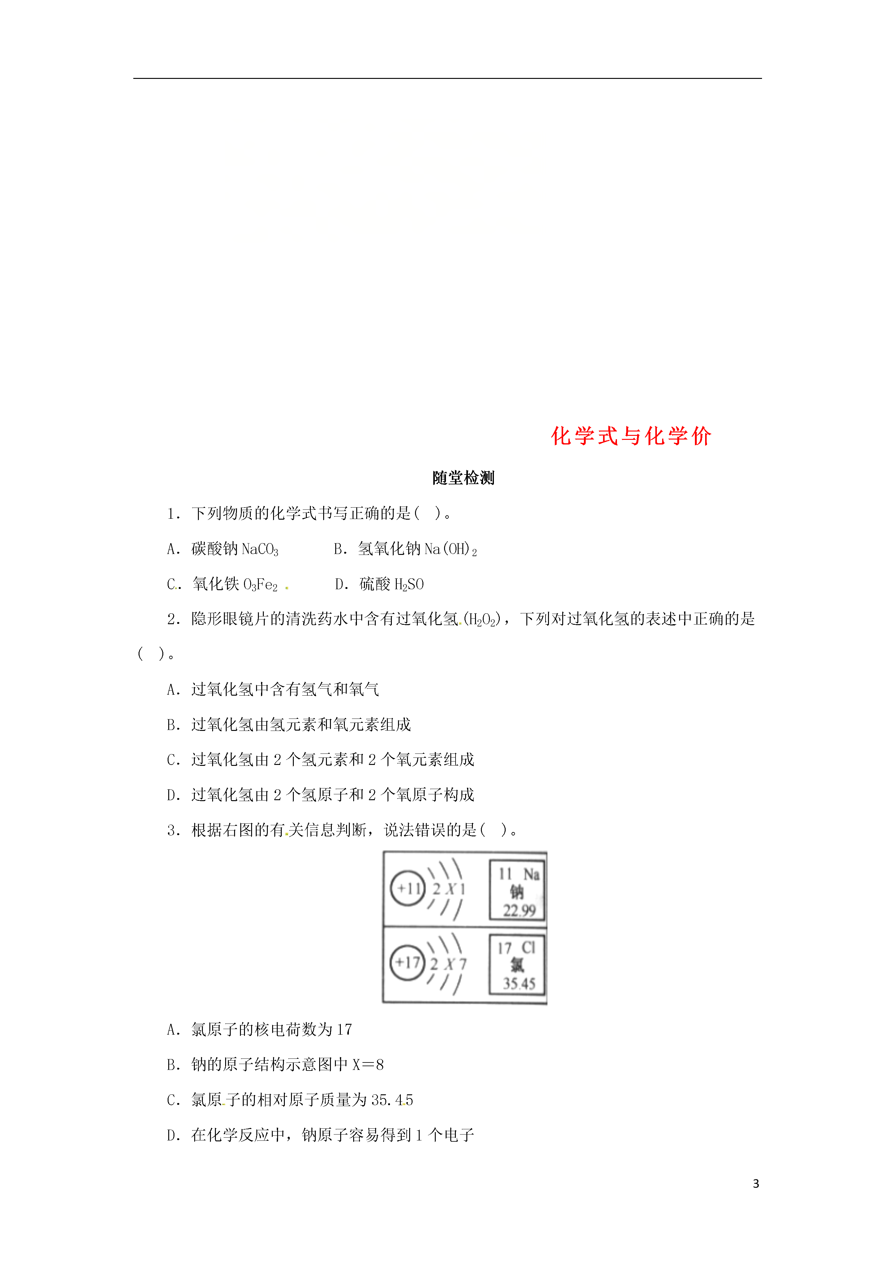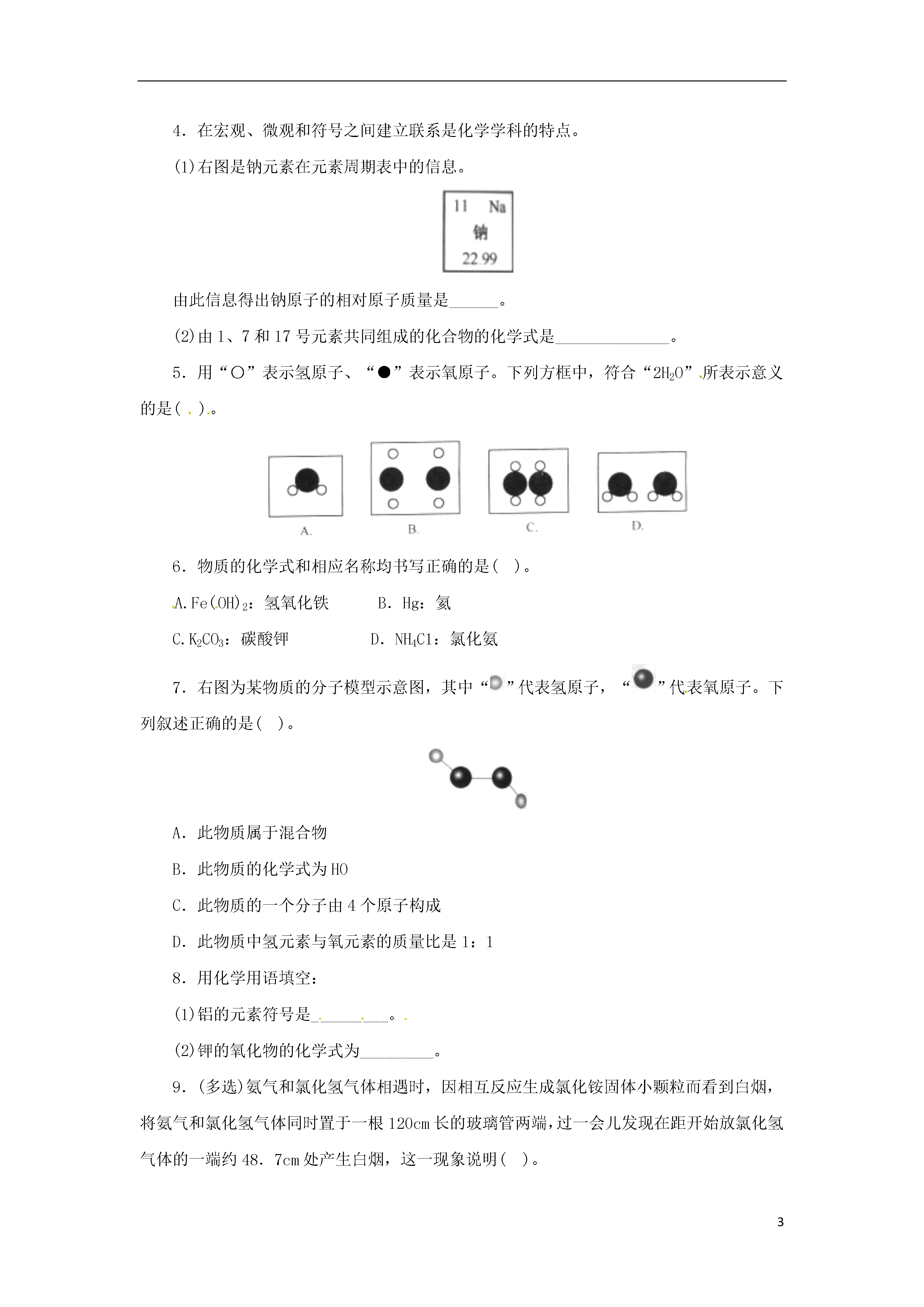 3化学式与化学价随堂检测1.下列物质的化学式书写正确的是()。A.碳酸钠NaCO3B.氢氧化钠Na(OH)2C.氧化铁O3Fe2D.硫酸H2SO2.隐形眼镜片的清洗药水中含有过氧化氢(H2O2),下列对过氧化氢的表述中正确的是()。A.过氧化氢中含有氢气和氧气B.过氧化氢由氢元素和氧元素组成C.过氧化氢由2个氢元素和2个氧元素组成D.过氧化氢由2个氢原子和2个氧原子构成3.根据右图的有关信息判断,说法错误的是()。A.氯原子的核电荷数为17B.钠的原子结构示意图中X=8C.氯原子的相对原子质量为35.45D.在化学反应中,钠原子容易得到1个电子4.在宏观、微观和符号之间建立联系是化学学科的特点。(1)右图是钠元素在元素周期表中的信息。由此信息得出钠原子的相对原子质量是______。(2)由1、7和17号元素共同组成的化合物的化学式是______________。5.用“〇”表示氢原子、“●”表示氧原子。下列方框中,符合“2H2O”所表示意义的是()。6.物质的化学式和相应名称均书写正确的是()。A.Fe(OH)2:氢氧化铁B.Hg:氦C.K2CO3:碳酸钾D.NH4C1:氯化氨7.右图为某物质的分子模型示意图,其中“”代表氢原子,“”代表氧原子。下列叙述正确的是()。A.此物质属于混合物B.此物质的化学式为HOC.此物质的一个分子由4个原子构成D.此物质中氢元素与氧元素的质量比是1:18.用化学用语填空:(1)铝的元素符号是_________。(2)钾的氧化物的化学式为_________。9.(多选)氨气和氯化氢气体相遇时,因相互反应生成氯化铵固体小颗粒而看到白烟,将氨气和氯化氢气体同时置于一根120cm长的玻璃管两端,过一会儿发现在距开始放氯化氢气体的一端约48.7cm处产生白烟,这一现象说明()。A.氨气和氯化氢气体都极易溶于水B.分子是不断运动的C.非金属元素间形成的化合物都由分子构成D.相对分子质量越小,分子运动越快化学式随堂检测参考答案1.D;2.B;3.D;4.(1)22.99;(2)NH4Cl。5.D;6.C;7.C;8.(1)Al;(2)K2O;9.BD