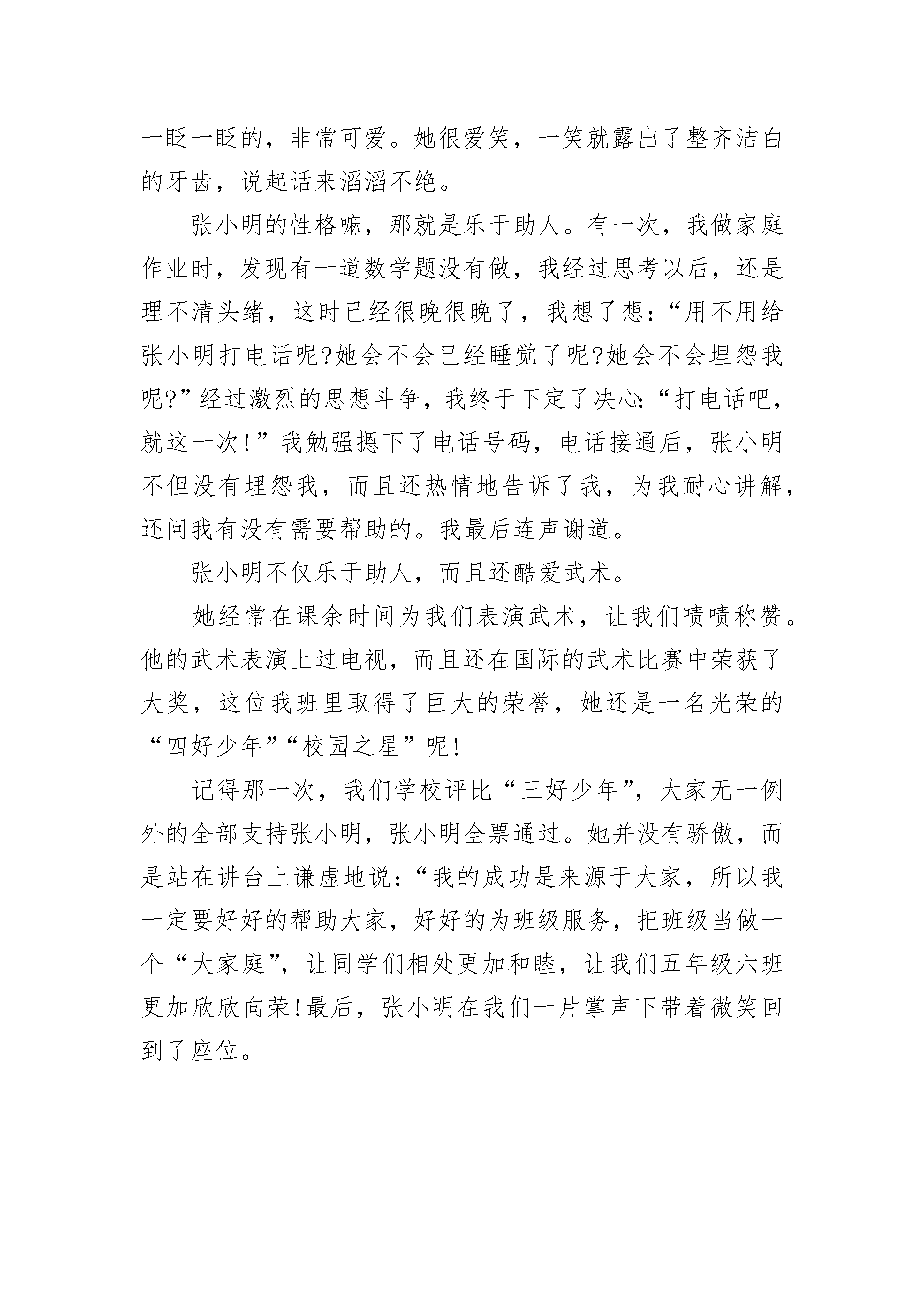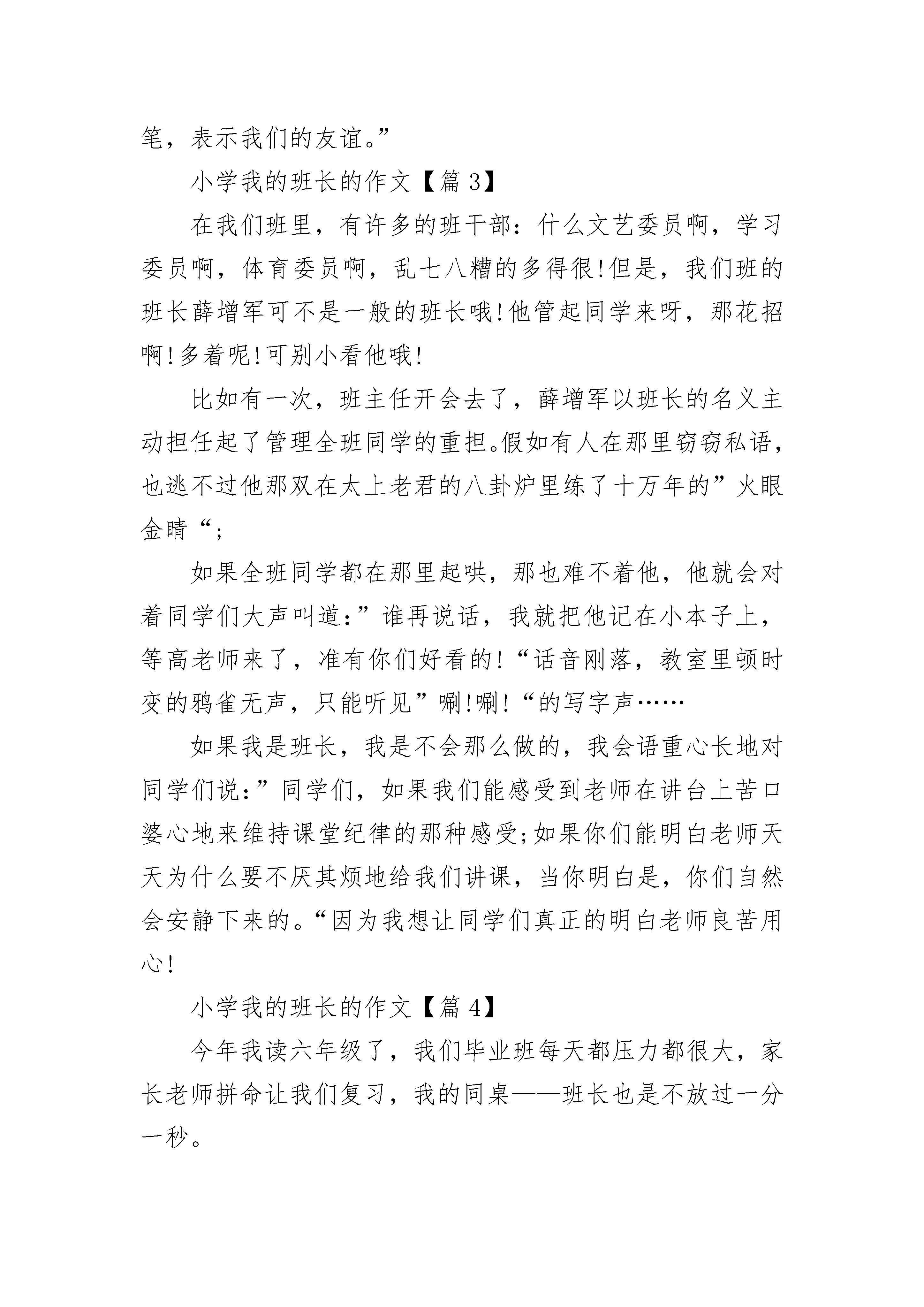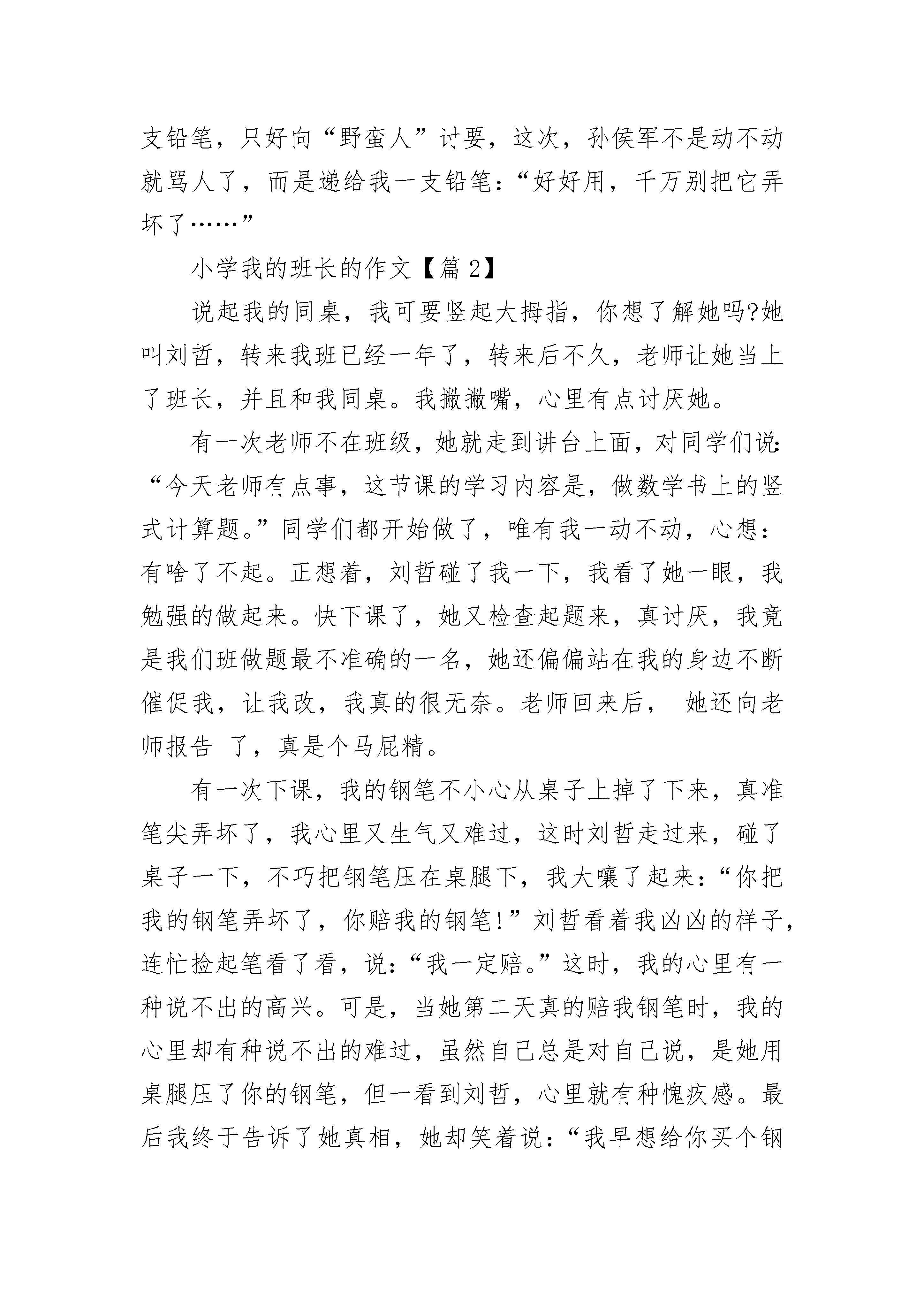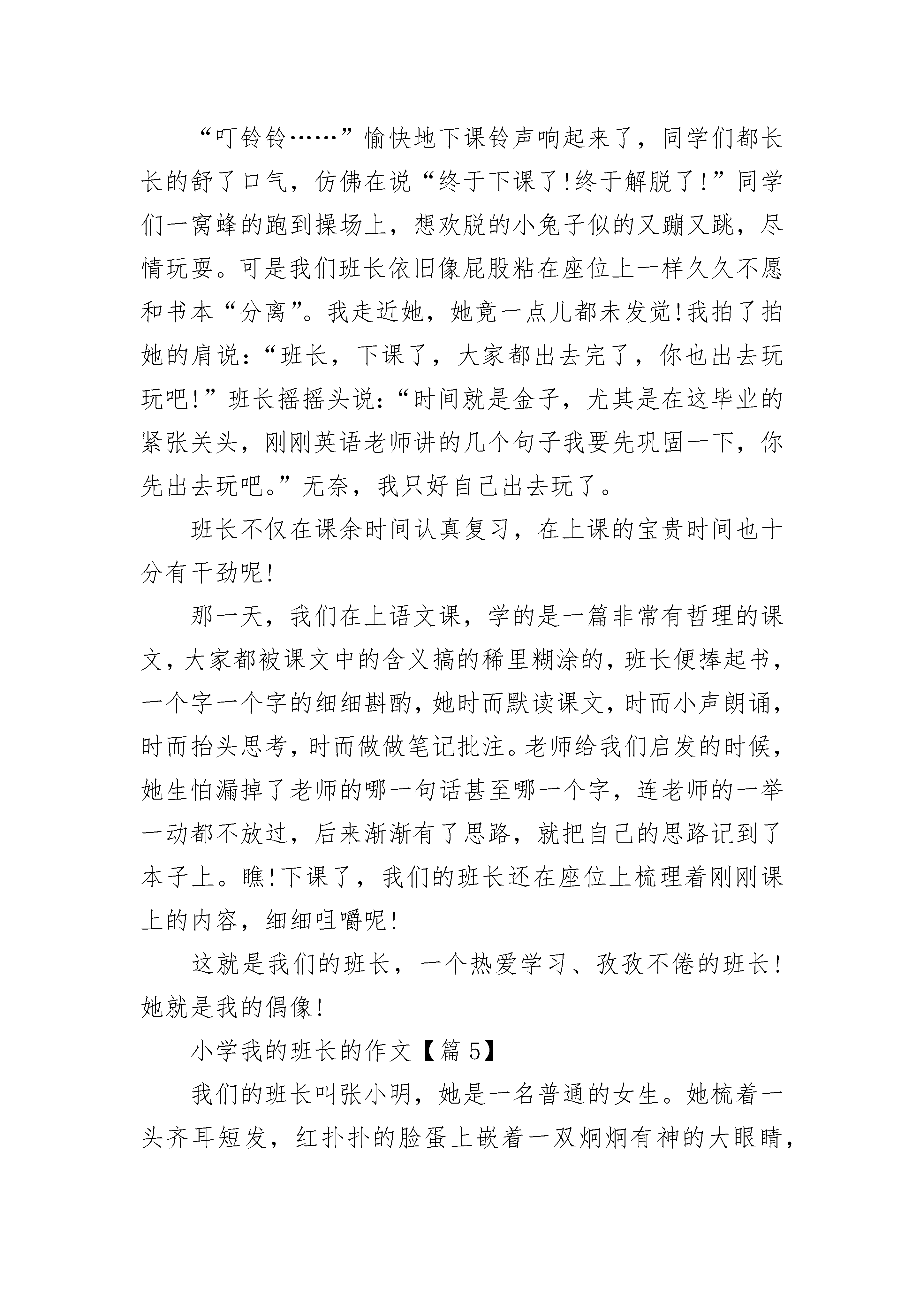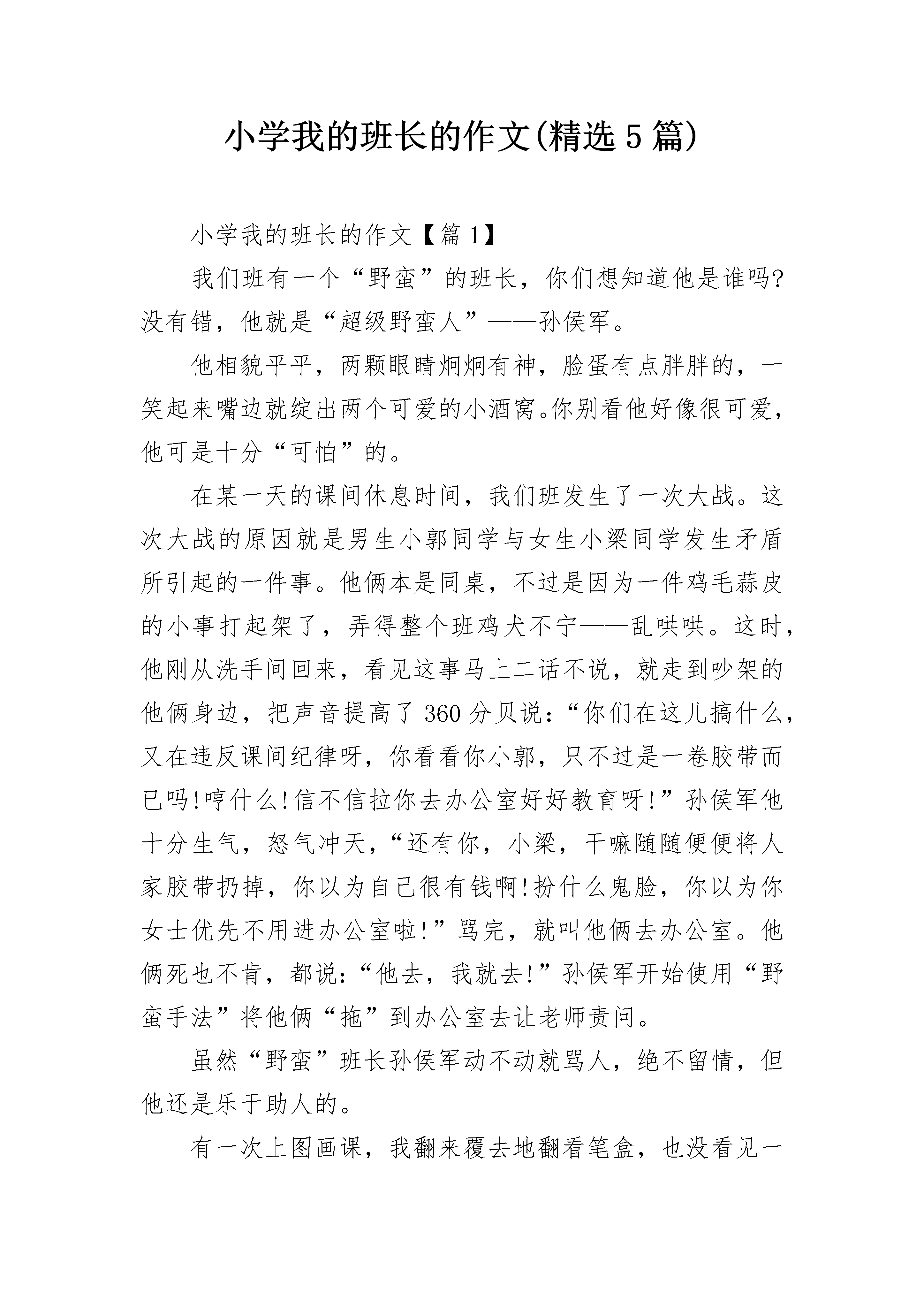 小学我的班长的作文(精选5篇)小学我的班长的作文【篇1】我们班有一个“野蛮”的班长,你们想知道他是谁吗?没有错,他就是“超级野蛮人”——孙侯军。他相貌平平,两颗眼睛炯炯有神,脸蛋有点胖胖的,一笑起来嘴边就绽出两个可爱的小酒窝。你别看他好像很可爱,他可是十分“可怕”的。在某一天的课间休息时间,我们班发生了一次大战。这次大战的原因就是男生小郭同学与女生小梁同学发生矛盾所引起的一件事。他俩本是同桌,不过是因为一件鸡毛蒜皮的小事打起架了,弄得整个班鸡犬不宁——乱哄哄。这时,他刚从洗手间回来,看见这事马上二话不说,就走到吵架的他俩身边,把声音提高了360分贝说:“你们在这儿搞什么,又在违反课间纪律呀,你看看你小郭,只不过是一卷胶带而已吗!哼什么!信不信拉你去办公室好好教育呀!”孙侯军他十分生气,怒气冲天,“还有你,小梁,干嘛随随便便将人家胶带扔掉,你以为自己很有钱啊!扮什么鬼脸,你以为你女士优先不用进办公室啦!”骂完,就叫他俩去办公室。他俩死也不肯,都说:“他去,我就去!”孙侯军开始使用“野蛮手法”将他俩“拖”到办公室去让老师责问。虽然“野蛮”班长孙侯军动不动就骂人,绝不留情,但他还是乐于助人的。有一次上图画课,我翻来覆去地翻看笔盒,也没看见一支铅笔,只好向“野蛮人”讨要,这次,孙侯军不是动不动就骂人了,而是递给我一支铅笔:“好好用,千万别把它弄坏了……”小学我的班长的作文【篇2】说起我的同桌,我可要竖起大拇指,你想了解她吗?她叫刘哲,转来我班已经一年了,转来后不久,老师让她当上了班长,并且和我同桌。我撇撇嘴,心里有点讨厌她。有一次老师不在班级,她就走到讲台上面,对同学们说:“今天老师有点事,这节课的学习内容是,做数学书上的竖式计算题。”同学们都开始做了,唯有我一动不动,心想:有啥了不起。正想着,刘哲碰了我一下,我看了她一眼,我勉强的做起来。快下课了,她又检查起题来,真讨厌,我竟是我们班做题最不准确的一名,她还偏偏站在我的身边不断催促我,让我改,我真的很无奈。老师回来后,她还向老师报告了,真是个马屁精。有一次下课,我的钢笔不小心从桌子上掉了下来,真准笔尖弄坏了,我心里又生气又难过,这时刘哲走过来,碰了桌子一下,不巧把钢笔压在桌腿下,我大嚷了起来:“你把我的钢笔弄坏了,你赔我的钢笔!”刘哲看着我凶凶的样子,连忙捡起笔看了看,说:“我一定赔。”这时,我的心里有一种说不出的高兴。可是,当她第二天真的赔我钢笔时,我的心里却有种说不出的难过,虽然自己总是对自己说,是她用桌腿压了你的钢笔,但一看到刘哲,心里就有种愧疚感。最后我终于告诉了她真相,她却笑着说:“我早想给你买个钢笔,表示我们的友谊。”小学我的班长的作文【篇3】在我们班里,有许多的班干部:什么文艺委员啊,学习委员啊,体育委员啊,乱七八糟的多得很!但是,我们班的班长薛增军可不是一般的班长哦!他管起同学来呀,那花招啊!多着呢!可别小看他哦!比如有一次,班主任开会去了,薛增军以班长的名义主动担任起了管理全班同学的重担。假如有人在那里窃窃私语,也逃不过他那双在太上老君的八卦炉里练了十万年的”火眼金睛“;如果全班同学都在那里起哄,那也难不着他,他就会对着同学们大声叫道:”谁再说话,我就把他记在小本子上,等高老师来了,准有你们好看的!“话音刚落,教室里顿时变的鸦雀无声,只能听见”唰!唰!“的写字声……如果我是班长,我是不会那么做的,我会语重心长地对同学们说:”同学们,如果我们能感受到老师在讲台上苦口婆心地来维持课堂纪律的那种感受;如果你们能明白老师天天为什么要不厌其烦地给我们讲课,当你明白是,你们自然会安静下来的。“因为我想让同学们真正的明白老师良苦用心!小学我的班长的作文【篇4】今年我读六年级了,我们毕业班每天都压力都很大,家长老师拼命让我们复习,我的同桌——班长也是不放过一分一秒。“叮铃铃……”愉快地下课铃声响起来了,同学们都长长的舒了口气,仿佛在说“终于下课了!终于解脱了!”同学们一窝蜂的跑到操场上,想欢脱的小兔子似的又蹦又跳,尽情玩耍。可是我们班长依旧像屁股粘在座位上一样久久不愿和书本“分离”。我走近她,她竟一点儿都未发觉!我拍了拍她的肩说:“班长,下课了,大家都出去完了,你也出去玩玩吧!”班长摇摇头说:“时间就是金子,尤其是在这毕业的紧张关头,刚刚英语老师讲的几个句子我要先巩固一下,你先出去玩吧。”无奈,我只好自己出去玩了。班长不仅在课余时间认真复习,在上课的宝贵时间也十分有干劲呢!那一天,我们在上语文课,学的是一篇非常有哲理的课文,大家都被课文中的含义搞的稀里糊涂的,班长便捧起书,一个字一个字的细细斟酌,她时而默读课文,时而小声朗诵,时而抬头思考,时而做做笔记批注。老师给我们启发的时候,她生怕漏掉了老师的哪一句话甚至哪一个字,连老师的一举一动都不放过,后来渐渐有了思路,就把自己的思路记