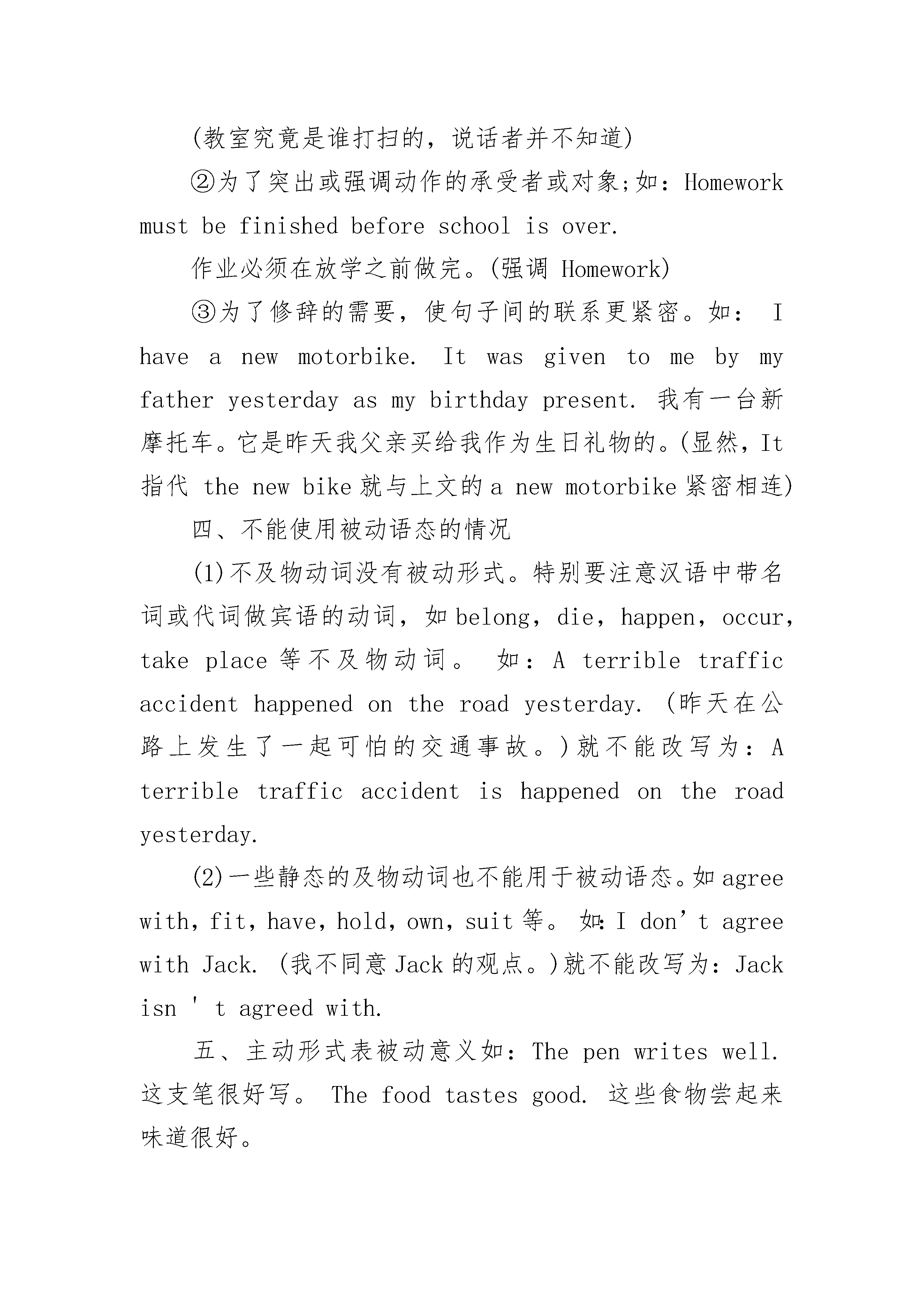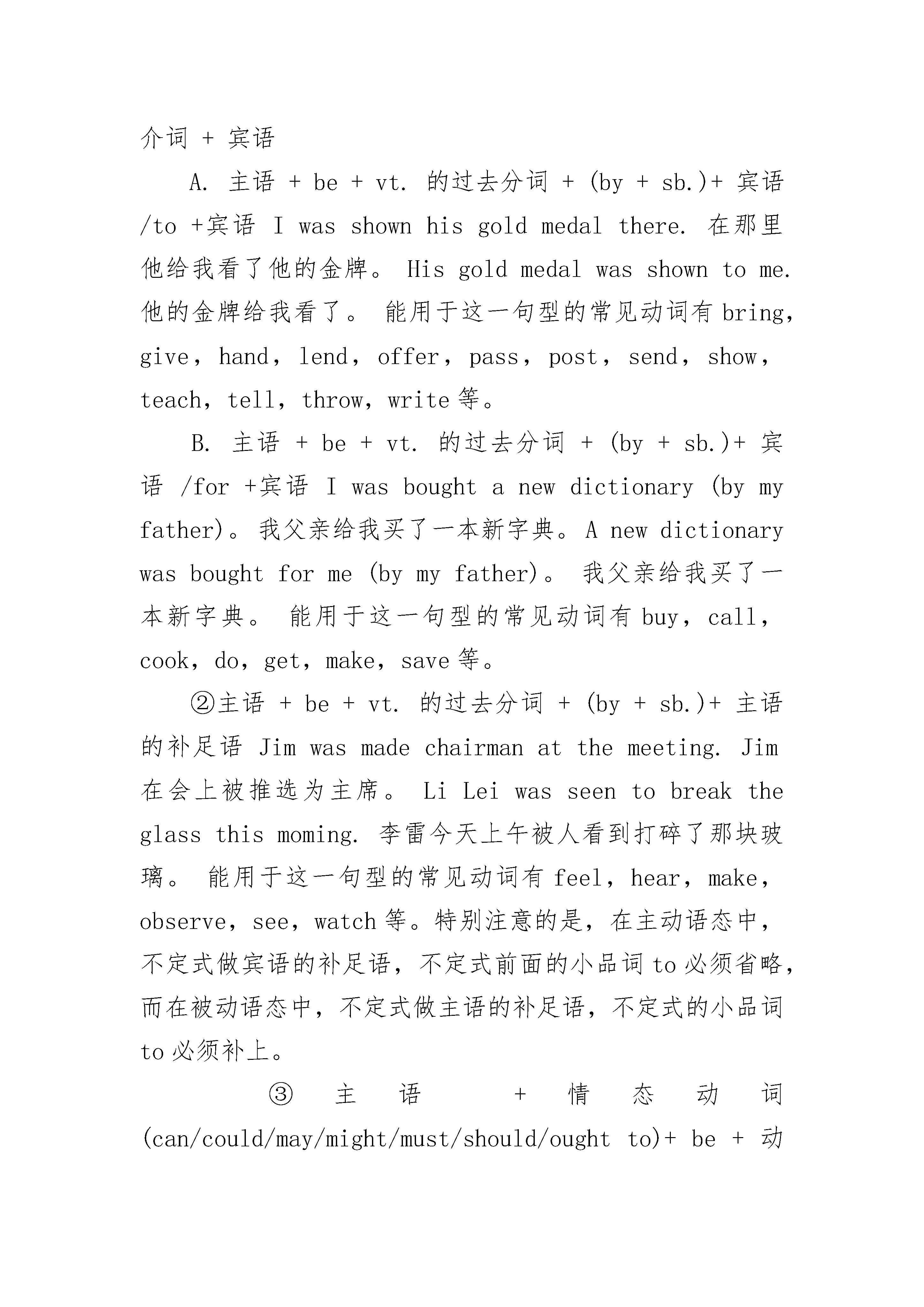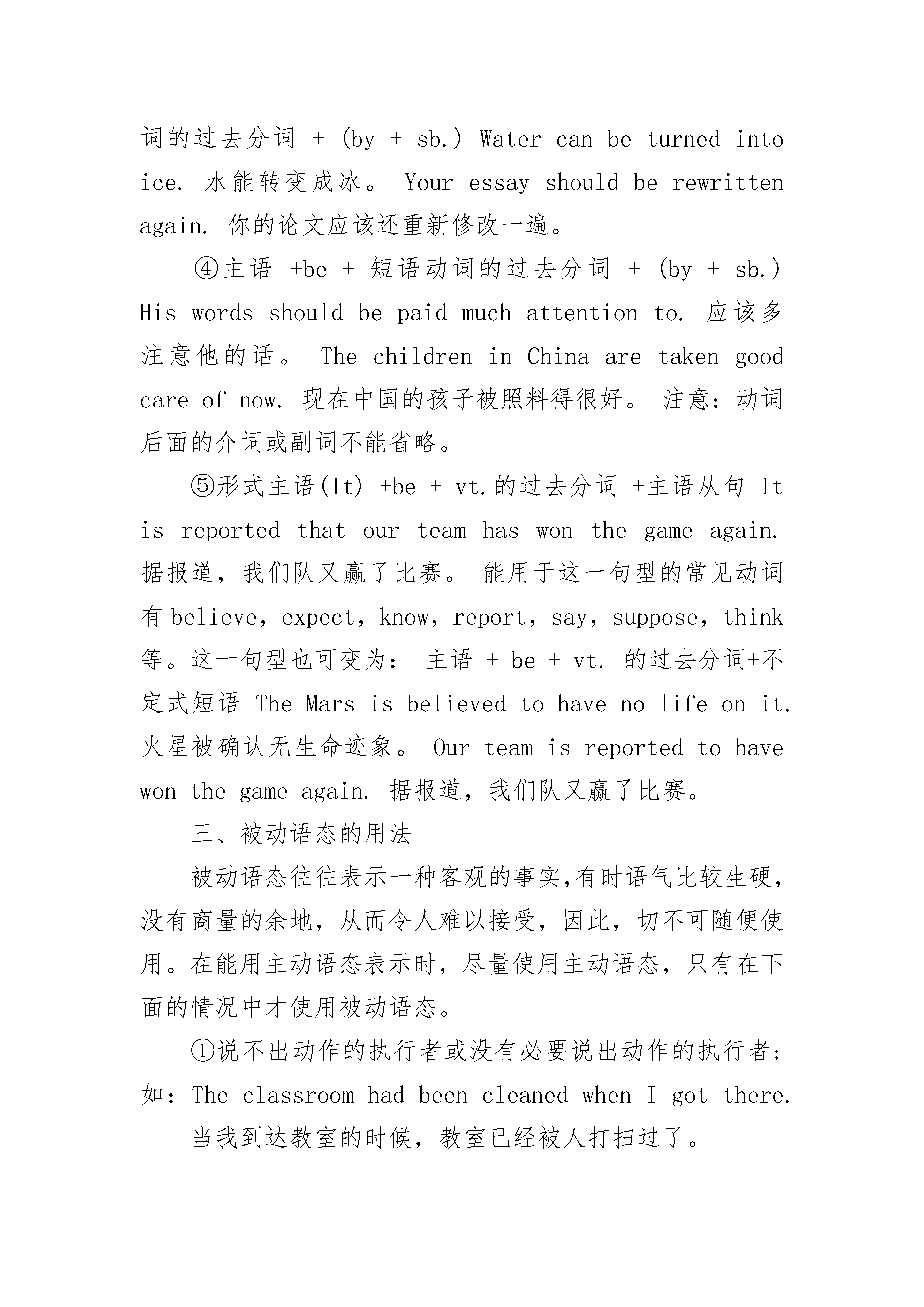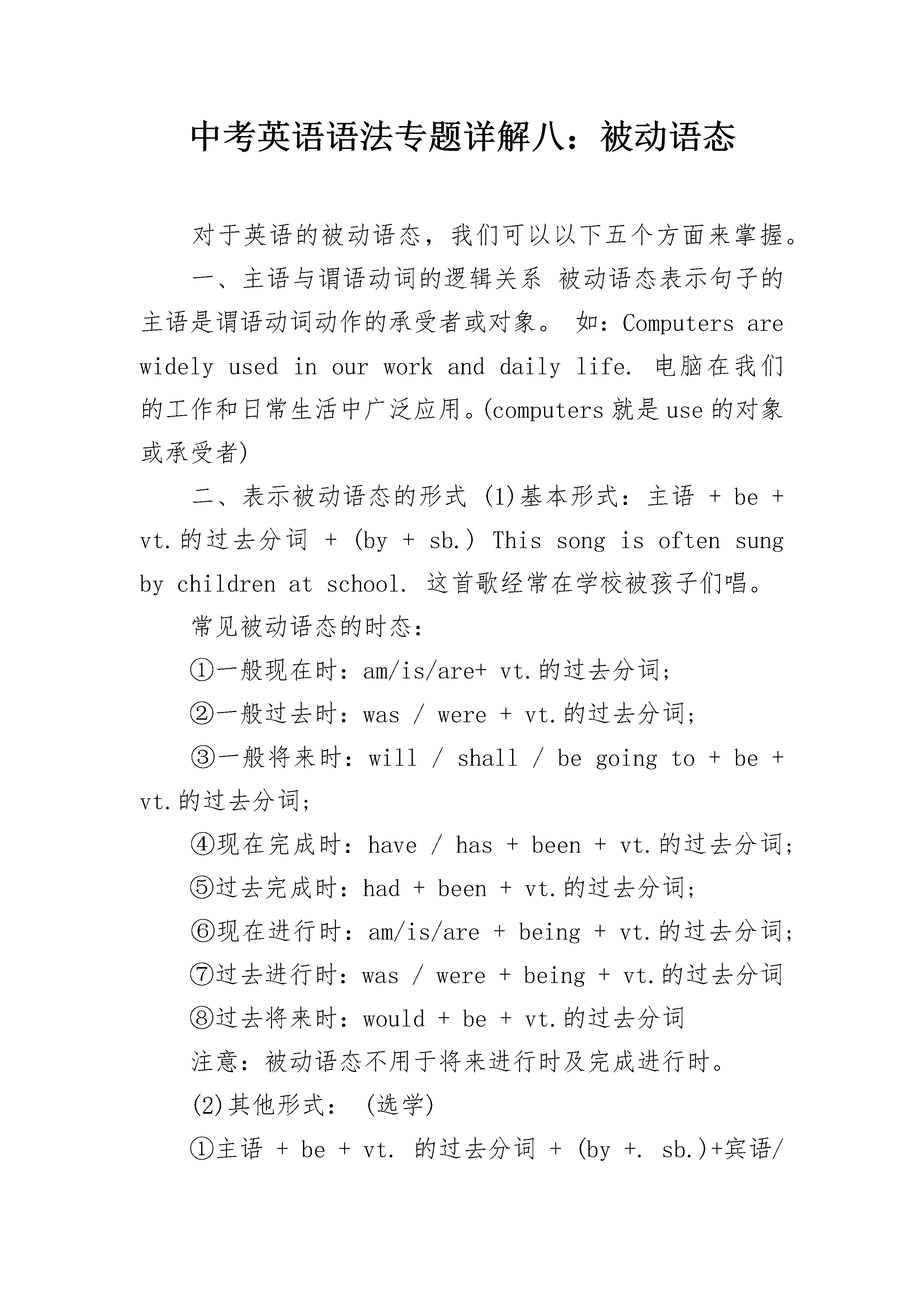 中考英语语法专题详解八:被动语态对于英语的被动语态,我们可以以下五个方面来掌握。一、主语与谓语动词的逻辑关系被动语态表示句子的主语是谓语动词动作的承受者或对象。如:Computersarewidelyusedinourworkanddailylife.电脑在我们的工作和日常生活中广泛应用。(computers就是use的对象或承受者)二、表示被动语态的形式(1)基本形式:主语+be+vt.的过去分词+(by+sb.)Thissongisoftensungbychildrenatschool.这首歌经常在学校被孩子们唱。常见被动语态的时态:①一般现在时:am/is/are+vt.的过去分词;②一般过去时:was/were+vt.的过去分词;③一般将来时:will/shall/begoingto+be+vt.的过去分词;④现在完成时:have/has+been+vt.的过去分词;⑤过去完成时:had+been+vt.的过去分词;⑥现在进行时:am/is/are+being+vt.的过去分词;⑦过去进行时:was/were+being+vt.的过去分词⑧过去将来时:would+be+vt.的过去分词注意:被动语态不用于将来进行时及完成进行时。(2)其他形式:(选学)①主语+be+vt.的过去分词+(by+.sb.)+宾语/介词+宾语A.主语+be+vt.的过去分词+(by+sb.)+宾语/to+宾语Iwasshownhisgoldmedalthere.在那里他给我看了他的金牌。Hisgoldmedalwasshowntome.他的金牌给我看了。能用于这一句型的常见动词有bring,give,hand,lend,offer,pass,post,send,show,teach,tell,throw,write等。B.主语+be+vt.的过去分词+(by+sb.)+宾语/for+宾语Iwasboughtanewdictionary(bymyfather)。我父亲给我买了一本新字典。Anewdictionarywasboughtforme(bymyfather)。我父亲给我买了一本新字典。能用于这一句型的常见动词有buy,call,cook,do,get,make,save等。②主语+be+vt.的过去分词+(by+sb.)+主语的补足语Jimwasmadechairmanatthemeeting.Jim在会上被推选为主席。LiLeiwasseentobreaktheglassthismoming.李雷今天上午被人看到打碎了那块玻璃。能用于这一句型的常见动词有feel,hear,make,observe,see,watch等。特别注意的是,在主动语态中,不定式做宾语的补足语,不定式前面的小品词to必须省略,而在被动语态中,不定式做主语的补足语,不定式的小品词to必须补上。③主语+情态动词(can/could/may/might/must/should/oughtto)+be+动词的过去分词+(by+sb.)Watercanbeturnedintoice.水能转变成冰。Youressayshouldberewrittenagain.你的论文应该还重新修改一遍。④主语+be+短语动词的过去分词+(by+sb.)Hiswordsshouldbepaidmuchattentionto.应该多注意他的话。ThechildreninChinaaretakengoodcareofnow.现在中国的孩子被照料得很好。注意:动词后面的介词或副词不能省略。⑤形式主语(It)+be+vt.的过去分词+主语从句Itisreportedthatourteamhaswonthegameagain.据报道,我们队又赢了比赛。能用于这一句型的常见动词有believe,expect,know,report,say,suppose,think等。这一句型也可变为:主语+be+vt.的过去分词+不定式短语TheMarsisbelievedtohavenolifeonit.火星被确认无生命迹象。Ourteamisreportedtohavewonthegameagain.据报道,我们队又赢了比赛。三、被动语态的用法被动语态往往表示一种客观的事实,有时语气比较生硬,没有商量的余地,从而令人难以接受,因此,切不可随便使用。在能用主动语态表示时,尽量使用主动语态,只有在下面的情况中才使用被动语态。①说不出动作的执行者或没有必要说出动作的执行者;如:TheclassroomhadbeencleanedwhenIgotthere.当我到达教室的时候,教室已经被人打扫过了。(教室究竟是谁打扫的,说话者并不知道)②为了突出或强调动作的承受者或对象;如:Homeworkmustbefinis
