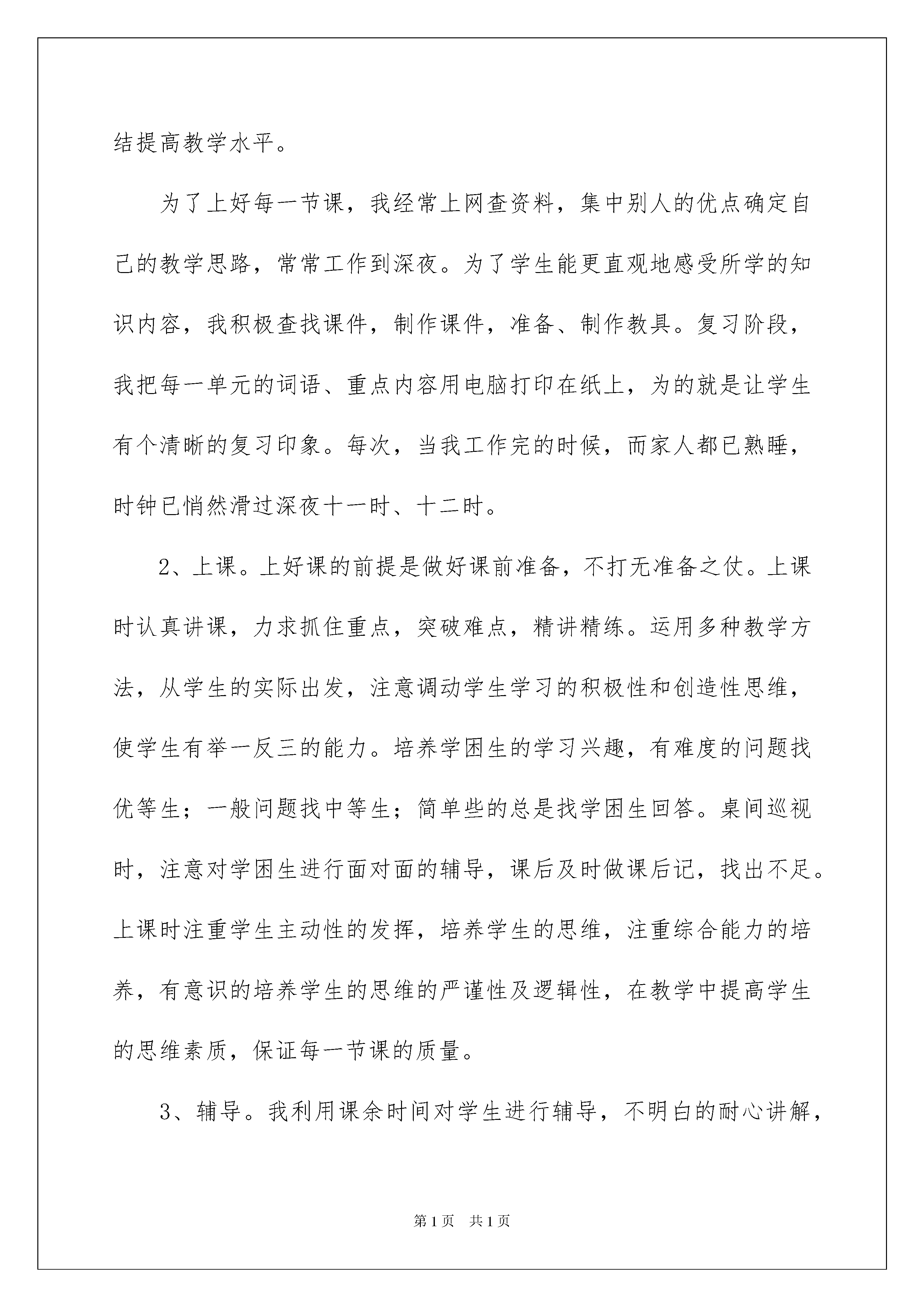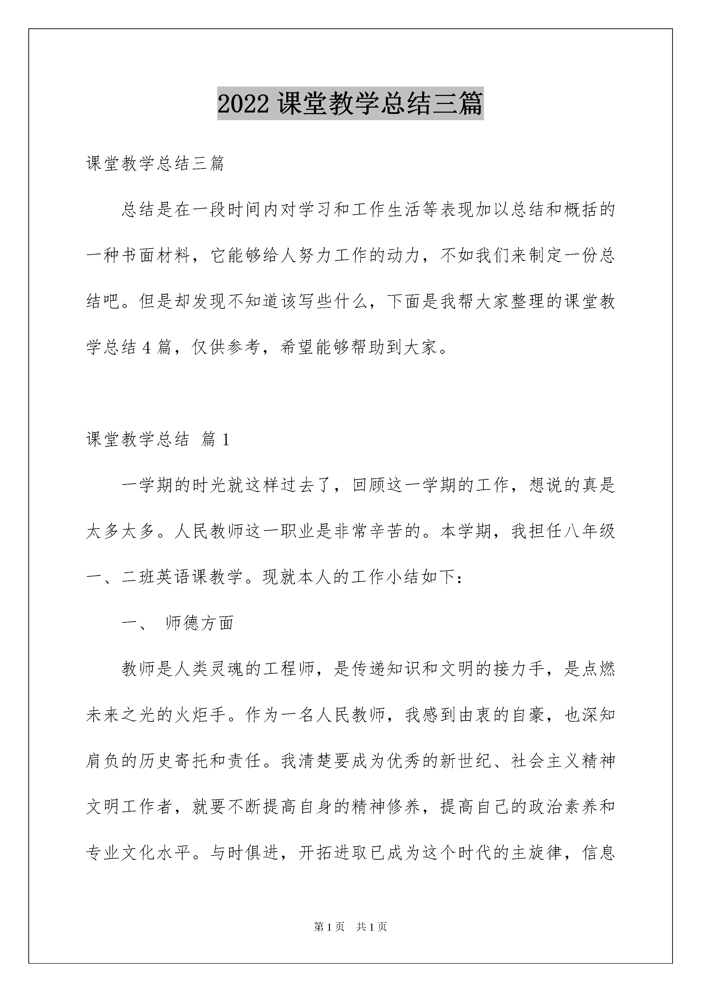 2022课堂教学总结三篇课堂教学总结三篇总结是在一段时间内对学习和工作生活等表现加以总结和概括的一种书面材料,它能够给人努力工作的动力,不如我们来制定一份总结吧。但是却发现不知道该写些什么,下面是我帮大家整理的课堂教学总结4篇,仅供参考,希望能够帮助到大家。课堂教学总结篇1一学期的时光就这样过去了,回顾这一学期的工作,想说的真是太多太多。人民教师这一职业是非常辛苦的。本学期,我担任八年级一、二班英语课教学。现就本人的工作小结如下:一、师德方面教师是人类灵魂的工程师,是传递知识和文明的接力手,是点燃未来之光的火炬手。作为一名人民教师,我感到由衷的自豪,也深知肩负的历史寄托和责任。我清楚要成为优秀的新世纪、社会主义精神文明工作者,就要不断提高自身的精神修养,提高自己的政治素养和专业文化水平。与时俱进,开拓进取已成为这个时代的主旋律,信息时代的教师一定要勤于学习,勇于创新,踏实肯干,用自己辛勤的努力培养出新世纪、新时期的新一代劳动者。本人能积极参加政治学习,关心国家大事,拥护党的领导,拥护党的各项方针政策,关心国内外大事,注重政治理论的学习,团结同志,热心帮助同志,人际关系融洽,教学目的明确,态度端正,钻研业务,勤奋刻苦,关心学生,爱护学生,为人师表,有奉献精神。平时积极参加全校教职工大会及党员大会,认真学习学校下达的上级文件,配合组里搞好教研活动,从不缺勤,按时坐班,服从安排,业余从不从事有偿家教及第二职业。本学年度全勤。二、教学情况在教学工作中,我注意做到以下几点:1、深入细致的备好每一节课。在教学活动中,积极参加年级组组织的教研活动,进行集体备课,仔细听,认真记,领会精神实质。然后根据要求,提前两周备好课,写好教案。平时做到提前备课,备课时认真钻研教材、教参,学习好大纲,虚心向同年组老师学习、请教。力求吃透教材,找准重点、难点,制定符合学生认知规律的教学方法及教学形式。注意弱化难点强调重点。教案编写认真,并不断归纳总结提高教学水平。为了上好每一节课,我经常上网查资料,集中别人的优点确定自己的教学思路,常常工作到深夜。为了学生能更直观地感受所学的知识内容,我积极查找课件,制作课件,准备、制作教具。复习阶段,我把每一单元的词语、重点内容用电脑打印在纸上,为的就是让学生有个清晰的复习印象。每次,当我工作完的时候,而家人都已熟睡,时钟已悄然滑过深夜十一时、十二时。2、上课。上好课的前提是做好课前准备,不打无准备之仗。上课时认真讲课,力求抓住重点,突破难点,精讲精练。运用多种教学方法,从学生的实际出发,注意调动学生学习的积极性和创造性思维,使学生有举一反三的能力。培养学困生的学习兴趣,有难度的问题找优等生;一般问题找中等生;简单些的总是找学困生回答。桌间巡视时,注意对学困生进行面对面的辅导,课后及时做课后记,找出不足。上课时注重学生主动性的发挥,培养学生的思维,注重综合能力的培养,有意识的培养学生的思维的严谨性及逻辑性,在教学中提高学生的思维素质,保证每一节课的质量。3、辅导。我利用课余时间对学生进行辅导,不明白的耐心讲解,及时查缺补漏。并与家长联系,及时沟通情况,课后给他们吃小灶。4、认真及时批改作业,注意听取学生的意见,及时了解学生的学习情况,并有目的的对学生进行辅导。根据减负的要求,我把每天的作业经过精心地挑选,适当地留一些有利于学生能力发展的、发挥主动性和创造性的作业。5、坚持听课,注意学习组里老师的教学经验,努力探索适合自己的教学模式。本学期平均每周听课二节,对自己的教学促进很大。6、注重教育理论的学习,并注意把一些先进的理论应用于课堂,做到学有所用。这一学期以来,学校开了几次公开课,通过公开课的学习,使自己的教学水平得到很大的提高,但也使我意识到了自己在教学方面的不足之处。三、业务自修积极学习各种教育理论,以充实自己,以便在工作中以坚实的理论作为指导,更好地进行教育教学。努力学习英语,以适应当前教育的形式,给自己充电,为进行双语教学做好准备。积极进行学历进修学习,拿下了本科。还利用业余时间认真学习各种开发语言,学习制作多媒体课件,为教学服务,同时也帮助其他同志制作课件,上网查找资料等等,积极撰写教育教学论文。四、工作中应努力的`方向1、加强自身基本功的训练,课堂上做到精讲精练,注重对学生能力的培养,知识上做到课课清、段段清。2、对差生多些关心,多点爱心,再多一些耐心,使他们在各方面有更大进步。3、加强守纪方面的教育,使学生不仅在课堂上集中注意力学习,课下也要按校纪班规严格约束自己。4、教育学生要注意保持环境卫生,增强主人翁意识和责任感。5、利用各种方法,训练学生提高、集