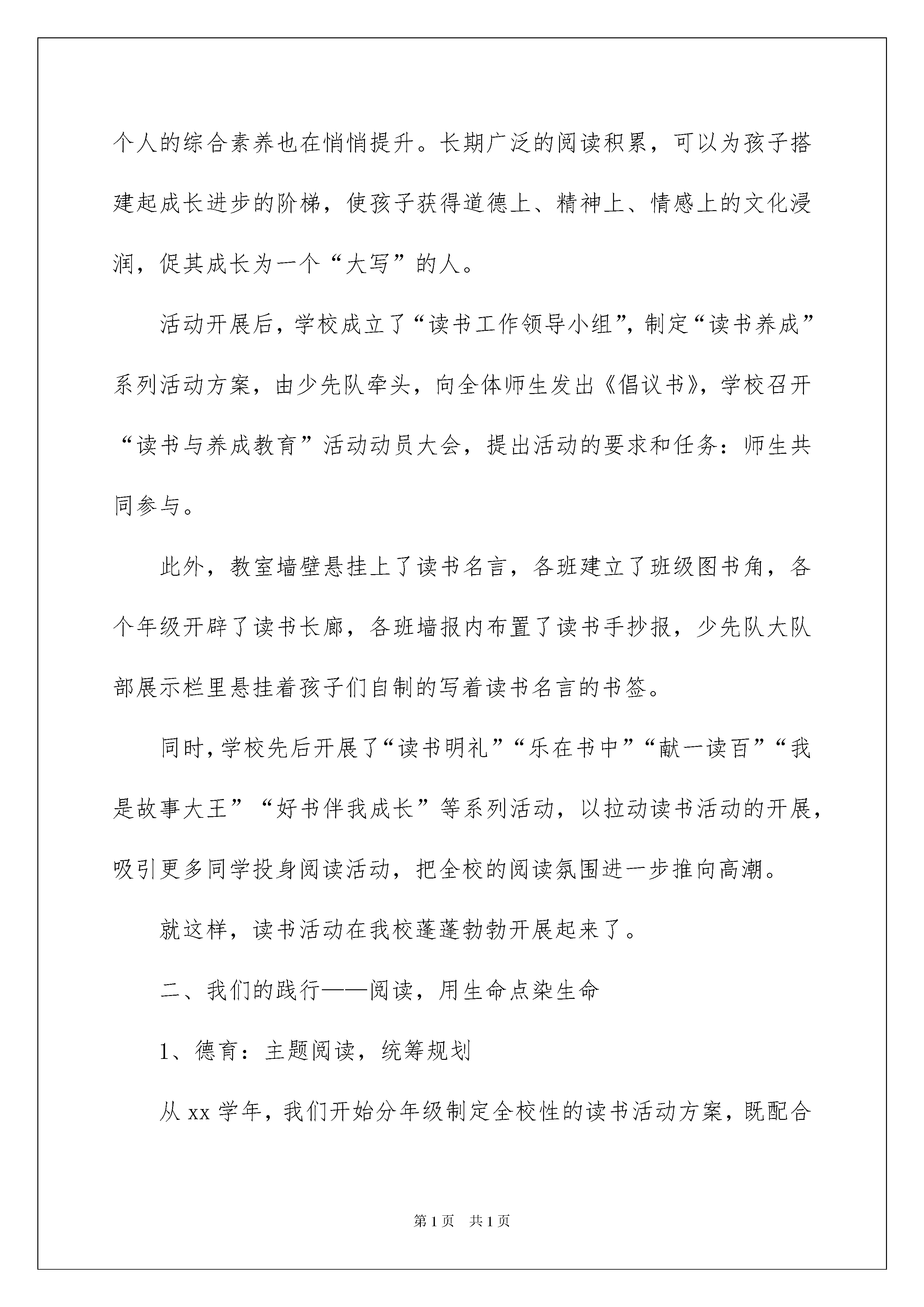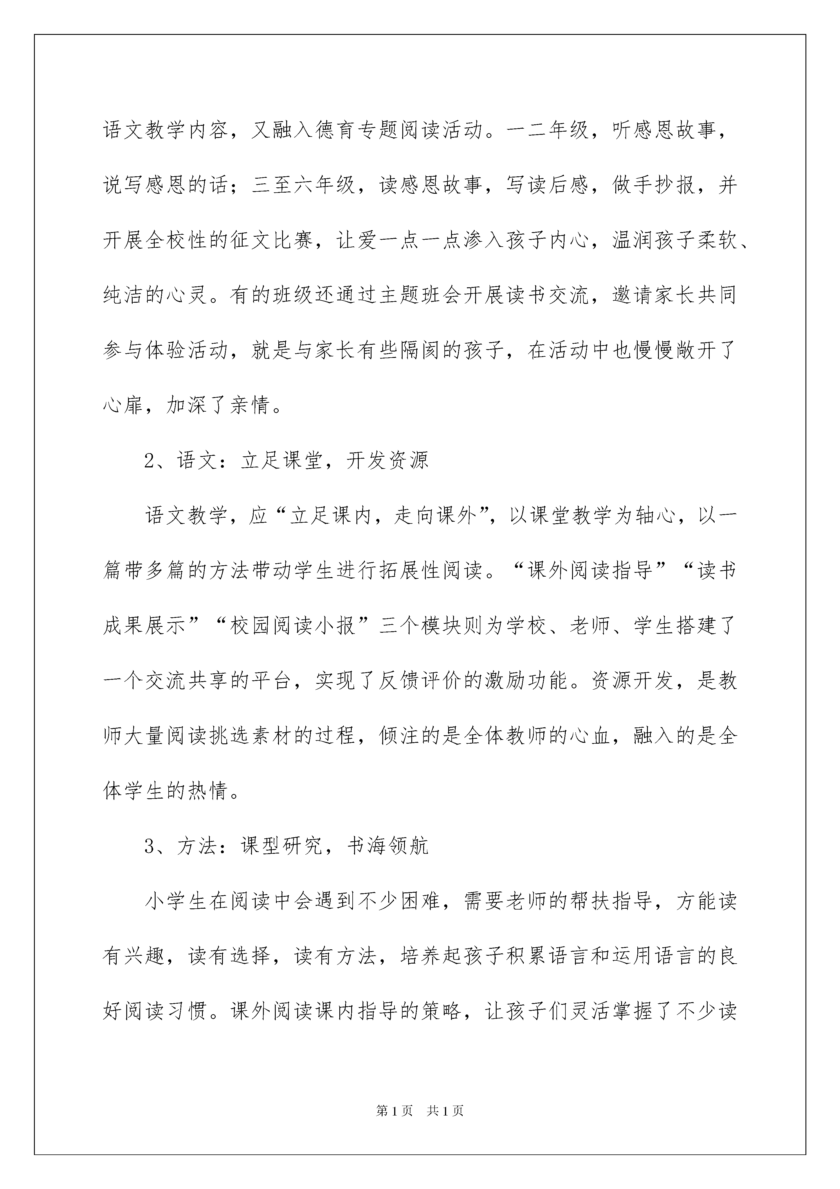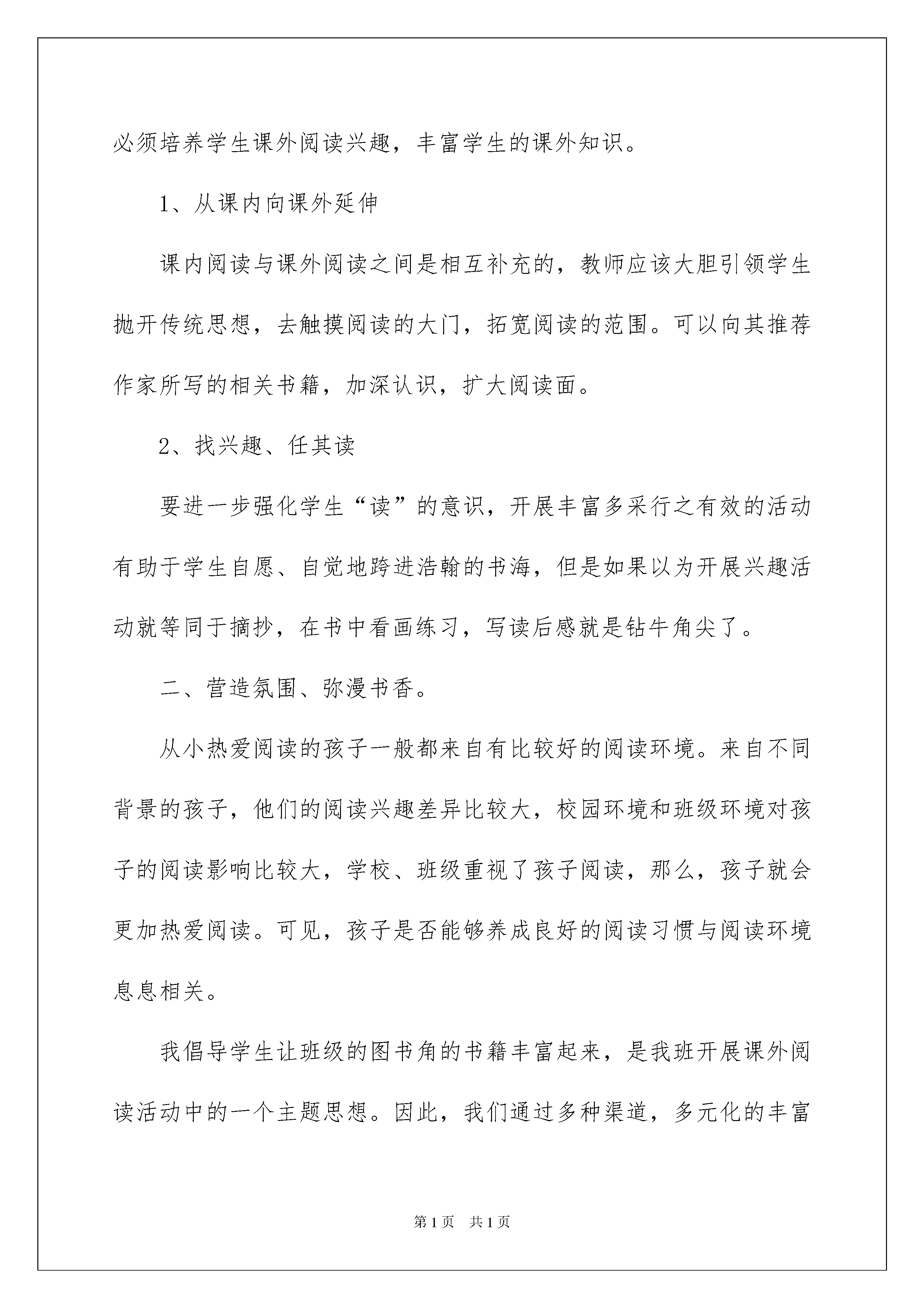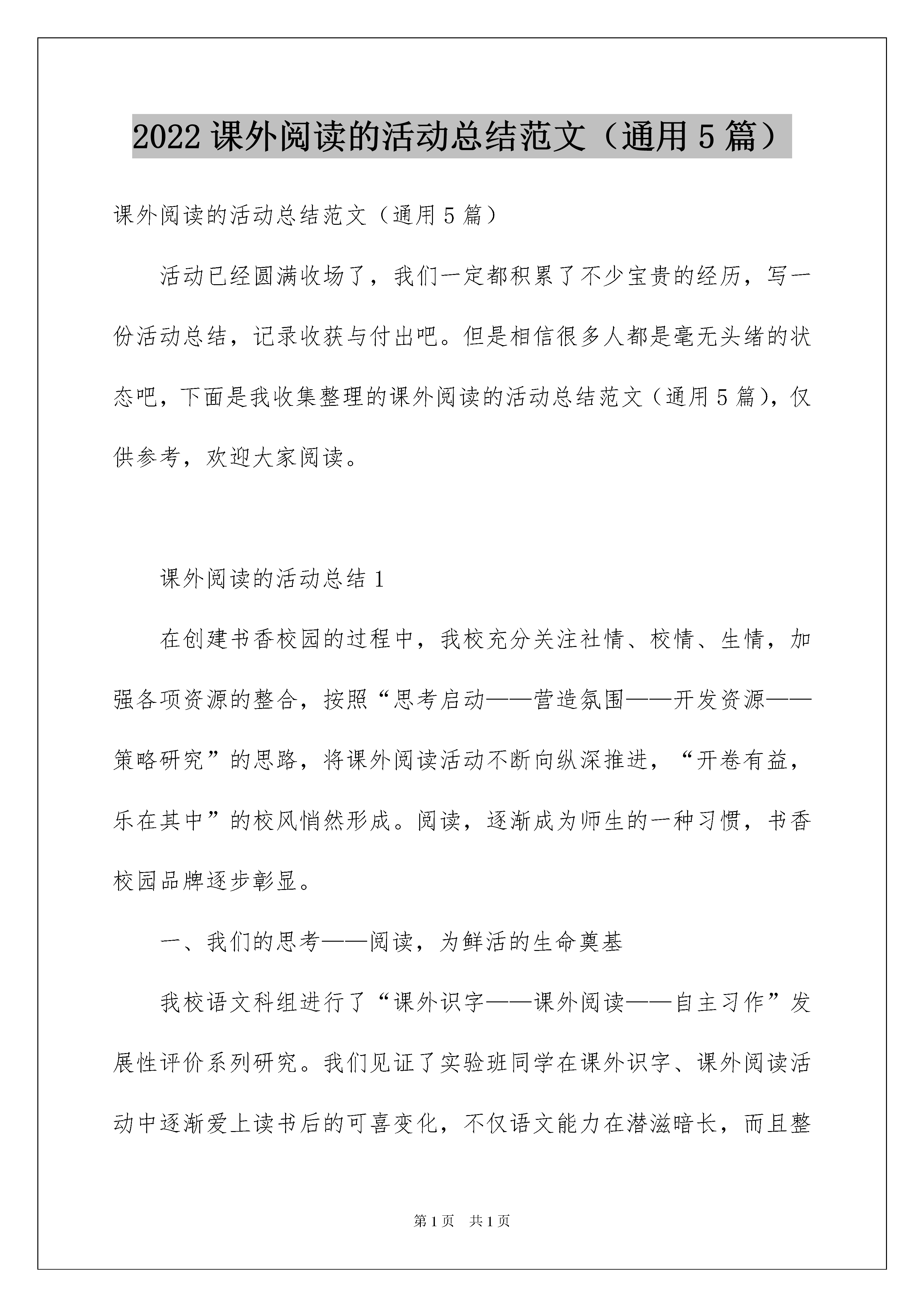 2022课外阅读的活动总结范文(通用5篇)课外阅读的活动总结范文(通用5篇)活动已经圆满收场了,我们一定都积累了不少宝贵的经历,写一份活动总结,记录收获与付出吧。但是相信很多人都是毫无头绪的状态吧,下面是我收集整理的课外阅读的活动总结范文(通用5篇),仅供参考,欢迎大家阅读。课外阅读的活动总结1在创建书香校园的过程中,我校充分关注社情、校情、生情,加强各项资源的整合,按照“思考启动——营造氛围——开发资源——策略研究”的思路,将课外阅读活动不断向纵深推进,“开卷有益,乐在其中”的校风悄然形成。阅读,逐渐成为师生的一种习惯,书香校园品牌逐步彰显。一、我们的思考——阅读,为鲜活的生命奠基我校语文科组进行了“课外识字——课外阅读——自主习作”发展性评价系列研究。我们见证了实验班同学在课外识字、课外阅读活动中逐渐爱上读书后的可喜变化,不仅语文能力在潜滋暗长,而且整个人的综合素养也在悄悄提升。长期广泛的阅读积累,可以为孩子搭建起成长进步的阶梯,使孩子获得道德上、精神上、情感上的文化浸润,促其成长为一个“大写”的人。活动开展后,学校成立了“读书工作领导小组”,制定“读书养成”系列活动方案,由少先队牵头,向全体师生发出《倡议书》,学校召开“读书与养成教育”活动动员大会,提出活动的要求和任务:师生共同参与。此外,教室墙壁悬挂上了读书名言,各班建立了班级图书角,各个年级开辟了读书长廊,各班墙报内布置了读书手抄报,少先队大队部展示栏里悬挂着孩子们自制的写着读书名言的书签。同时,学校先后开展了“读书明礼”“乐在书中”“献一读百”“我是故事大王”“好书伴我成长”等系列活动,以拉动读书活动的开展,吸引更多同学投身阅读活动,把全校的阅读氛围进一步推向高潮。就这样,读书活动在我校蓬蓬勃勃开展起来了。二、我们的践行——阅读,用生命点染生命1、德育:主题阅读,统筹规划从xx学年,我们开始分年级制定全校性的读书活动方案,既配合语文教学内容,又融入德育专题阅读活动。一二年级,听感恩故事,说写感恩的话;三至六年级,读感恩故事,写读后感,做手抄报,并开展全校性的征文比赛,让爱一点一点渗入孩子内心,温润孩子柔软、纯洁的心灵。有的班级还通过主题班会开展读书交流,邀请家长共同参与体验活动,就是与家长有些隔阂的孩子,在活动中也慢慢敞开了心扉,加深了亲情。2、语文:立足课堂,开发资源语文教学,应“立足课内,走向课外”,以课堂教学为轴心,以一篇带多篇的方法带动学生进行拓展性阅读。“课外阅读指导”“读书成果展示”“校园阅读小报”三个模块则为学校、老师、学生搭建了一个交流共享的平台,实现了反馈评价的激励功能。资源开发,是教师大量阅读挑选素材的过程,倾注的是全体教师的心血,融入的是全体学生的热情。3、方法:课型研究,书海领航小学生在阅读中会遇到不少困难,需要老师的帮扶指导,方能读有兴趣,读有选择,读有方法,培养起孩子积累语言和运用语言的良好阅读习惯。课外阅读课内指导的策略,让孩子们灵活掌握了不少读书方法,精读法、略读法、浏览、批注、做读书笔记等。低年级,我们侧重兴趣培养,指导阅读童话及注音童谣等读物,学习积累字词或简单的句子,鼓励填写“小书迷”读书卡;中年级,学生阅读水平有所提升,开始学习积累优美句段,书写简单的点滴感悟,从“采蜜集”开始;高年级,则可以在指导下提高到阅读整本书,鼓励接触一些经典名著,学生填写“心语录”,倡写读书感受。“没有一艘船能像一本书,也没有一匹马能像一页跳跃着的诗行那样——把人带往远方”,让阅读将我们的孩子带向遥远的前方。课外阅读的活动总结2“书是人类进步的阶梯”养成良好的读书习惯,掌握较好的读书方法,对每个人来说是终生受益的!为了引导学生正确面对丰富多彩的阅读世界,让孩子们的身心得以健康成长,这个学期我们班开展课外阅读活动,具体做法如下:一、积极阅读、提高兴趣。为了抓好孩子们的课外阅读,我及时了解学生的实际情况:(一)、是家长不注重阅读,很少帮孩子购买课外书籍。(二)、是辅导时间少。基于这些,要想提高学生语文知识能力,必须培养学生课外阅读兴趣,丰富学生的课外知识。1、从课内向课外延伸课内阅读与课外阅读之间是相互补充的,教师应该大胆引领学生抛开传统思想,去触摸阅读的大门,拓宽阅读的范围。可以向其推荐作家所写的相关书籍,加深认识,扩大阅读面。2、找兴趣、任其读要进一步强化学生“读”的意识,开展丰富多采行之有效的活动有助于学生自愿、自觉地跨进浩翰的书海,但是如果以为开展兴趣活动就等同于摘抄,在书中看画练习,写读后感就是钻牛角尖了。二、营造氛围、弥漫书香。从小热爱阅读的孩子一般都来自有比较好的阅读环境。来自不同背
