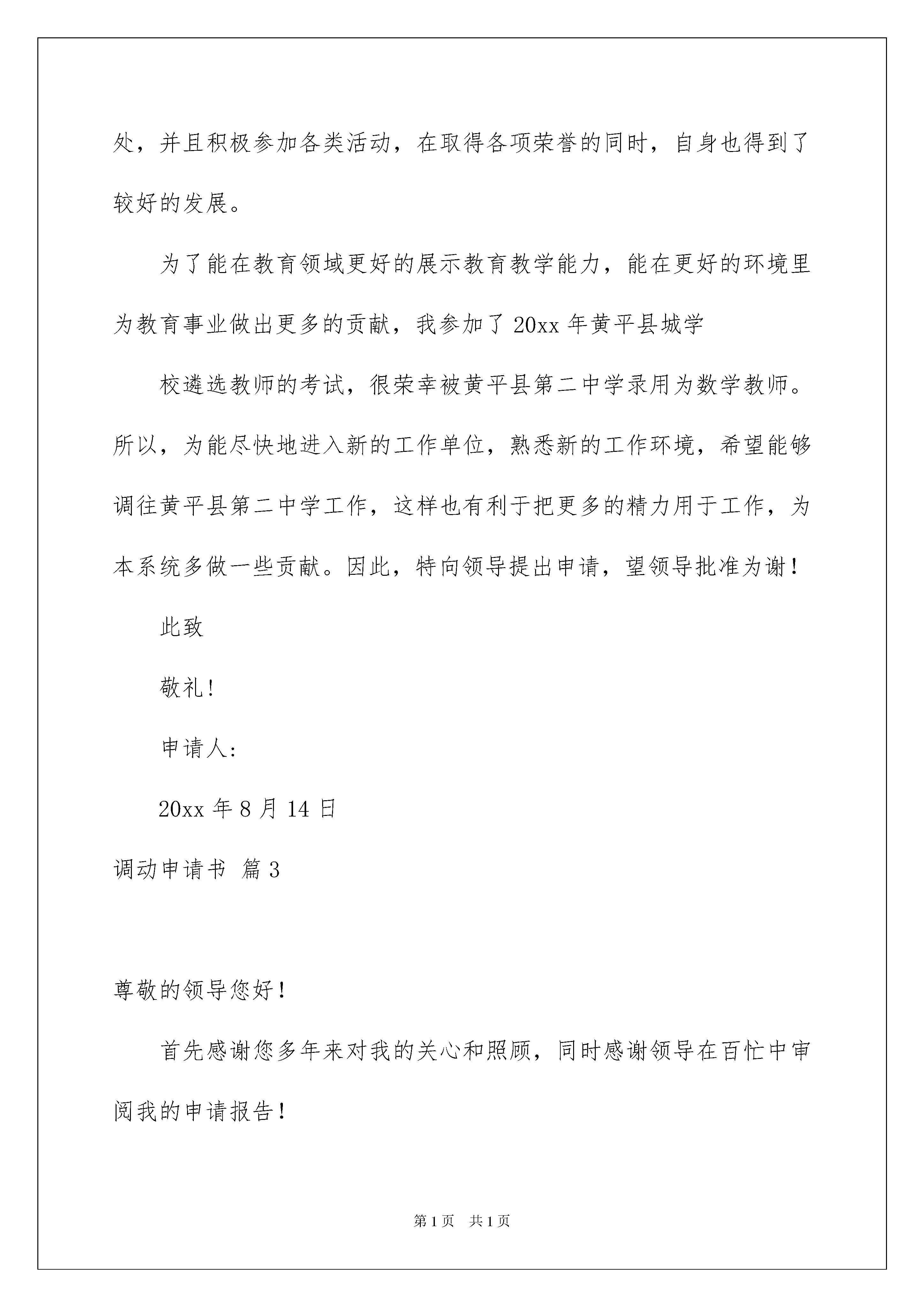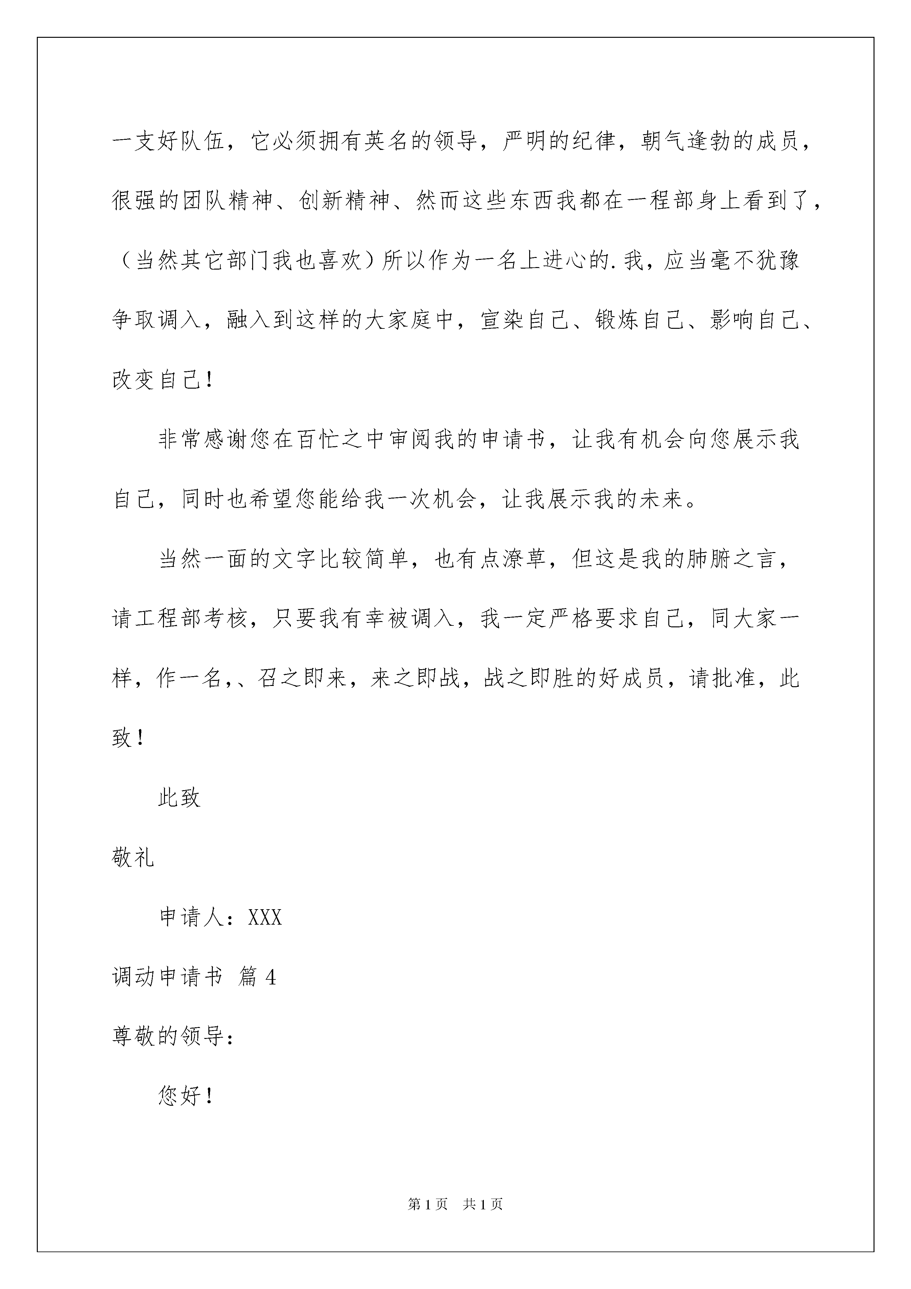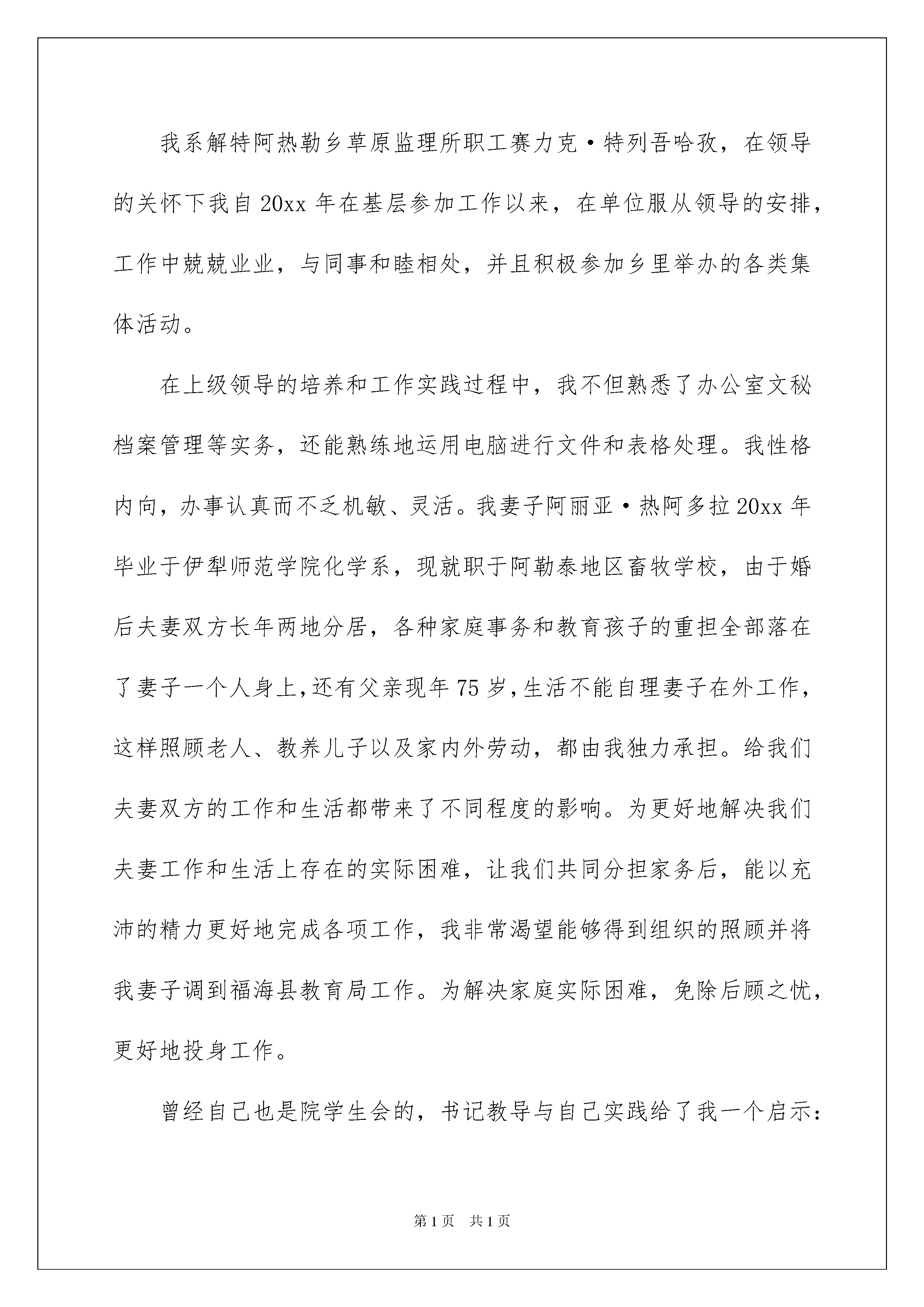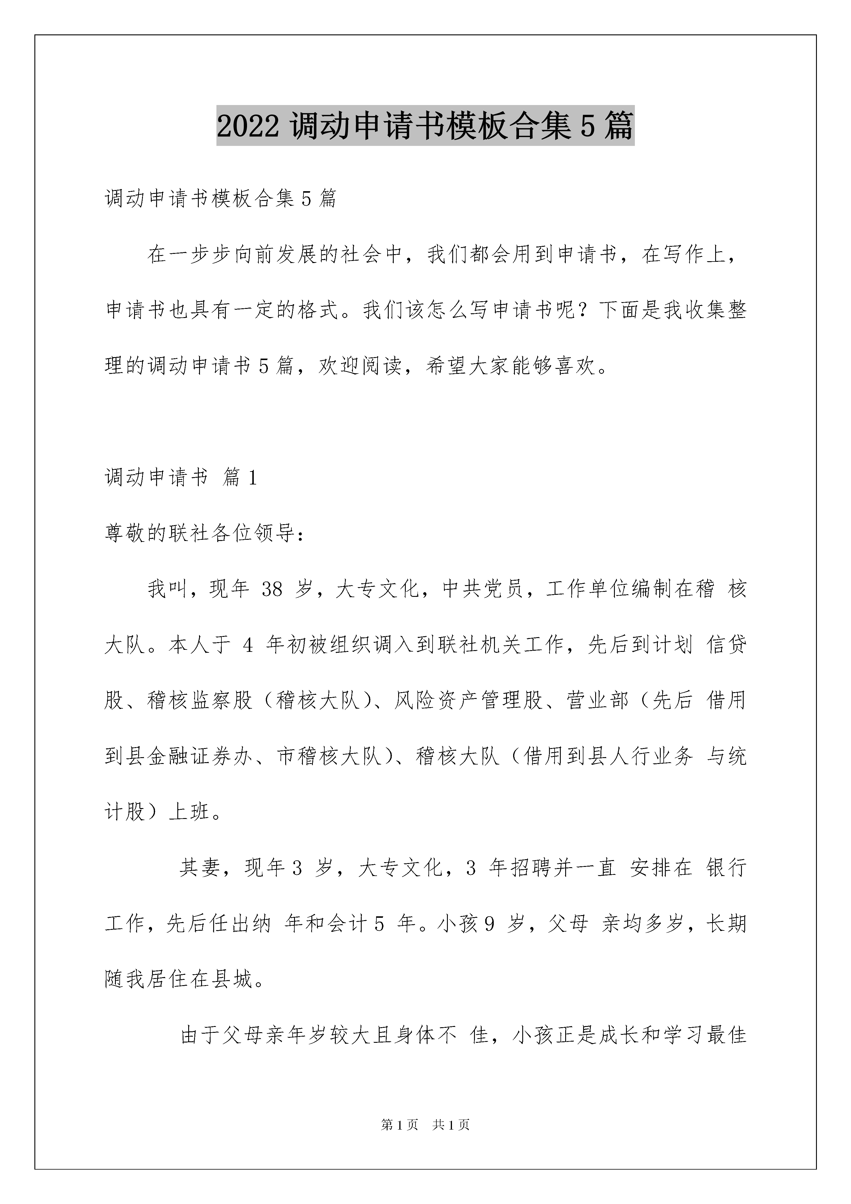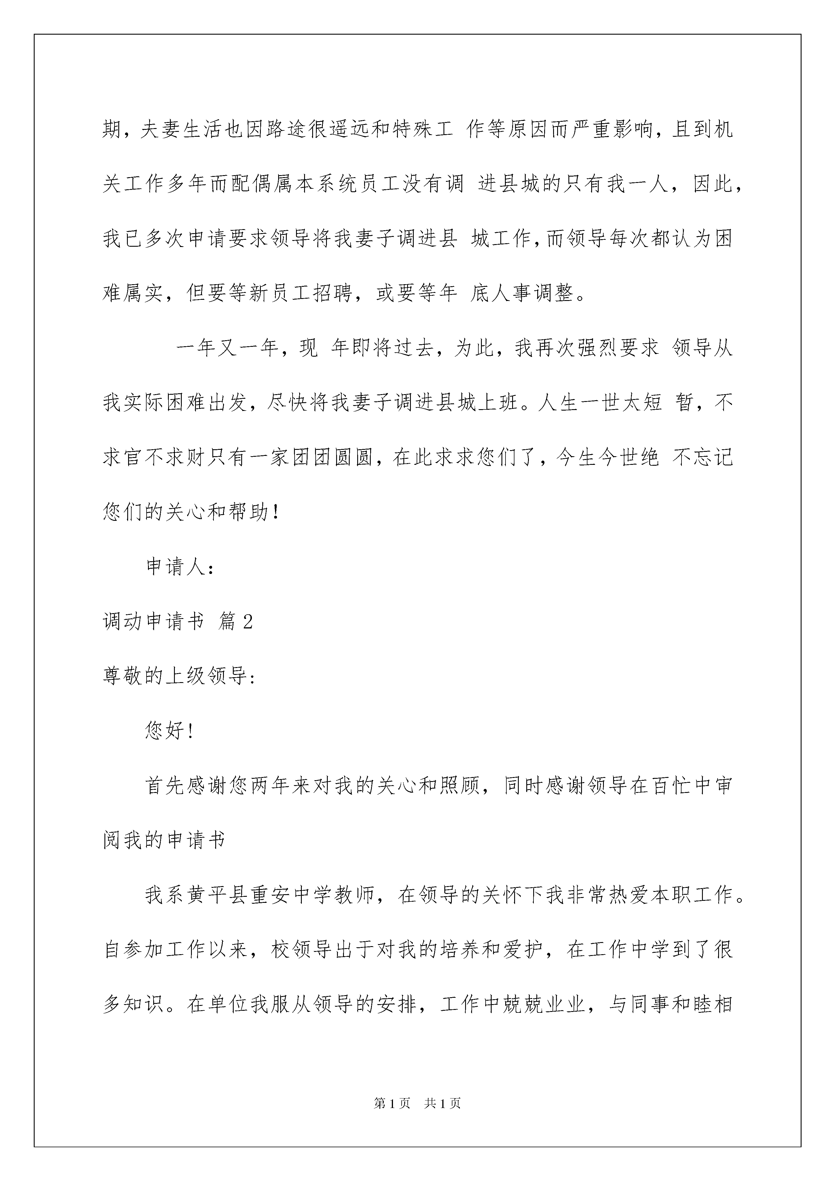 2022调动申请书模板合集5篇调动申请书模板合集5篇在一步步向前发展的社会中,我们都会用到申请书,在写作上,申请书也具有一定的格式。我们该怎么写申请书呢?下面是我收集整理的调动申请书5篇,欢迎阅读,希望大家能够喜欢。调动申请书篇1尊敬的联社各位领导:我叫,现年38岁,大专文化,中共党员,工作单位编制在稽核大队。本人于4年初被组织调入到联社机关工作,先后到计划信贷股、稽核监察股(稽核大队)、风险资产管理股、营业部(先后借用到县金融证券办、市稽核大队)、稽核大队(借用到县人行业务与统计股)上班。其妻,现年3岁,大专文化,3年招聘并一直安排在银行工作,先后任出纳年和会计5年。小孩9岁,父母亲均多岁,长期随我居住在县城。由于父母亲年岁较大且身体不佳,小孩正是成长和学习最佳期,夫妻生活也因路途很遥远和特殊工作等原因而严重影响,且到机关工作多年而配偶属本系统员工没有调进县城的只有我一人,因此,我已多次申请要求领导将我妻子调进县城工作,而领导每次都认为困难属实,但要等新员工招聘,或要等年底人事调整。一年又一年,现年即将过去,为此,我再次强烈要求领导从我实际困难出发,尽快将我妻子调进县城上班。人生一世太短暂,不求官不求财只有一家团团圆圆,在此求求您们了,今生今世绝不忘记您们的关心和帮助!申请人:调动申请书篇2尊敬的上级领导:您好!首先感谢您两年来对我的关心和照顾,同时感谢领导在百忙中审阅我的申请书我系黄平县重安中学教师,在领导的关怀下我非常热爱本职工作。自参加工作以来,校领导出于对我的培养和爱护,在工作中学到了很多知识。在单位我服从领导的安排,工作中兢兢业业,与同事和睦相处,并且积极参加各类活动,在取得各项荣誉的同时,自身也得到了较好的发展。为了能在教育领域更好的展示教育教学能力,能在更好的环境里为教育事业做出更多的贡献,我参加了20xx年黄平县城学校遴选教师的考试,很荣幸被黄平县第二中学录用为数学教师。所以,为能尽快地进入新的工作单位,熟悉新的工作环境,希望能够调往黄平县第二中学工作,这样也有利于把更多的精力用于工作,为本系统多做一些贡献。因此,特向领导提出申请,望领导批准为谢!此致敬礼!申请人:20xx年8月14日调动申请书篇3尊敬的领导您好!首先感谢您多年来对我的关心和照顾,同时感谢领导在百忙中审阅我的申请报告!我系解特阿热勒乡草原监理所职工赛力克·特列吾哈孜,在领导的关怀下我自20xx年在基层参加工作以来,在单位服从领导的安排,工作中兢兢业业,与同事和睦相处,并且积极参加乡里举办的各类集体活动。在上级领导的培养和工作实践过程中,我不但熟悉了办公室文秘档案管理等实务,还能熟练地运用电脑进行文件和表格处理。我性格内向,办事认真而不乏机敏、灵活。我妻子阿丽亚·热阿多拉20xx年毕业于伊犁师范学院化学系,现就职于阿勒泰地区畜牧学校,由于婚后夫妻双方长年两地分居,各种家庭事务和教育孩子的重担全部落在了妻子一个人身上,还有父亲现年75岁,生活不能自理妻子在外工作,这样照顾老人、教养儿子以及家内外劳动,都由我独力承担。给我们夫妻双方的工作和生活都带来了不同程度的影响。为更好地解决我们夫妻工作和生活上存在的实际困难,让我们共同分担家务后,能以充沛的精力更好地完成各项工作,我非常渴望能够得到组织的照顾并将我妻子调到福海县教育局工作。为解决家庭实际困难,免除后顾之忧,更好地投身工作。曾经自己也是院学生会的,书记教导与自己实践给了我一个启示:一支好队伍,它必须拥有英名的领导,严明的纪律,朝气逢勃的成员,很强的团队精神、创新精神、然而这些东西我都在一程部身上看到了,(当然其它部门我也喜欢)所以作为一名上进心的.我,应当毫不犹豫争取调入,融入到这样的大家庭中,宣染自己、锻炼自己、影响自己、改变自己!非常感谢您在百忙之中审阅我的申请书,让我有机会向您展示我自己,同时也希望您能给我一次机会,让我展示我的未来。当然一面的文字比较简单,也有点潦草,但这是我的肺腑之言,请工程部考核,只要我有幸被调入,我一定严格要求自己,同大家一样,作一名,、召之即来,来之即战,战之即胜的好成员,请批准,此致!此致敬礼申请人:XXX调动申请书篇4尊敬的领导:您好!我是XXX.于xxxx年x月进入**工作至今。目前在金属二车间后道工序担任组长一职。现申请调到天津**管业分公司工作。在加入**这三年,我由一名普通的新员工,成长为参与车间生产管理者里面的一员。在这段时间里,通过公司的培训以及领导的培养。我努力把自己的工作做到最好,兢兢业业,吃苦耐劳,用心做事。带领组里员工积极配合车间领导的各项工作,及时完成调度下达的生产任务订单,为提高车