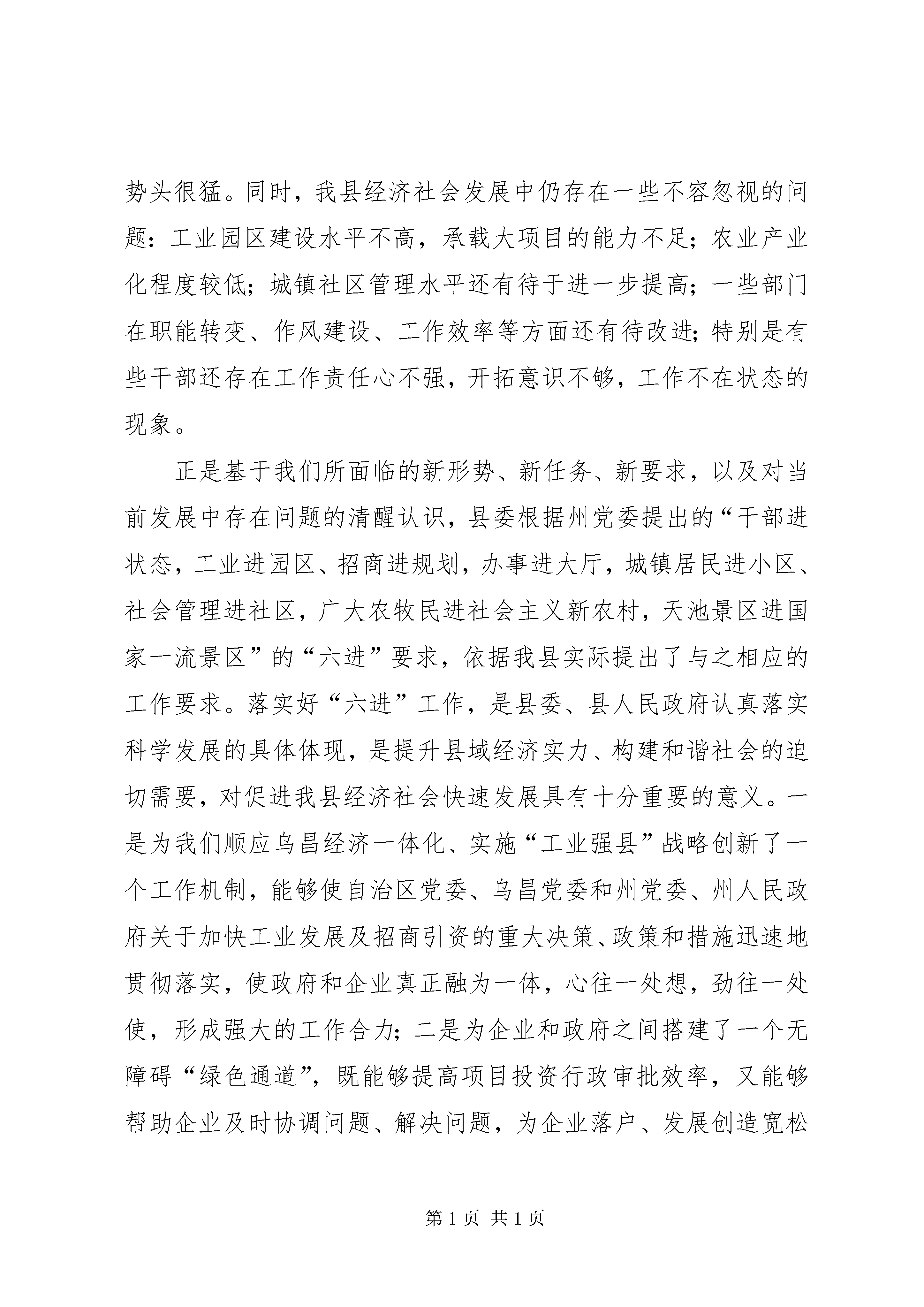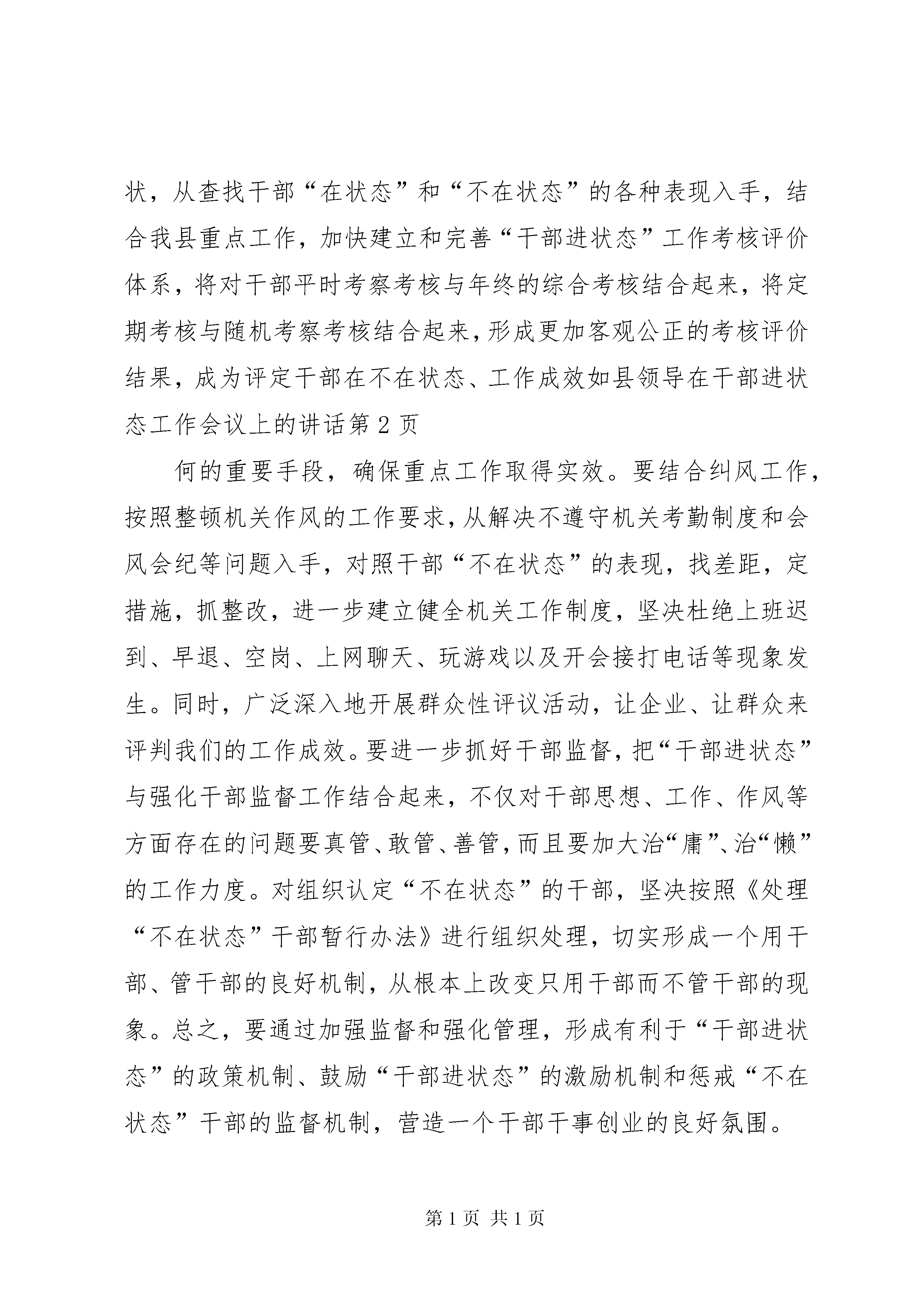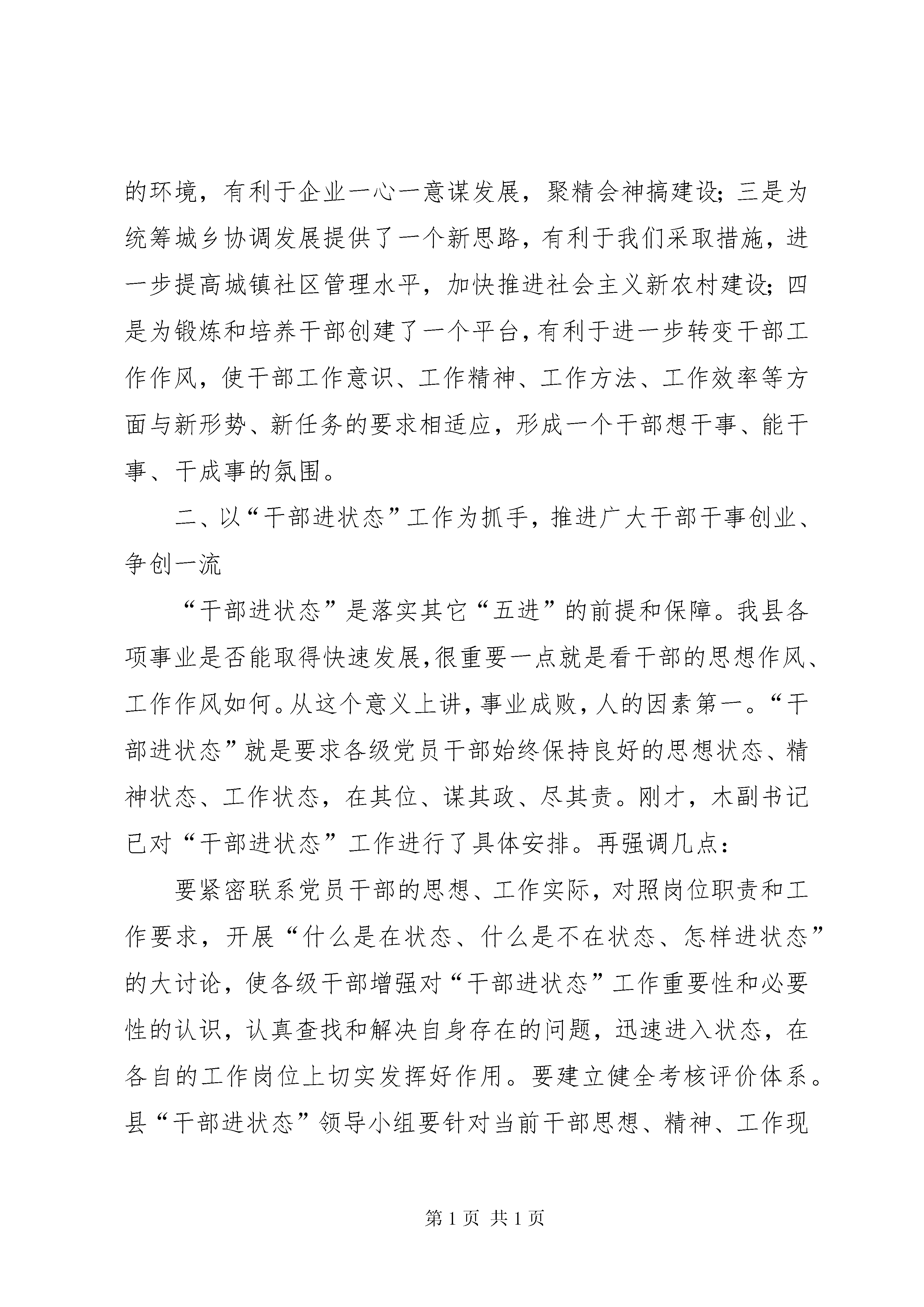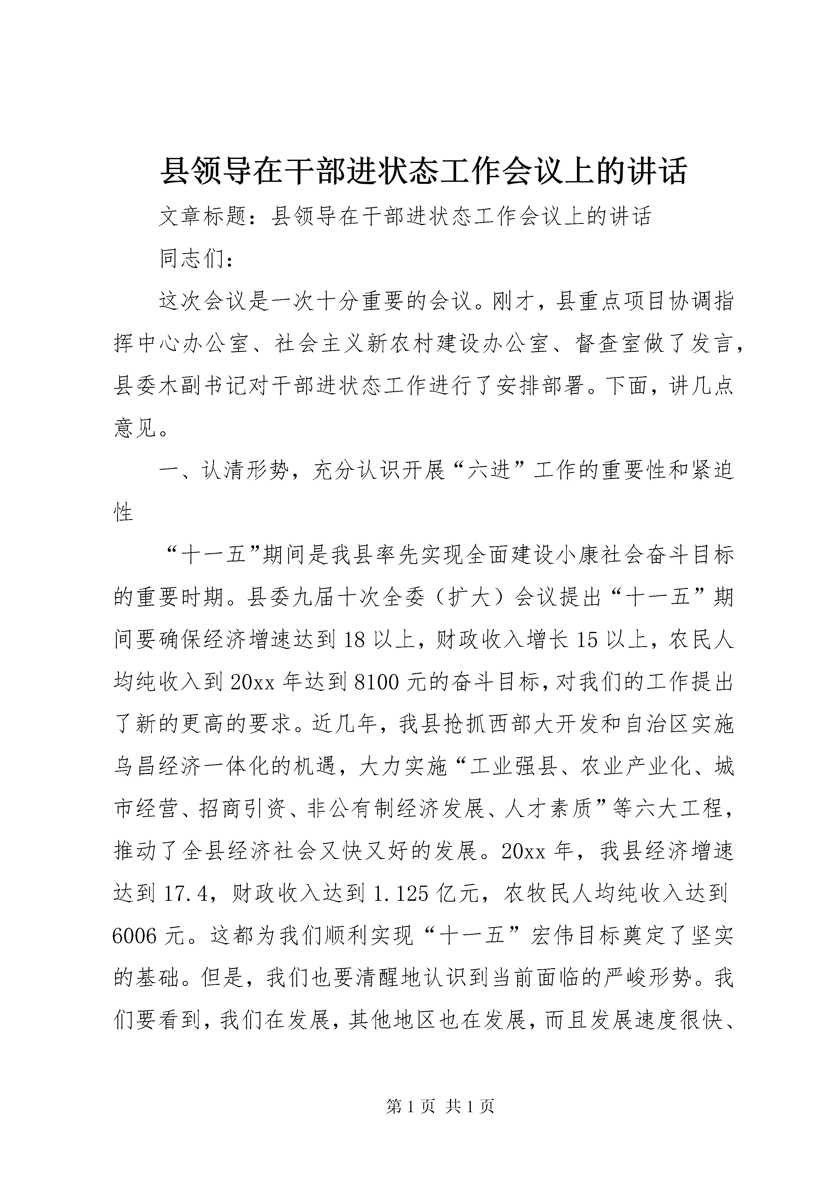 县领导在干部进状态工作会议上的讲话文章标题:县领导在干部进状态工作会议上的讲话同志们:这次会议是一次十分重要的会议。刚才,县重点项目协调指挥中心办公室、社会主义新农村建设办公室、督查室做了发言,县委木副书记对干部进状态工作进行了安排部署。下面,讲几点意见。一、认清形势,充分认识开展“六进”工作的重要性和紧迫性“十一五”期间是我县率先实现全面建设小康社会奋斗目标的重要时期。县委九届十次全委(扩大)会议提出“十一五”期间要确保经济增速达到18以上,财政收入增长15以上,农民人均纯收入到20xx年达到8100元的奋斗目标,对我们的工作提出了新的更高的要求。近几年,我县抢抓西部大开发和自治区实施乌昌经济一体化的机遇,大力实施“工业强县、农业产业化、城市经营、招商引资、非公有制经济发展、人才素质”等六大工程,推动了全县经济社会又快又好的发展。20xx年,我县经济增速达到17.4,财政收入达到1.125亿元,农牧民人均纯收入达到6006元。这都为我们顺利实现“十一五”宏伟目标奠定了坚实的基础。但是,我们也要清醒地认识到当前面临的严峻形势。我们要看到,我们在发展,其他地区也在发展,而且发展速度很快、势头很猛。同时,我县经济社会发展中仍存在一些不容忽视的问题:工业园区建设水平不高,承载大项目的能力不足;农业产业化程度较低;城镇社区管理水平还有待于进一步提高;一些部门在职能转变、作风建设、工作效率等方面还有待改进;特别是有些干部还存在工作责任心不强,开拓意识不够,工作不在状态的现象。正是基于我们所面临的新形势、新任务、新要求,以及对当前发展中存在问题的清醒认识,县委根据州党委提出的“干部进状态,工业进园区、招商进规划,办事进大厅,城镇居民进小区、社会管理进社区,广大农牧民进社会主义新农村,天池景区进国家一流景区”的“六进”要求,依据我县实际提出了与之相应的工作要求。落实好“六进”工作,是县委、县人民政府认真落实科学发展的具体体现,是提升县域经济实力、构建和谐社会的迫切需要,对促进我县经济社会快速发展具有十分重要的意义。一是为我们顺应乌昌经济一体化、实施“工业强县”战略创新了一个工作机制,能够使自治区党委、乌昌党委和州党委、州人民政府关于加快工业发展及招商引资的重大决策、政策和措施迅速地贯彻落实,使政府和企业真正融为一体,心往一处想,劲往一处使,形成强大的工作合力;二是为企业和政府之间搭建了一个无障碍“绿色通道”,既能够提高项目投资行政审批效率,又能够帮助企业及时协调问题、解决问题,为企业落户、发展创造宽松的环境,有利于企业一心一意谋发展,聚精会神搞建设;三是为统筹城乡协调发展提供了一个新思路,有利于我们采取措施,进一步提高城镇社区管理水平,加快推进社会主义新农村建设;四是为锻炼和培养干部创建了一个平台,有利于进一步转变干部工作作风,使干部工作意识、工作精神、工作方法、工作效率等方面与新形势、新任务的要求相适应,形成一个干部想干事、能干事、干成事的氛围。二、以“干部进状态”工作为抓手,推进广大干部干事创业、争创一流“干部进状态”是落实其它“五进”的前提和保障。我县各项事业是否能取得快速发展,很重要一点就是看干部的思想作风、工作作风如何。从这个意义上讲,事业成败,人的因素第一。“干部进状态”就是要求各级党员干部始终保持良好的思想状态、精神状态、工作状态,在其位、谋其政、尽其责。刚才,木副书记已对“干部进状态”工作进行了具体安排。再强调几点:要紧密联系党员干部的思想、工作实际,对照岗位职责和工作要求,开展“什么是在状态、什么是不在状态、怎样进状态”的大讨论,使各级干部增强对“干部进状态”工作重要性和必要性的认识,认真查找和解决自身存在的问题,迅速进入状态,在各自的工作岗位上切实发挥好作用。要建立健全考核评价体系。县“干部进状态”领导小组要针对当前干部思想、精神、工作现状,从查找干部“在状态”和“不在状态”的各种表现入手,结合我县重点工作,加快建立和完善“干部进状态”工作考核评价体系,将对干部平时考察考核与年终的综合考核结合起来,将定期考核与随机考察考核结合起来,形成更加客观公正的考核评价结果,成为评定干部在不在状态、工作成效如县领导在干部进状态工作会议上的讲话何的重要手段,确保重点工作取得实效。要结合纠风工作,按照整顿机关作风的工作要求,从解决不遵守机关考勤制度和会风会纪等问题入手,对照干部“不在状态”的表现,找差距,定措施,抓整改,进一步建立健全机关工作制度,坚决杜绝上班迟到、早退、空岗、上网聊天、玩游戏以及开会接打电话等现象发生。同时,广泛深入地开展群众性评议活动,让企业、让群众来评判我们的工作成效。要进一步抓好干部监督,把“干部进状态”与强化干部监督工作结合起来,不仅对干部思想、工作、作风等方面存在的问题要真管、