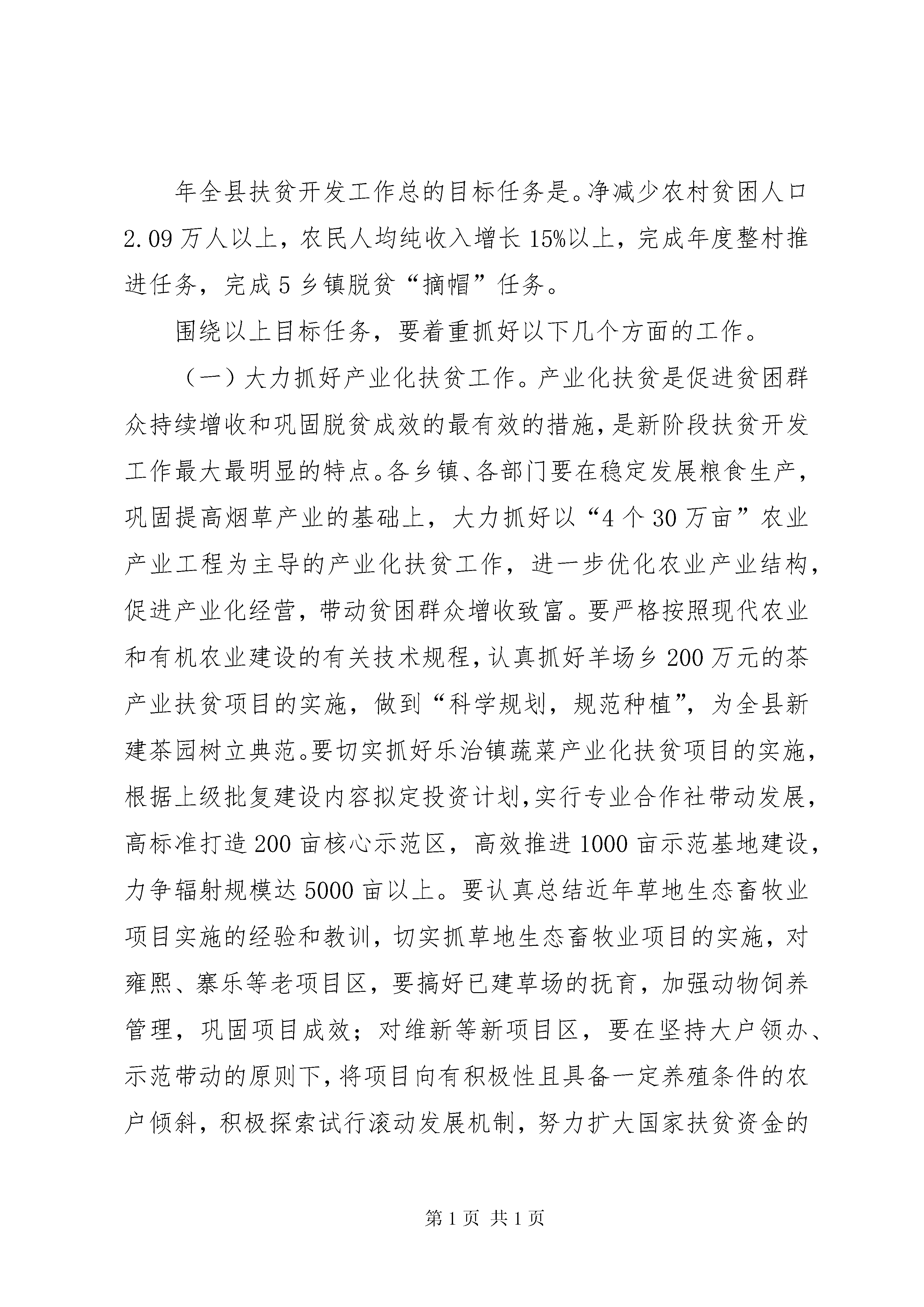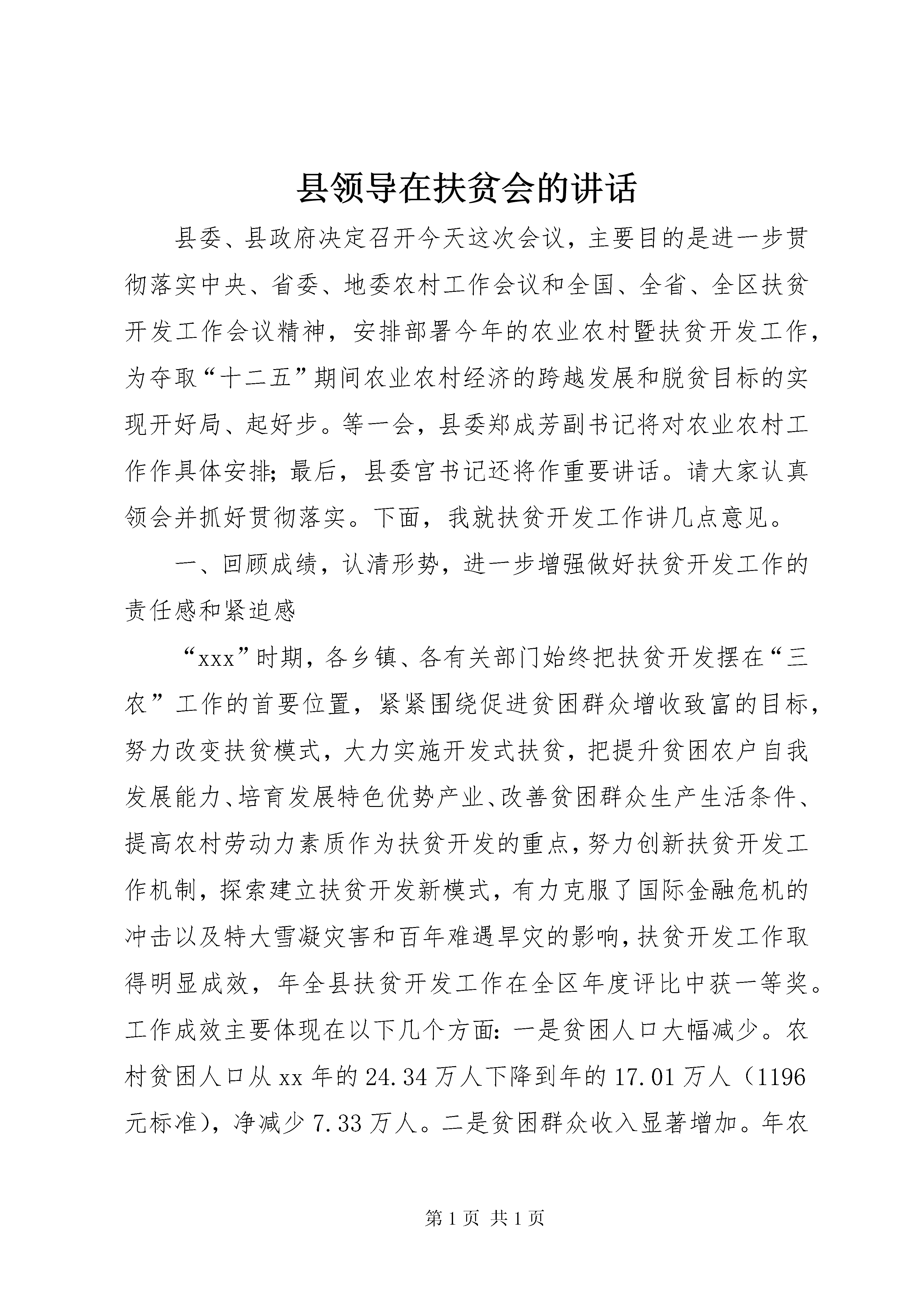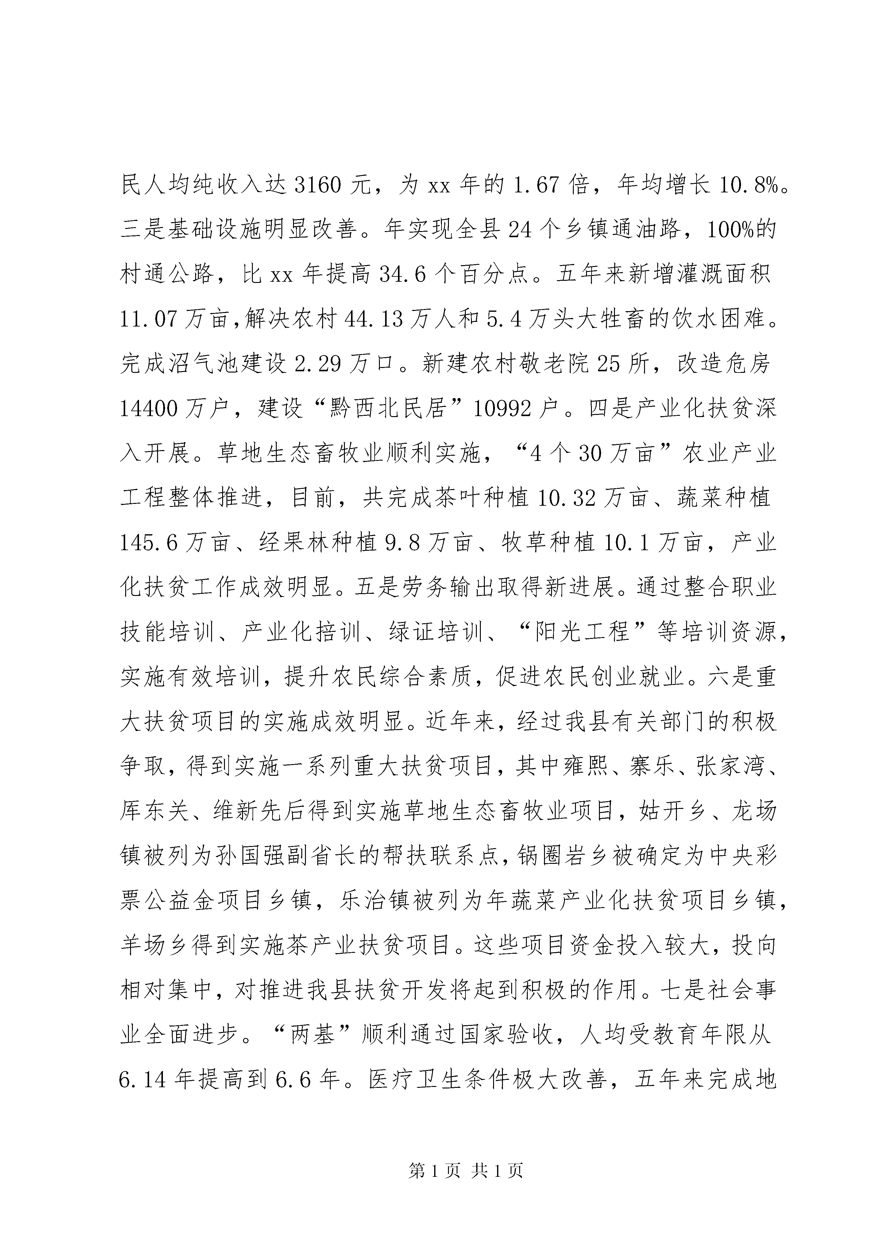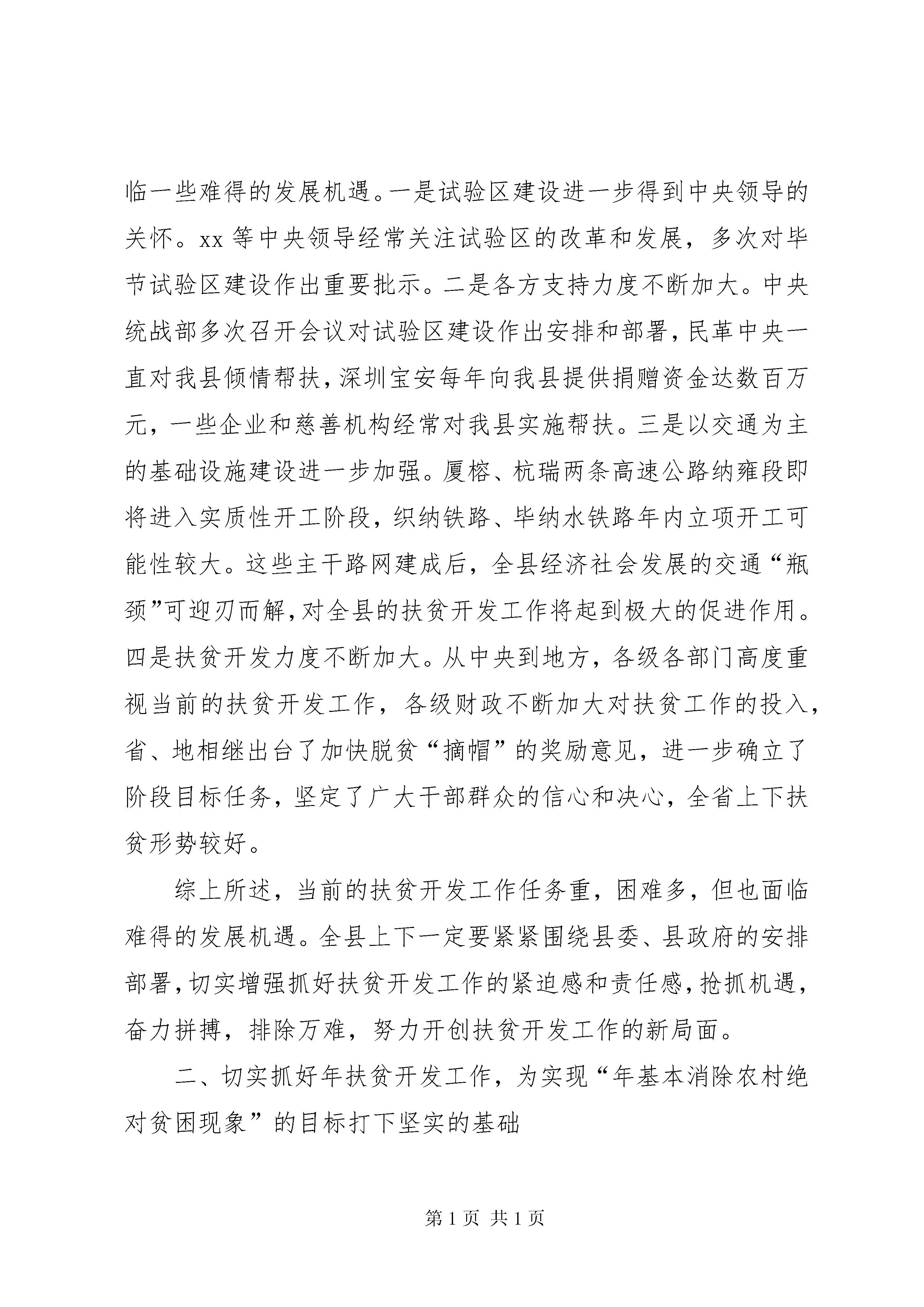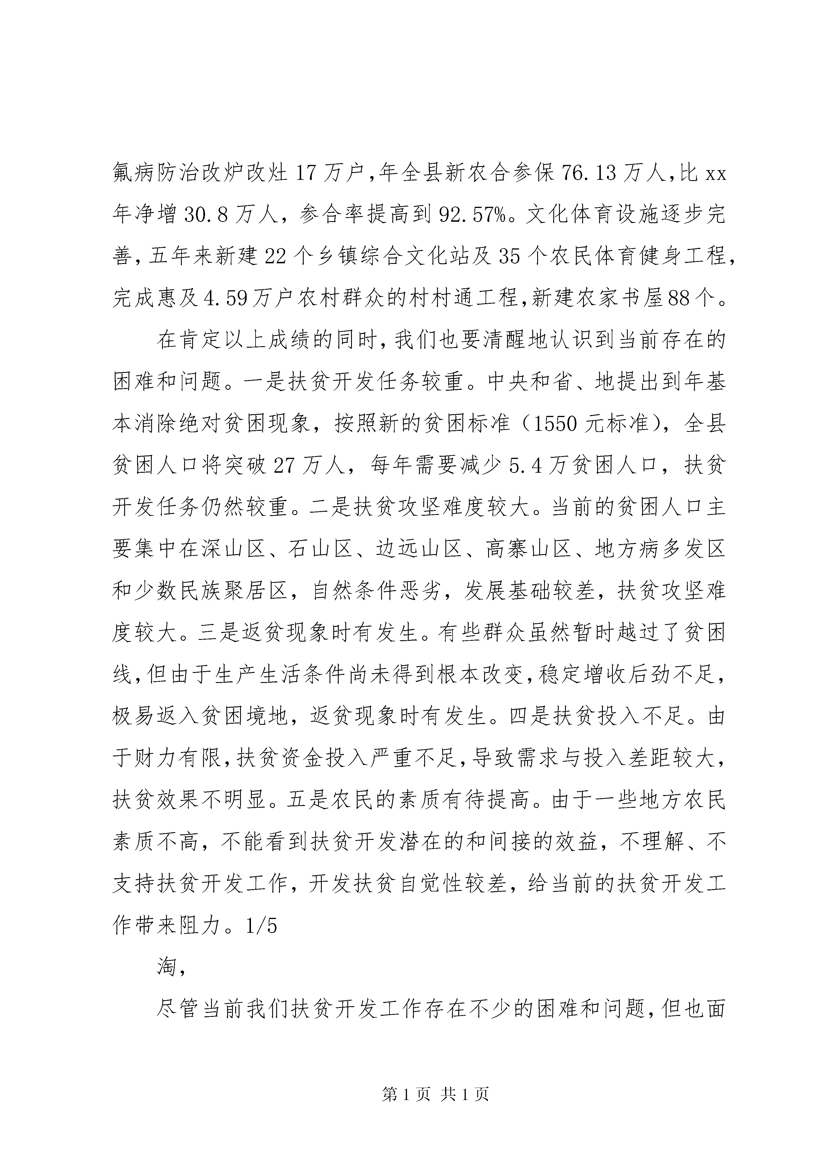 县领导在扶贫会的讲话县委、县政府决定召开今天这次会议,主要目的是进一步贯彻落实中央、省委、地委农村工作会议和全国、全省、全区扶贫开发工作会议精神,安排部署今年的农业农村暨扶贫开发工作,为夺取“十二五”期间农业农村经济的跨越发展和脱贫目标的实现开好局、起好步。等一会,县委郑成芳副书记将对农业农村工作作具体安排;最后,县委宫书记还将作重要讲话。请大家认真领会并抓好贯彻落实。下面,我就扶贫开发工作讲几点意见。一、回顾成绩,认清形势,进一步增强做好扶贫开发工作的责任感和紧迫感“xxx”时期,各乡镇、各有关部门始终把扶贫开发摆在“三农”工作的首要位置,紧紧围绕促进贫困群众增收致富的目标,努力改变扶贫模式,大力实施开发式扶贫,把提升贫困农户自我发展能力、培育发展特色优势产业、改善贫困群众生产生活条件、提高农村劳动力素质作为扶贫开发的重点,努力创新扶贫开发工作机制,探索建立扶贫开发新模式,有力克服了国际金融危机的冲击以及特大雪凝灾害和百年难遇旱灾的影响,扶贫开发工作取得明显成效,年全县扶贫开发工作在全区年度评比中获一等奖。工作成效主要体现在以下几个方面:一是贫困人口大幅减少。农村贫困人口从xx年的24.34万人下降到年的17.01万人(1196元标准),净减少7.33万人。二是贫困群众收入显著增加。年农民人均纯收入达3160元,为xx年的1.67倍,年均增长10.8%。三是基础设施明显改善。年实现全县24个乡镇通油路,100%的村通公路,比xx年提高34.6个百分点。五年来新增灌溉面积11.07万亩,解决农村44.13万人和5.4万头大牲畜的饮水困难。完成沼气池建设2.29万口。新建农村敬老院25所,改造危房14400万户,建设“黔西北民居”10992户。四是产业化扶贫深入开展。草地生态畜牧业顺利实施,“4个30万亩”农业产业工程整体推进,目前,共完成茶叶种植10.32万亩、蔬菜种植145.6万亩、经果林种植9.8万亩、牧草种植10.1万亩,产业化扶贫工作成效明显。五是劳务输出取得新进展。通过整合职业技能培训、产业化掊训、绿证培训、“阳光工程”等培训资源,实施有效培训,提升农民综合素质,促进农民创业就业。六是重大扶贫项目的实施成效明显。近年来,经过我县有关部门的积极争取,得到实施一系列重大扶贫项目,其中雍熙、寨乐、张家湾、厍东关、维新先后得到实施草地生态畜牧业项目,姑开乡、龙场镇被列为孙国强副省长的帮扶联系点,锅圈岩乡被确定为中央彩票公益金项目乡镇,乐治镇被列为年蔬菜产业化扶贫项目乡镇,羊场乡得到实施茶产业扶贫项目。这些项目资金投入较大,投向相对集中,对推进我县扶贫开发将起到积极的作用。七是社会事业全面进步。“两基”顺利通过国家验收,人均受教育年限从6.14年提高到6.6年。医疗卫生条件极大改善,五年来完成地氟病防治改炉改灶17万户,年全县新农合参保76.13万人,比xx年净增30.8万人,参合率提高到92.57%。文化体育设施逐步完善,五年来新建22个乡镇综合文化站及35个农民体育健身工程,完成惠及4.59万户农村群众的村村通工程,新建农家书屋88个。在肯定以上成绩的同时,我们也要清醒地认识到当前存在的困难和问题。一是扶贫开发任务较重。中央和省、地提出到年基本消除绝对贫困现象,按照新的贫困标准(1550元标准),全县贫困人口将突破27万人,每年需要减少5.4万贫困人口,扶贫开发任务仍然较重。二是扶贫攻坚难度较大。当前的贫困人口主要集中在深山区、石山区、边远山区、高寨山区、地方病多发区和少数民族聚居区,自然条件恶劣,发展基础较差,扶贫攻坚难度较大。三是返贫现象时有发生。有些群众虽然暂时越过了贫困线,但由于生产生活条件尚未得到根本改变,稳定增收后劲不足,极易返入贫困境地,返贫现象时有发生。四是扶贫投入不足。由于财力有限,扶贫资金投入严重不足,导致需求与投入差距较大,扶贫效果不明显。五是农民的素质有待提高。由于一些地方农民素质不高,不能看到扶贫开发潜在的和间接的效益,不理解、不支持扶贫开发工作,开发扶贫自觉性较差,给当前的扶贫开发工作带来阻力。1/5淘,尽管当前我们扶贫开发工作存在不少的困难和问题,但也面临一些难得的发展机遇。一是试验区建设进一步得到中央领导的关怀。xx等中央领导经常关注试验区的改革和发展,多次对毕节试验区建设作出重要批示。二是各方支持力度不断加大。中央统战部多次召开会议对试验区建设作出安排和部署,民革中央一直对我县倾情帮扶,深圳宝安每年向我县提供捐赠资金达数百万元,一些企业和慈善机构经常对我县实施帮扶。三是以交通为主的基础设施建设进一步加强。厦榕、杭瑞两条高速公路纳雍段即将进入实质性开工阶段,织纳铁路、毕纳水铁路年内立项开工可能性较大。这些主干路网建成后,全县经济社会发展的交通“瓶颈”可迎刃而解,对全