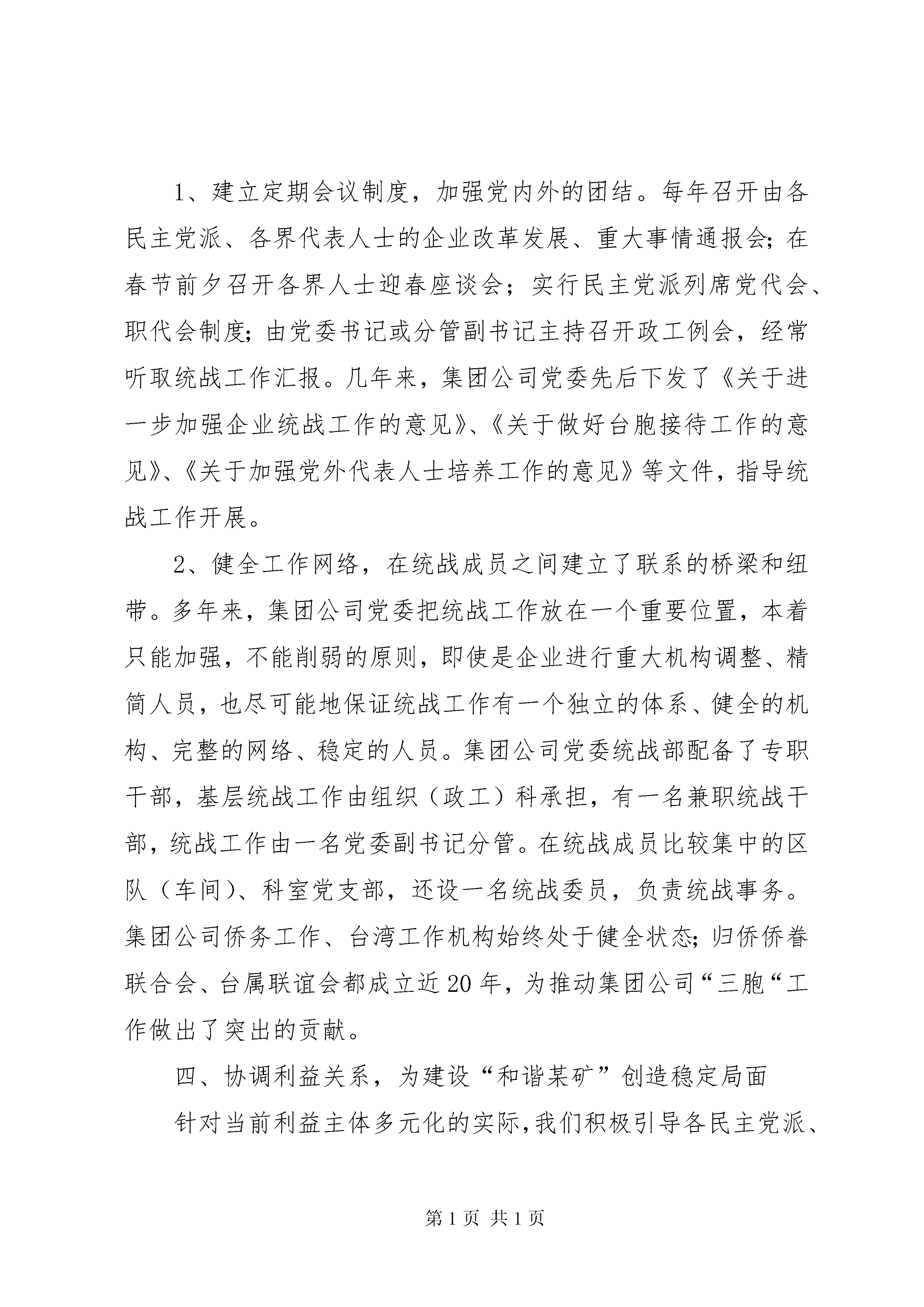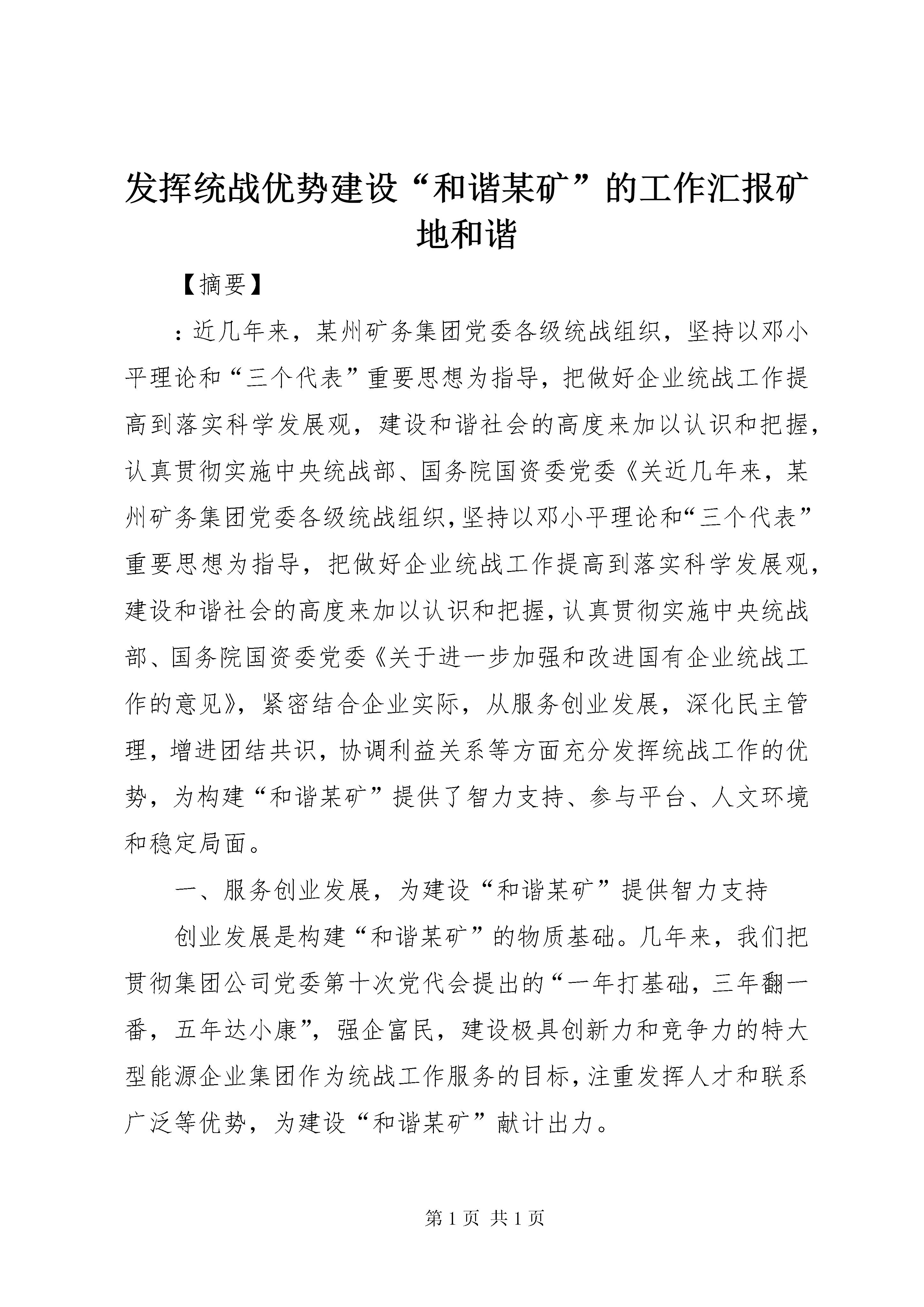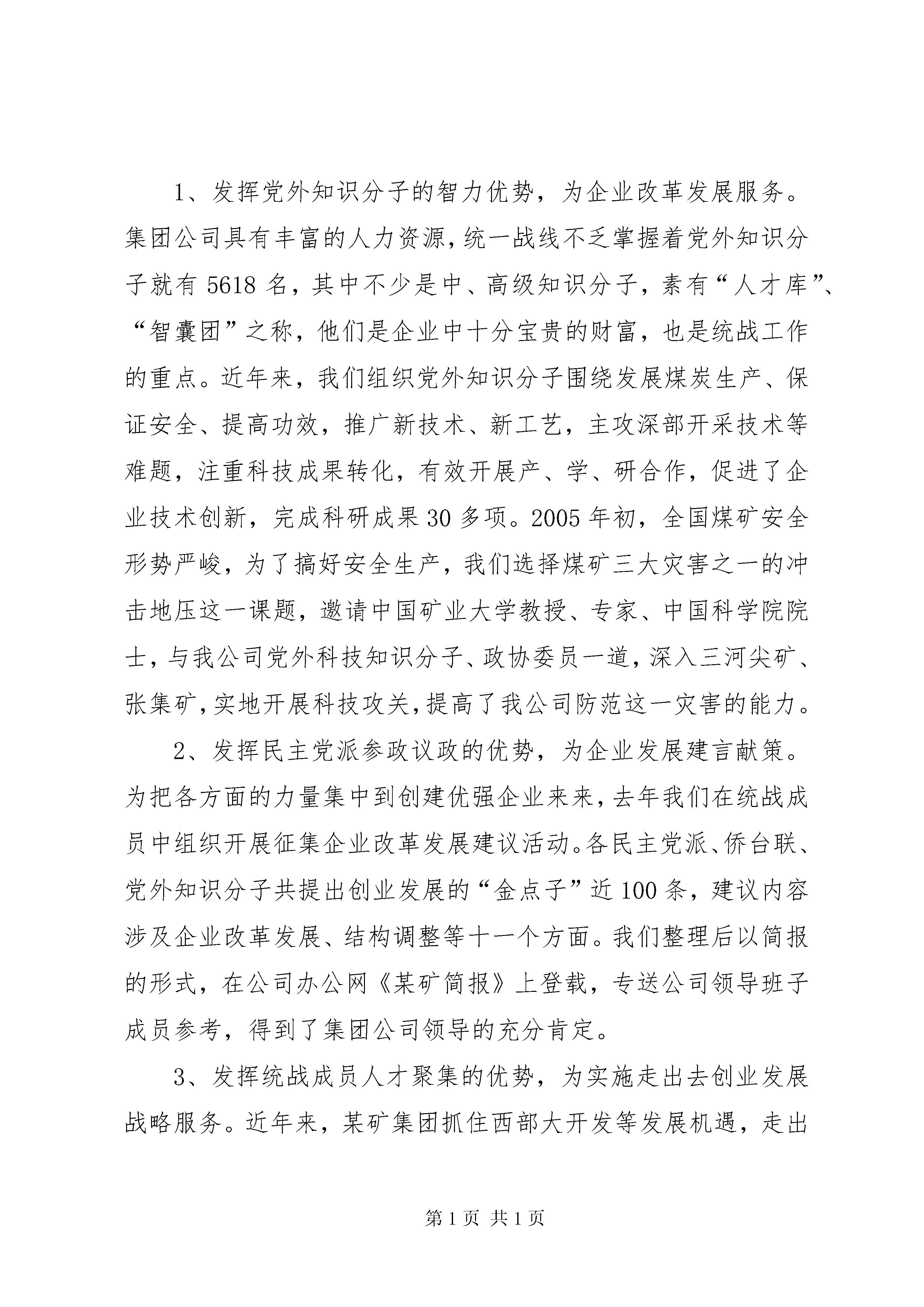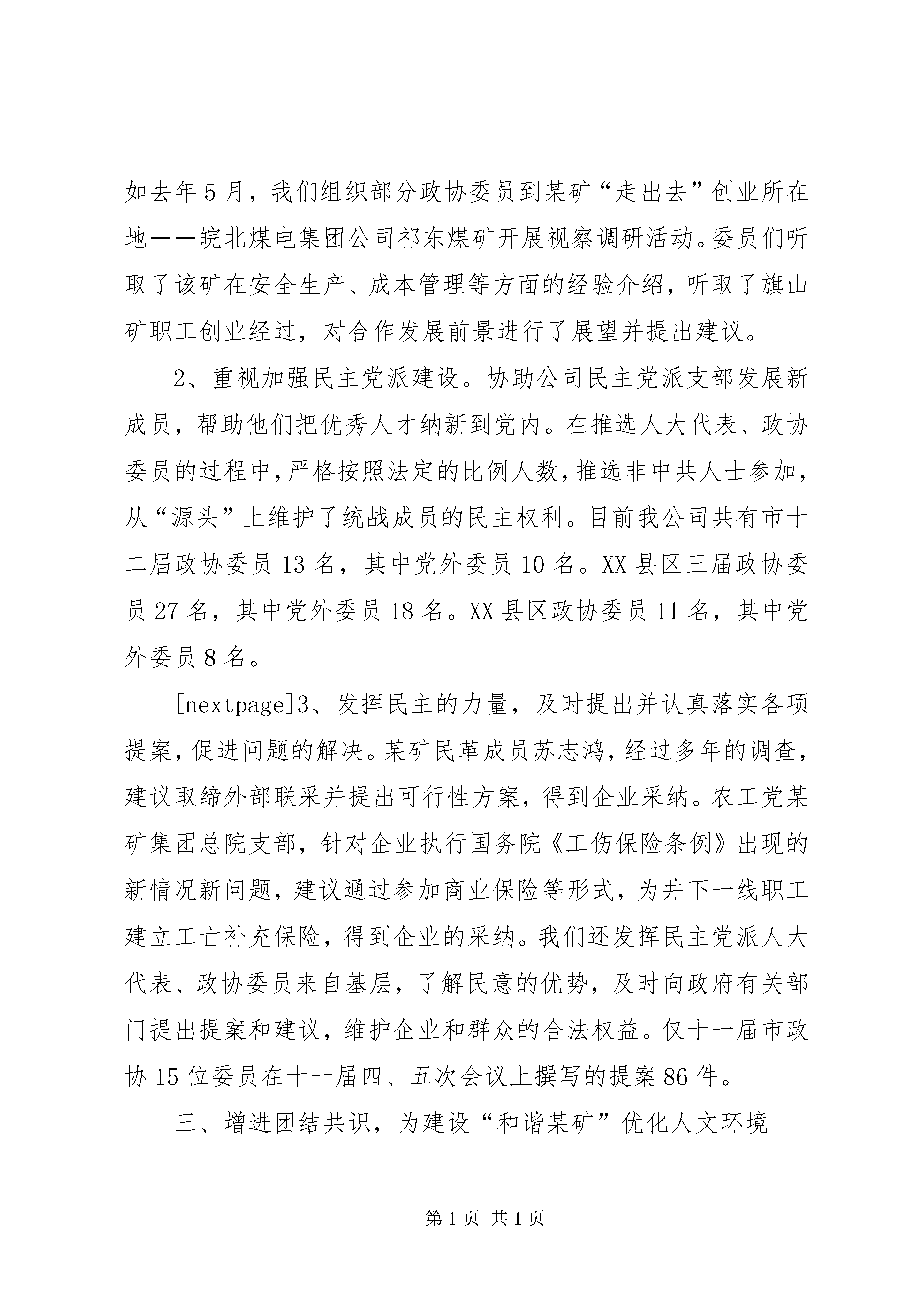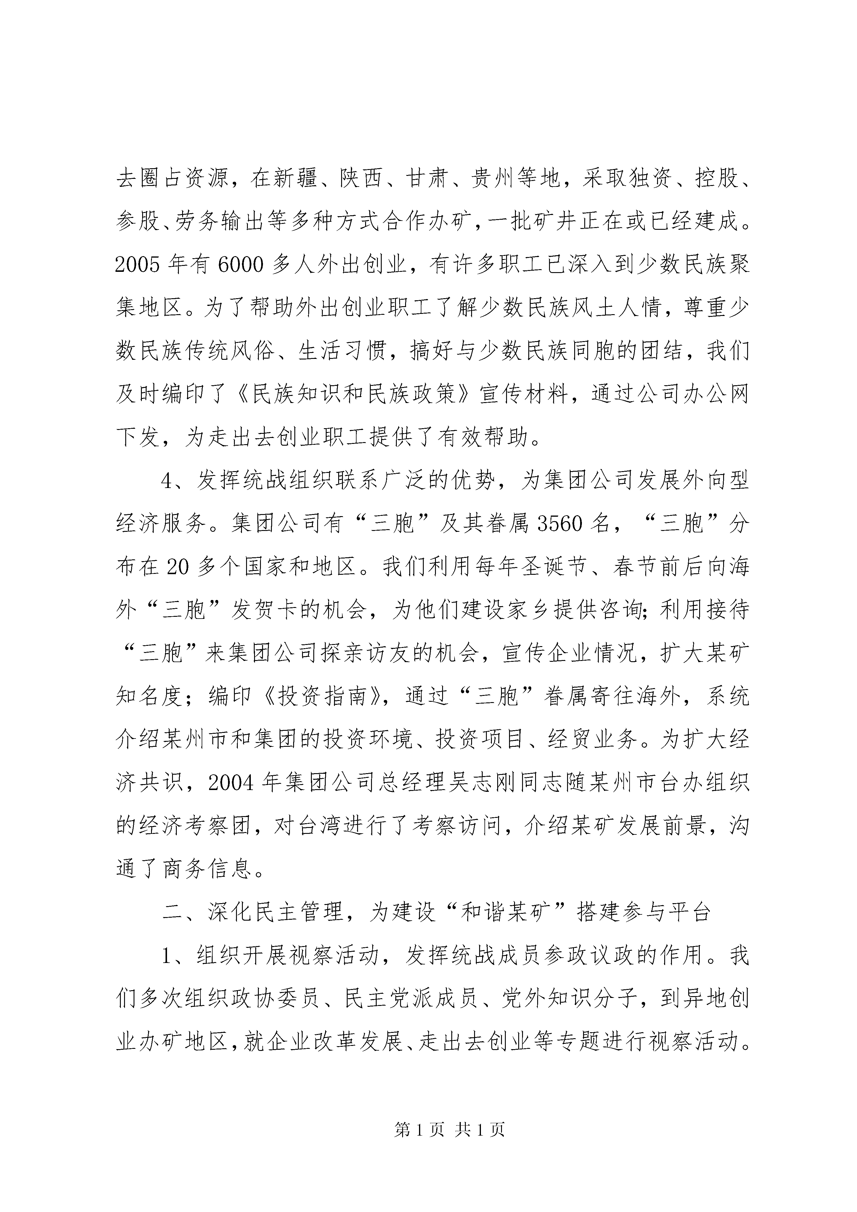 发挥统战优势建设“和谐某矿”的工作汇报矿地和谐【摘要】:近几年来,某州矿务集团党委各级统战组织,坚持以邓小平理论和“三个代表”重要思想为指导,把做好企业统战工作提高到落实科学发展观,建设和谐社会的高度来加以认识和把握,认真贯彻实施中央统战部、国务院国资委党委《关近几年来,某州矿务集团党委各级统战组织,坚持以邓小平理论和“三个代表”重要思想为指导,把做好企业统战工作提高到落实科学发展观,建设和谐社会的高度来加以认识和把握,认真贯彻实施中央统战部、国务院国资委党委《关于进一步加强和改进国有企业统战工作的意见》,紧密结合企业实际,从服务创业发展,深化民主管理,增进团结共识,协调利益关系等方面充分发挥统战工作的优势,为构建“和谐某矿”提供了智力支持、参与平台、人文环境和稳定局面。一、服务创业发展,为建设“和谐某矿”提供智力支持创业发展是构建“和谐某矿”的物质基础。几年来,我们把贯彻集团公司党委第十次党代会提出的“一年打基础,三年翻一番,五年达小康”,强企富民,建设极具创新力和竞争力的特大型能源企业集团作为统战工作服务的目标,注重发挥人才和联系广泛等优势,为建设“和谐某矿”献计出力。1、发挥党外知识分子的智力优势,为企业改革发展服务。集团公司具有丰富的人力资源,统一战线不乏掌握着党外知识分子就有5618名,其中不少是中、高级知识分子,素有“人才库”、“智囊团”之称,他们是企业中十分宝贵的财富,也是统战工作的重点。近年来,我们组织党外知识分子围绕发展煤炭生产、保证安全、提高功效,推广新技术、新工艺,主攻深部开采技术等难题,注重科技成果转化,有效开展产、学、研合作,促进了企业技术创新,完成科研成果30多项。2005年初,全国煤矿安全形势严峻,为了搞好安全生产,我们选择煤矿三大灾害之一的冲击地压这一课题,邀请中国矿业大学教授、专家、中国科学院院士,与我公司党外科技知识分子、政协委员一道,深入三河尖矿、张集矿,实地开展科技攻关,提高了我公司防范这一灾害的能力。2、发挥民主党派参政议政的优势,为企业发展建言献策。为把各方面的力量集中到创建优强企业来来,去年我们在统战成员中组织开展征集企业改革发展建议活动。各民主党派、侨台联、党外知识分子共提出创业发展的“金点子”近100条,建议内容涉及企业改革发展、结构调整等十一个方面。我们整理后以简报的形式,在公司办公网《某矿简报》上登载,专送公司领导班子成员参考,得到了集团公司领导的充分肯定。3、发挥统战成员人才聚集的优势,为实施走出去创业发展战略服务。近年来,某矿集团抓住西部大开发等发展机遇,走出去圈占资源,在新疆、陕西、甘肃、贵州等地,采取独资、控股、参股、劳务输出等多种方式合作办矿,一批矿井正在或已经建成。2005年有6000多人外出创业,有许多职工已深入到少数民族聚集地区。为了帮助外出创业职工了解少数民族风土人情,尊重少数民族传统风俗、生活习惯,搞好与少数民族同胞的团结,我们及时编印了《民族知识和民族政策》宣传材料,通过公司办公网下发,为走出去创业职工提供了有效帮助。4、发挥统战组织联系广泛的优势,为集团公司发展外向型经济服务。集团公司有“三胞”及其眷属3560名,“三胞”分布在20多个国家和地区。我们利用每年圣诞节、春节前后向海外“三胞”发贺卡的机会,为他们建设家乡提供咨询;利用接待“三胞”来集团公司探亲访友的机会,宣传企业情况,扩大某矿知名度;编印《投资指南》,通过“三胞”眷属寄往海外,系统介绍某州市和集团的投资环境、投资项目、经贸业务。为扩大经济共识,2004年集团公司总经理吴志刚同志随某州市台办组织的经济考察团,对台湾进行了考察访问,介绍某矿发展前景,沟通了商务信息。二、深化民主管理,为建设“和谐某矿”搭建参与平台1、组织开展视察活动,发挥统战成员参政议政的作用。我们多次组织政协委员、民主党派成员、党外知识分子,到异地创业办矿地区,就企业改革发展、走出去创业等专题进行视察活动。如去年5月,我们组织部分政协委员到某矿“走出去”创业所在地――皖北煤电集团公司祁东煤矿开展视察调研活动。委员们听取了该矿在安全生产、成本管理等方面的经验介绍,听取了旗山矿职工创业经过,对合作发展前景进行了展望并提出建议。2、重视加强民主党派建设。协助公司民主党派支部发展新成员,帮助他们把优秀人才纳新到党内。在推选人大代表、政协委员的过程中,严格按照法定的比例人数,推选非中共人士参加,从“源头”上维护了统战成员的民主权利。目前我公司共有市十二届政协委员13名,其中党外委员10名。XX县区三届政协委员27名,其中党外委员18名。XX县区政协委员11名,其中党外委员8名。[nextpage]3、发挥民主的力量,及时提出并认真落实各项提案,促进问题的解决。某矿民革成员苏志鸿,经过多年的调查,建议取缔外部