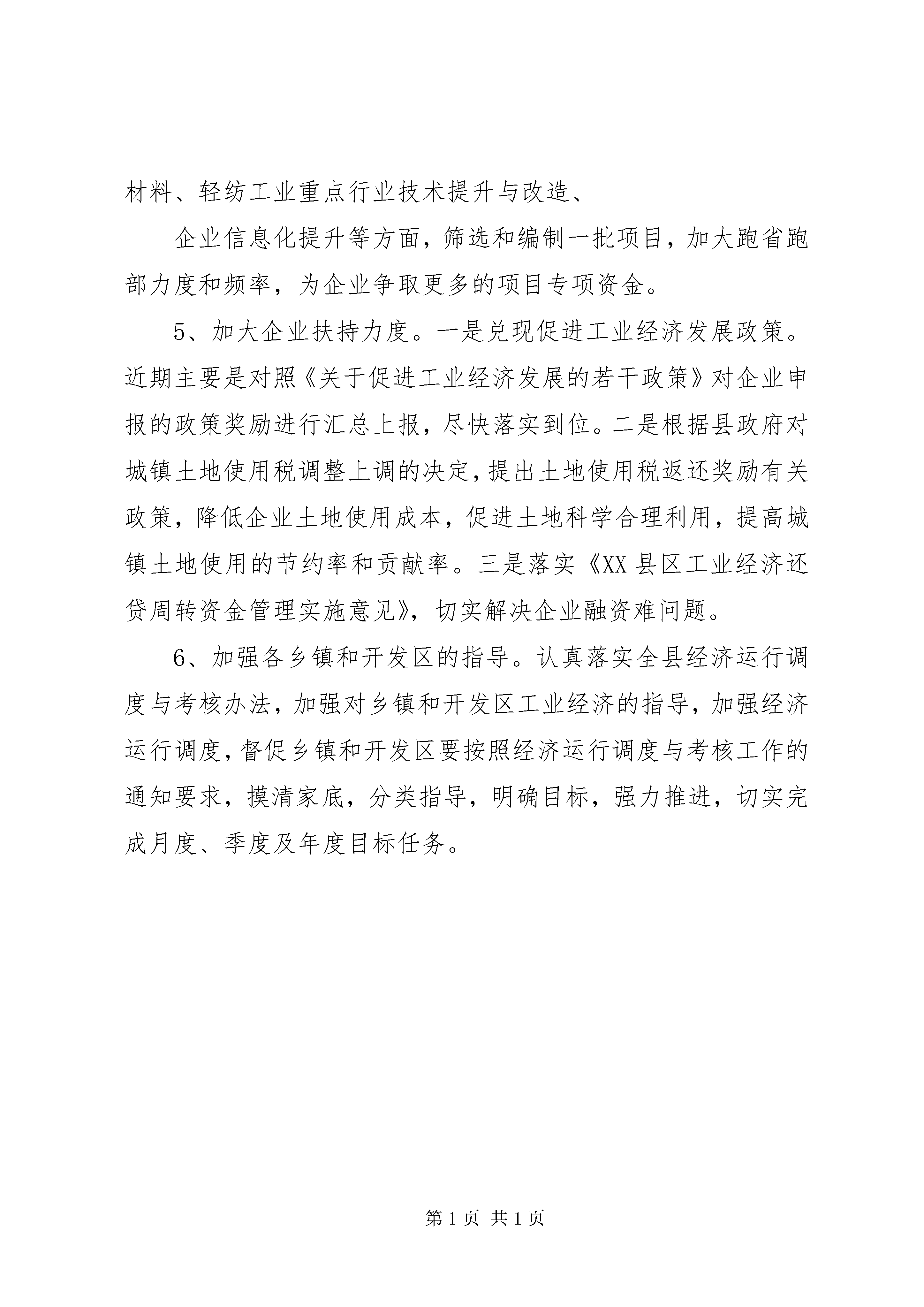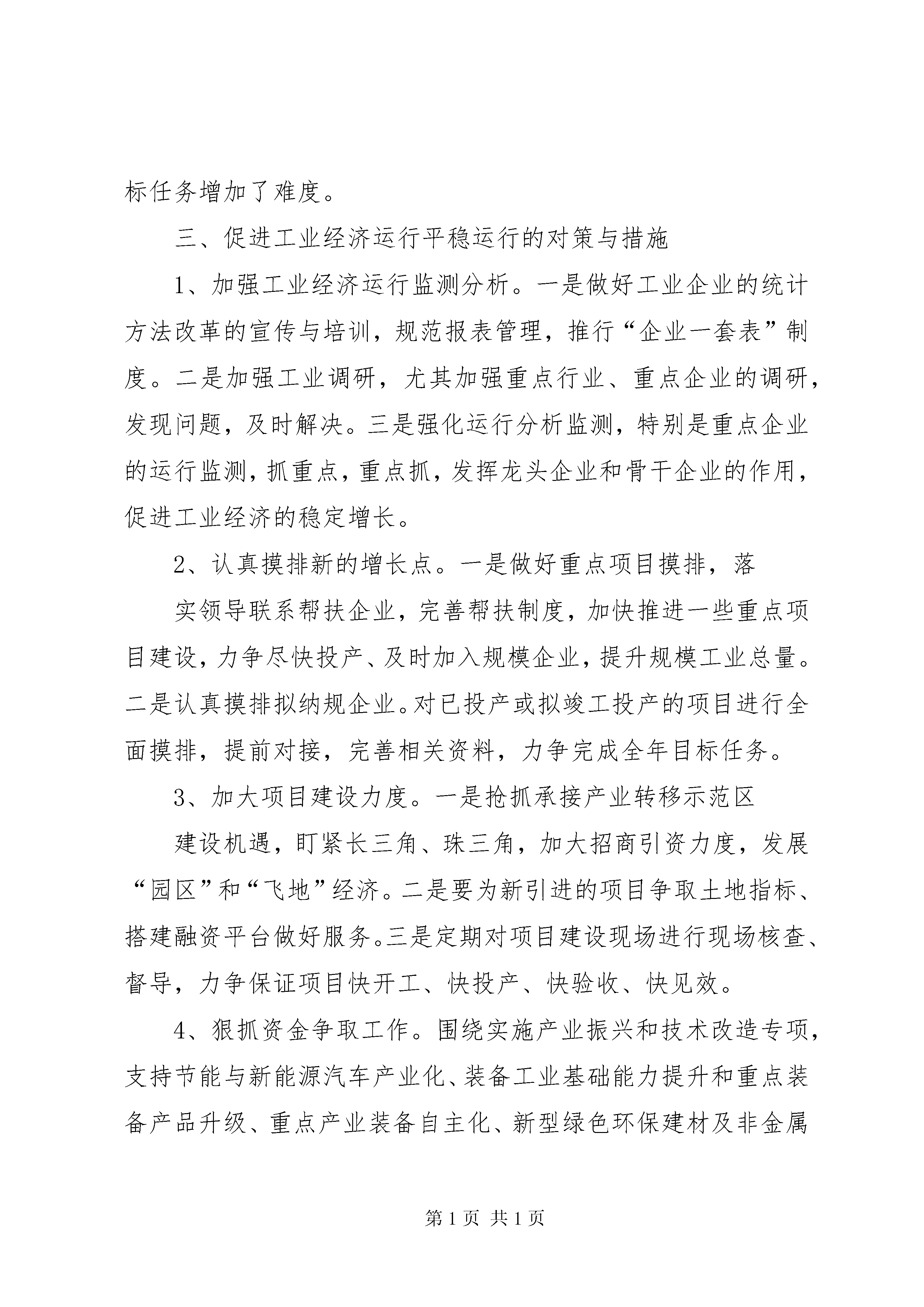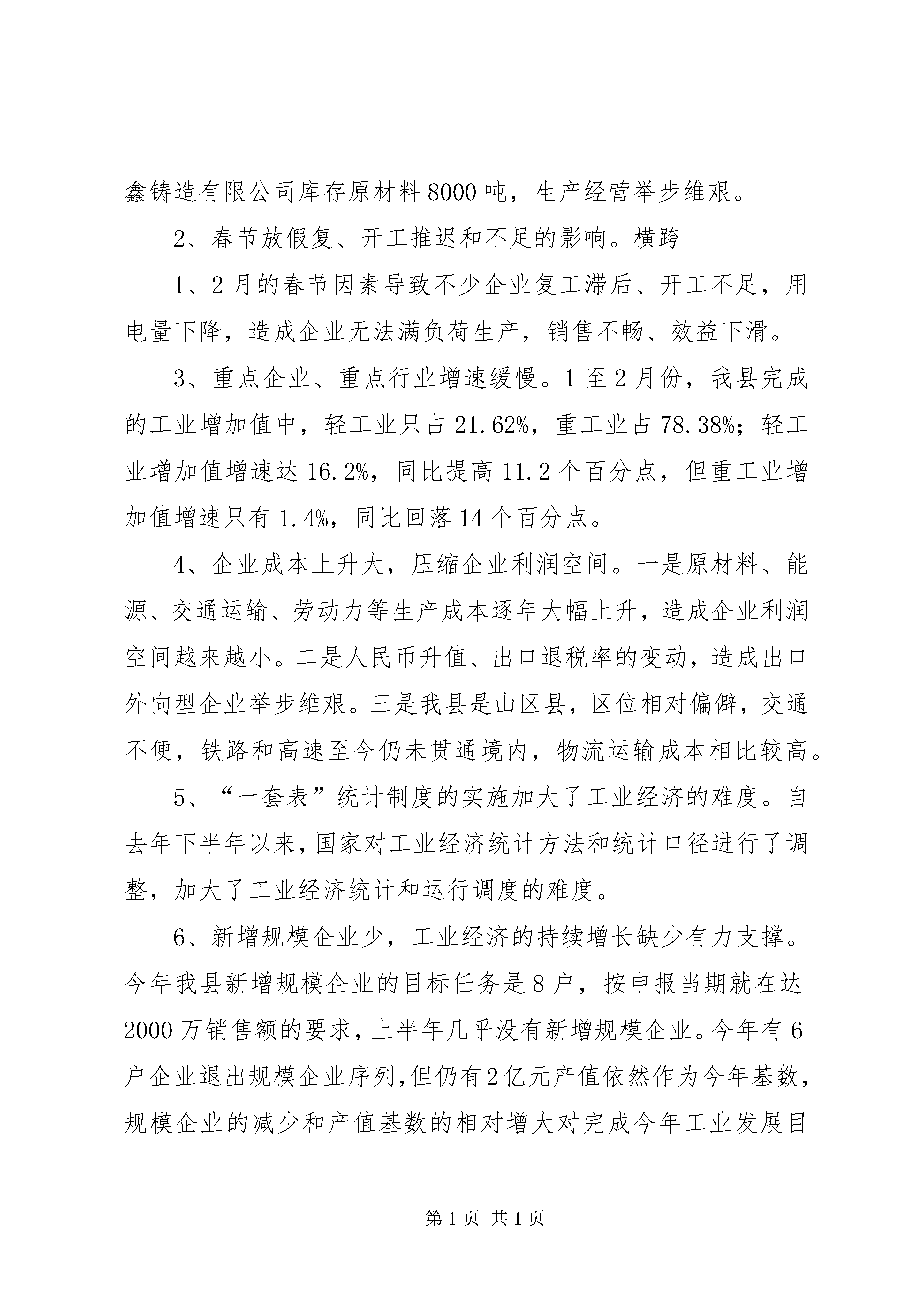 发改委一季度经济运行情况汇报XX县区工业经济运行分析报告XX县区经济和信息化委员会(2012年3月27日)各位领导、同志们:根据会议安排,现就我县工业经济发展工作如下发言:一、1至2月份工业经济运行基本情况1至2月份,我县84户规模工业企业完成工业总产值9.69亿元,比上年同期增长6.93%;其中电机泵阀、宣纸书画纸和方解石加工三大产业完成产值亿元,同比增长%;完成工业增加值2.2亿元,同比增长4.4%;工业固定投资1.17亿元,同比增长24.2%;1-2月份全社会用电量比上年同期下降26.3%,其中工业用电量同比下降33.4%。二、工业经济运行存在的主要问题1、宏观经济形势的复杂多变对我县工业经济影响较大。今年由于受国际市场低迷、能源资源竞争加剧、贸易保护主义倾向愈加突出等诸多因素和国内房地产调控政策的持续影响,我县工业经济发展继2009年后又一次遭遇很大困境,对我县重点行业、重点企业冲击较大。如皖南电机股份公司采取降价5%的促销措施,只维持了85%的销量,订单比上年同期下降了20%左右;隆鑫铸造有限公司库存原材料8000吨,生产经营举步维艰。2、春节放假复、开工推迟和不足的影响。横跨1、2月的春节因素导致不少企业复工滞后、开工不足,用电量下降,造成企业无法满负荷生产,销售不畅、效益下滑。3、重点企业、重点行业增速缓慢。1至2月份,我县完成的工业增加值中,轻工业只占21.62%,重工业占78.38%;轻工业增加值增速达16.2%,同比提高11.2个百分点,但重工业增加值增速只有1.4%,同比回落14个百分点。4、企业成本上升大,压缩企业利润空间。一是原材料、能源、交通运输、劳动力等生产成本逐年大幅上升,造成企业利润空间越来越小。二是人民币升值、出口退税率的变动,造成出口外向型企业举步维艰。三是我县是山区县,区位相对偏僻,交通不便,铁路和高速至今仍未贯通境内,物流运输成本相比较高。5、“一套表”统计制度的实施加大了工业经济的难度。自去年下半年以来,国家对工业经济统计方法和统计口径进行了调整,加大了工业经济统计和运行调度的难度。6、新增规模企业少,工业经济的持续增长缺少有力支撑。今年我县新增规模企业的目标任务是8户,按申报当期就在达2000万销售额的要求,上半年几乎没有新增规模企业。今年有6户企业退出规模企业序列,但仍有2亿元产值依然作为今年基数,规模企业的减少和产值基数的相对增大对完成今年工业发展目标任务增加了难度。三、促进工业经济运行平稳运行的对策与措施1、加强工业经济运行监测分析。一是做好工业企业的统计方法改革的宣传与培训,规范报表管理,推行“企业一套表”制度。二是加强工业调研,尤其加强重点行业、重点企业的调研,发现问题,及时解决。三是强化运行分析监测,特别是重点企业的运行监测,抓重点,重点抓,发挥龙头企业和骨干企业的作用,促进工业经济的稳定增长。2、认真摸排新的增长点。一是做好重点项目摸排,落实领导联系帮扶企业,完善帮扶制度,加快推进一些重点项目建设,力争尽快投产、及时加入规模企业,提升规模工业总量。二是认真摸排拟纳规企业。对已投产或拟竣工投产的项目进行全面摸排,提前对接,完善相关资料,力争完成全年目标任务。3、加大项目建设力度。一是抢抓承接产业转移示范区建设机遇,盯紧长三角、珠三角,加大招商引资力度,发展“园区”和“飞地”经济。二是要为新引进的项目争取土地指标、搭建融资平台做好服务。三是定期对项目建设现场进行现场核查、督导,力争保证项目快开工、快投产、快验收、快见效。4、狠抓资金争取工作。围绕实施产业振兴和技术改造专项,支持节能与新能源汽车产业化、装备工业基础能力提升和重点装备产品升级、重点产业装备自主化、新型绿色环保建材及非金属材料、轻纺工业重点行业技术提升与改造、企业信息化提升等方面,筛选和编制一批项目,加大跑省跑部力度和频率,为企业争取更多的项目专项资金。5、加大企业扶持力度。一是兑现促进工业经济发展政策。近期主要是对照《关于促进工业经济发展的若干政策》对企业申报的政策奖励进行汇总上报,尽快落实到位。二是根据县政府对城镇土地使用税调整上调的决定,提出土地使用税返还奖励有关政策,降低企业土地使用成本,促进土地科学合理利用,提高城镇土地使用的节约率和贡献率。三是落实《XX县区工业经济还贷周转资金管理实施意见》,切实解决企业融资难问题。6、加强各乡镇和开发区的指导。认真落实全县经济运行调度与考核办法,加强对乡镇和开发区工业经济的指导,加强经济运行调度,督促乡镇和开发区要按照经济运行调度与考核工作的通知要求,摸清家底,分类指导,明确目标,强力推进,切实完成月度、季度及年度目标任务。