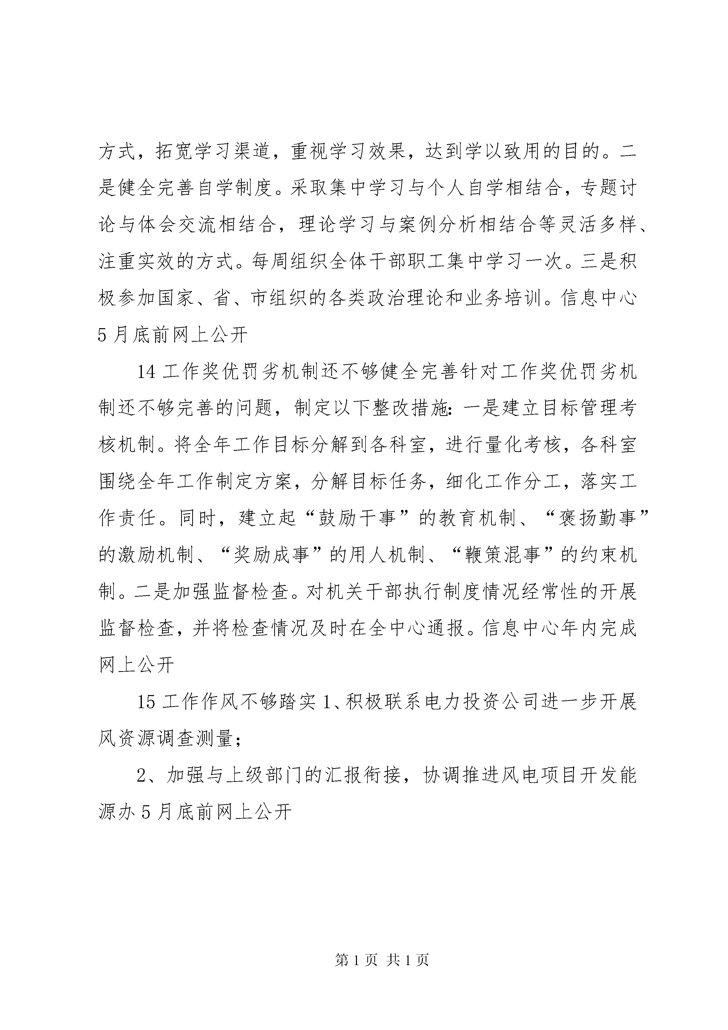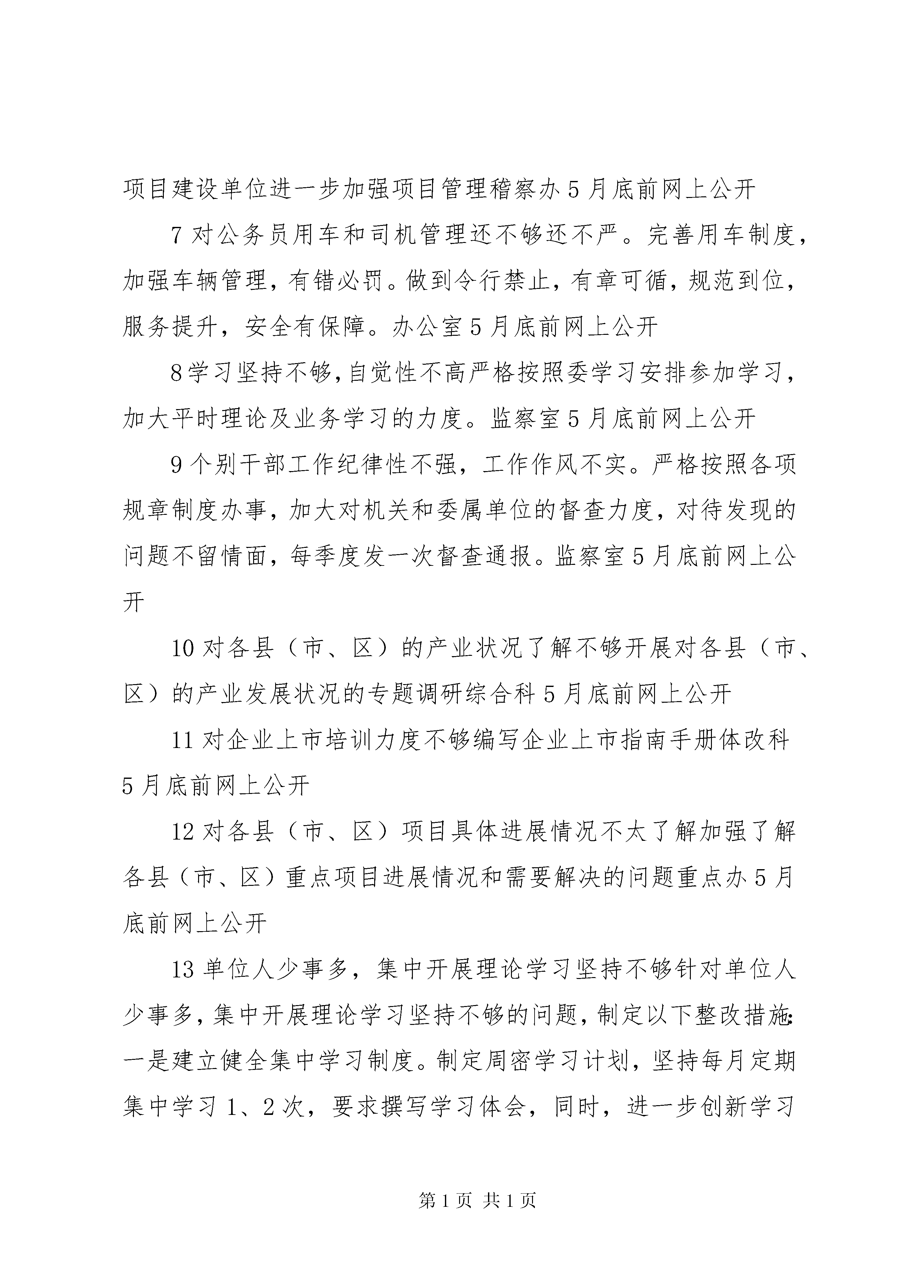 发改委作风活动整改汇报1理论学习不够制定学习计划,每月利用半天时间集中学习国家、省、市政策和领导讲话、会议精神,组织干部职工前往瑞金、延安等革命圣地进行党员主题教育。委党组、全体干部职工年内完成网上公开2下基层调研、为企业、服务对象解决实际问题和困难还有差距制定企业帮扶计划,严格各项规章制度,实行项目审批绿色通道制、一次性告知制等,定期开展基层调研。委党组6月底网上公开3组织外出参观考察很少,开阔眼界不够定期组织干部职工采取跟班培训、异地交流等形式加强与上级发改委和先进地区的联系交流,进一步解放思想,开阔眼界。委党组、全体干部职工年内完成网上公开4与干部谈心交心沟通还不够定期开展谈心活动,主要领导和分管领导谈,分管领导和科室负责人谈、科室负责人和科室人员谈。委班子成员6月底网上公开5对全市交通运输行业发展状况了解不够深入加强向前任工作人员学习咨询,加强与市各交通运输行业管理部门的联系沟通和管理资料的学习、掌握、熟悉,做到心中有数交通能源科5月底前网上公开6重项目稽察,轻项目管理服务在项目稽察过程中注意指导项目建设单位进一步加强项目管理稽察办5月底前网上公开7对公务员用车和司机管理还不够还不严。完善用车制度,加强车辆管理,有错必罚。做到令行禁止,有章可循,规范到位,服务提升,安全有保障。办公室5月底前网上公开8学习坚持不够,自觉性不高严格按照委学习安排参加学习,加大平时理论及业务学习的力度。监察室5月底前网上公开9个别干部工作纪律性不强,工作作风不实。严格按照各项规章制度办事,加大对机关和委属单位的督查力度,对待发现的问题不留情面,每季度发一次督查通报。监察室5月底前网上公开10对各县(市、区)的产业状况了解不够开展对各县(市、区)的产业发展状况的专题调研综合科5月底前网上公开11对企业上市培训力度不够编写企业上市指南手册体改科5月底前网上公开12对各县(市、区)项目具体进展情况不太了解加强了解各县(市、区)重点项目进展情况和需要解决的问题重点办5月底前网上公开13单位人少事多,集中开展理论学习坚持不够针对单位人少事多,集中开展理论学习坚持不够的问题,制定以下整改措施:一是建立健全集中学习制度。制定周密学习计划,坚持每月定期集中学习1、2次,要求撰写学习体会,同时,进一步创新学习方式,拓宽学习渠道,重视学习效果,达到学以致用的目的。二是健全完善自学制度。采取集中学习与个人自学相结合,专题讨论与体会交流相结合,理论学习与案例分析相结合等灵活多样、注重实效的方式。每周组织全体干部职工集中学习一次。三是积极参加国家、省、市组织的各类政治理论和业务培训。信息中心5月底前网上公开14工作奖优罚劣机制还不够健全完善针对工作奖优罚劣机制还不够完善的问题,制定以下整改措施:一是建立目标管理考核机制。将全年工作目标分解到各科室,进行量化考核,各科室围绕全年工作制定方案,分解目标任务,细化工作分工,落实工作责任。同时,建立起“鼓励干事”的教育机制、“褒扬勤事”的激励机制、“奖励成事”的用人机制、“鞭策混事”的约束机制。二是加强监督检查。对机关干部执行制度情况经常性的开展监督检查,并将检查情况及时在全中心通报。信息中心年内完成网上公开15工作作风不够踏实1、积极联系电力投资公司进一步开展风资源调查测量;2、加强与上级部门的汇报衔接,协调推进风电项目开发能源办5月底前网上公开