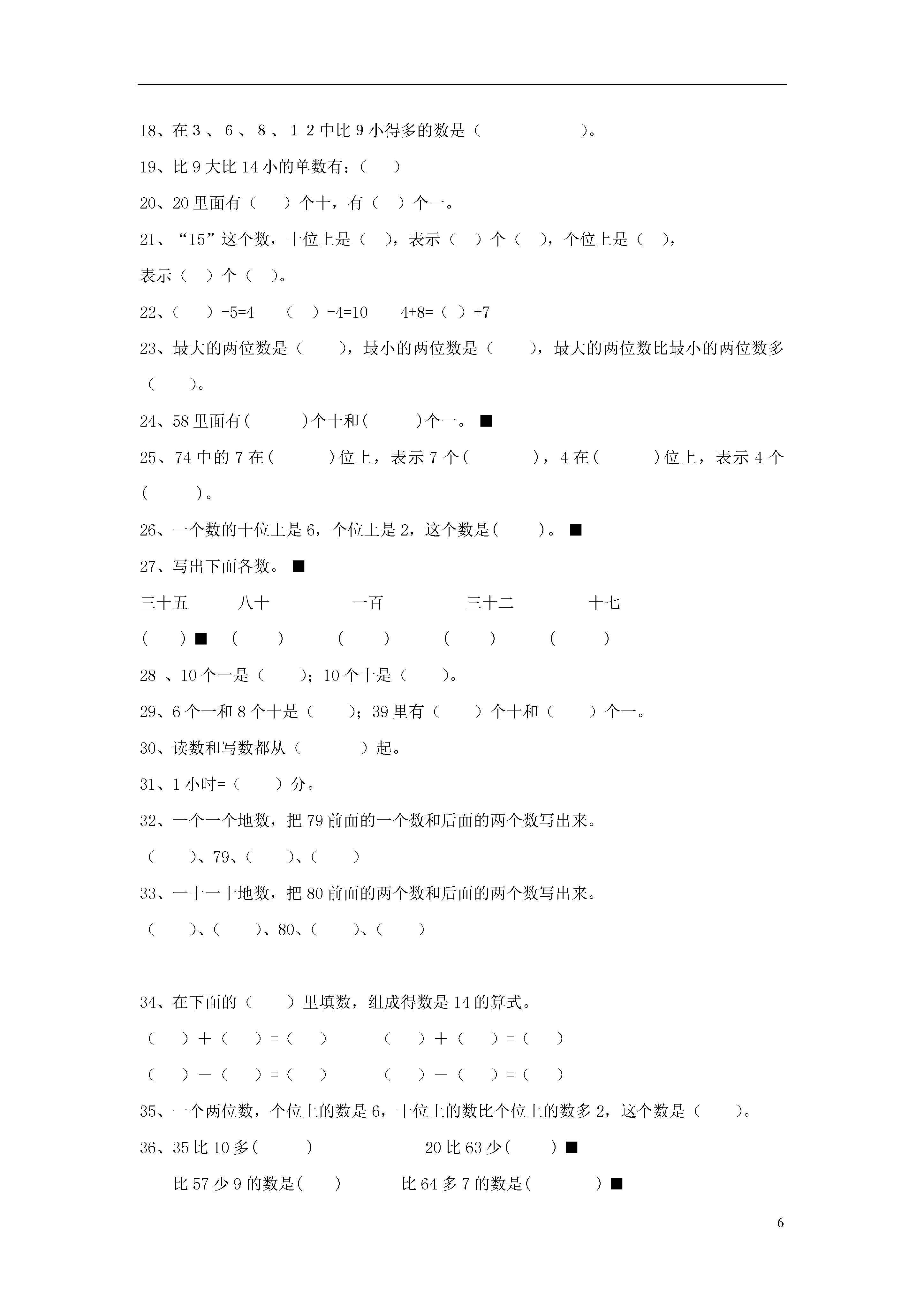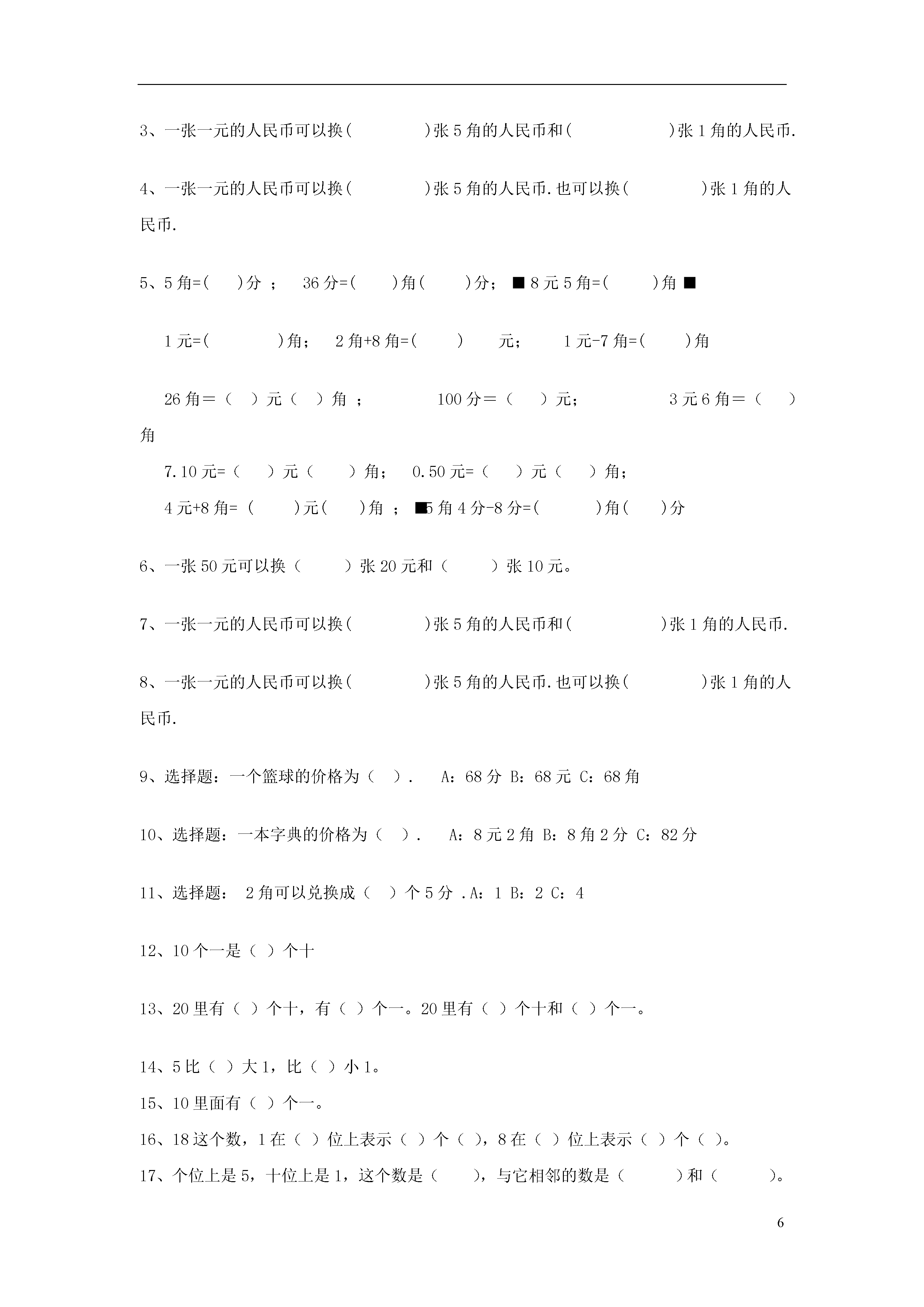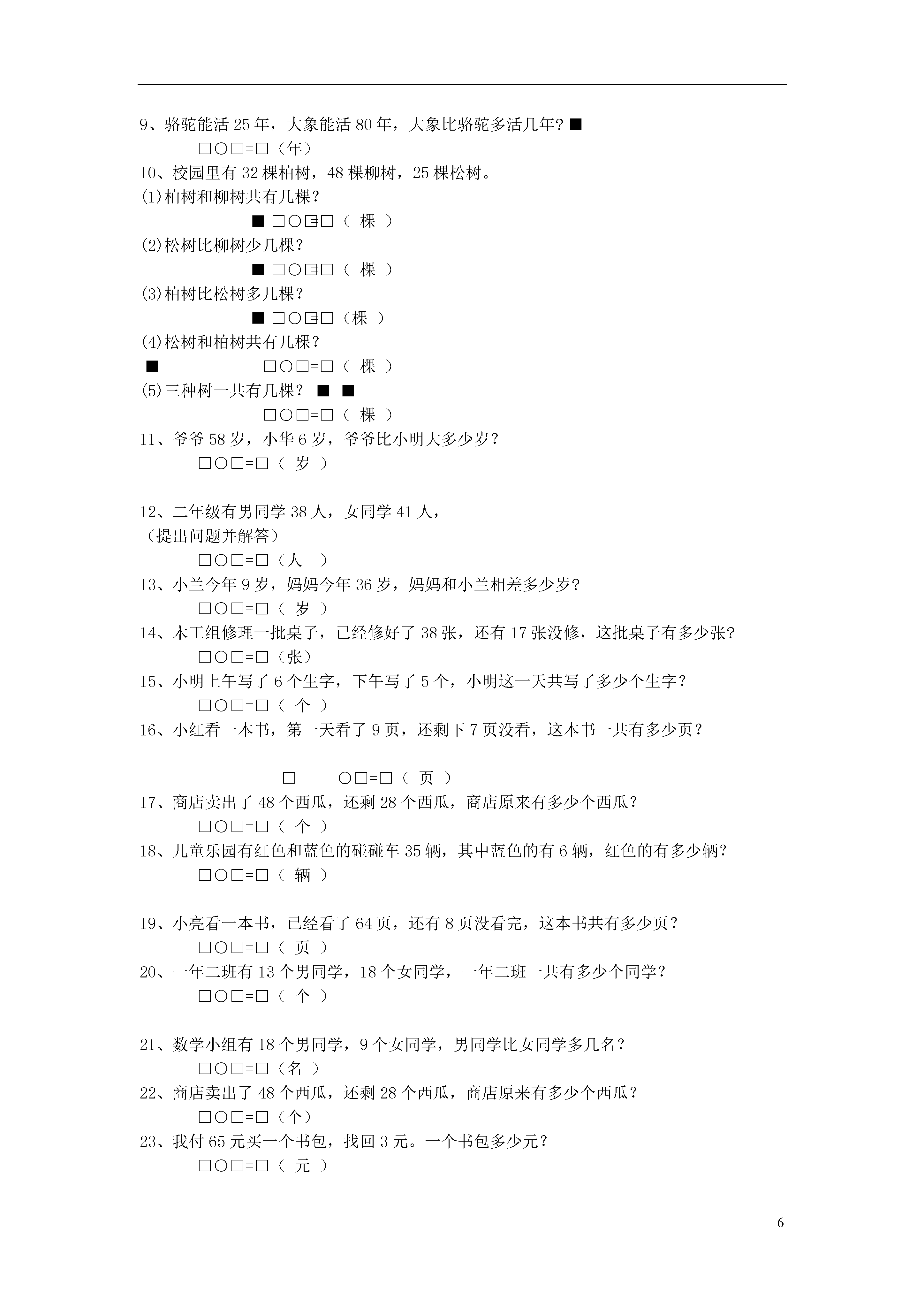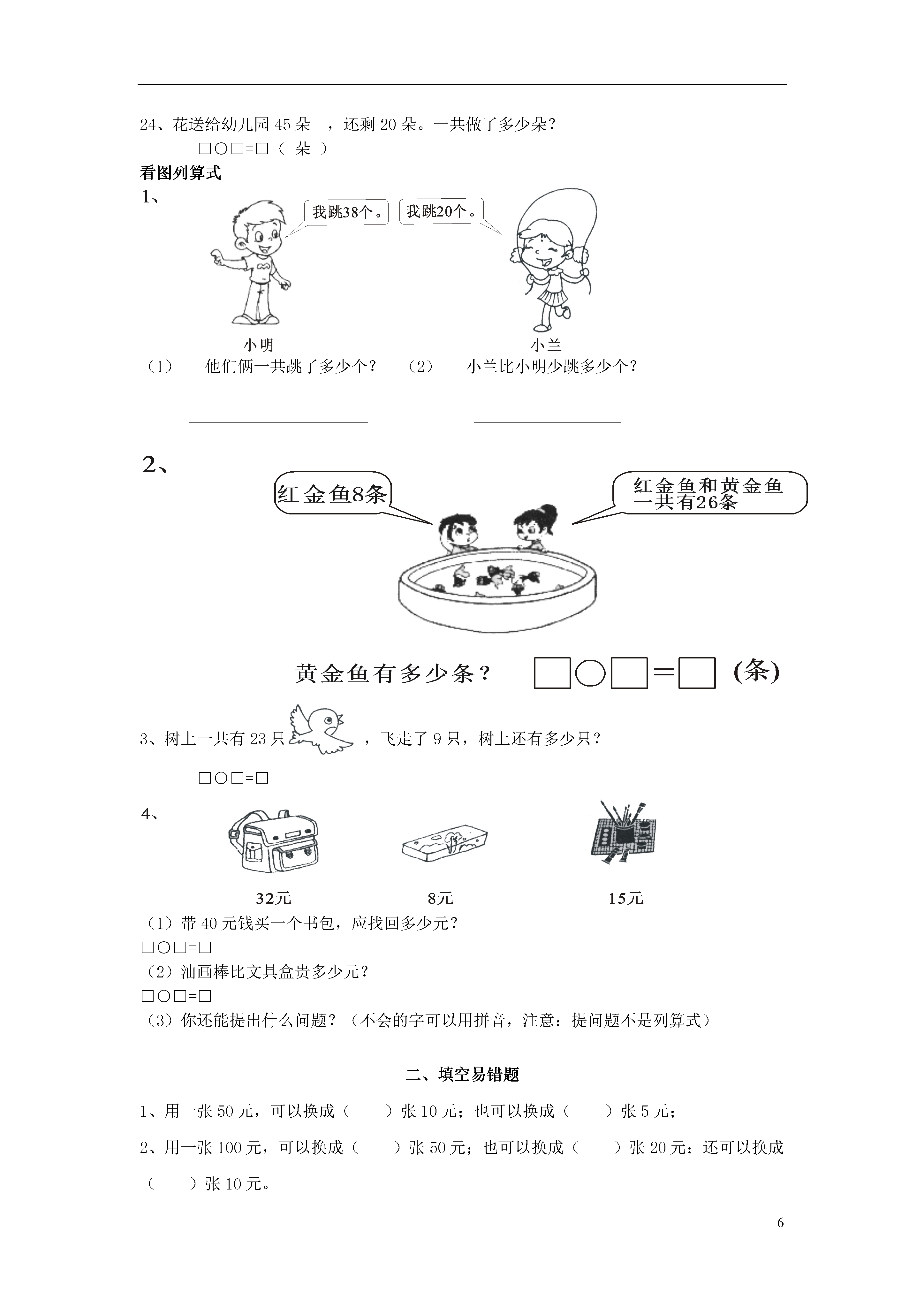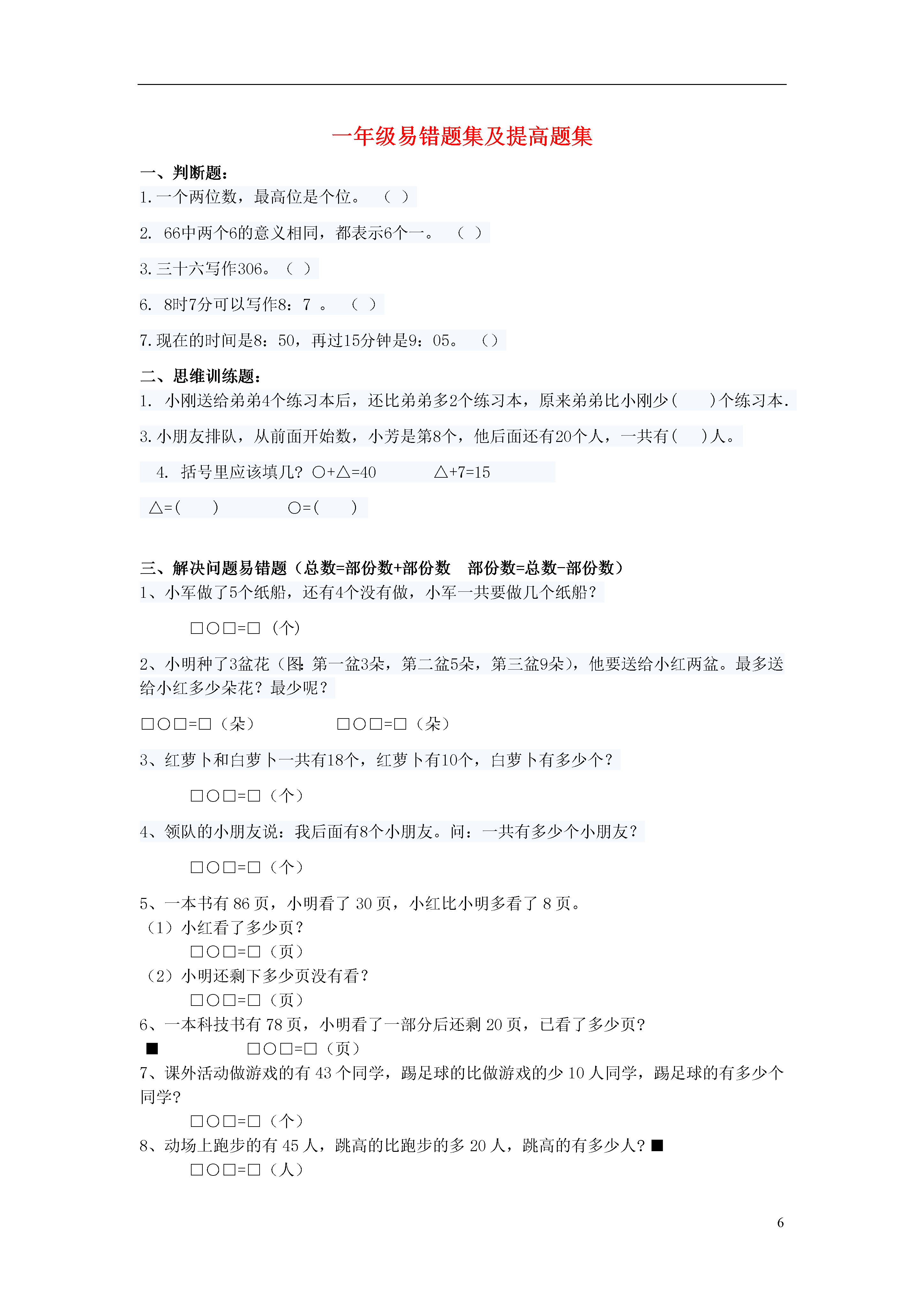 6一年级易错题集及提高题集一、判断题:1.一个两位数,最高位是个位。()2.66中两个6的意义相同,都表示6个一。()3.三十六写作306。()6.8时7分可以写作8:7。()7.现在的时间是8:50,再过15分钟是9:05。()二、思维训练题:1.小刚送给弟弟4个练习本后,还比弟弟多2个练习本,原来弟弟比小刚少()个练习本.3.小朋友排队,从前面开始数,小芳是第8个,他后面还有20个人,一共有()人。4.括号里应该填几?○+△=40△+7=15△=()○=()三、解决问题易错题(总数=部份数+部份数部份数=总数-部份数)1、小军做了5个纸船,还有4个没有做,小军一共要做几个纸船?□○□=□(个)2、小明种了3盆花(图:第一盆3朵,第二盆5朵,第三盆9朵),他要送给小红两盆。最多送给小红多少朵花?最少呢?□○□=□(朵)□○□=□(朵)3、红萝卜和白萝卜一共有18个,红萝卜有10个,白萝卜有多少个?□○□=□(个)4、领队的小朋友说:我后面有8个小朋友。问:一共有多少个小朋友?□○□=□(个)5、一本书有86页,小明看了30页,小红比小明多看了8页。(1)小红看了多少页?□○□=□(页)(2)小明还剩下多少页没有看?□○□=□(页)6、一本科技书有78页,小明看了一部分后还剩20页,已看了多少页?□○□=□(页)7、课外活动做游戏的有43个同学,踢足球的比做游戏的少10人同学,踢足球的有多少个同学?□○□=□(个)8、动场上跑步的有45人,跳高的比跑步的多20人,跳高的有多少人?□○□=□(人)9、骆驼能活25年,大象能活80年,大象比骆驼多活几年?□○□=□(年)10、校园里有32棵柏树,48棵柳树,25棵松树。(1)柏树和柳树共有几棵?□○□=□(棵)(2)松树比柳树少几棵?□○□=□(棵)(3)柏树比松树多几棵?□○□=□(棵)(4)松树和柏树共有几棵?□○□=□(棵)(5)三种树一共有几棵?□○□=□(棵)11、爷爷58岁,小华6岁,爷爷比小明大多少岁?□○□=□(岁)12、二年级有男同学38人,女同学41人,(提出问题并解答)□○□=□(人)13、小兰今年9岁,妈妈今年36岁,妈妈和小兰相差多少岁?□○□=□(岁)14、木工组修理一批桌子,已经修好了38张,还有17张没修,这批桌子有多少张?□○□=□(张)15、小明上午写了6个生字,下午写了5个,小明这一天共写了多少个生字?□○□=□(个)16、小红看一本书,第一天看了9页,还剩下7页没看,这本书一共有多少页?○□=□(页)17、商店卖出了48个西瓜,还剩28个西瓜,商店原来有多少个西瓜?□○□=□(个)18、儿童乐园有红色和蓝色的碰碰车35辆,其中蓝色的有6辆,红色的有多少辆?□○□=□(辆)19、小亮看一本书,已经看了64页,还有8页没看完,这本书共有多少页?□○□=□(页)20、一年二班有13个男同学,18个女同学,一年二班一共有多少个同学?□○□=□(个)21、数学小组有18个男同学,9个女同学,男同学比女同学多几名?□○□=□(名)22、商店卖出了48个西瓜,还剩28个西瓜,商店原来有多少个西瓜?□○□=□(个)23、我付65元买一个书包,找回3元。一个书包多少元?□○□=□(元)24、花送给幼儿园45朵,还剩20朵。一共做了多少朵?□○□=□(朵)看图列算式(1)他们俩一共跳了多少个?(2)小兰比小明少跳多少个?3、树上一共有23只,飞走了9只,树上还有多少只?□○□=□(1)带40元钱买一个书包,应找回多少元?□○□=□(2)油画棒比文具盒贵多少元?□○□=□(3)你还能提出什么问题?(不会的字可以用拼音,注意:提问题不是列算式)二、填空易错题1、用一张50元,可以换成()张10元;也可以换成()张5元;2、用一张100元,可以换成()张50元;也可以换成()张20元;还可以换成()张10元。3、一张一元的人民币可以换()张5角的人民币和()张1角的人民币.4、一张一元的人民币可以换()张5角的人民币.也可以换()张1角的人民币.5、5角=()分;36分=()角()分;8元5角=()角1元=()角;2角+8角=()元;1元-7角=()角26角=()元()角;100分=()元;3元6角=()角7.10元=()元()角;0.50元=()元()角;4元+8角=()元()角;5角4分-8分=()角()分6、一张50元可以换()张20元和()张10元。7、一