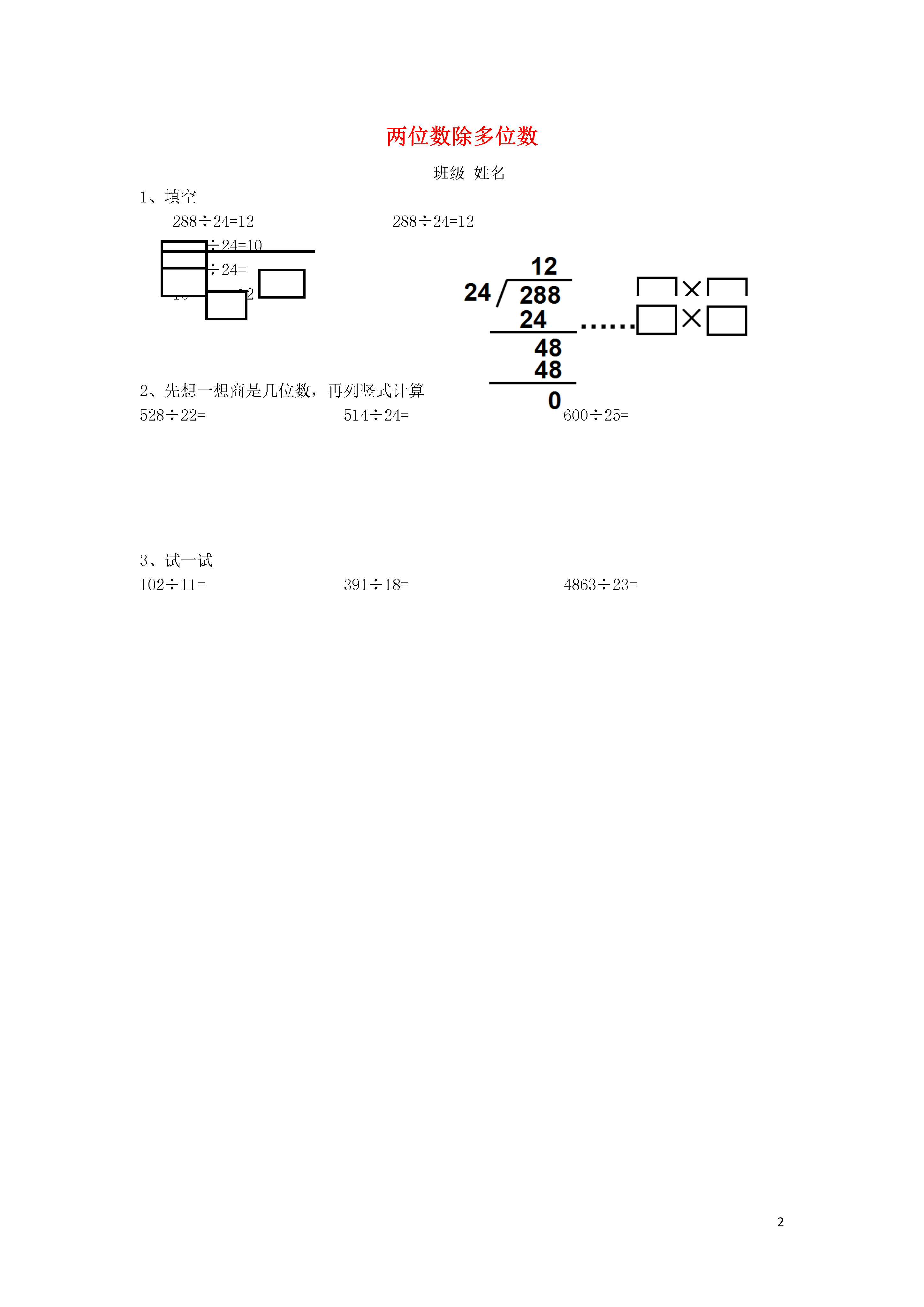 2两位数除多位数班级姓名填空288÷24=12288÷24=12÷24=10÷24=10+=122、先想一想商是几位数,再列竖式计算528÷22=514÷24=600÷25=3、试一试102÷11=391÷18=4863÷23=