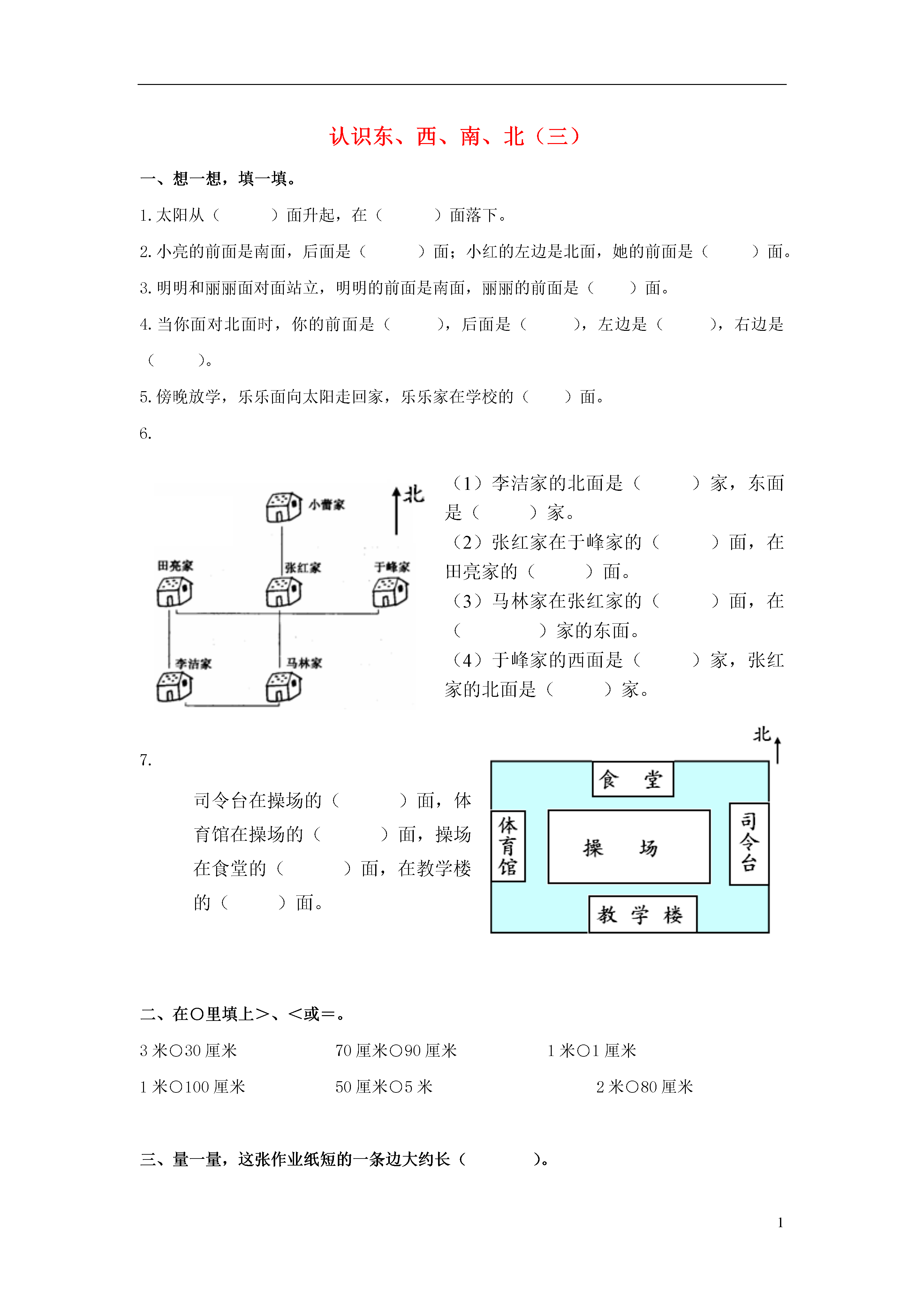 1认识东、西、南、北(三)一、想一想,填一填。1.太阳从()面升起,在()面落下。2.小亮的前面是南面,后面是()面;小红的左边是北面,她的前面是()面。3.明明和丽丽面对面站立,明明的前面是南面,丽丽的前面是()面。4.当你面对北面时,你的前面是(),后面是(),左边是(),右边是()。5.傍晚放学,乐乐面向太阳走回家,乐乐家在学校的()面。6.(1)李洁家的北面是()家,东面是()家。(2)张红家在于峰家的()面,在田亮家的()面。(3)马林家在张红家的()面,在()家的东面。(4)于峰家的西面是()家,张红家的北面是()家。司令台在操场的()面,体育馆在操场的()面,操场在食堂的()面,在教学楼的()面。7.二、在○里填上>、<或=。3米○30厘米70厘米○90厘米1米○1厘米1米○100厘米50厘米○5米2米○80厘米三、量一量,这张作业纸短的一条边大约长()。