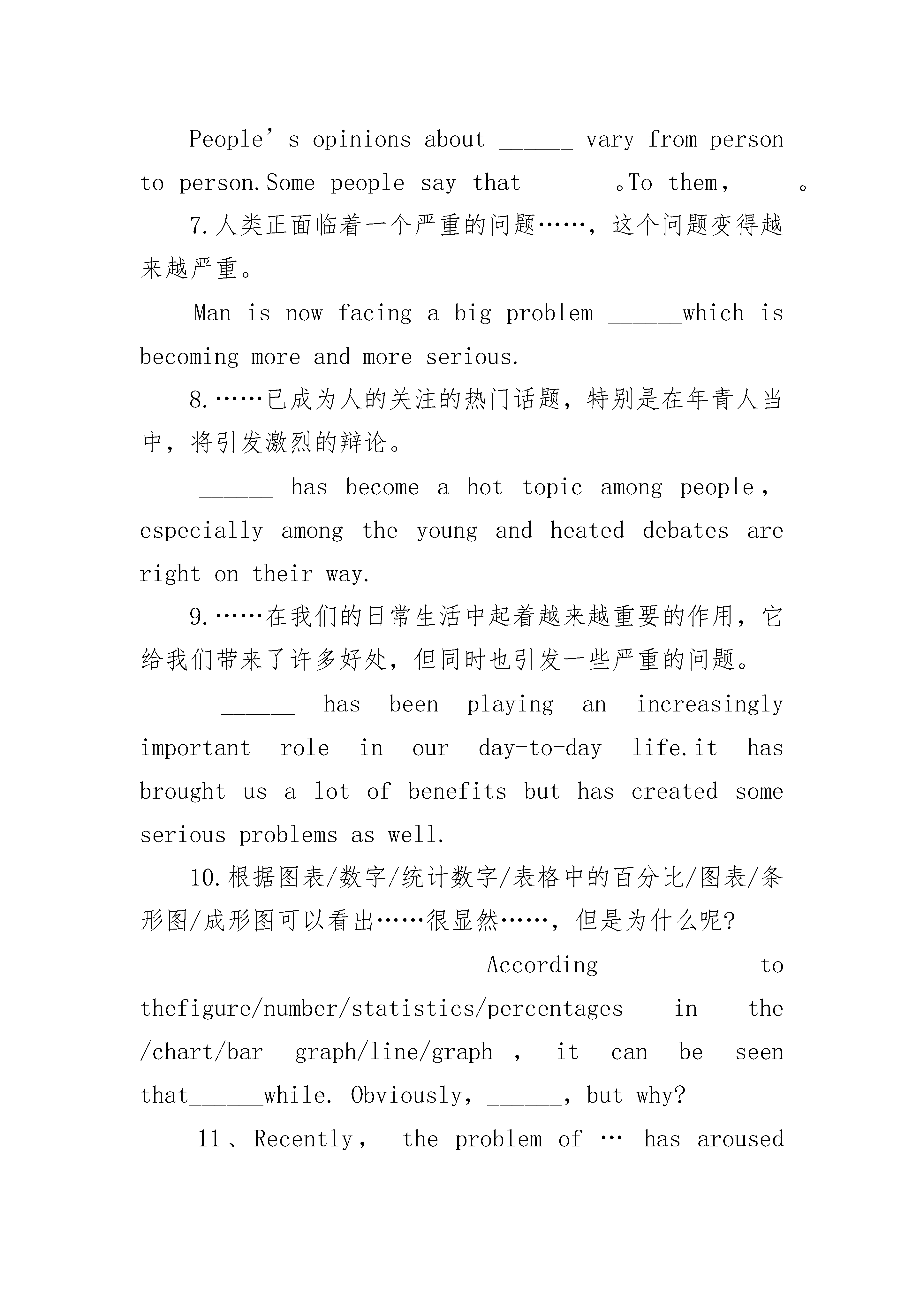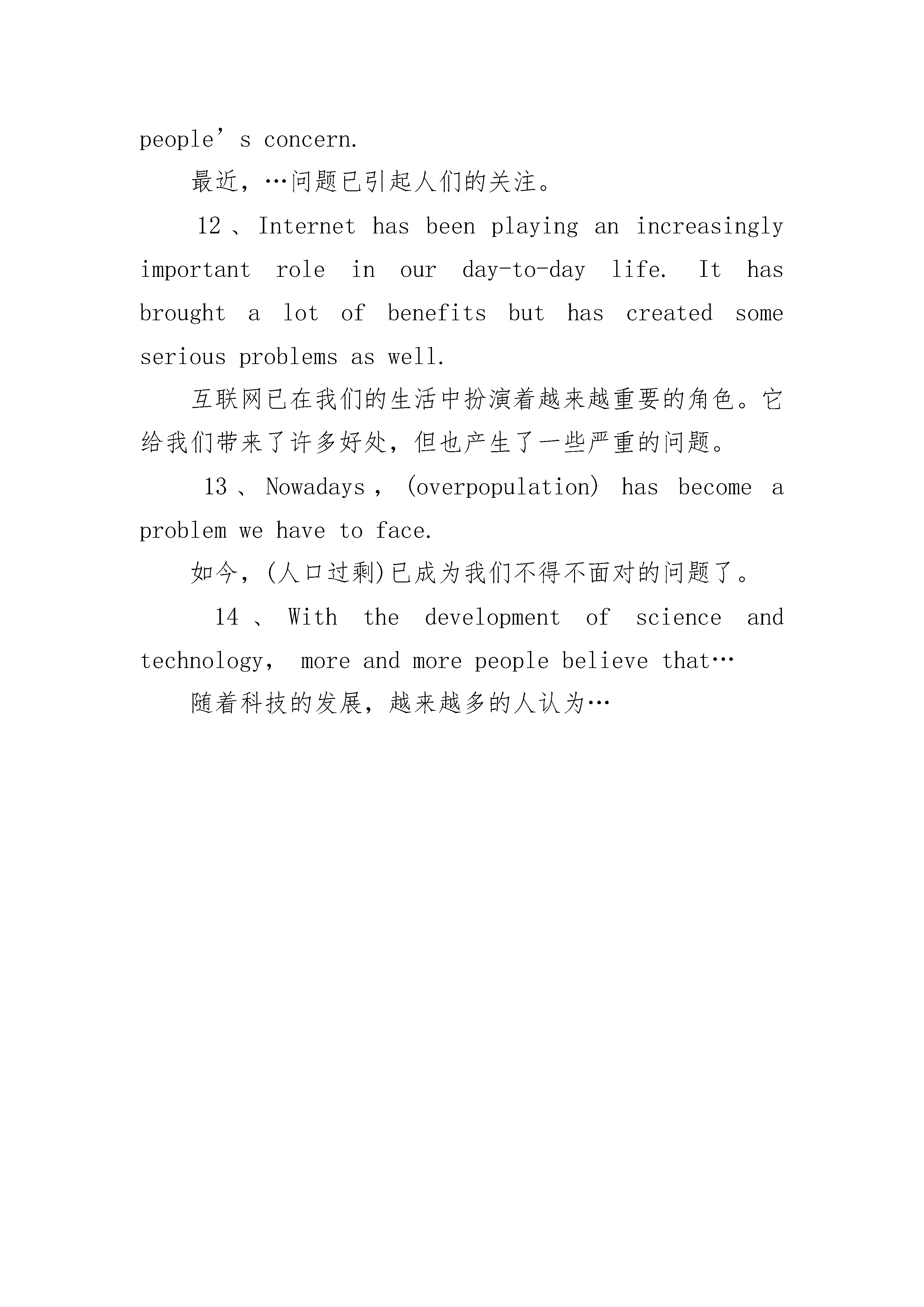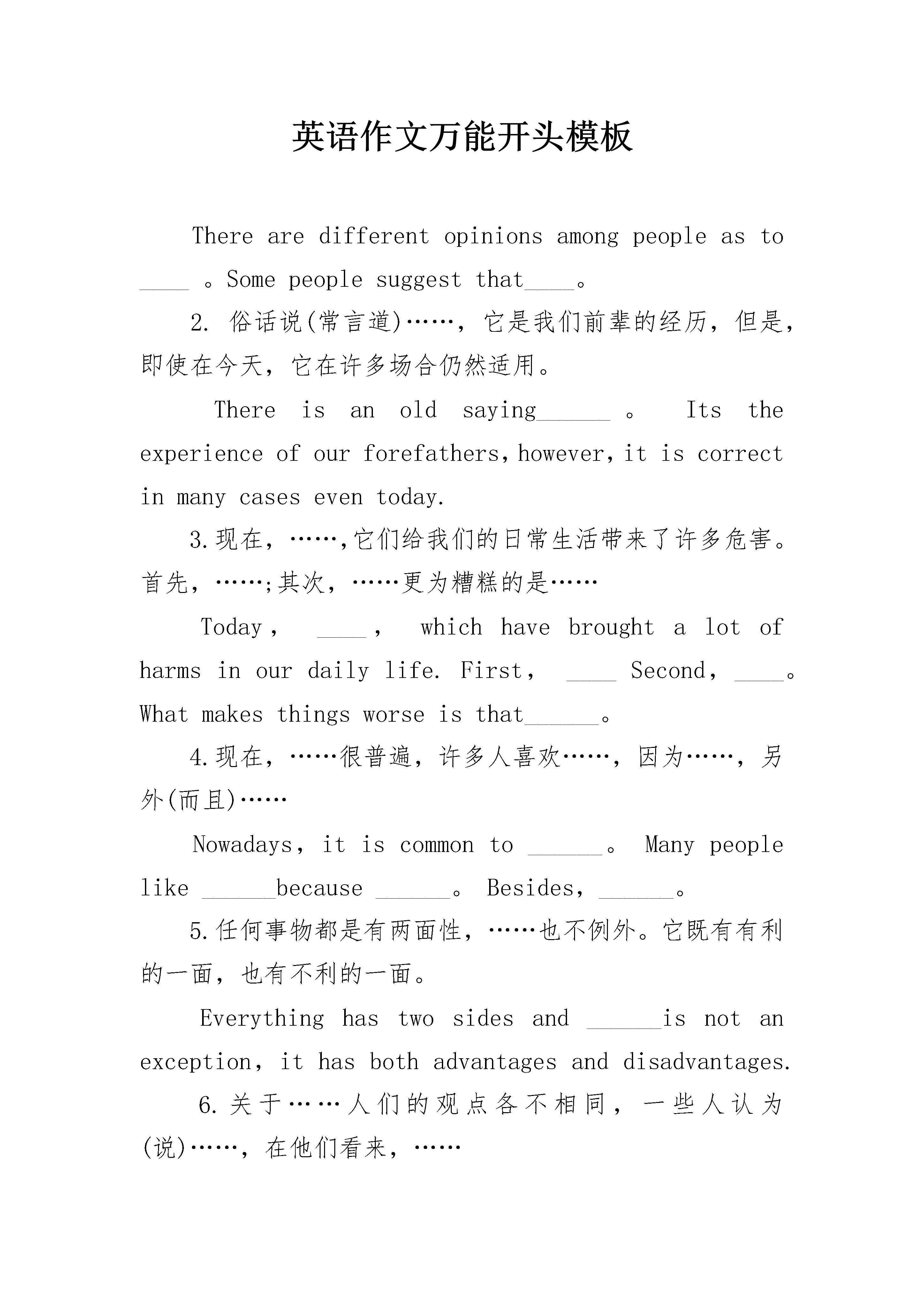 英语作文万能开头模板Therearedifferentopinionsamongpeopleasto____。Somepeoplesuggestthat____。2.俗话说(常言道)……,它是我们前辈的经历,但是,即使在今天,它在许多场合仍然适用。Thereisanoldsaying______。Itstheexperienceofourforefathers,however,itiscorrectinmanycaseseventoday.3.现在,……,它们给我们的日常生活带来了许多危害。首先,……;其次,……更为糟糕的是……Today,____,whichhavebroughtalotofharmsinourdailylife.First,____Second,____。Whatmakesthingsworseisthat______。4.现在,……很普遍,许多人喜欢……,因为……,另外(而且)……Nowadays,itiscommonto______。Manypeoplelike______because______。Besides,______。5.任何事物都是有两面性,……也不例外。它既有有利的一面,也有不利的一面。Everythinghastwosidesand______isnotanexception,ithasbothadvantagesanddisadvantages.6.关于……人们的观点各不相同,一些人认为(说)……,在他们看来,……People’sopinionsabout______varyfrompersontoperson.Somepeoplesaythat______。Tothem,_____。7.人类正面临着一个严重的问题……,这个问题变得越来越严重。Manisnowfacingabigproblem______whichisbecomingmoreandmoreserious.8.……已成为人的关注的热门话题,特别是在年青人当中,将引发激烈的辩论。______hasbecomeahottopicamongpeople,especiallyamongtheyoungandheateddebatesarerightontheirway.9.……在我们的日常生活中起着越来越重要的作用,它给我们带来了许多好处,但同时也引发一些严重的问题。______hasbeenplayinganincreasinglyimportantroleinourday-to-daylife.ithasbroughtusalotofbenefitsbuthascreatedsomeseriousproblemsaswell.10.根据图表/数字/统计数字/表格中的百分比/图表/条形图/成形图可以看出……很显然……,但是为什么呢?Accordingtothefigure/number/statistics/percentagesinthe/chart/bargraph/line/graph,itcanbeseenthat______while.Obviously,______,butwhy?11、Recently,theproblemof…hasarousedpeople’sconcern.最近,…问题已引起人们的关注。12、Internethasbeenplayinganincreasinglyimportantroleinourday-to-daylife.Ithasbroughtalotofbenefitsbuthascreatedsomeseriousproblemsaswell.互联网已在我们的生活中扮演着越来越重要的角色。它给我们带来了许多好处,但也产生了一些严重的问题。13、Nowadays,(overpopulation)hasbecomeaproblemwehavetoface.如今,(人口过剩)已成为我们不得不面对的问题了。14、Withthedevelopmentofscienceandtechnology,moreandmorepeoplebelievethat…随着科技的发展,越来越多的人认为…