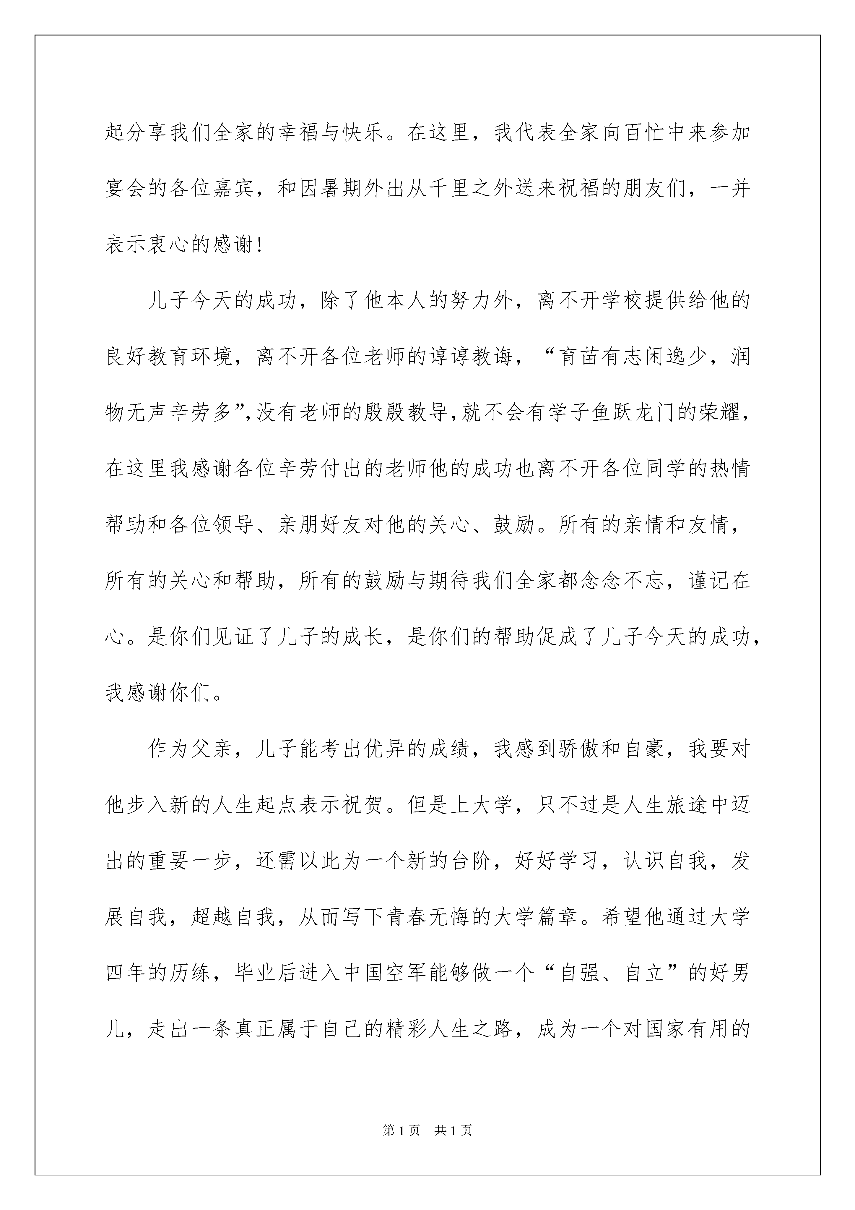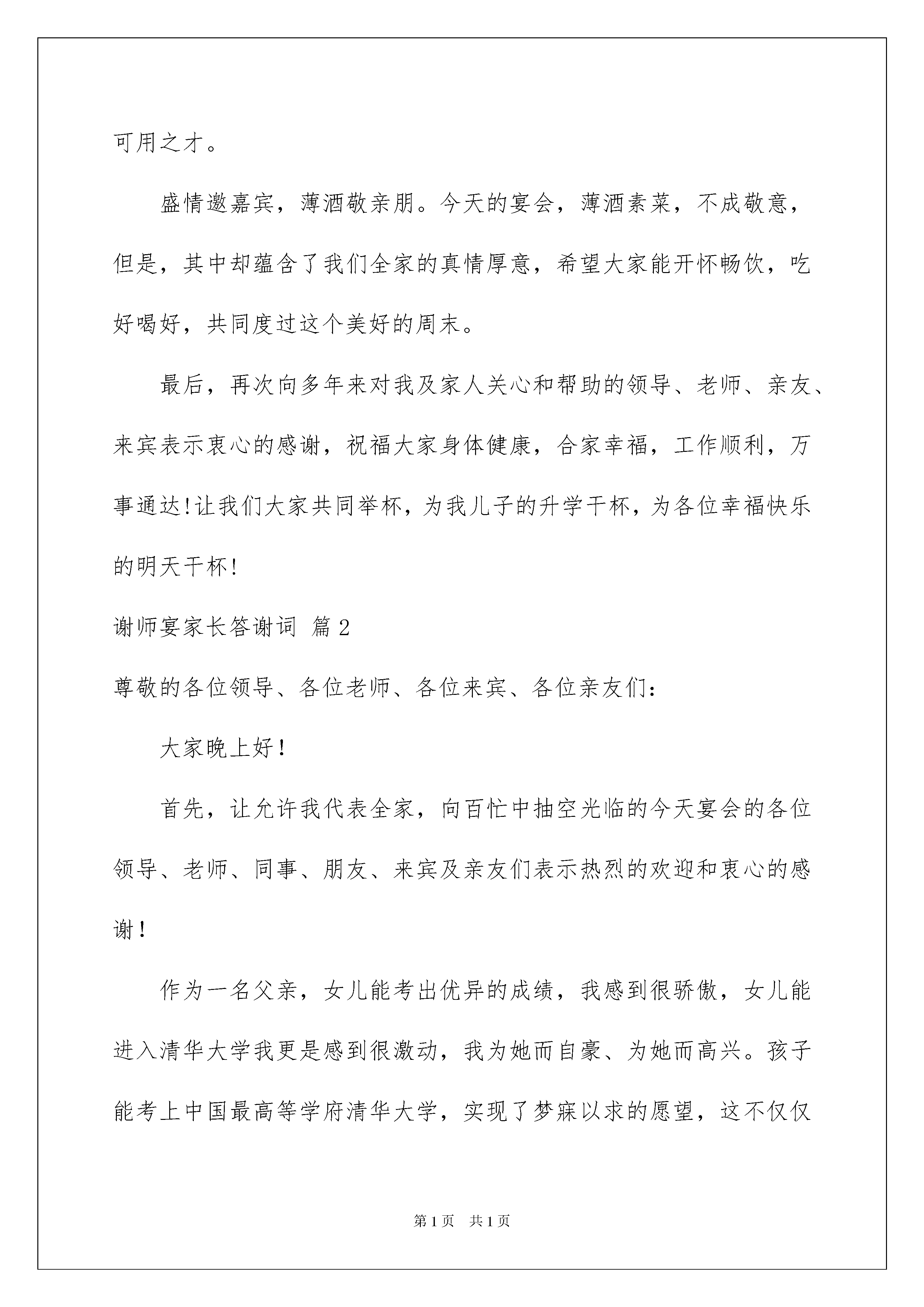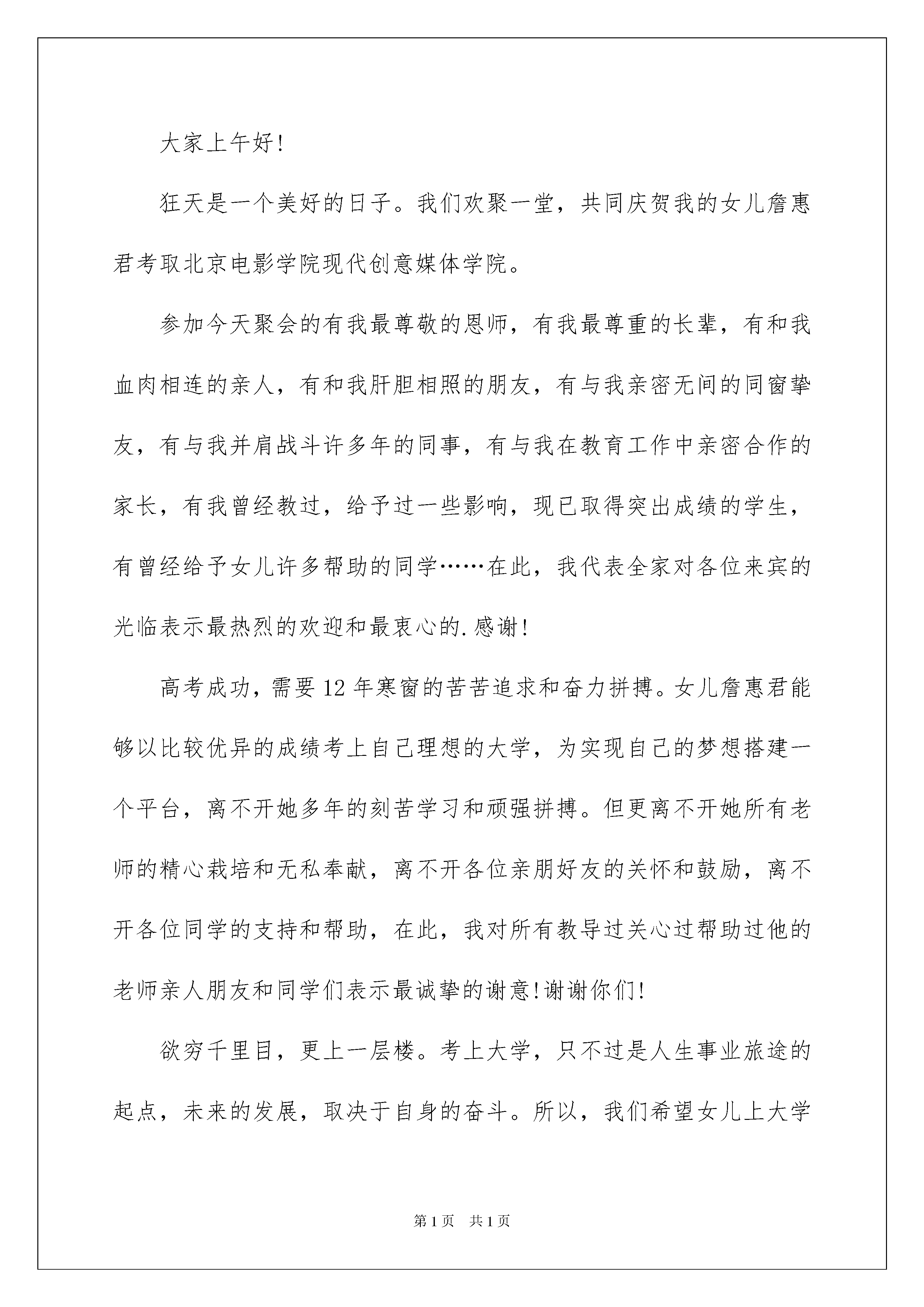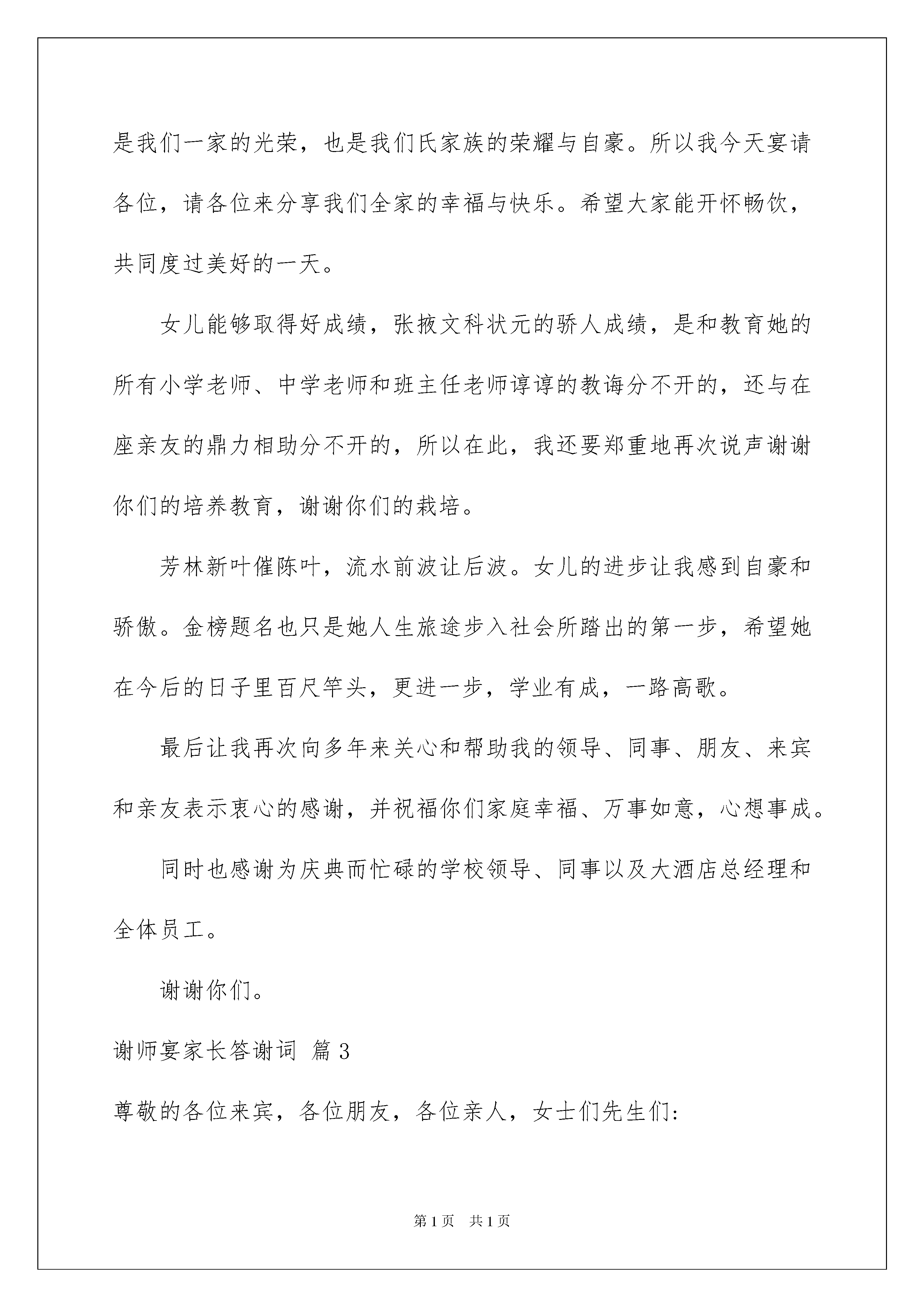 2022谢师宴家长答谢词6篇谢师宴家长答谢词6篇在日常生活和工作中,答谢词应用范围愈发广泛,答谢词由标题、称谓、正文、结语几部分组成。千万不要把答谢词写成流水账喔!以下是我收集整理的谢师宴家长答谢词6篇,仅供参考,希望能够帮助到大家。谢师宴家长答谢词篇1尊敬的各位领导、老师、亲朋好友:大家中午好!这是一个阳光灿烂的季节,这是一个满怀喜悦收获成功的季节,这更是一个播种希望,描绘锦绣的季节。在捷报频传的七月里,儿子xxx历经12载的寒窗苦读,经过自己的不懈努力,在今年的高考中,以优异的成绩考取电子科技大学航空航天学院探测制导与控制技术专业,这是他通过冬的储备、春的播种、夏的耕耘、才换来今天的重大收获。儿子能实现,进入教育部直属“985、211工程”,全国重点大学这一梦寐以求的愿望,全家都非常激动,所以我今天宴请各位,请大家一起分享我们全家的幸福与快乐。在这里,我代表全家向百忙中来参加宴会的各位嘉宾,和因暑期外出从千里之外送来祝福的朋友们,一并表示衷心的感谢!儿子今天的成功,除了他本人的努力外,离不开学校提供给他的良好教育环境,离不开各位老师的谆谆教诲,“育苗有志闲逸少,润物无声辛劳多”,没有老师的殷殷教导,就不会有学子鱼跃龙门的荣耀,在这里我感谢各位辛劳付出的老师他的成功也离不开各位同学的热情帮助和各位领导、亲朋好友对他的关心、鼓励。所有的亲情和友情,所有的关心和帮助,所有的鼓励与期待我们全家都念念不忘,谨记在心。是你们见证了儿子的成长,是你们的帮助促成了儿子今天的成功,我感谢你们。作为父亲,儿子能考出优异的成绩,我感到骄傲和自豪,我要对他步入新的人生起点表示祝贺。但是上大学,只不过是人生旅途中迈出的重要一步,还需以此为一个新的台阶,好好学习,认识自我,发展自我,超越自我,从而写下青春无悔的大学篇章。希望他通过大学四年的历练,毕业后进入中国空军能够做一个“自强、自立”的好男儿,走出一条真正属于自己的精彩人生之路,成为一个对国家有用的可用之才。盛情邀嘉宾,薄酒敬亲朋。今天的宴会,薄酒素菜,不成敬意,但是,其中却蕴含了我们全家的真情厚意,希望大家能开怀畅饮,吃好喝好,共同度过这个美好的周末。最后,再次向多年来对我及家人关心和帮助的领导、老师、亲友、来宾表示衷心的感谢,祝福大家身体健康,合家幸福,工作顺利,万事通达!让我们大家共同举杯,为我儿子的升学干杯,为各位幸福快乐的明天干杯!谢师宴家长答谢词篇2尊敬的各位领导、各位老师、各位来宾、各位亲友们:大家晚上好!首先,让允许我代表全家,向百忙中抽空光临的今天宴会的各位领导、老师、同事、朋友、来宾及亲友们表示热烈的欢迎和衷心的感谢!作为一名父亲,女儿能考出优异的成绩,我感到很骄傲,女儿能进入清华大学我更是感到很激动,我为她而自豪、为她而高兴。孩子能考上中国最高等学府清华大学,实现了梦寐以求的愿望,这不仅仅是我们一家的光荣,也是我们氏家族的荣耀与自豪。所以我今天宴请各位,请各位来分享我们全家的幸福与快乐。希望大家能开怀畅饮,共同度过美好的一天。女儿能够取得好成绩,张掖文科状元的骄人成绩,是和教育她的所有小学老师、中学老师和班主任老师谆谆的教诲分不开的,还与在座亲友的鼎力相助分不开的,所以在此,我还要郑重地再次说声谢谢你们的培养教育,谢谢你们的栽培。芳林新叶催陈叶,流水前波让后波。女儿的进步让我感到自豪和骄傲。金榜题名也只是她人生旅途步入社会所踏出的第一步,希望她在今后的日子里百尺竿头,更进一步,学业有成,一路高歌。最后让我再次向多年来关心和帮助我的领导、同事、朋友、来宾和亲友表示衷心的感谢,并祝福你们家庭幸福、万事如意,心想事成。同时也感谢为庆典而忙碌的学校领导、同事以及大酒店总经理和全体员工。谢谢你们。谢师宴家长答谢词篇3尊敬的各位来宾,各位朋友,各位亲人,女士们先生们:大家上午好!狂天是一个美好的日子。我们欢聚一堂,共同庆贺我的女儿詹惠君考取北京电影学院现代创意媒体学院。参加今天聚会的有我最尊敬的恩师,有我最尊重的长辈,有和我血肉相连的亲人,有和我肝胆相照的朋友,有与我亲密无间的同窗挚友,有与我并肩战斗许多年的同事,有与我在教育工作中亲密合作的家长,有我曾经教过,给予过一些影响,现已取得突出成绩的学生,有曾经给予女儿许多帮助的同学……在此,我代表全家对各位来宾的光临表示最热烈的欢迎和最衷心的.感谢!高考成功,需要12年寒窗的苦苦追求和奋力拼搏。女儿詹惠君能够以比较优异的成绩考上自己理想的大学,为实现自己的梦想搭建一个平台,离不开她多年的刻苦学习和顽强拼搏。但更离不开她所有老师的精心栽培和无私奉献,离不开各位亲朋好友的关怀和鼓励,离不开