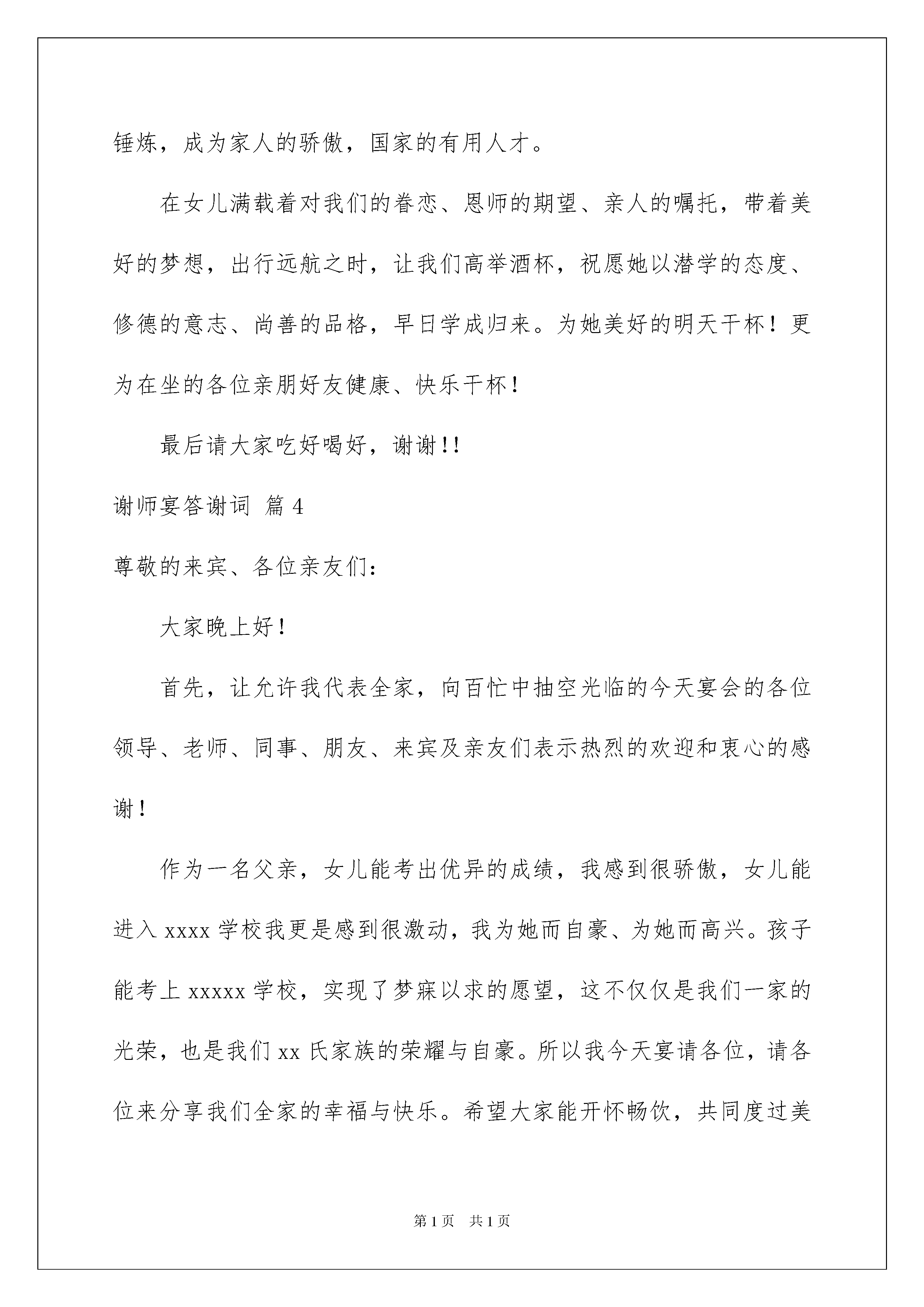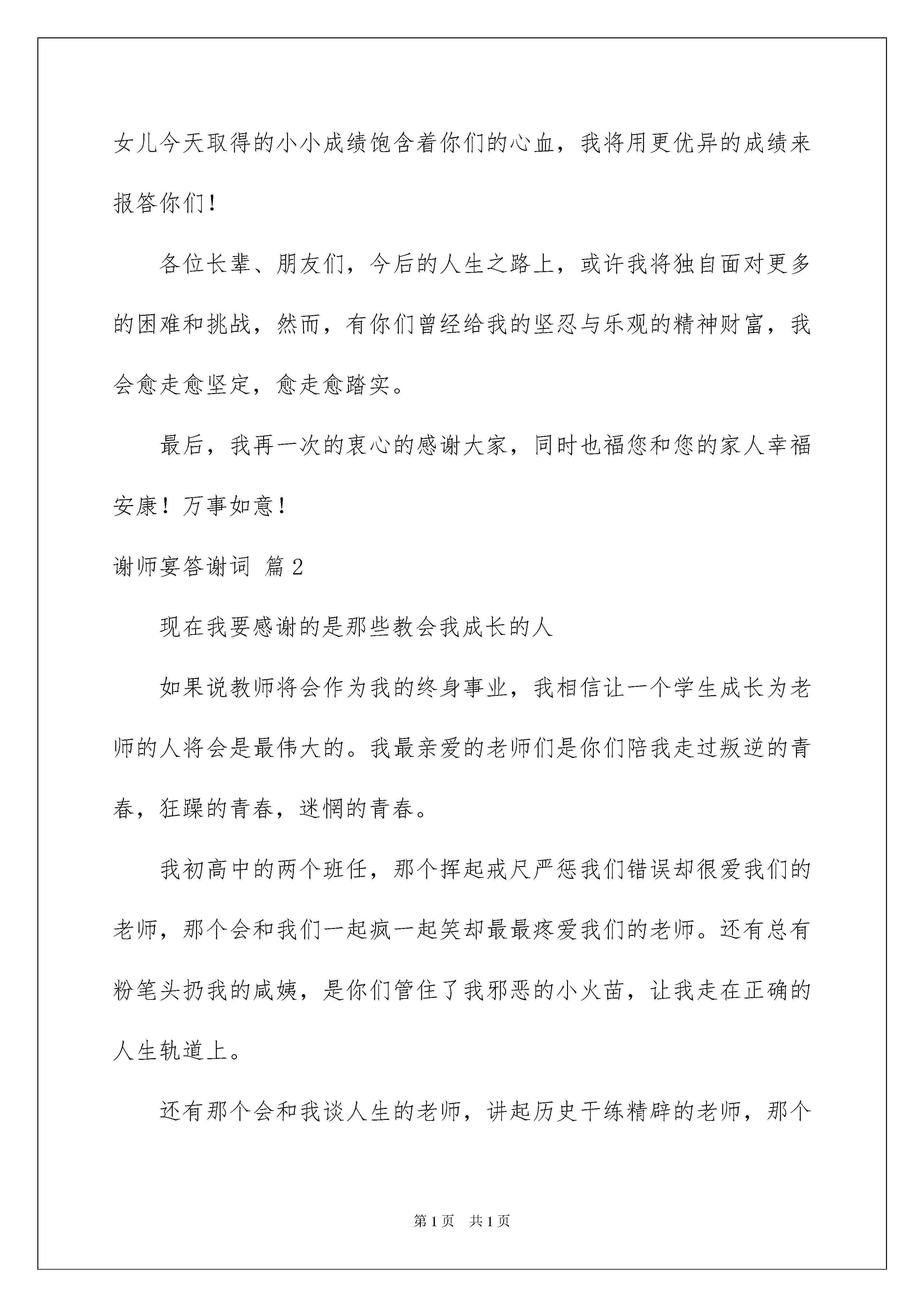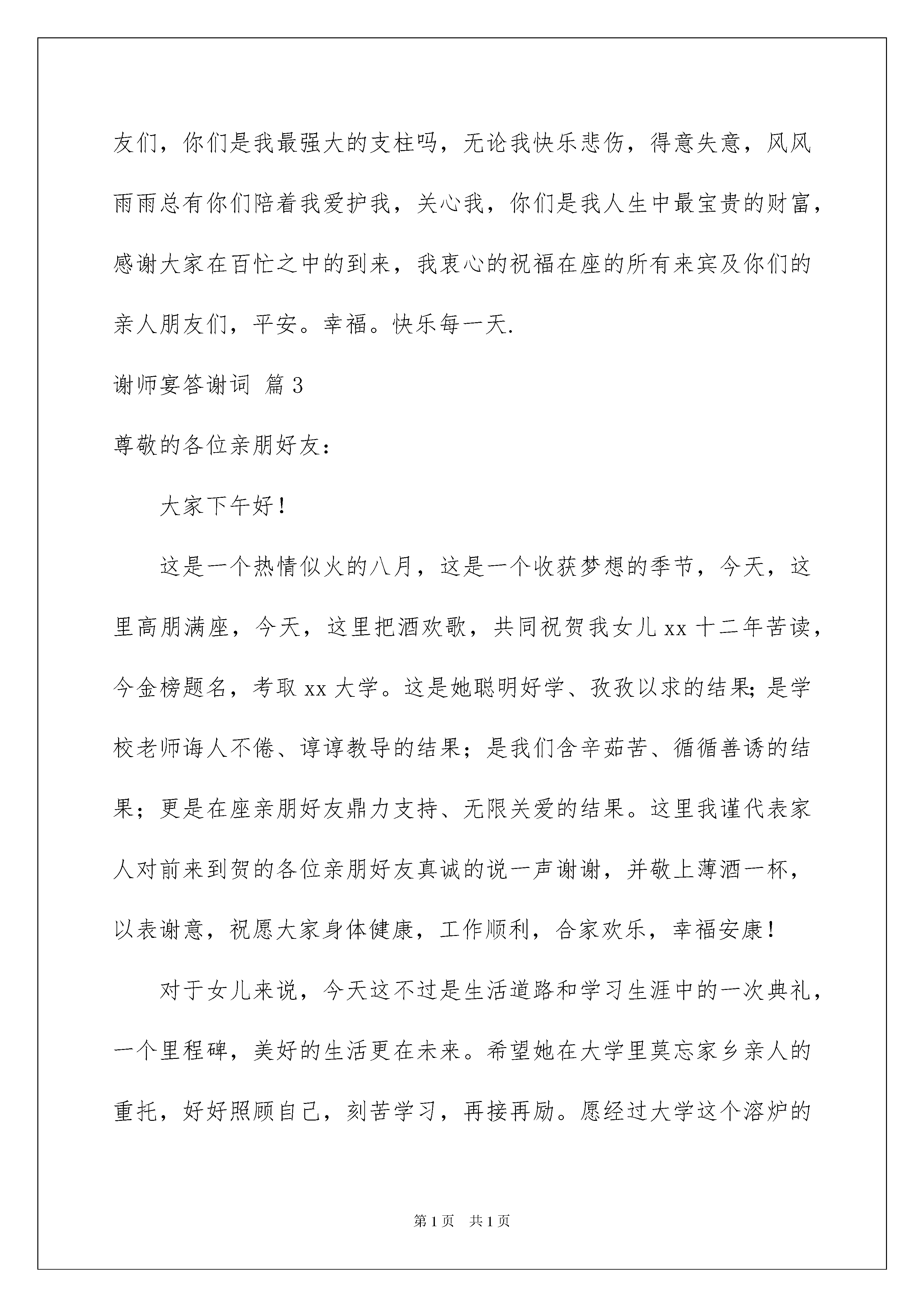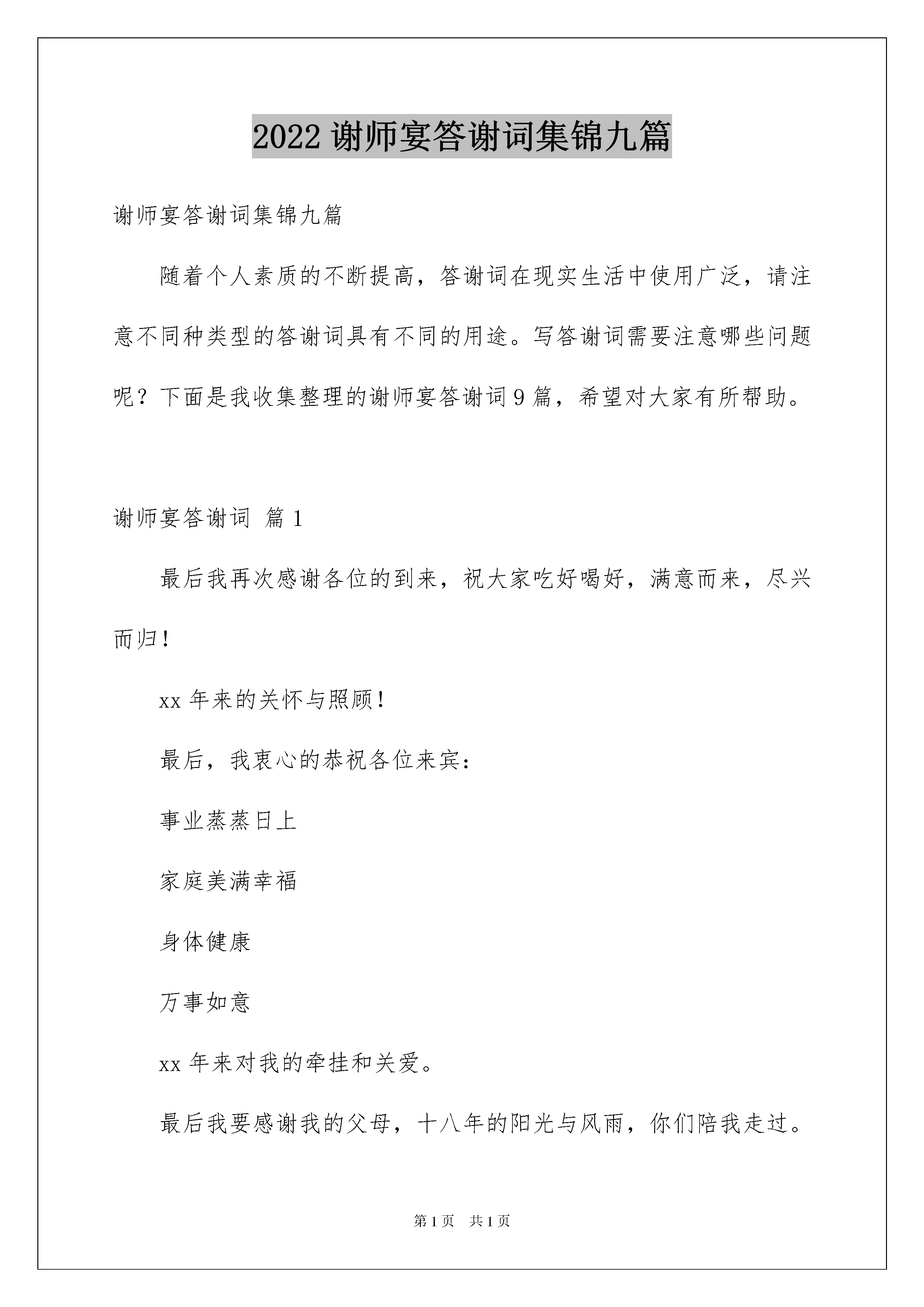 2022谢师宴答谢词集锦九篇谢师宴答谢词集锦九篇随着个人素质的不断提高,答谢词在现实生活中使用广泛,请注意不同种类型的答谢词具有不同的用途。写答谢词需要注意哪些问题呢?下面是我收集整理的谢师宴答谢词9篇,希望对大家有所帮助。谢师宴答谢词篇1最后我再次感谢各位的到来,祝大家吃好喝好,满意而来,尽兴而归!xx年来的关怀与照顾!最后,我衷心的恭祝各位来宾:事业蒸蒸日上家庭美满幸福身体健康万事如意xx年来对我的牵挂和关爱。最后我要感谢我的父母,十八年的阳光与风雨,你们陪我走过。女儿今天取得的小小成绩饱含着你们的心血,我将用更优异的成绩来报答你们!各位长辈、朋友们,今后的人生之路上,或许我将独自面对更多的困难和挑战,然而,有你们曾经给我的坚忍与乐观的精神财富,我会愈走愈坚定,愈走愈踏实。最后,我再一次的衷心的感谢大家,同时也福您和您的家人幸福安康!万事如意!谢师宴答谢词篇2现在我要感谢的是那些教会我成长的人如果说教师将会作为我的终身事业,我相信让一个学生成长为老师的人将会是最伟大的。我最亲爱的老师们是你们陪我走过叛逆的青春,狂躁的青春,迷惘的青春。我初高中的两个班任,那个挥起戒尺严惩我们错误却很爱我们的老师,那个会和我们一起疯一起笑却最最疼爱我们的老师。还有总有粉笔头扔我的咸姨,是你们管住了我邪恶的小火苗,让我走在正确的人生轨道上。还有那个会和我谈人生的老师,讲起历史干练精辟的老师,那个博古通今讲话引经据典,声音很温柔的老师。那个每天看着我们背注释的李老师,是你们让我的能说变成会道,让我的小惆怅变成大学问,让那个会在深夜爬起来一顿感时伤逝的敏感的孩子走上了汉语言文学这条神圣的大路。还有讲起物理眉飞色舞的老师,点氢气手不会颤抖的老师。让我们背化学方程式背到哭的老师,表情丰富的老师,总爱眨眼睛的老师,是你们让我的理科素质不断提升着,让我这颗会胡思乱想的小脑袋在理性的夜空中发光发热.还有笑容温暖声音性感的厚老师,思考问题手在不断比划的老师,眉毛很可爱的老师,讲东西简洁明了总在不断夸我的孟姨,是你们让我在数学这块我从小就头疼的盐碱地上茁壮的成长着,还有眼睛很迷人笑容很慈祥的老师,及生气起来像孩子的老师,你们让懒惰的我一直快乐的学着英语.这些我最亲爱的人们,你们都是我成长路上的堡垒,把稚嫩的我一点点培养的成熟理性,今后无论我飞的多高多远,我都永远是你们手中可爱的小孩。最后,我要感谢那些在我人生中有关心和爱护包围我的亲人和朋友们,你们是我最强大的支柱吗,无论我快乐悲伤,得意失意,风风雨雨总有你们陪着我爱护我,关心我,你们是我人生中最宝贵的财富,感谢大家在百忙之中的到来,我衷心的祝福在座的所有来宾及你们的亲人朋友们,平安。幸福。快乐每一天.谢师宴答谢词篇3尊敬的各位亲朋好友:大家下午好!这是一个热情似火的八月,这是一个收获梦想的季节,今天,这里高朋满座,今天,这里把酒欢歌,共同祝贺我女儿xx十二年苦读,今金榜题名,考取xx大学。这是她聪明好学、孜孜以求的结果;是学校老师诲人不倦、谆谆教导的结果;是我们含辛茹苦、循循善诱的结果;更是在座亲朋好友鼎力支持、无限关爱的结果。这里我谨代表家人对前来到贺的各位亲朋好友真诚的说一声谢谢,并敬上薄酒一杯,以表谢意,祝愿大家身体健康,工作顺利,合家欢乐,幸福安康!对于女儿来说,今天这不过是生活道路和学习生涯中的一次典礼,一个里程碑,美好的生活更在未来。希望她在大学里莫忘家乡亲人的重托,好好照顾自己,刻苦学习,再接再励。愿经过大学这个溶炉的锤炼,成为家人的骄傲,国家的有用人才。在女儿满载着对我们的眷恋、恩师的期望、亲人的嘱托,带着美好的梦想,出行远航之时,让我们高举酒杯,祝愿她以潜学的态度、修德的意志、尚善的品格,早日学成归来。为她美好的明天干杯!更为在坐的各位亲朋好友健康、快乐干杯!最后请大家吃好喝好,谢谢!!谢师宴答谢词篇4尊敬的来宾、各位亲友们:大家晚上好!首先,让允许我代表全家,向百忙中抽空光临的今天宴会的各位领导、老师、同事、朋友、来宾及亲友们表示热烈的欢迎和衷心的感谢!作为一名父亲,女儿能考出优异的成绩,我感到很骄傲,女儿能进入xxxx学校我更是感到很激动,我为她而自豪、为她而高兴。孩子能考上xxxxx学校,实现了梦寐以求的愿望,这不仅仅是我们一家的光荣,也是我们xx氏家族的荣耀与自豪。所以我今天宴请各位,请各位来分享我们全家的幸福与快乐。希望大家能开怀畅饮,共同度过美好的一天。女儿能够取得好成绩,和教育她的所有小学老师、中学老师和班主任老师谆谆的教诲分不开的,还与在座亲友的鼎力相助分不开的,所以在此,我还要郑重地再次说声谢谢你们的培养教育,谢谢你们的
