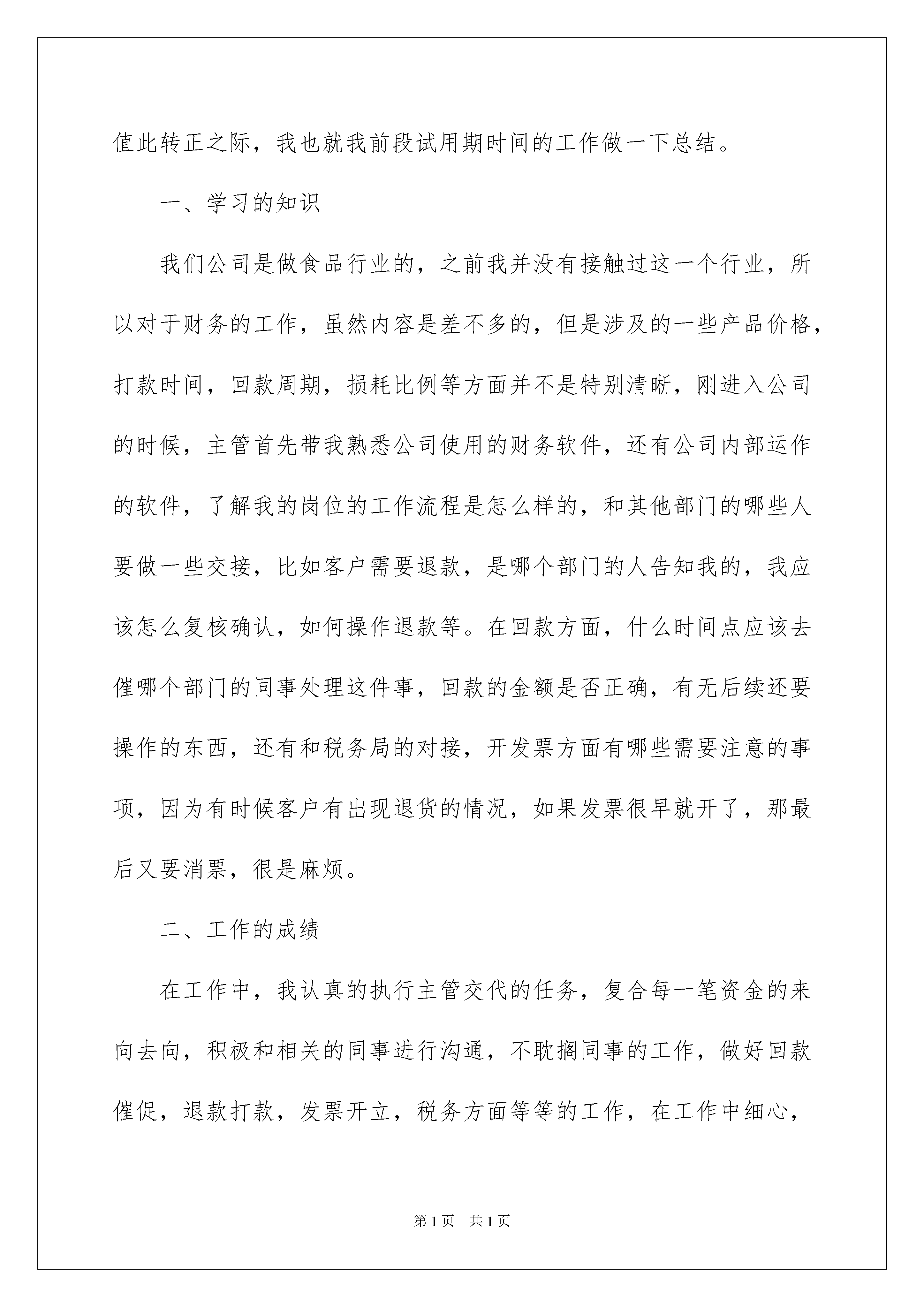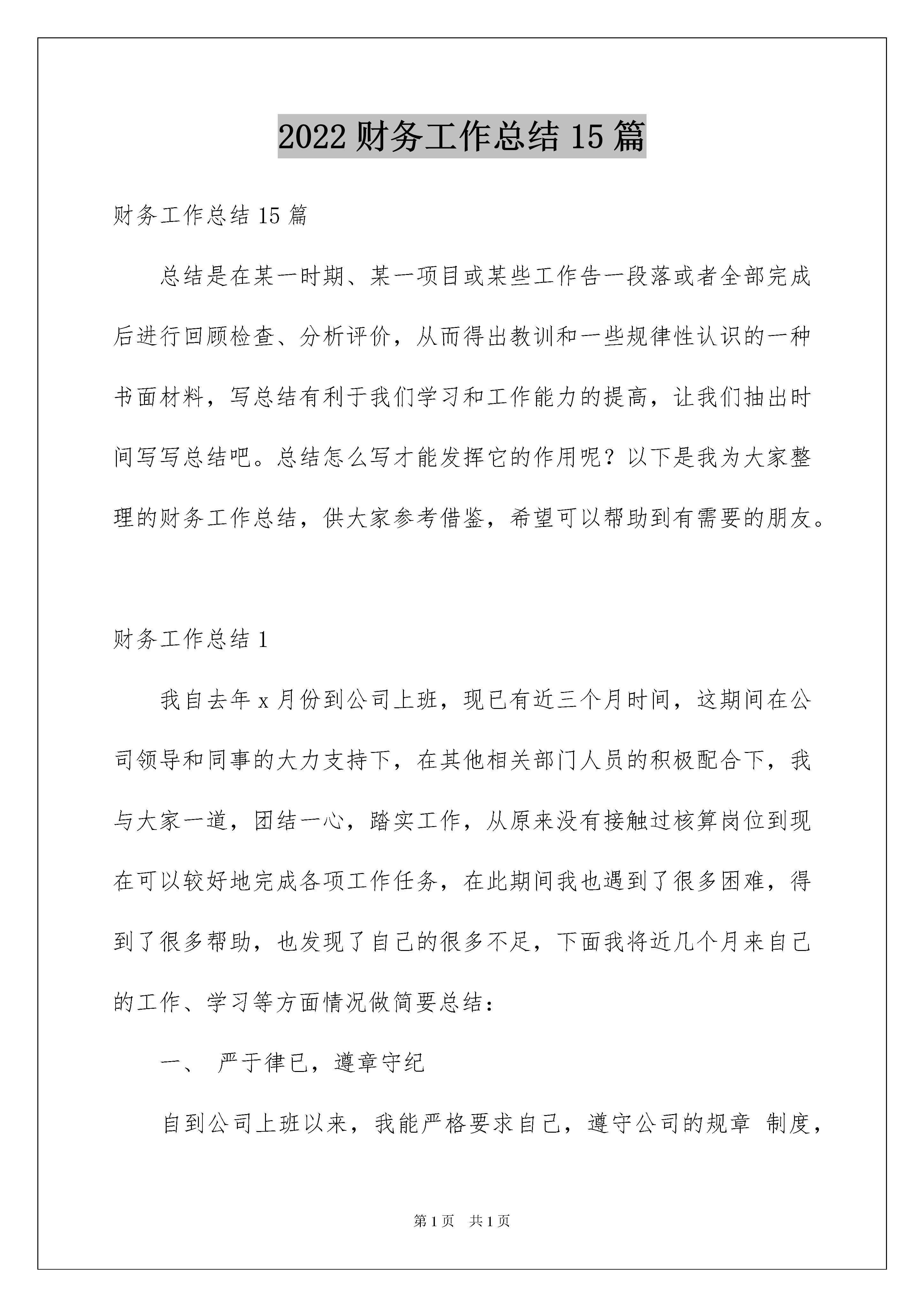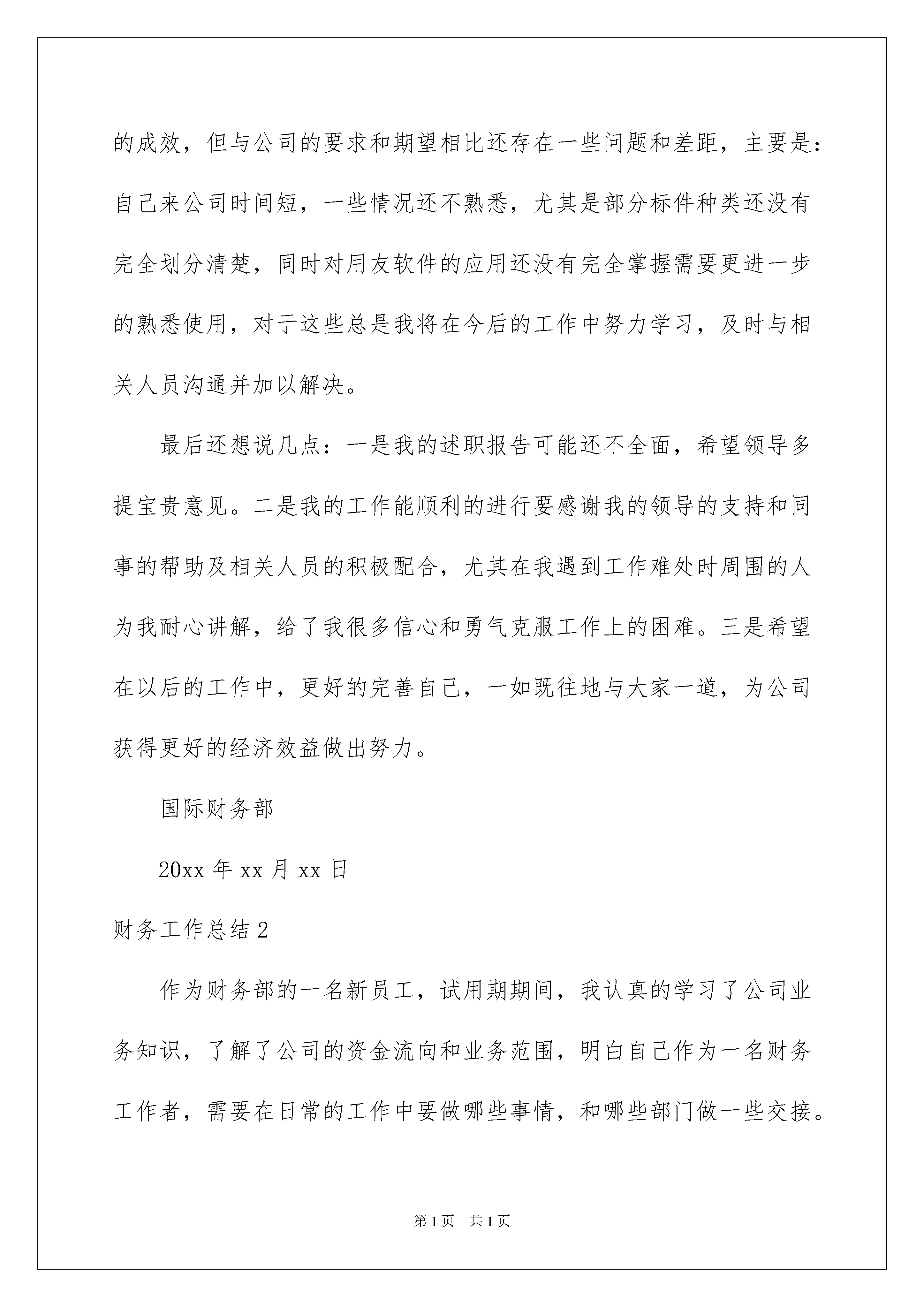 2022财务工作总结15篇财务工作总结15篇总结是在某一时期、某一项目或某些工作告一段落或者全部完成后进行回顾检查、分析评价,从而得出教训和一些规律性认识的一种书面材料,写总结有利于我们学习和工作能力的提高,让我们抽出时间写写总结吧。总结怎么写才能发挥它的作用呢?以下是我为大家整理的财务工作总结,供大家参考借鉴,希望可以帮助到有需要的朋友。财务工作总结1我自去年x月份到公司上班,现已有近三个月时间,这期间在公司领导和同事的大力支持下,在其他相关部门人员的积极配合下,我与大家一道,团结一心,踏实工作,从原来没有接触过核算岗位到现在可以较好地完成各项工作任务,在此期间我也遇到了很多困难,得到了很多帮助,也发现了自己的很多不足,下面我将近几个月来自己的工作、学习等方面情况做简要总结:一、严于律已,遵章守纪自到公司上班以来,我能严格要求自己,遵守公司的规章制度,能正确处理好工作和家庭之间的关系,不因个人原因影响工作,能与公司的人员搞好团结,不做不利于团结的事。二、履行好自己的工作职责我在公司主要从事库房材料核算工作,对企业所购材料到货、入库及出库的财务处理,为库存材料做出详细的核算,对于每日材料到货、入库、出库都要以材料保管员签字并收到实物为准,并及时入帐,当日送来的票据及时录入电脑,做到不积压、不懈怠,工作积极主动,不懂的和同事虚心请教,努力钻研业务知识,不断提高自己的业务水平,尽快做到独挡一面。由于财务工作繁事、杂事多,然而在繁冗的工作中细心显得尤为重要,坚持严谨、细致、耐心的工作作风,严格按照财务规定正确核算材料的收、发、存情况,并及时结算,对上级提供真实、准确的数据,做好财务后勤工作。帐面数字及时与库房保管人员实物相核对,做到帐实相符,多与相关部门人员沟通,对存在的问题多多交流,从而使公司利益得到最大的保护。三、存在的不足这段时间以来,围绕自身工作职责做了一定的努力,取得了一定的成效,但与公司的要求和期望相比还存在一些问题和差距,主要是:自己来公司时间短,一些情况还不熟悉,尤其是部分标件种类还没有完全划分清楚,同时对用友软件的应用还没有完全掌握需要更进一步的熟悉使用,对于这些总是我将在今后的工作中努力学习,及时与相关人员沟通并加以解决。最后还想说几点:一是我的述职报告可能还不全面,希望领导多提宝贵意见。二是我的工作能顺利的进行要感谢我的领导的支持和同事的帮助及相关人员的积极配合,尤其在我遇到工作难处时周围的人为我耐心讲解,给了我很多信心和勇气克服工作上的困难。三是希望在以后的工作中,更好的完善自己,一如既往地与大家一道,为公司获得更好的经济效益做出努力。国际财务部20xx年xx月xx日财务工作总结2作为财务部的一名新员工,试用期期间,我认真的学习了公司业务知识,了解了公司的资金流向和业务范围,明白自己作为一名财务工作者,需要在日常的工作中要做哪些事情,和哪些部门做一些交接。值此转正之际,我也就我前段试用期时间的工作做一下总结。一、学习的知识我们公司是做食品行业的,之前我并没有接触过这一个行业,所以对于财务的工作,虽然内容是差不多的,但是涉及的一些产品价格,打款时间,回款周期,损耗比例等方面并不是特别清晰,刚进入公司的时候,主管首先带我熟悉公司使用的财务软件,还有公司内部运作的软件,了解我的岗位的工作流程是怎么样的,和其他部门的哪些人要做一些交接,比如客户需要退款,是哪个部门的人告知我的,我应该怎么复核确认,如何操作退款等。在回款方面,什么时间点应该去催哪个部门的同事处理这件事,回款的金额是否正确,有无后续还要操作的东西,还有和税务局的对接,开发票方面有哪些需要注意的事项,因为有时候客户有出现退货的情况,如果发票很早就开了,那最后又要消票,很是麻烦。二、工作的成绩在工作中,我认真的执行主管交代的任务,复合每一笔资金的来向去向,积极和相关的同事进行沟通,不耽搁同事的工作,做好回款催促,退款打款,发票开立,税务方面等等的工作,在工作中细心,认真,尽量保证没有出错,试用期间,我把工作做好,并没有出现重大的失误,也在报表的制作当中,能积极提供数据给到销售部门做报表。在税务方面,积极配合主管的工作,做好每一件事情。在和同事的工作配合之中,我也认真合作,不懒惰,不推诿,不耍性子。三、不足的地方虽然工作中我认真对待,尽力做好每一件事情,但这段时间工作下来,我也发现了一些我身上的不足之处。像有一次开立发票,我在系统后台看到信息之后就立马去做了,但是后来同事却告诉我,我的发票开错了,因为虽然备注了,但是其实还有一些没添加进去,而且客户要求是和另一个订单一起开票。而且我在工作之中,没有和同事沟